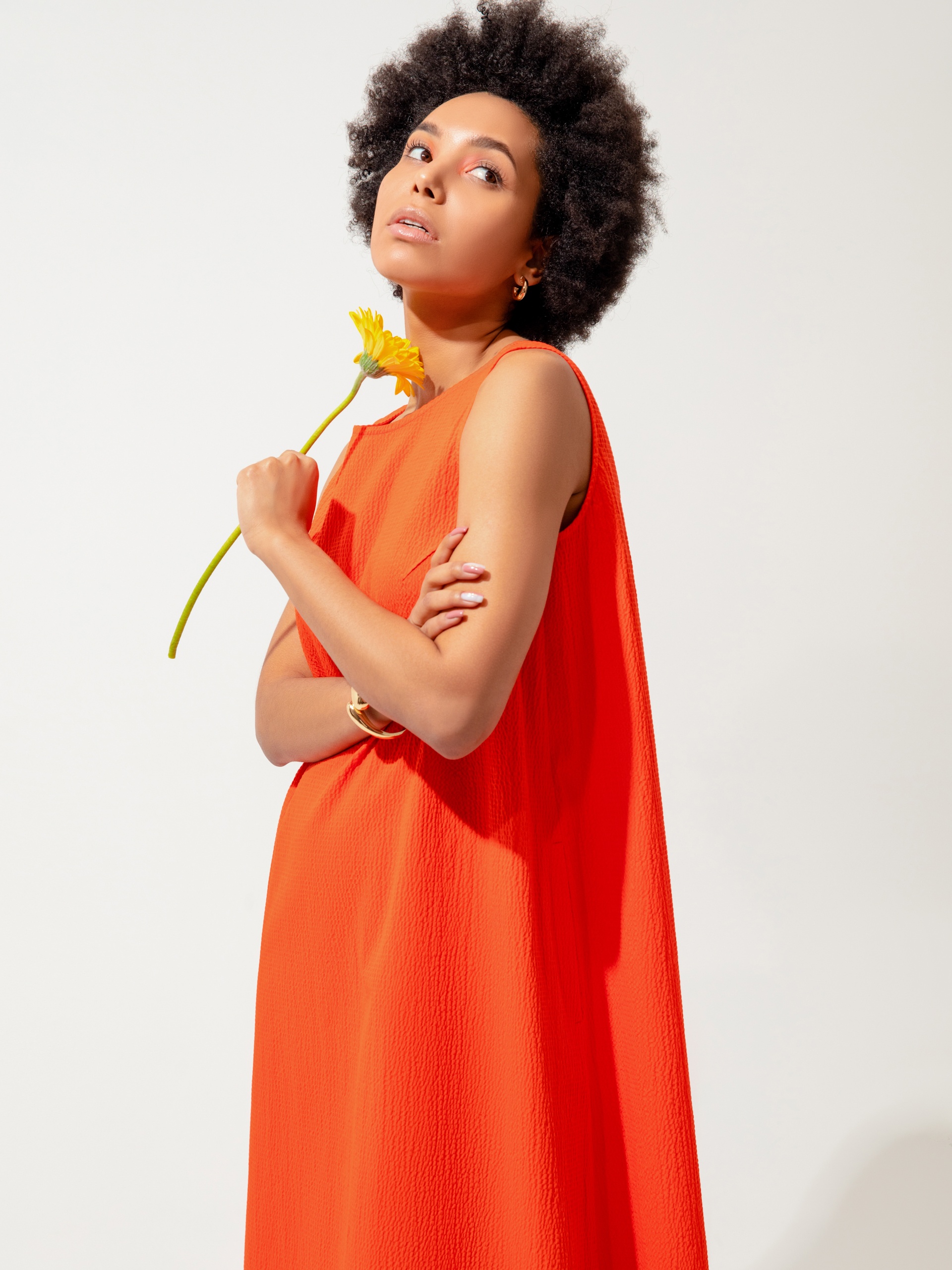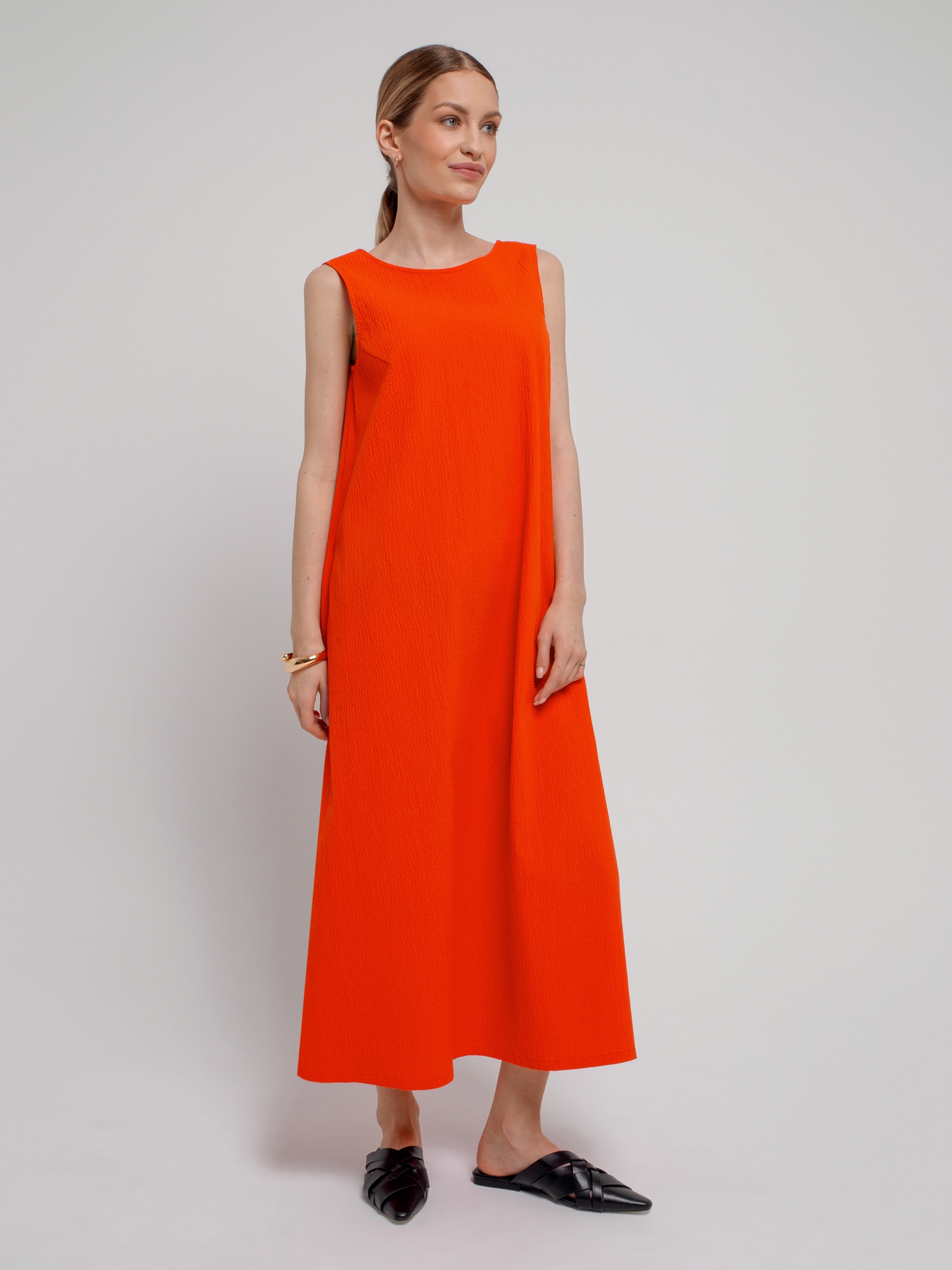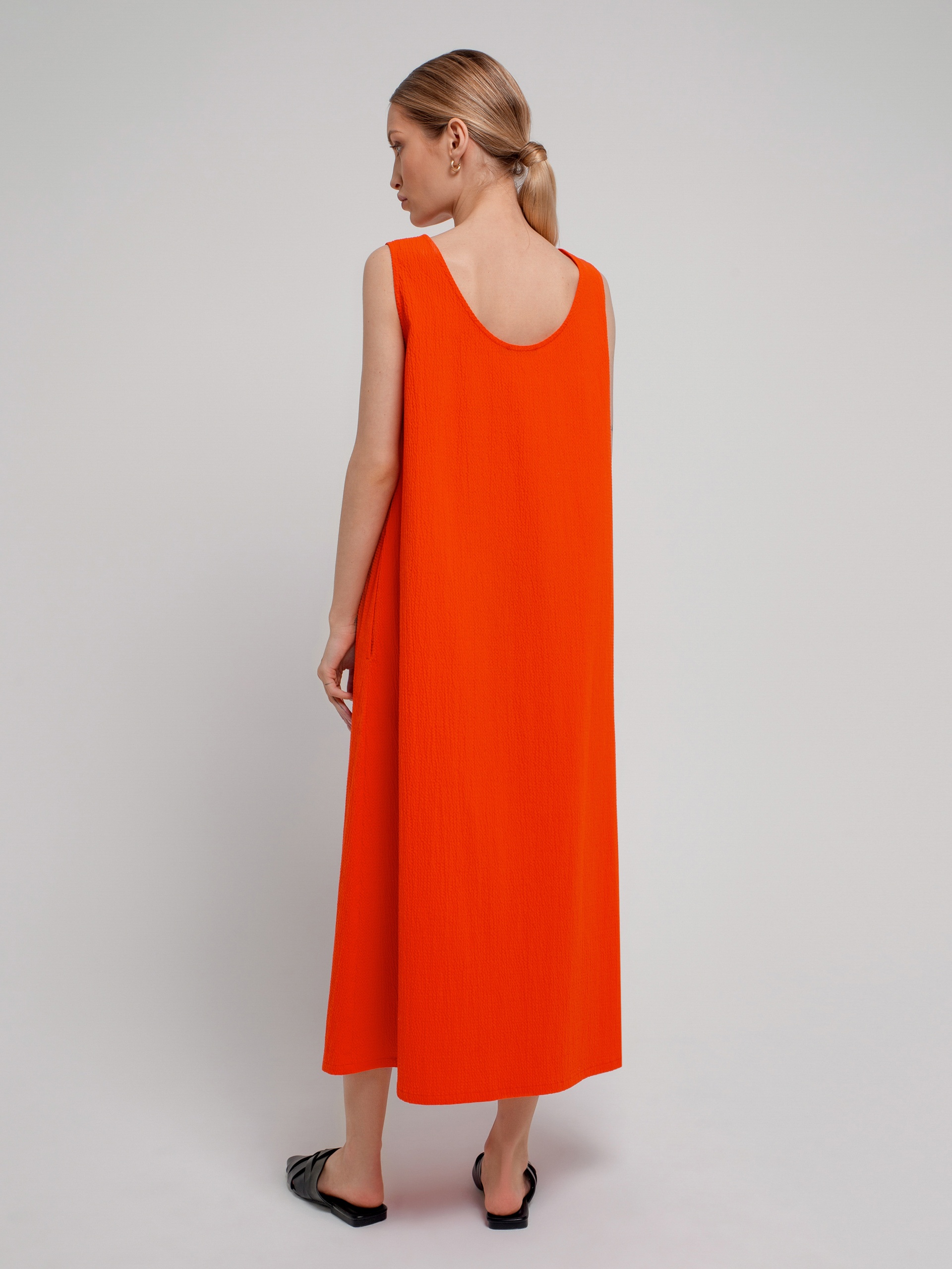 Свободное платье из фактурной хлопковой ткани в ярко-коралловом цвете, силуэта колокол с круглой горловиной и углубленным вырезом на спине. С карманами в швах.