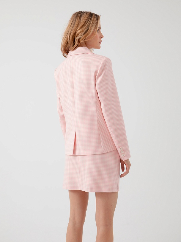 Приталенный однобортный жакет с расширенной линией плеча, завышенной линией лацканов и накладными карманами. Жакет украшают перламутровые пуговицы молочного оттенка. Жакет выполнен из костюмной ткани в розово-молочную клетку, составляет идеальный ансамбль с юбкой из одной ткани.
