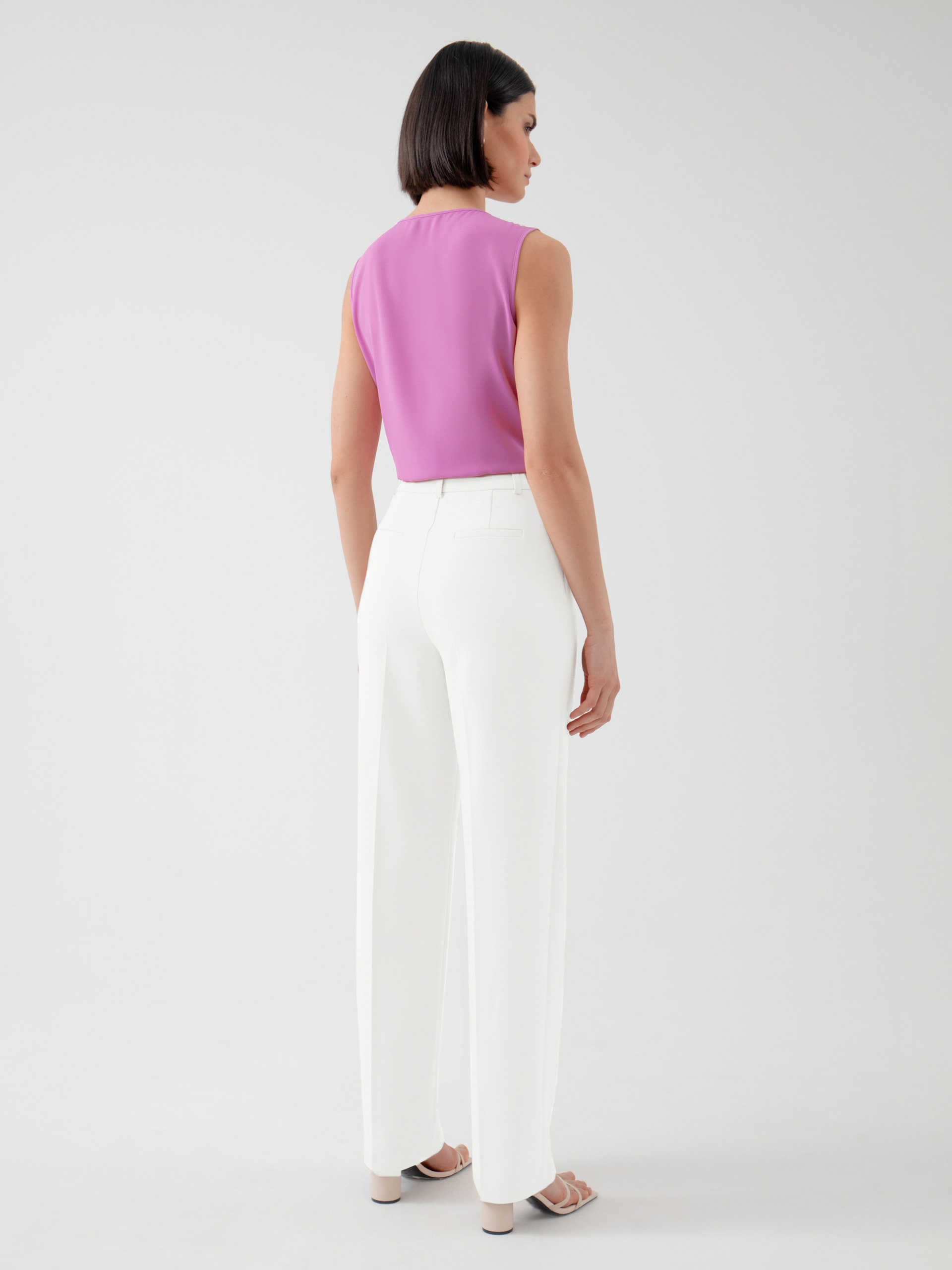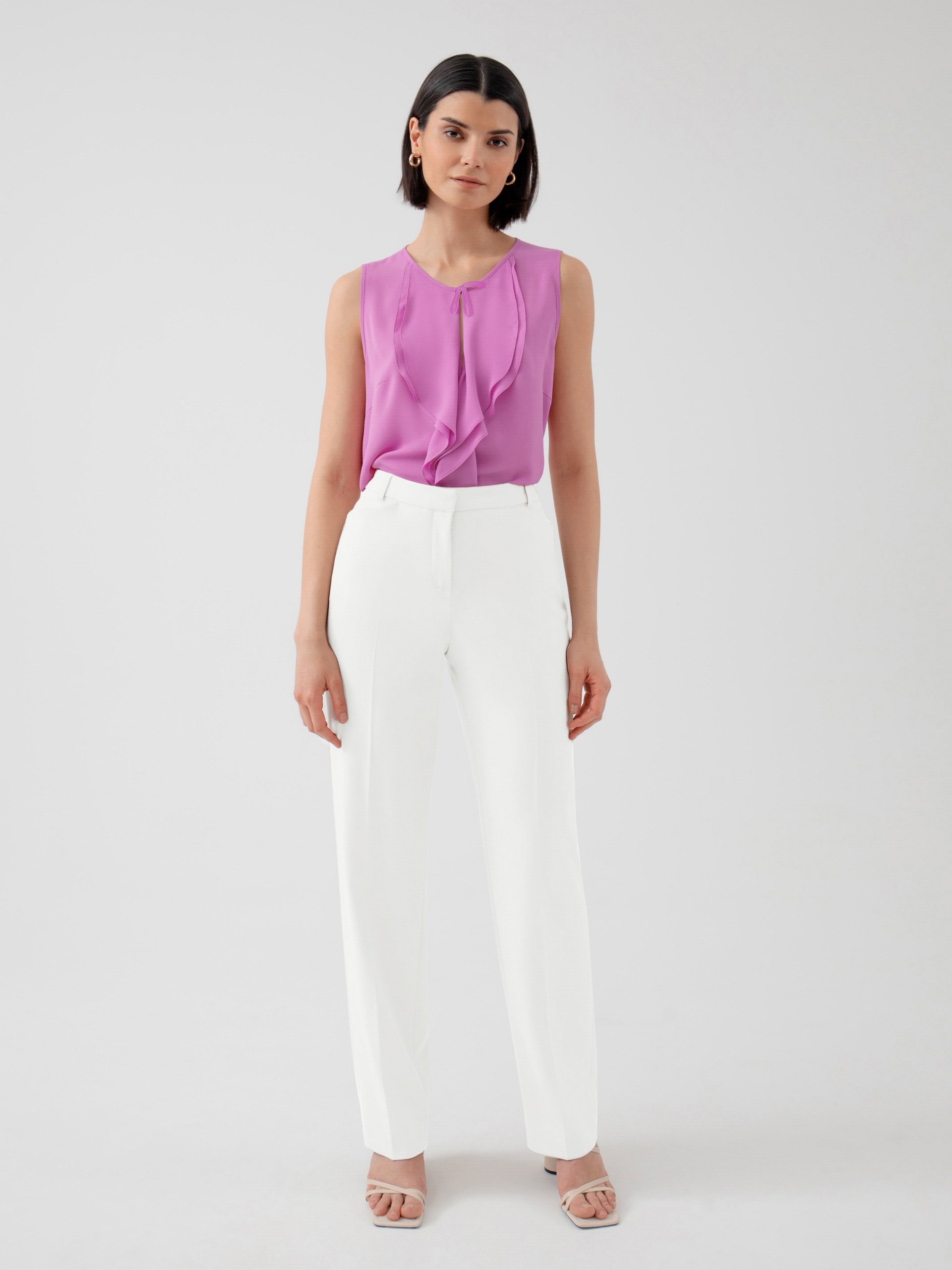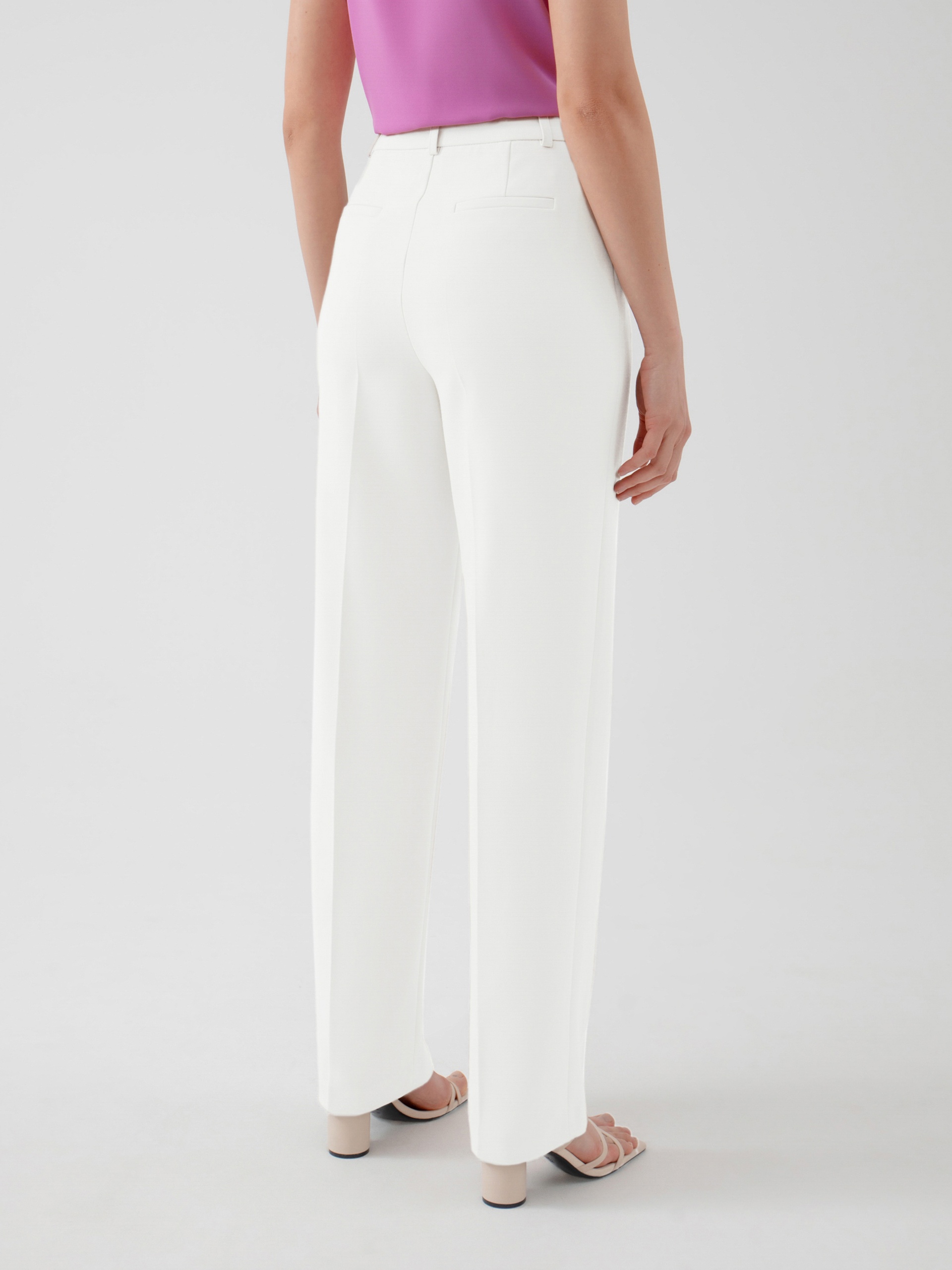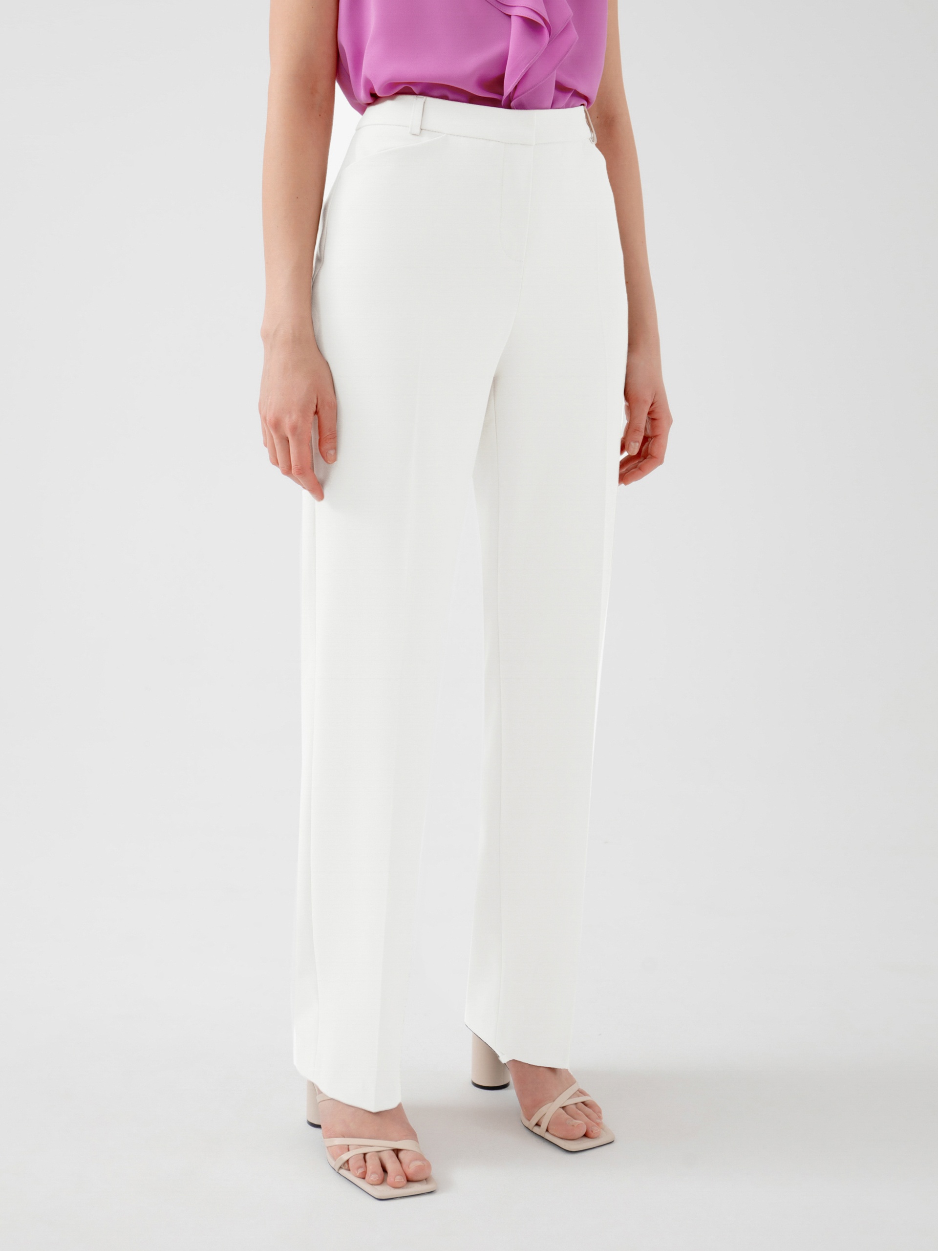 Прямые брюки на высокой посадке из костюмной ткани в молочном цвете. С активными карманами по переду и на притачном поясе.