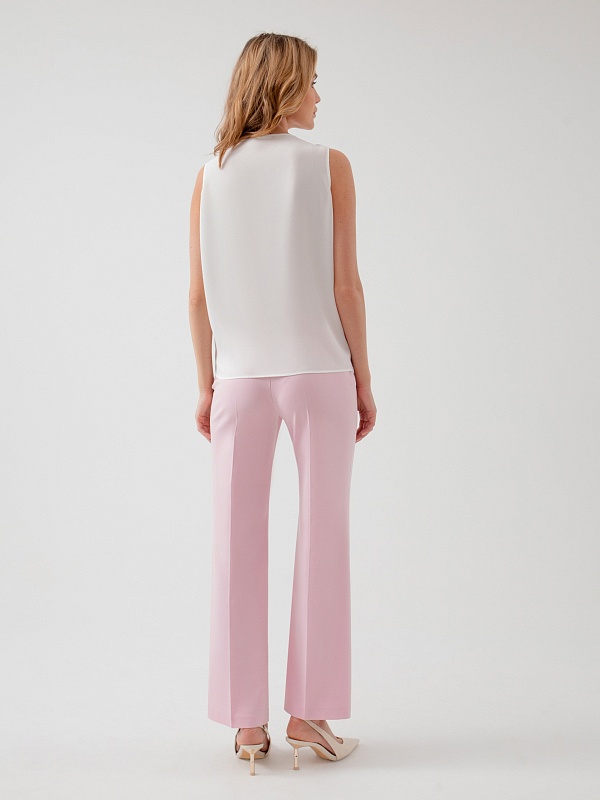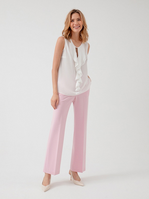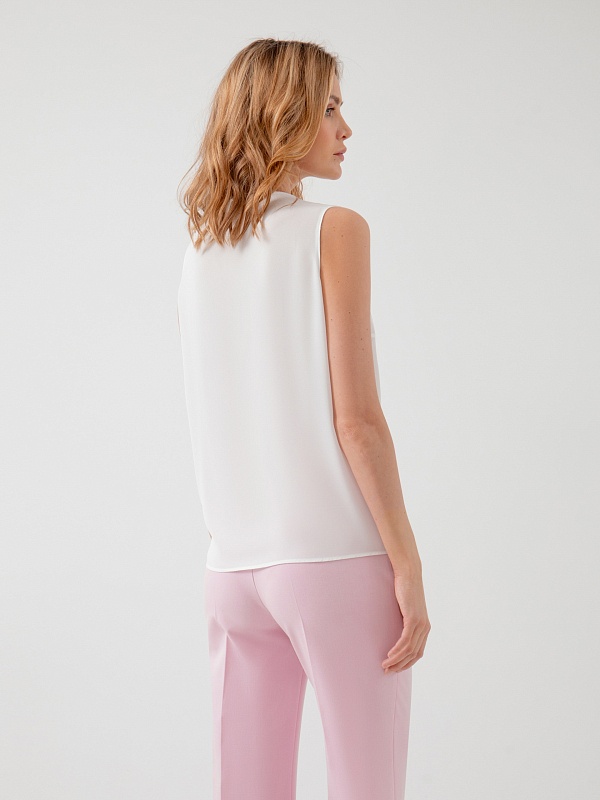 Романтичная блузка прямого силуэта без рукавов с круглым вырезом, воланом и каплей по переду блузы. Блуза выполнена из тонкой шифоновой ткани в белом цвете.