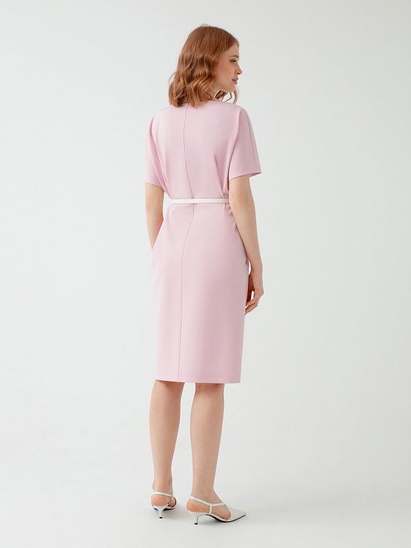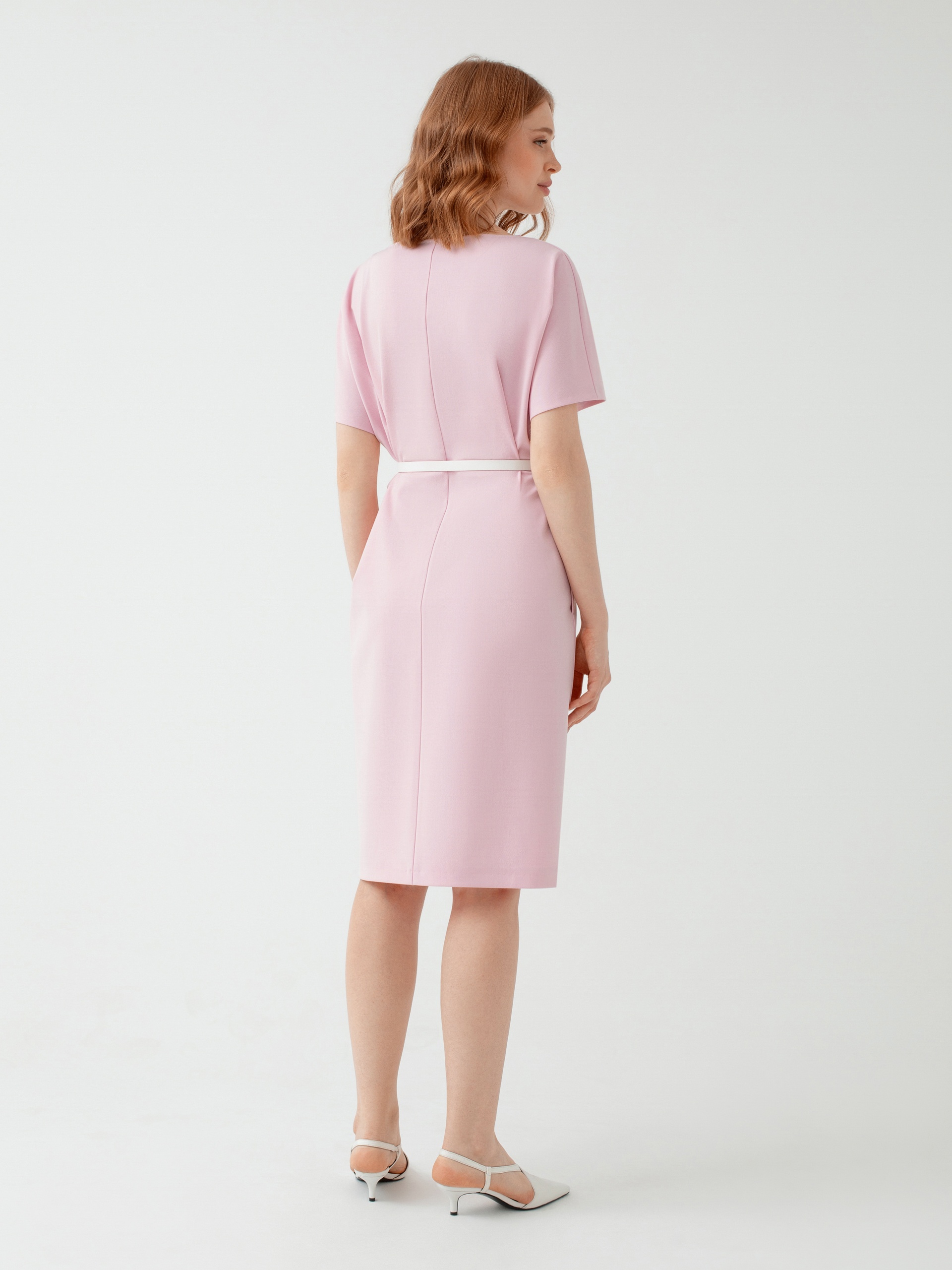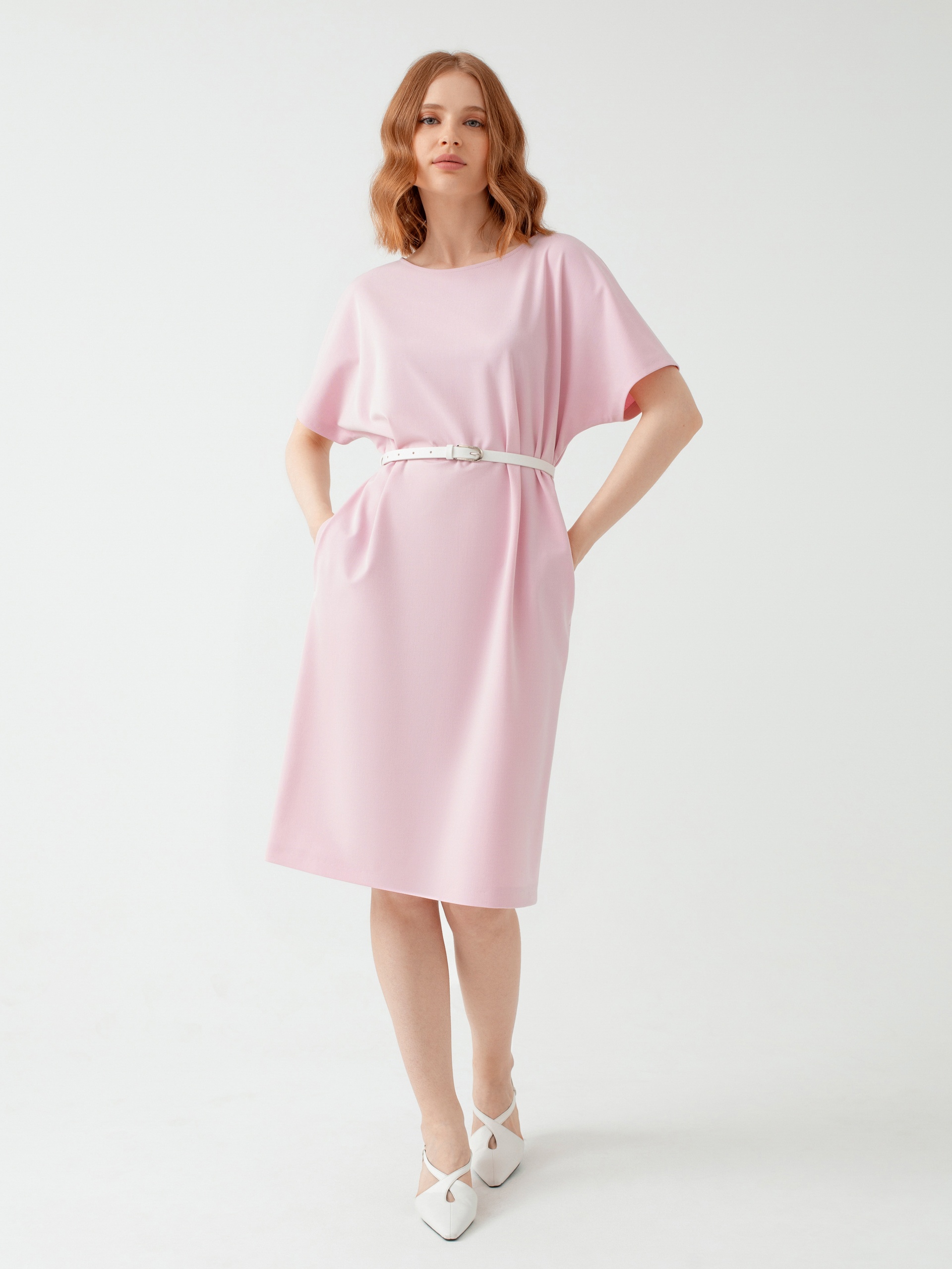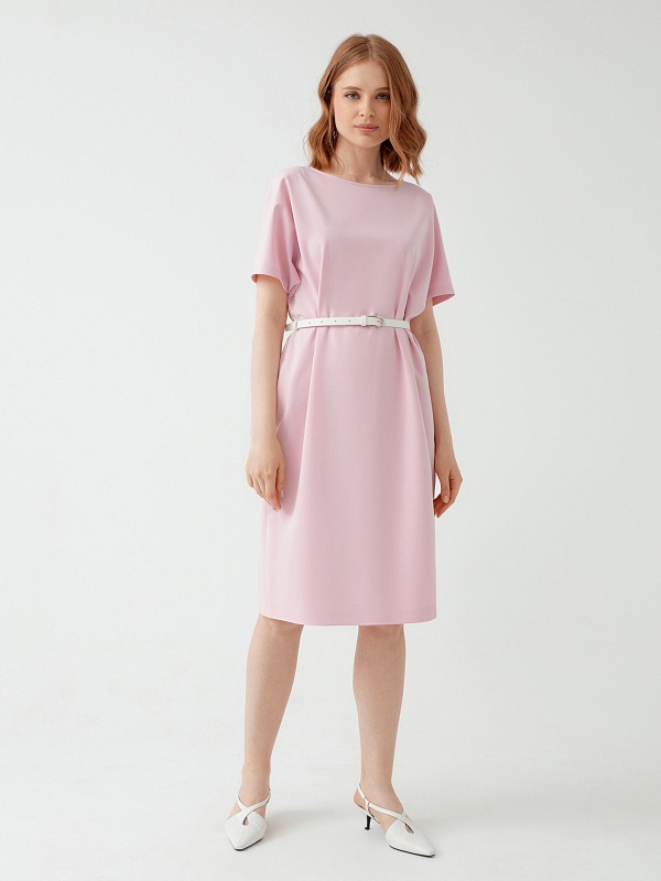 Женственное платье из костюмной ткани в светло-розовом цвете, полуприлегающего силуэта с горловиной лодочка и коротким рукавом кимоно. На талии тонкий ремень в молочном цвете. Незаменимая модель для комфортных повседневных образов.
