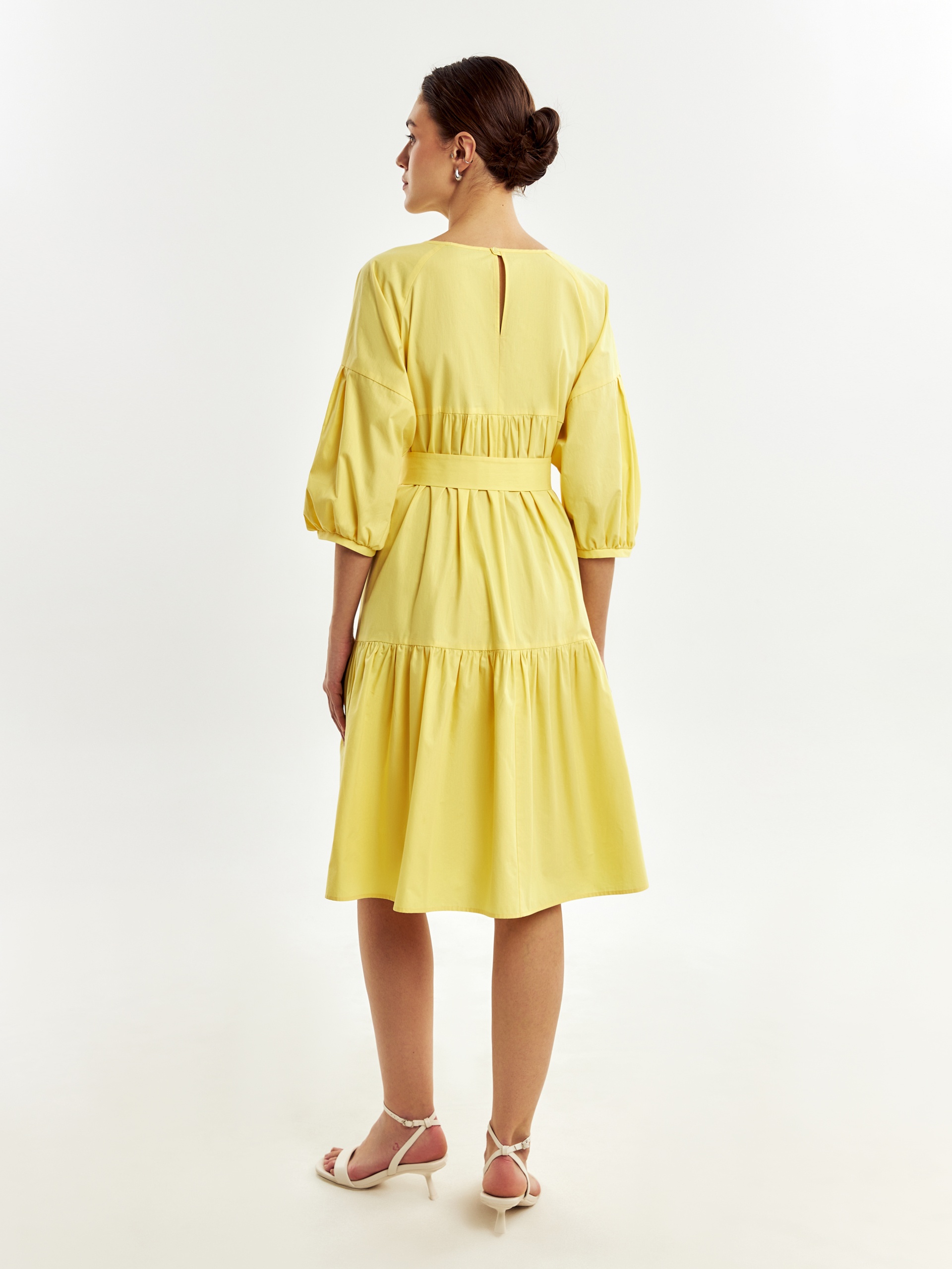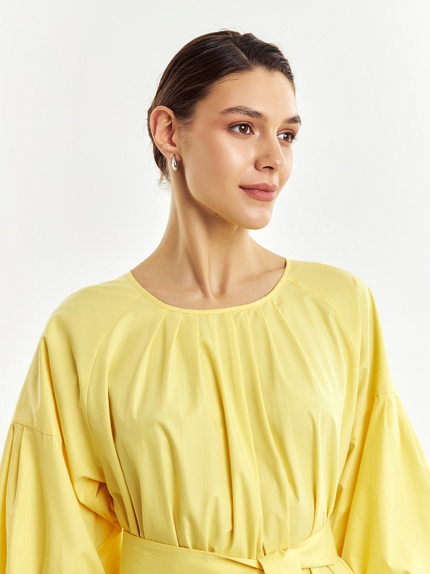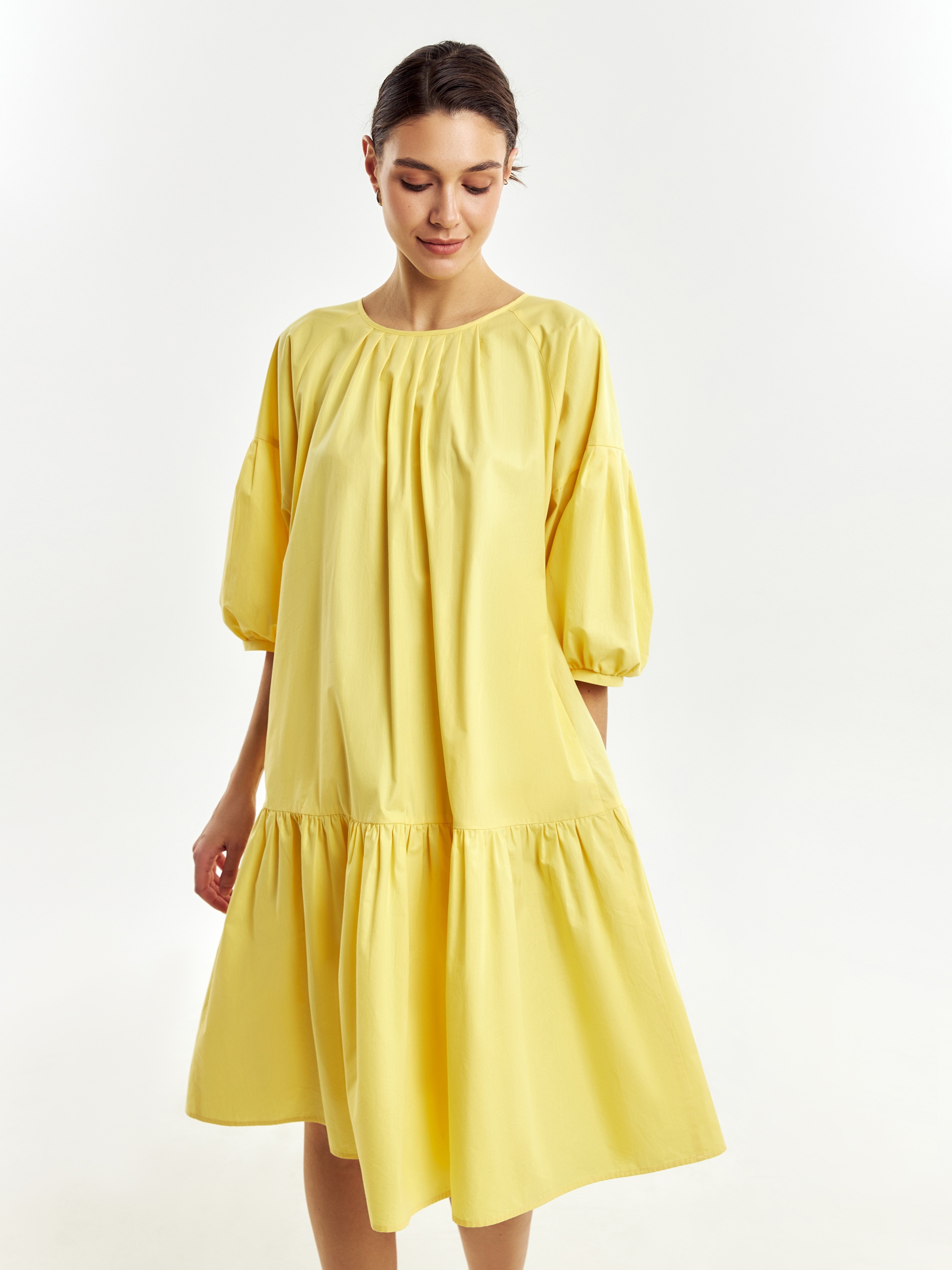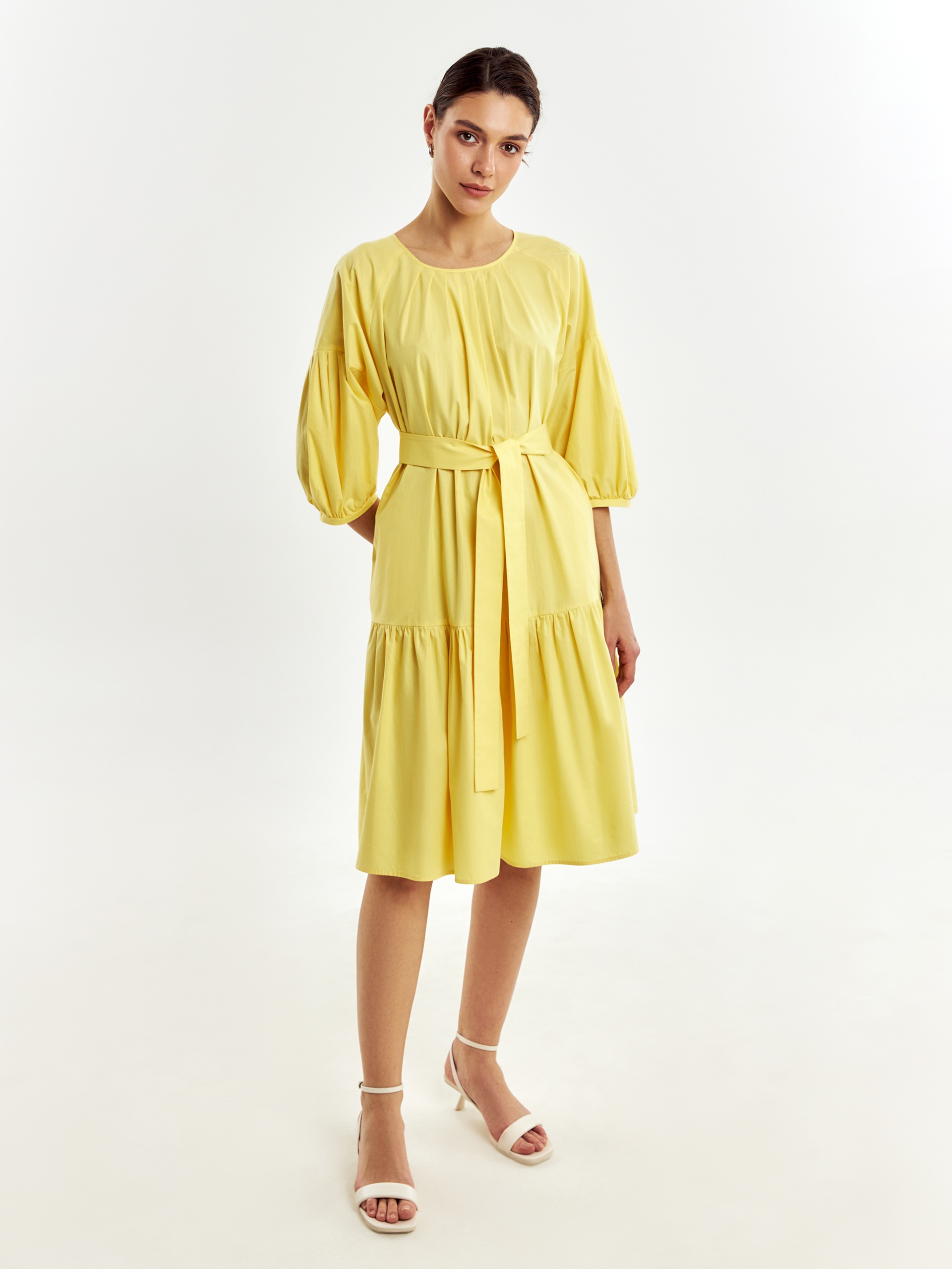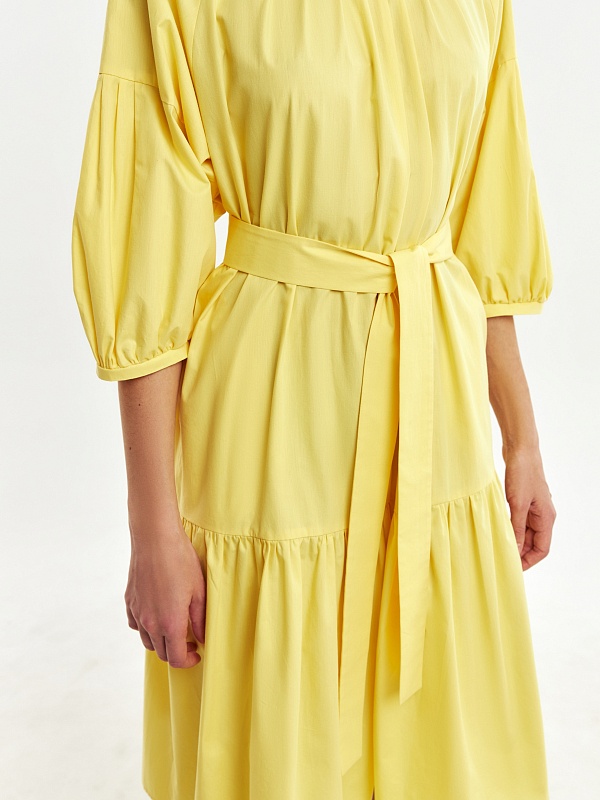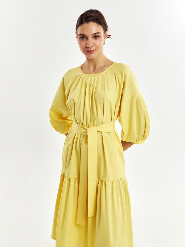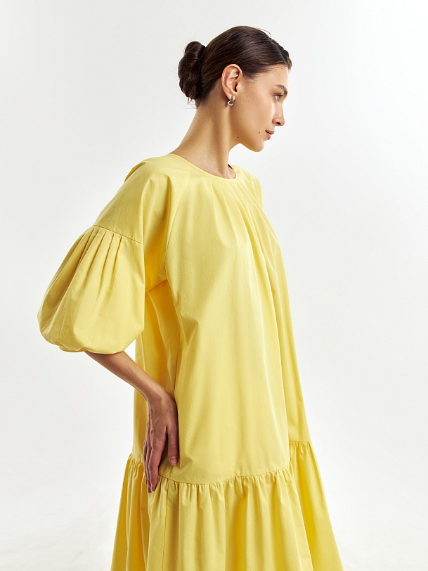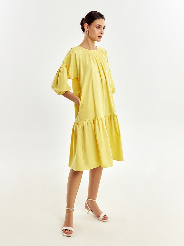 Романтичное свободное платье из 100% хлопка в ярком и жезнерадостном желтом цвете. Горловина и рукава со складками, по низу платья идет широкий волан. На спинке капелька с пуговицей для лучшей посадки. В комплект входит пояс из основной ткани для придания приталенного силуэта.