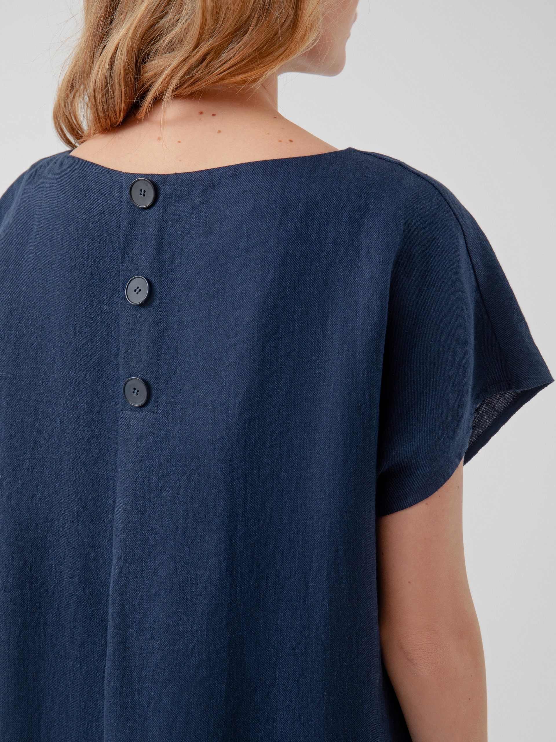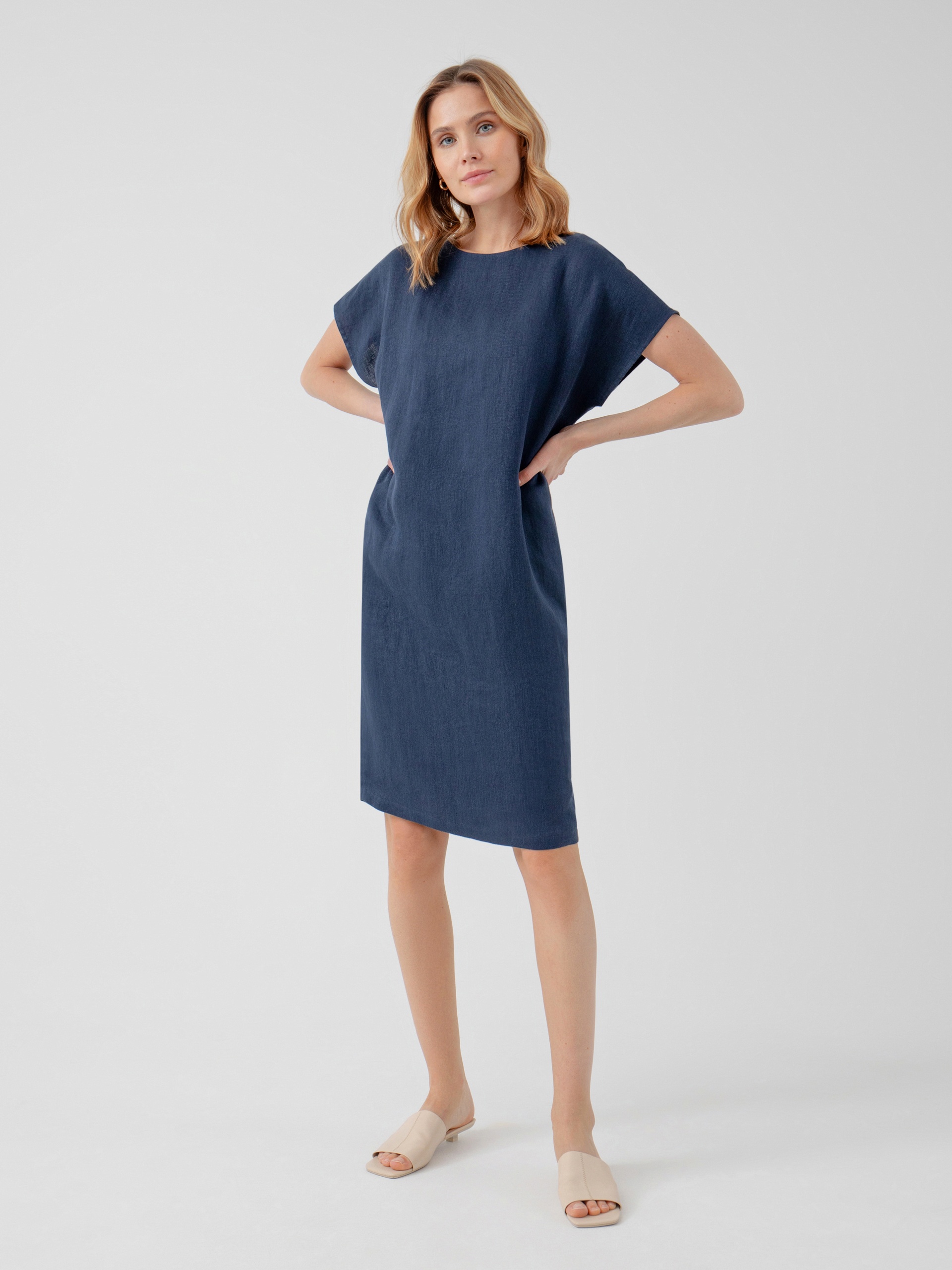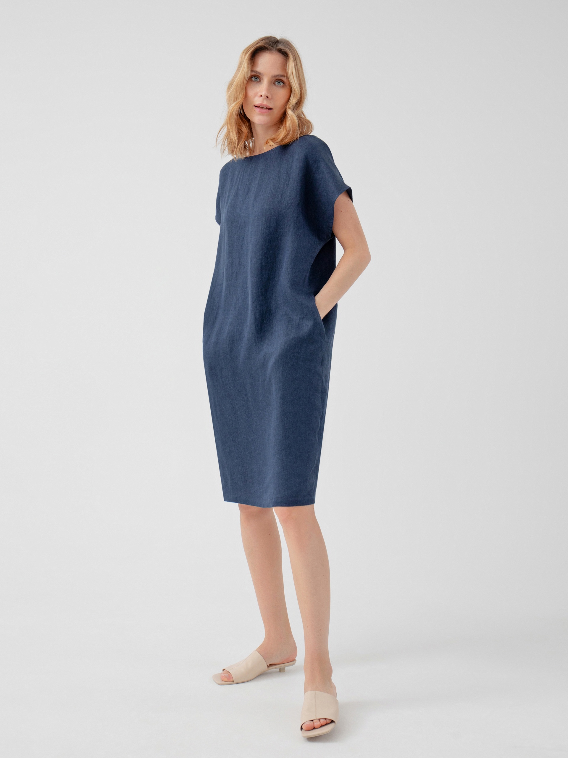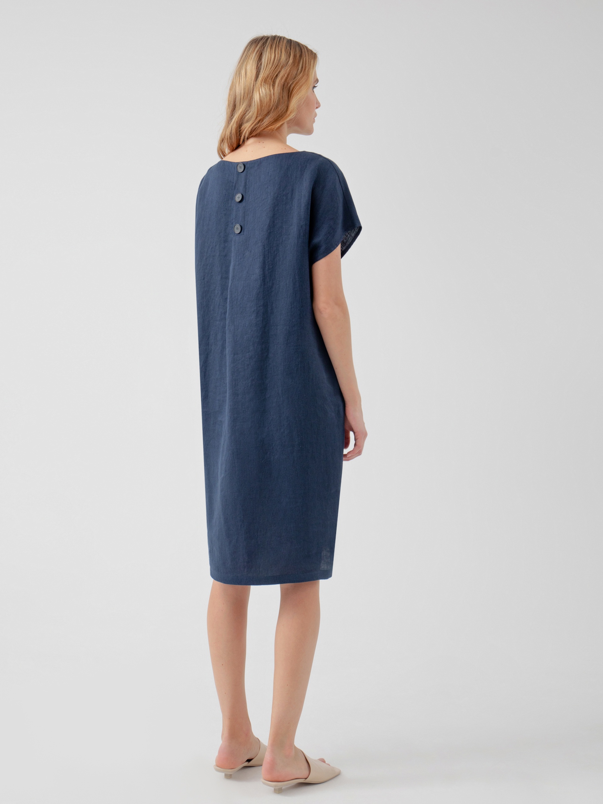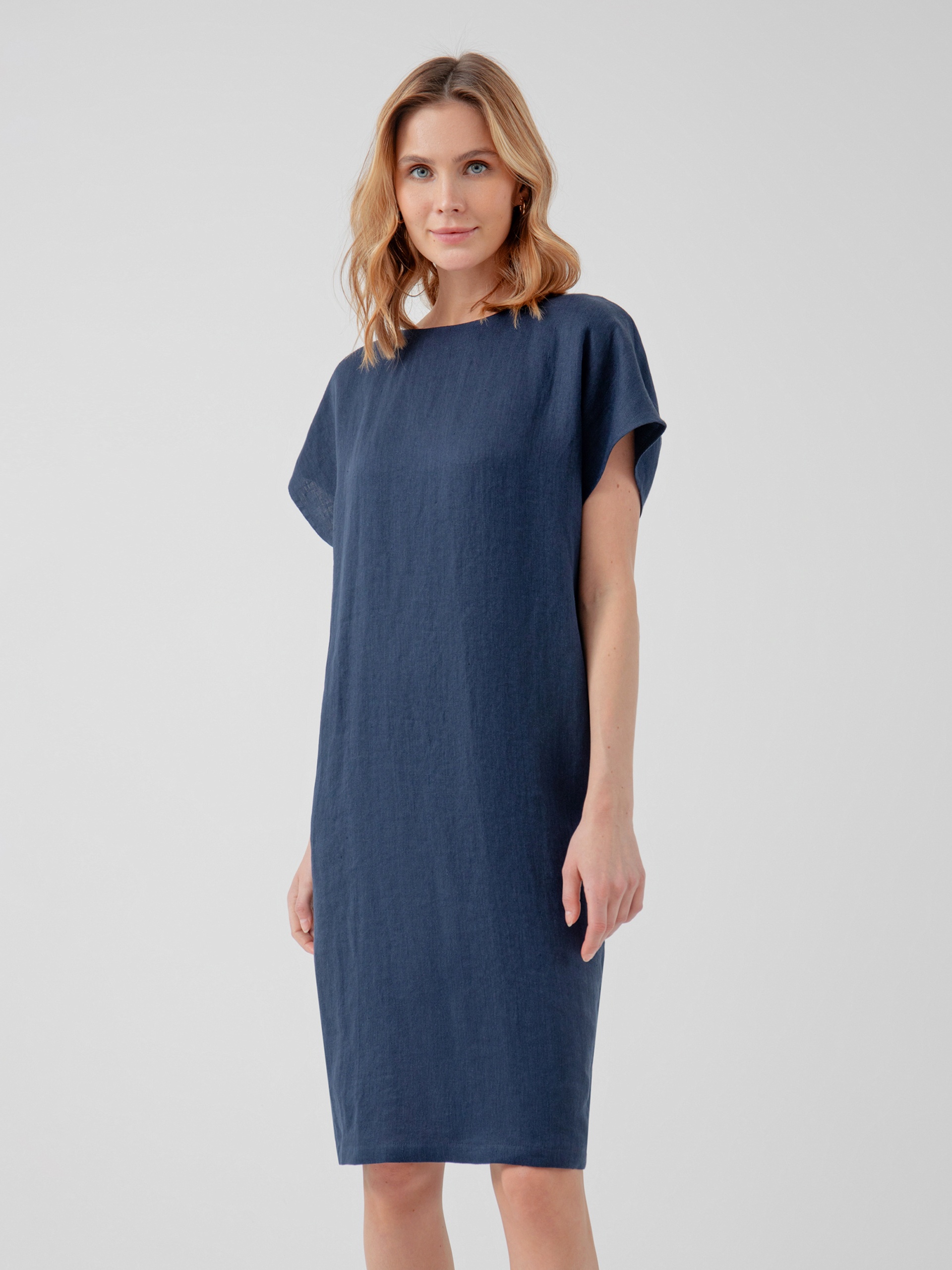 Платье-кокон с горловиной лодочкой, складкой на спине и планкой с имитацией пуговиц. Платье длиной до колена из льняной ткани в темно-синем цвете.