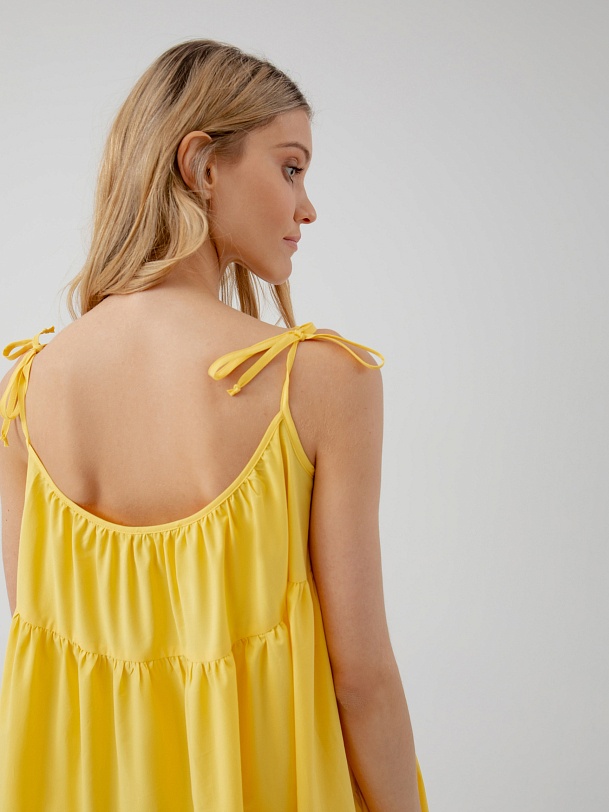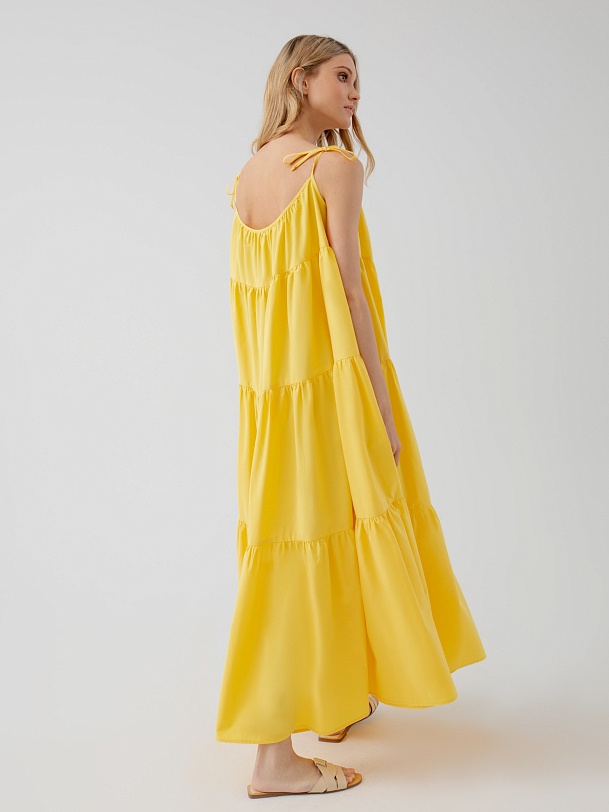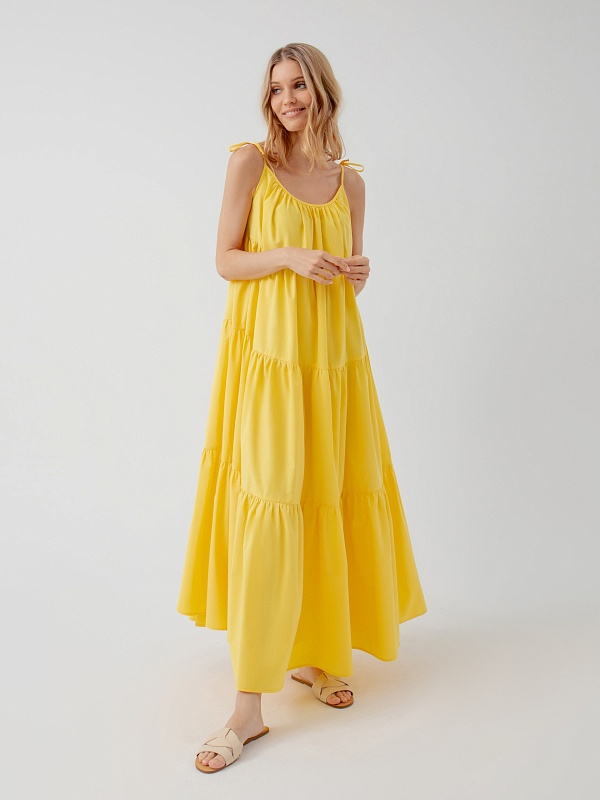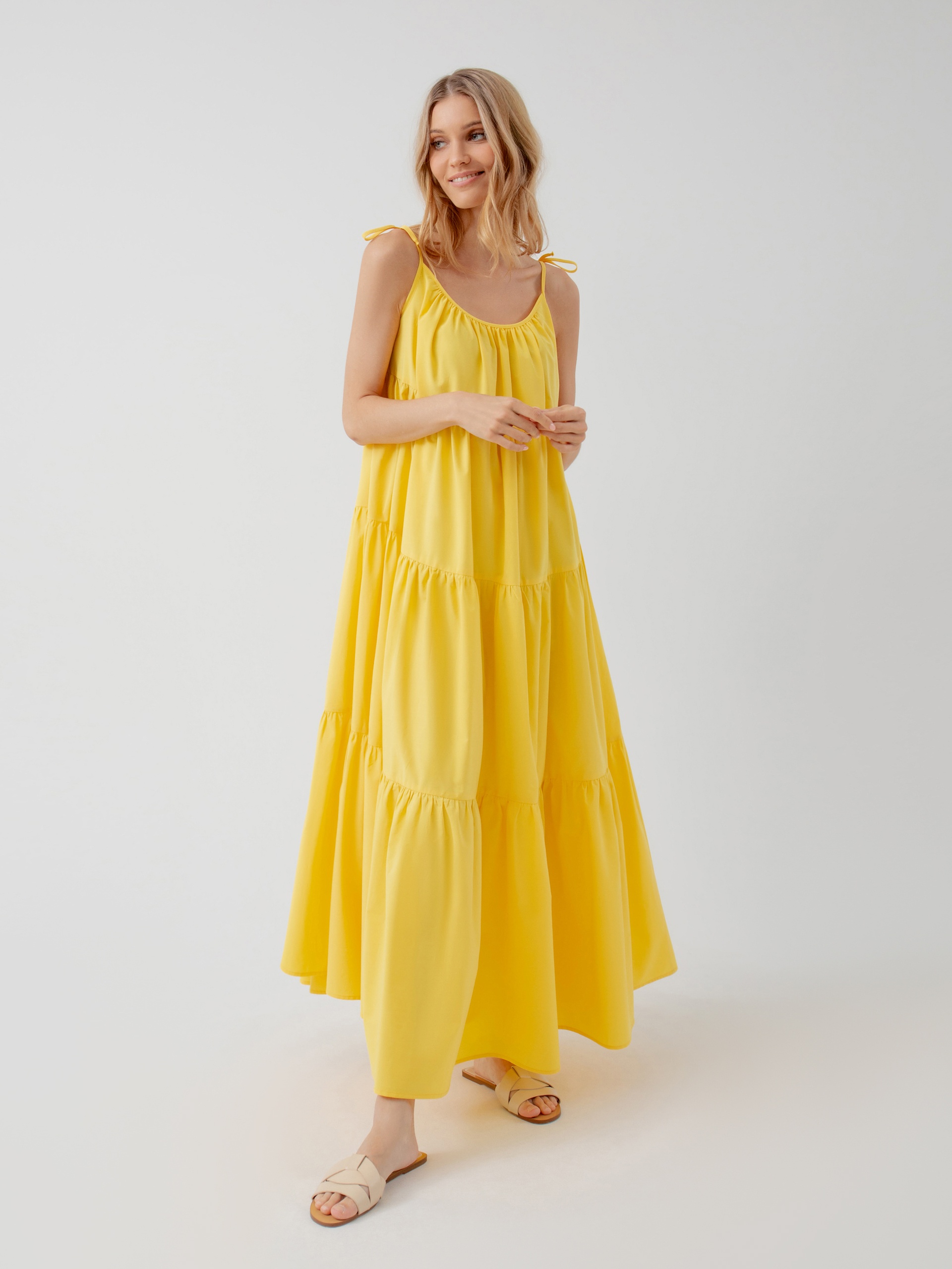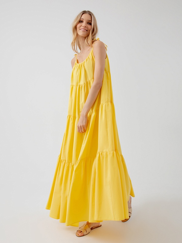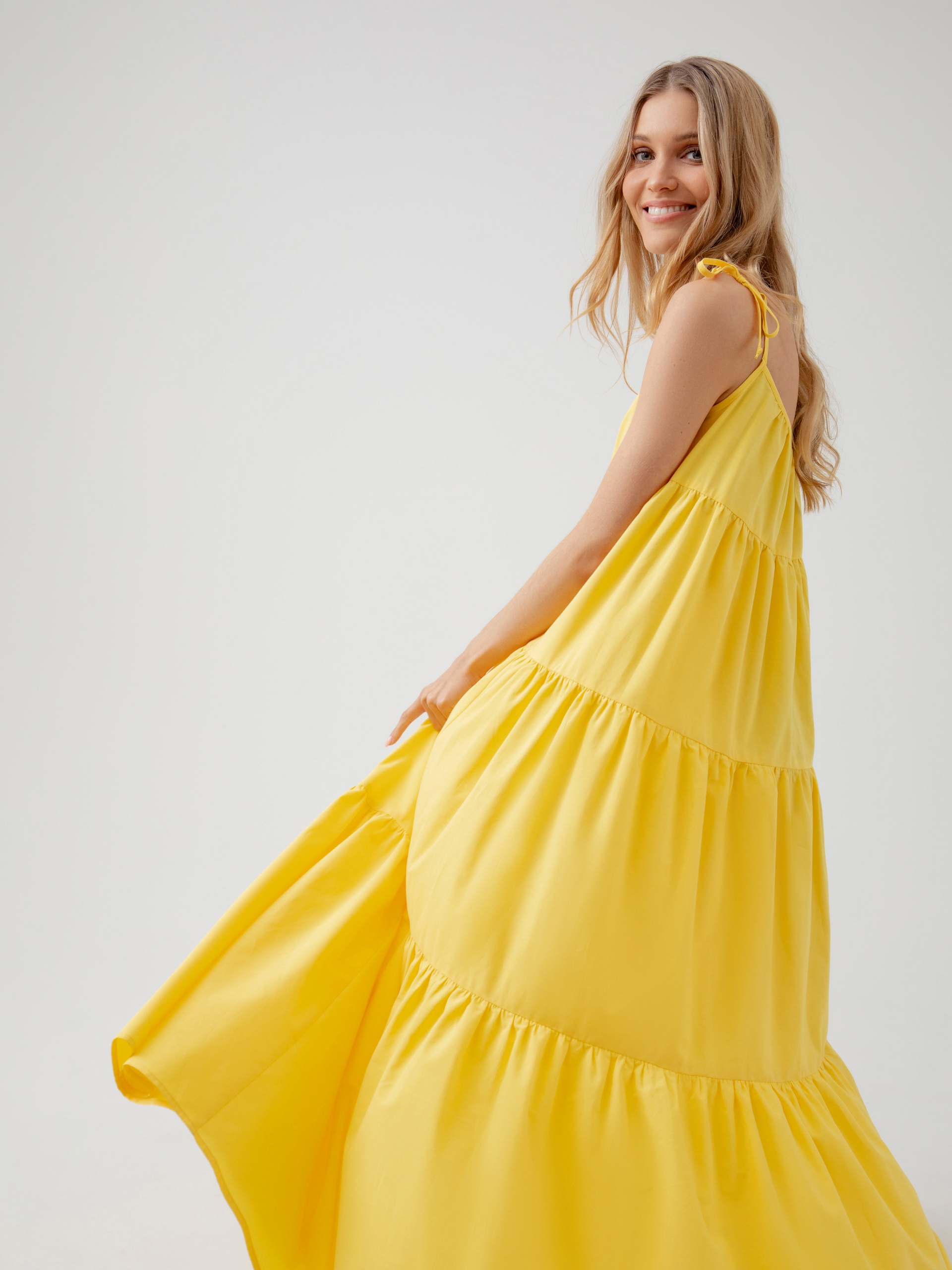 Платье-макси на тонких бретелях из 100% хлопка в ярко-желтом цвете А-силуэта, состоит из нескольких воланов. В таком платье вы будете ярко выделяться на прогулке у моря или романтичном свидании.