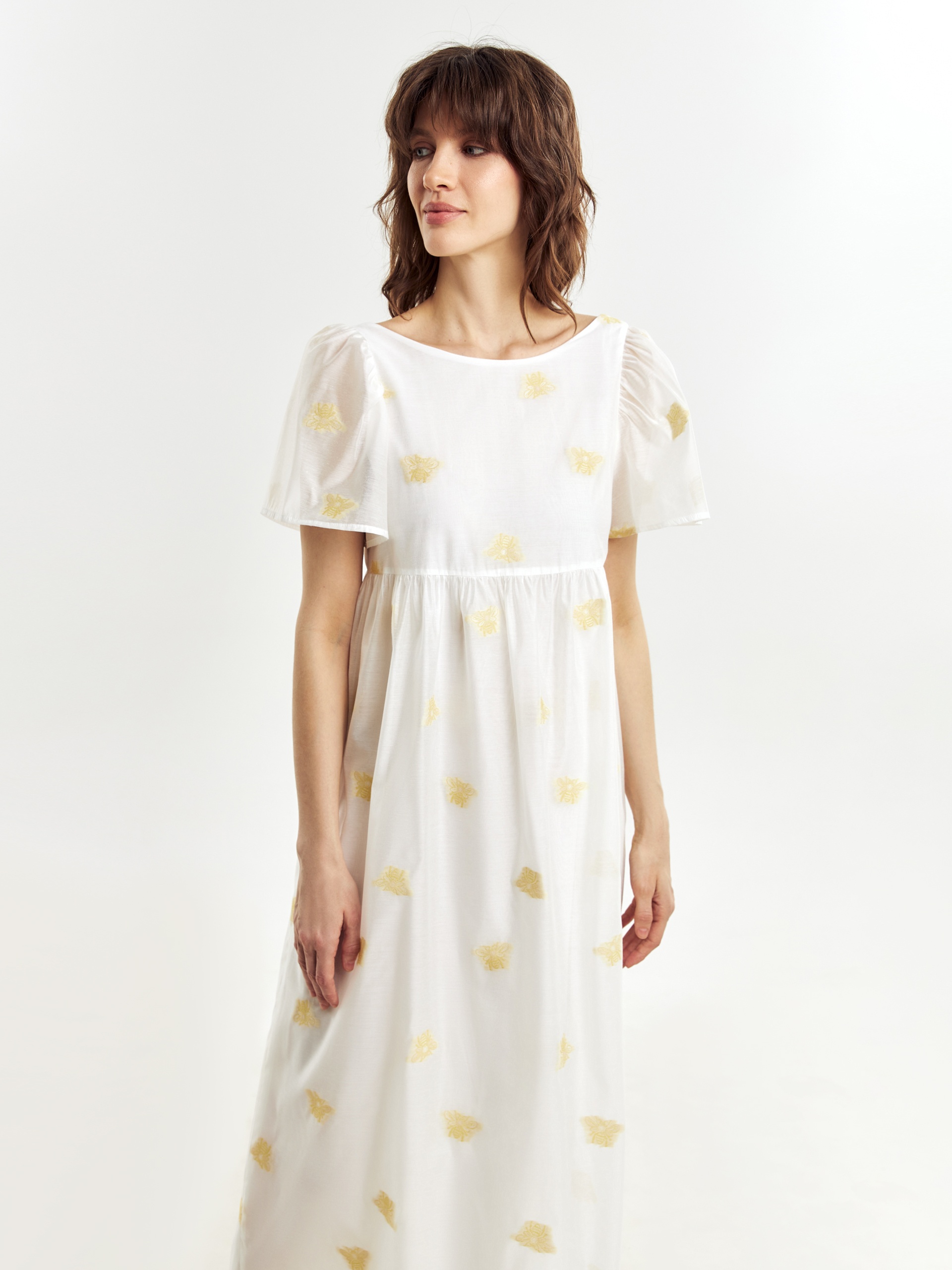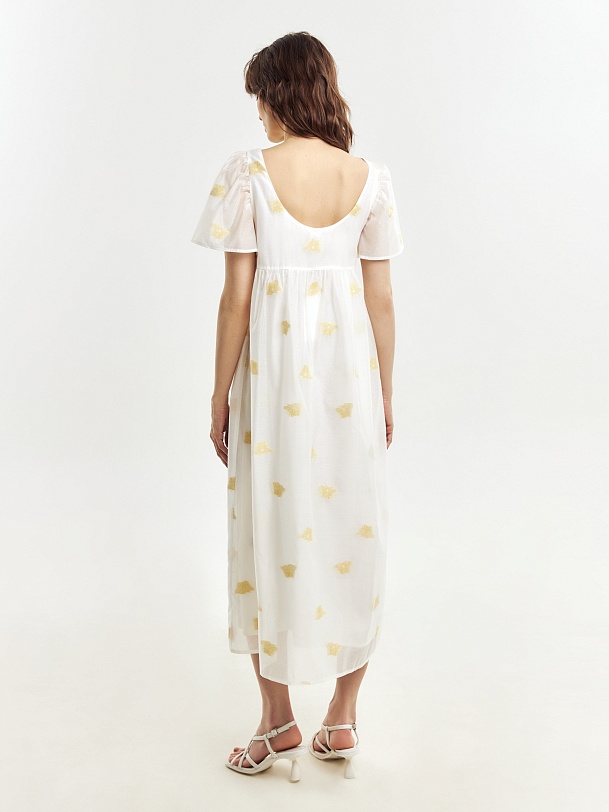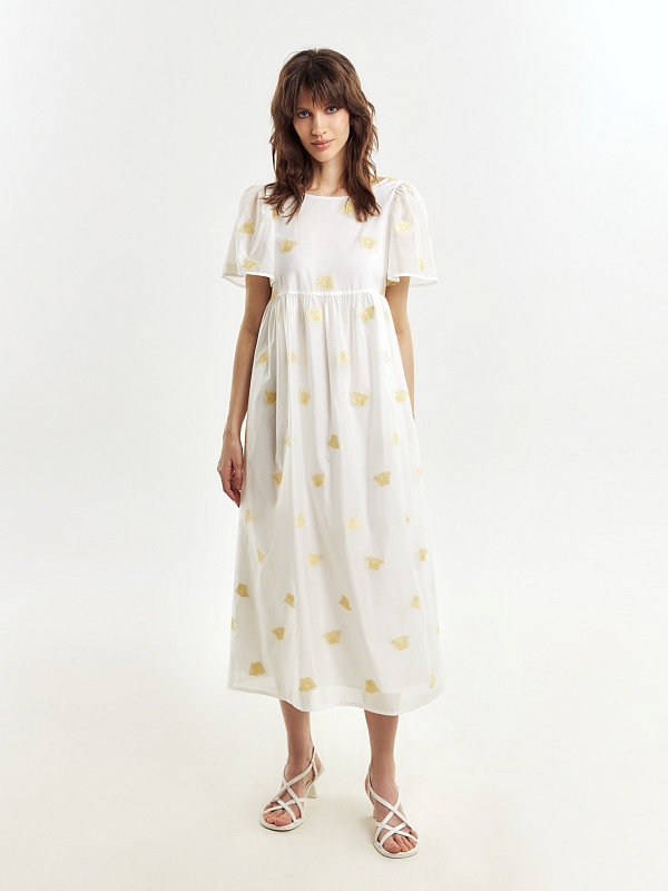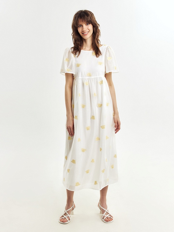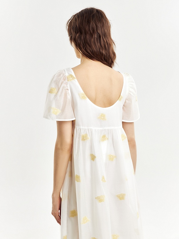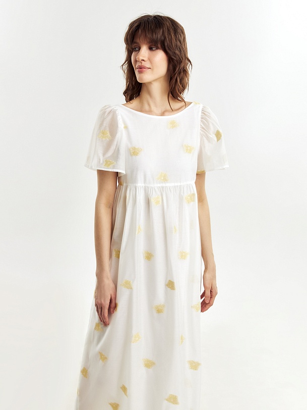 Легкое платье свободного кроя в романтическом стиле из вискозной ткани с вышивкой. Вырез горловины круглый, укороченный рукав-фонарик. Платье очень воздушное и комфортное в носке. На подкладке.