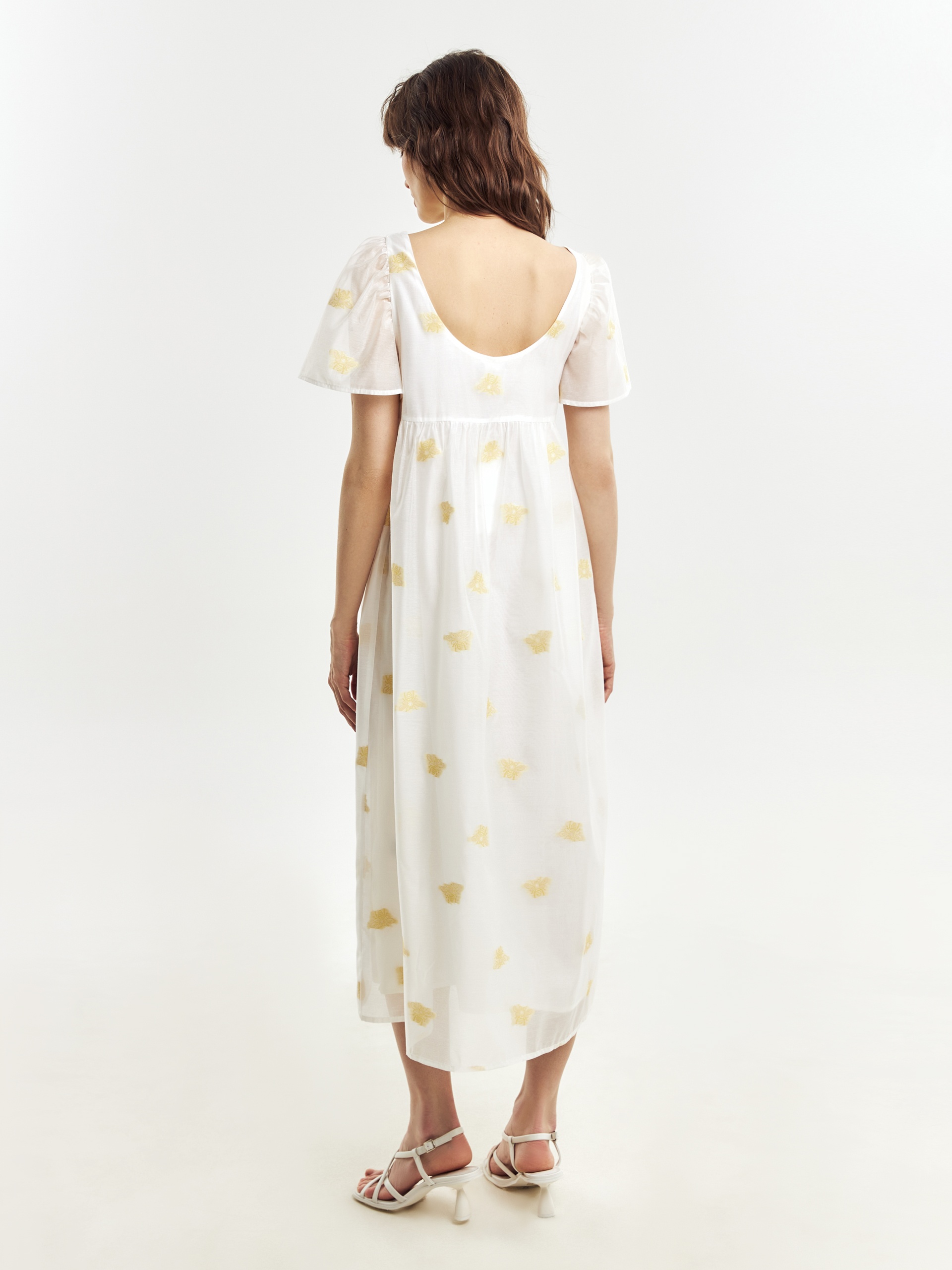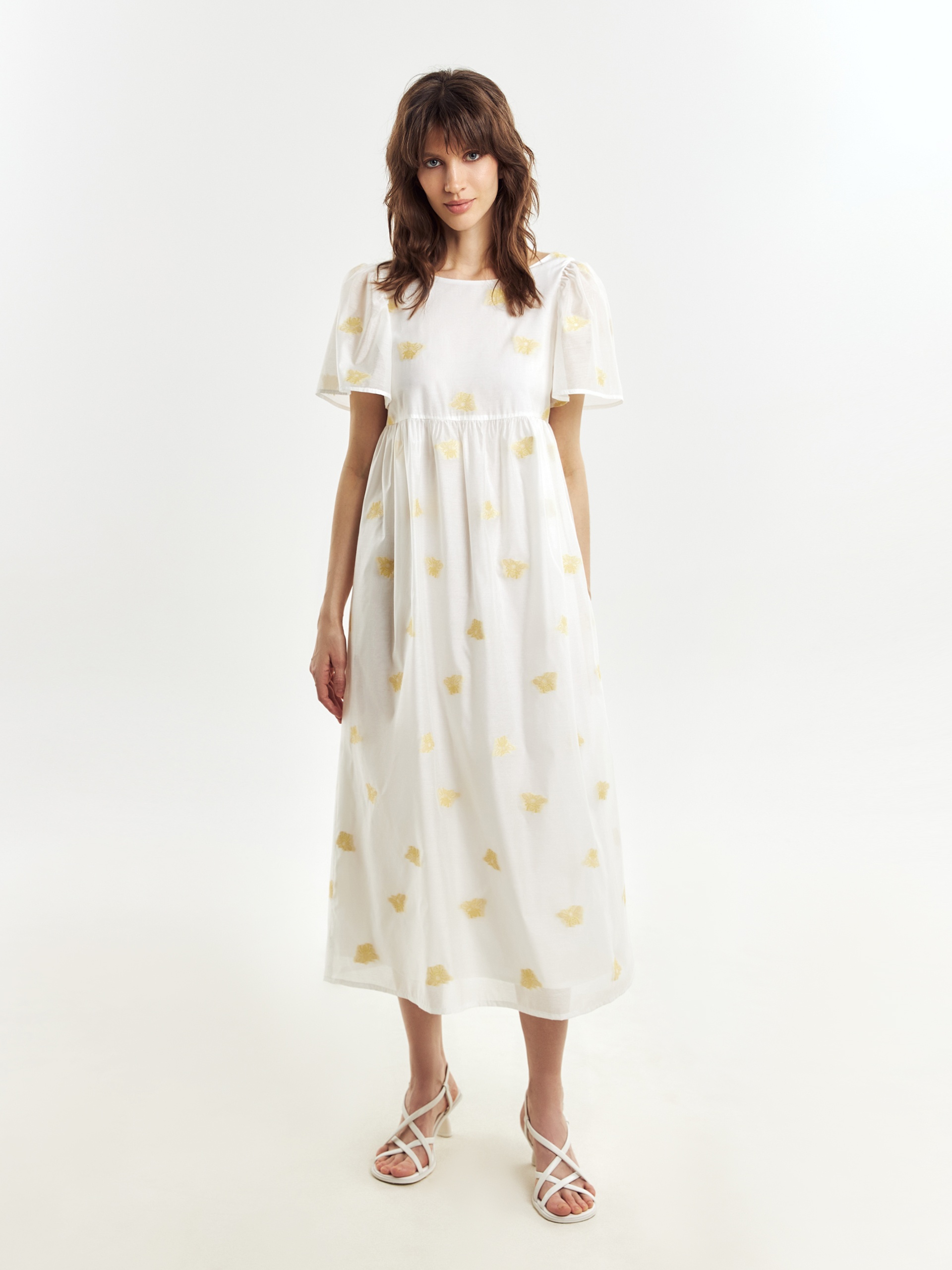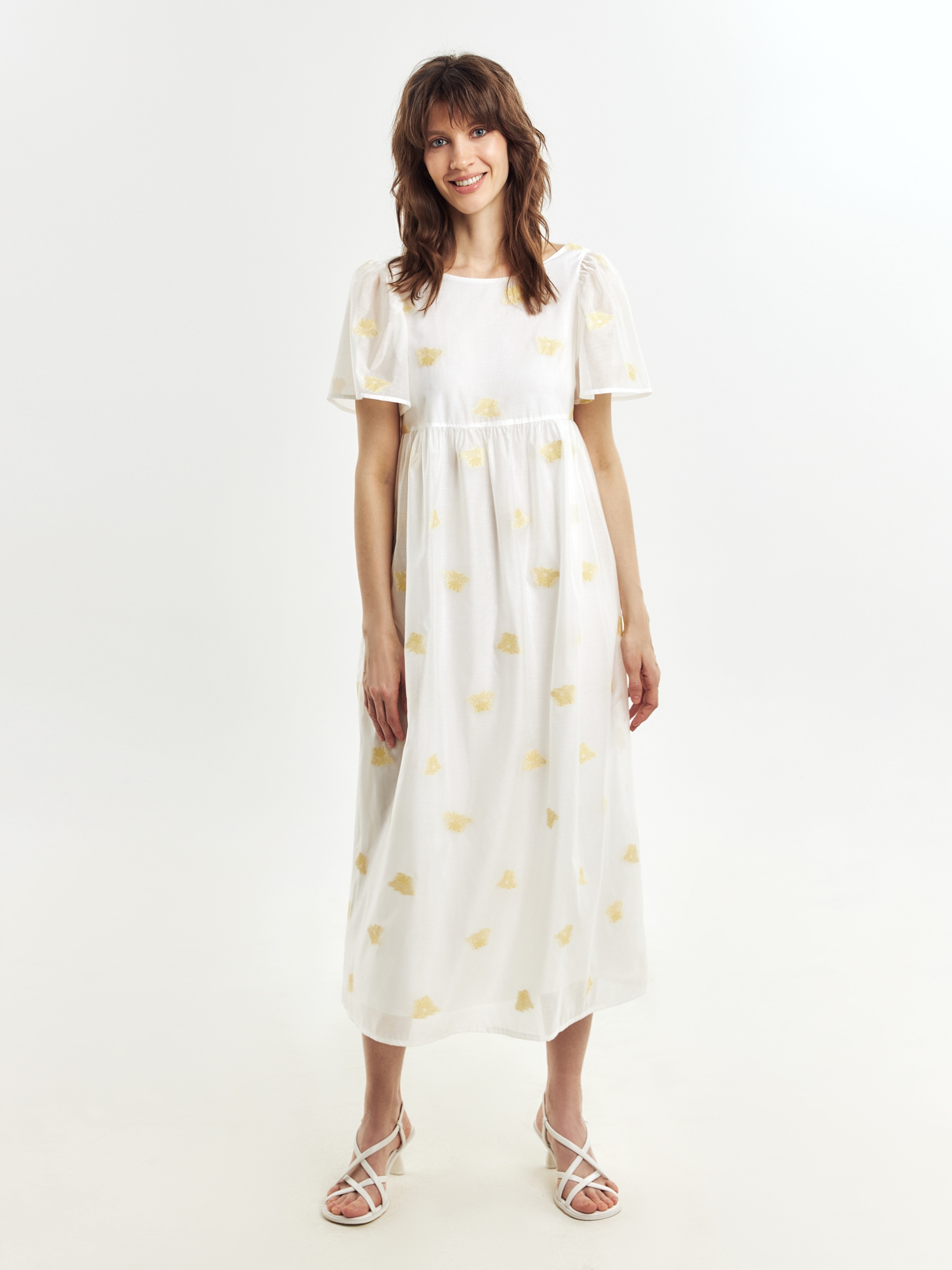 Легкое платье свободного кроя в романтическом стиле из вискозной ткани с вышивкой. Вырез горловины круглый, укороченный рукав-фонарик. Платье очень воздушное и комфортное в носке. На подкладке.