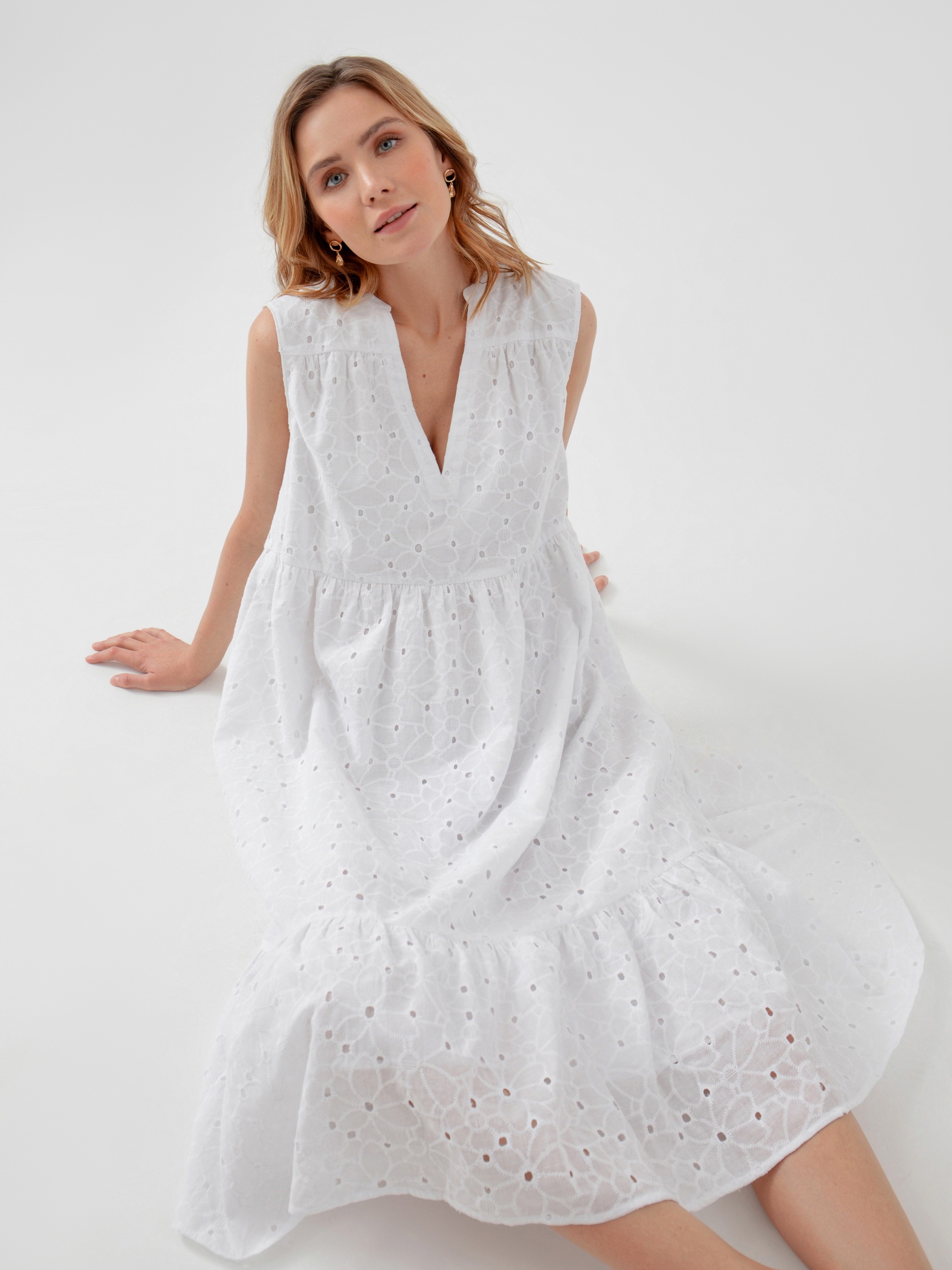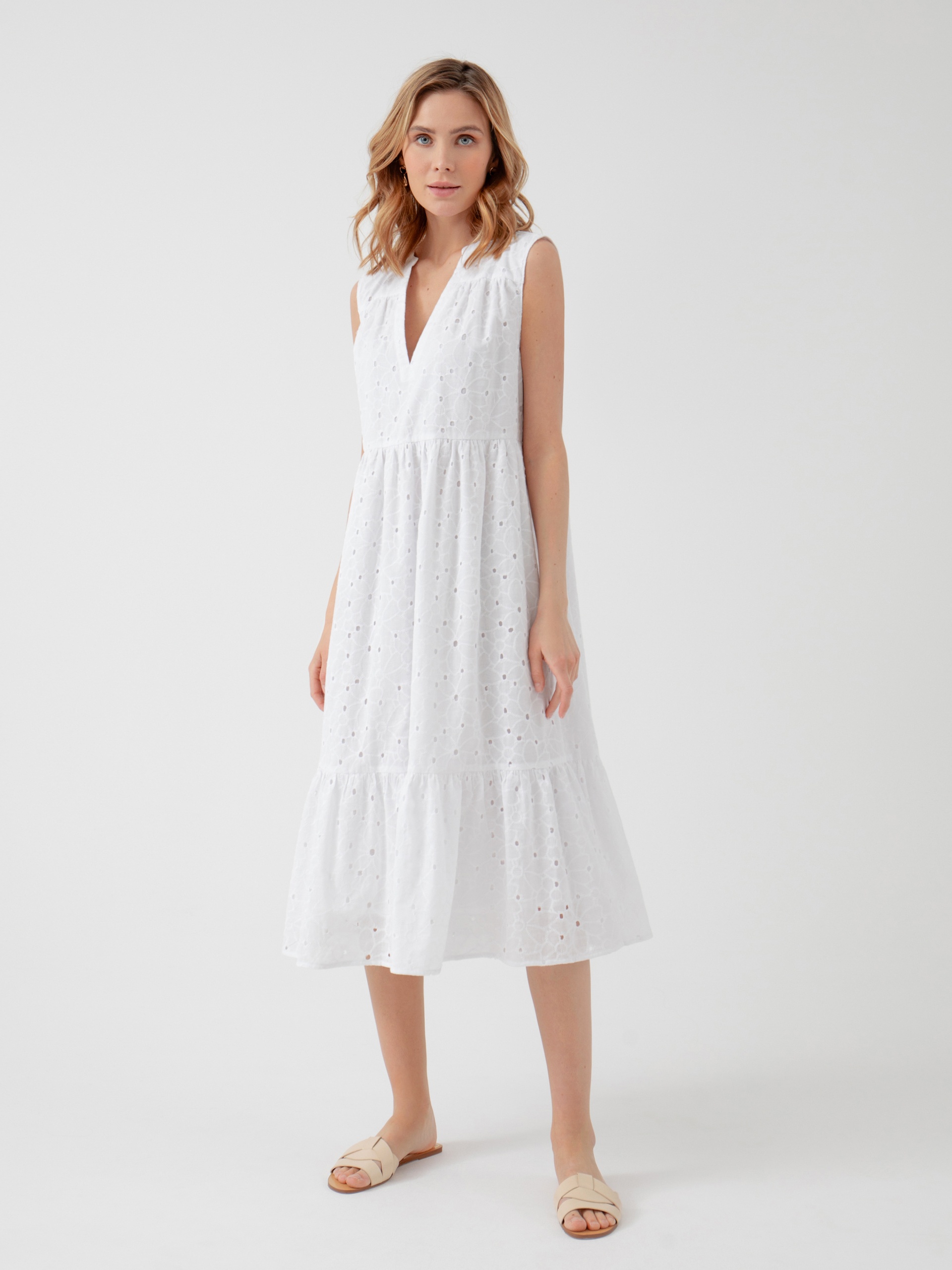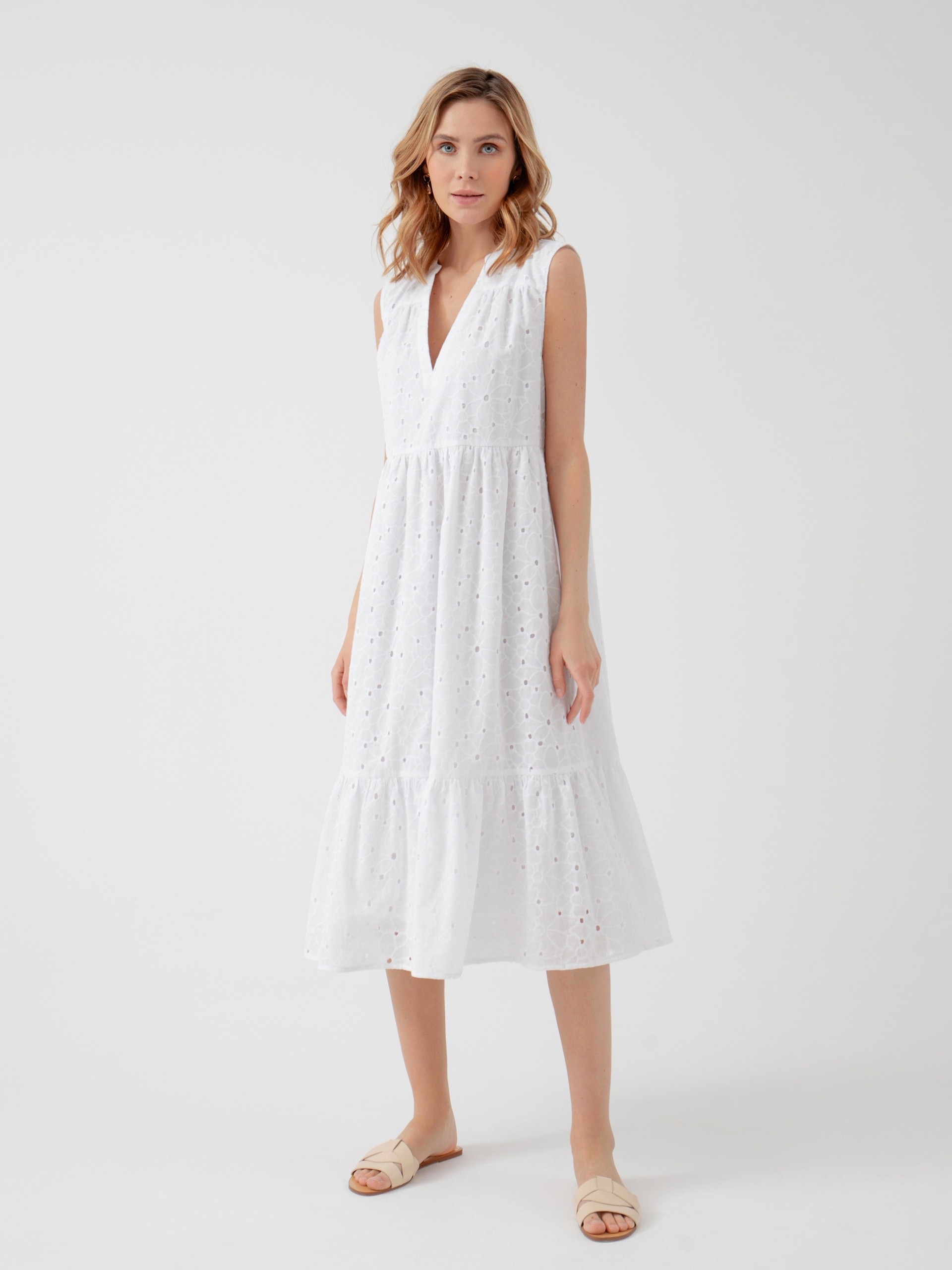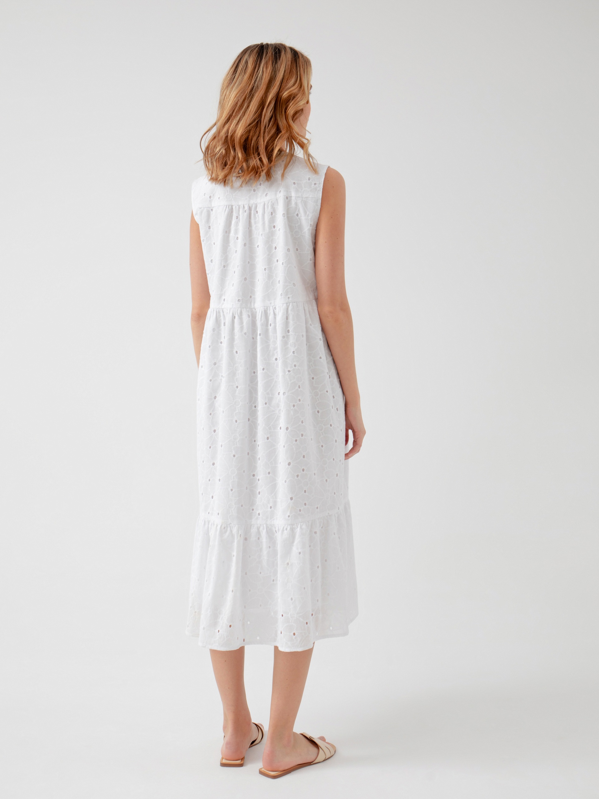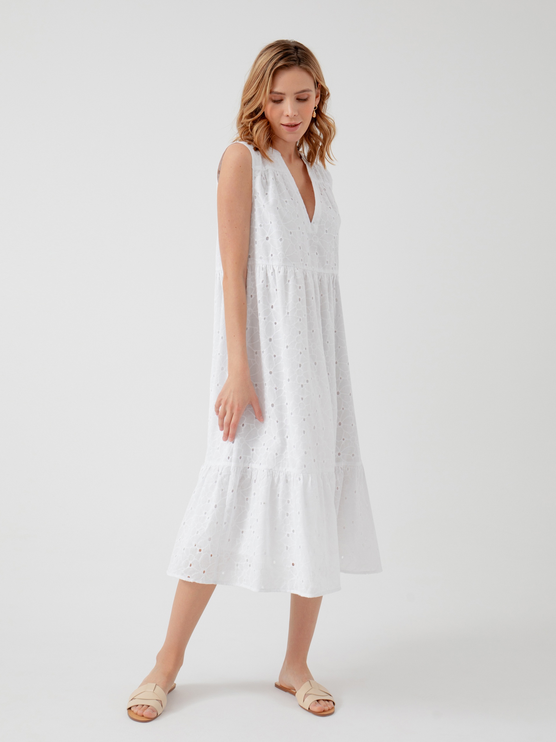 Длинное кружевное платье-кроше без рукавов. Силуэт трапеция, свободная посадка, круглый ворот со стойкой, завышенная линия талии, расклешенный кружевной подол с воланом.