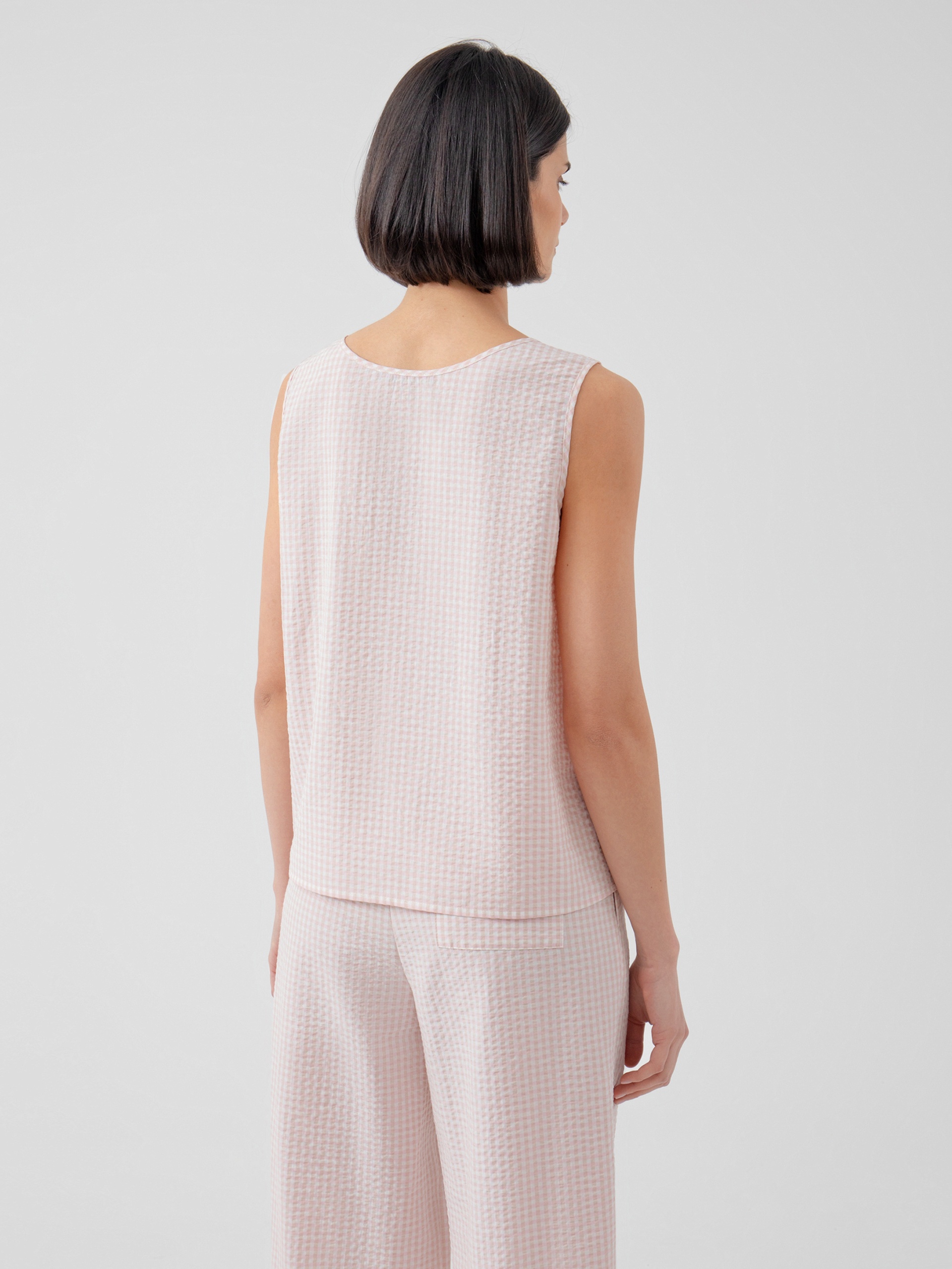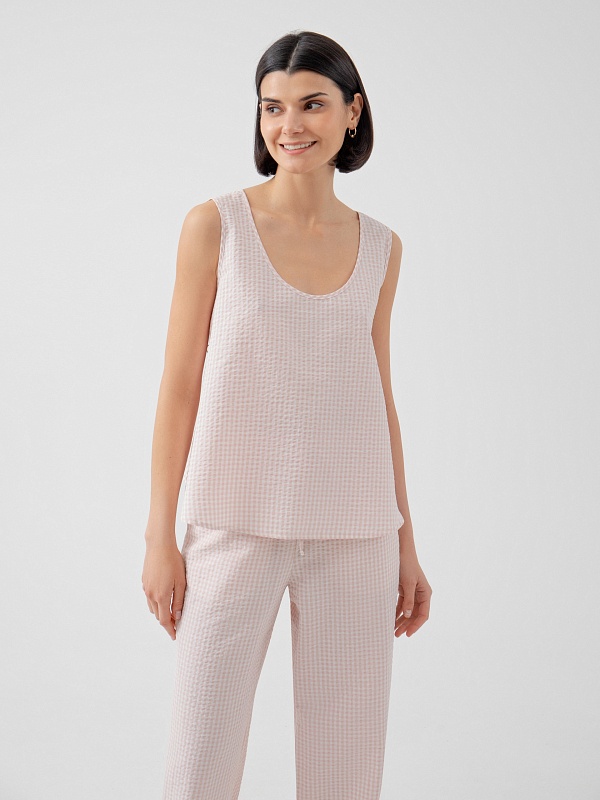 Блуза без рукавов трапециевидного силуэта на широких лямках и глубоким круглым вырезом.