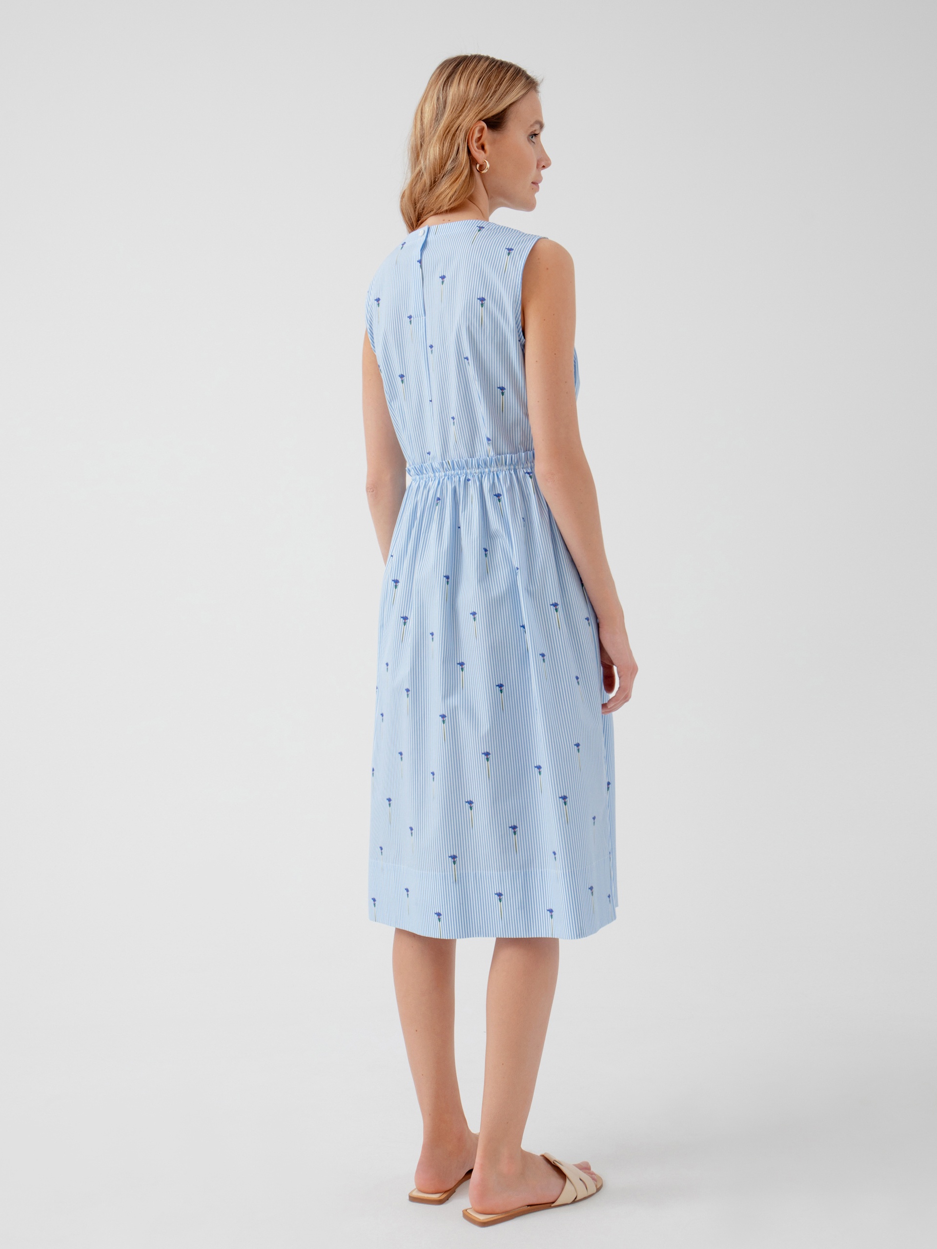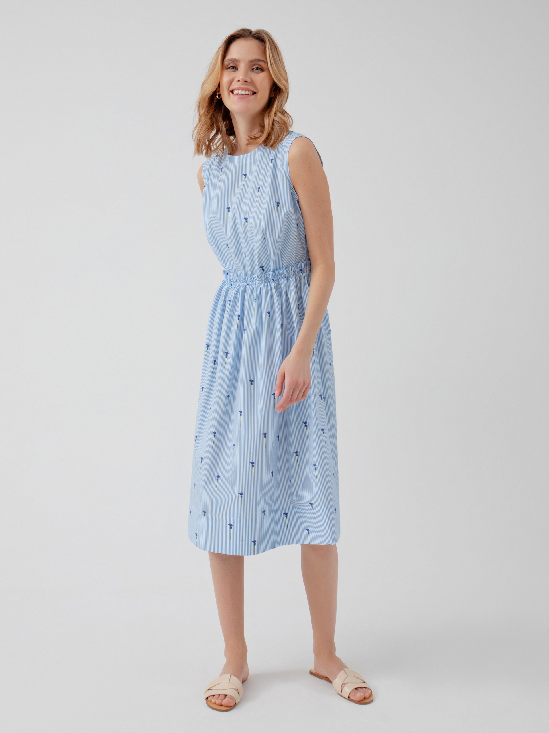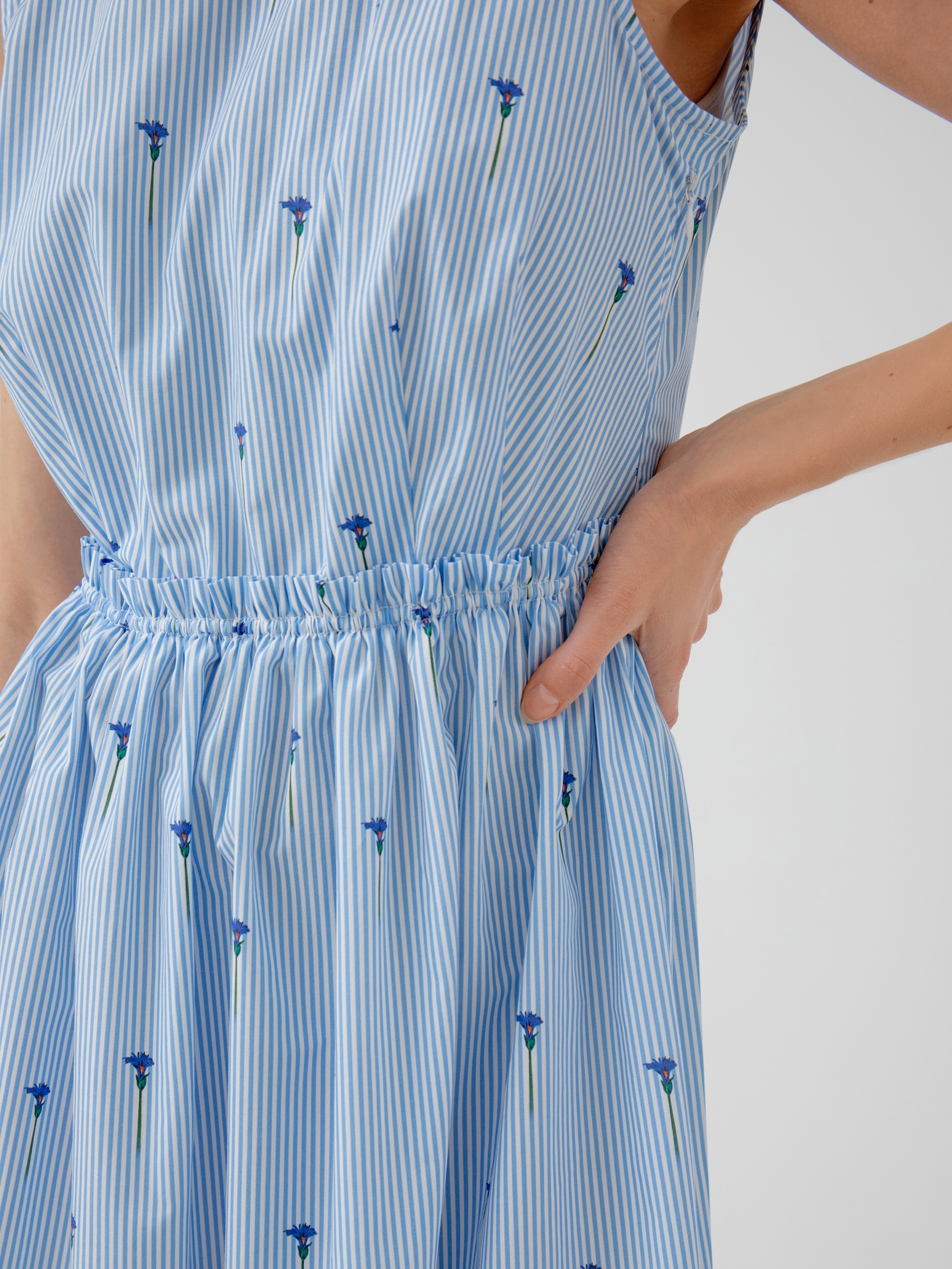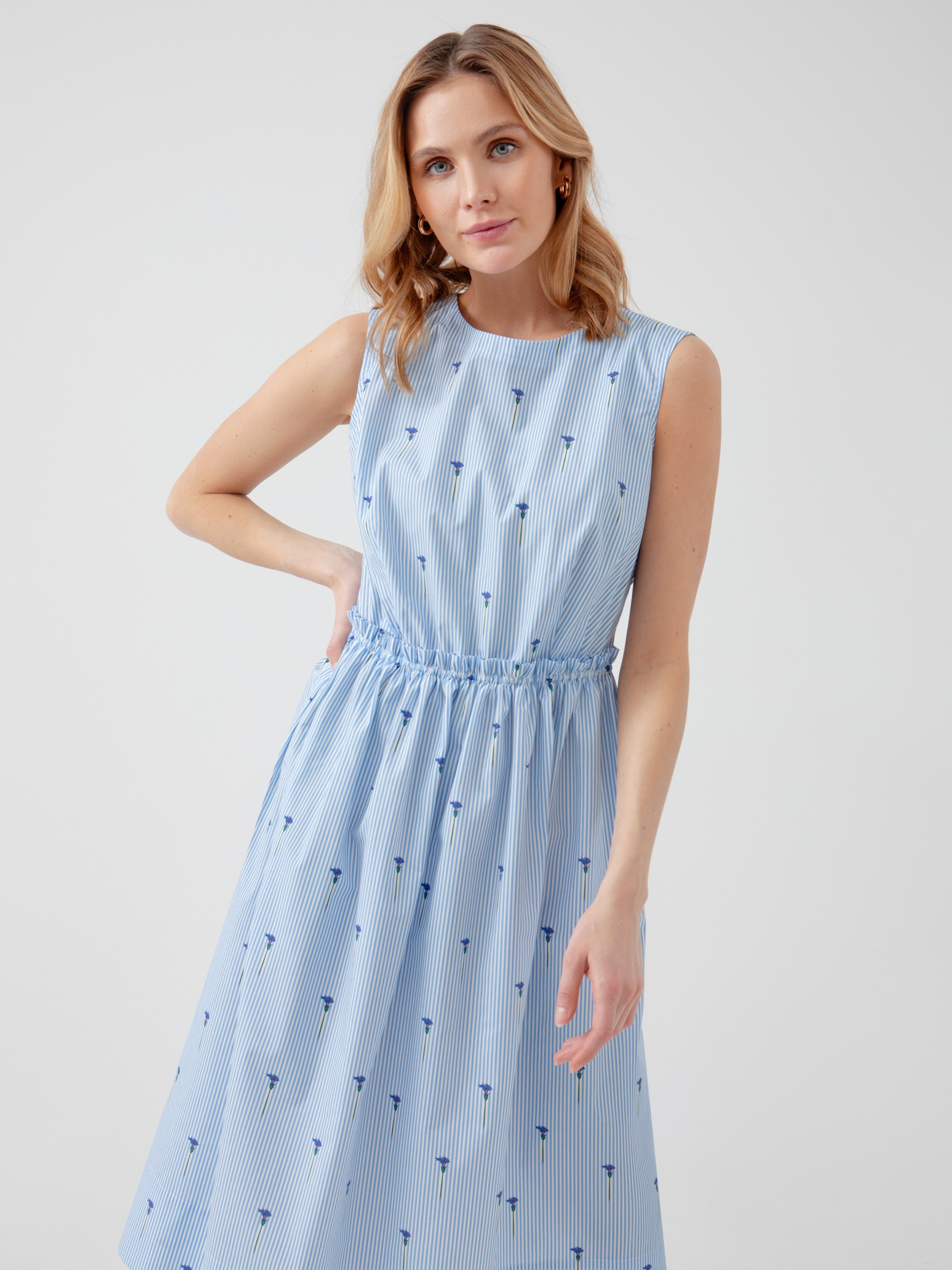 Романтичное приталенное платье без рукавов, из 100% хлопка с принтом в голубую полоску и васильками. С расширенной юбкой на резинке и рюшем на талии.