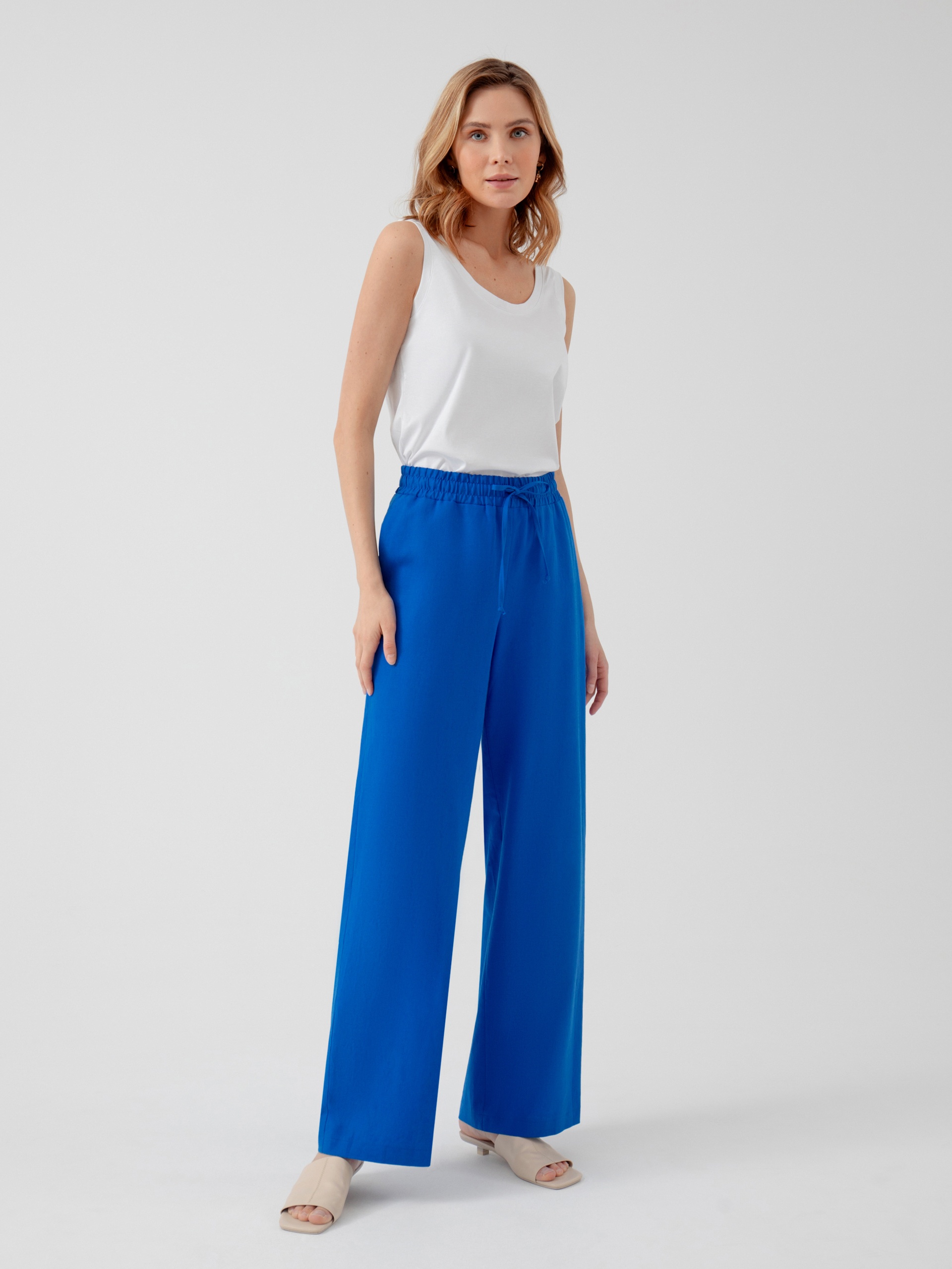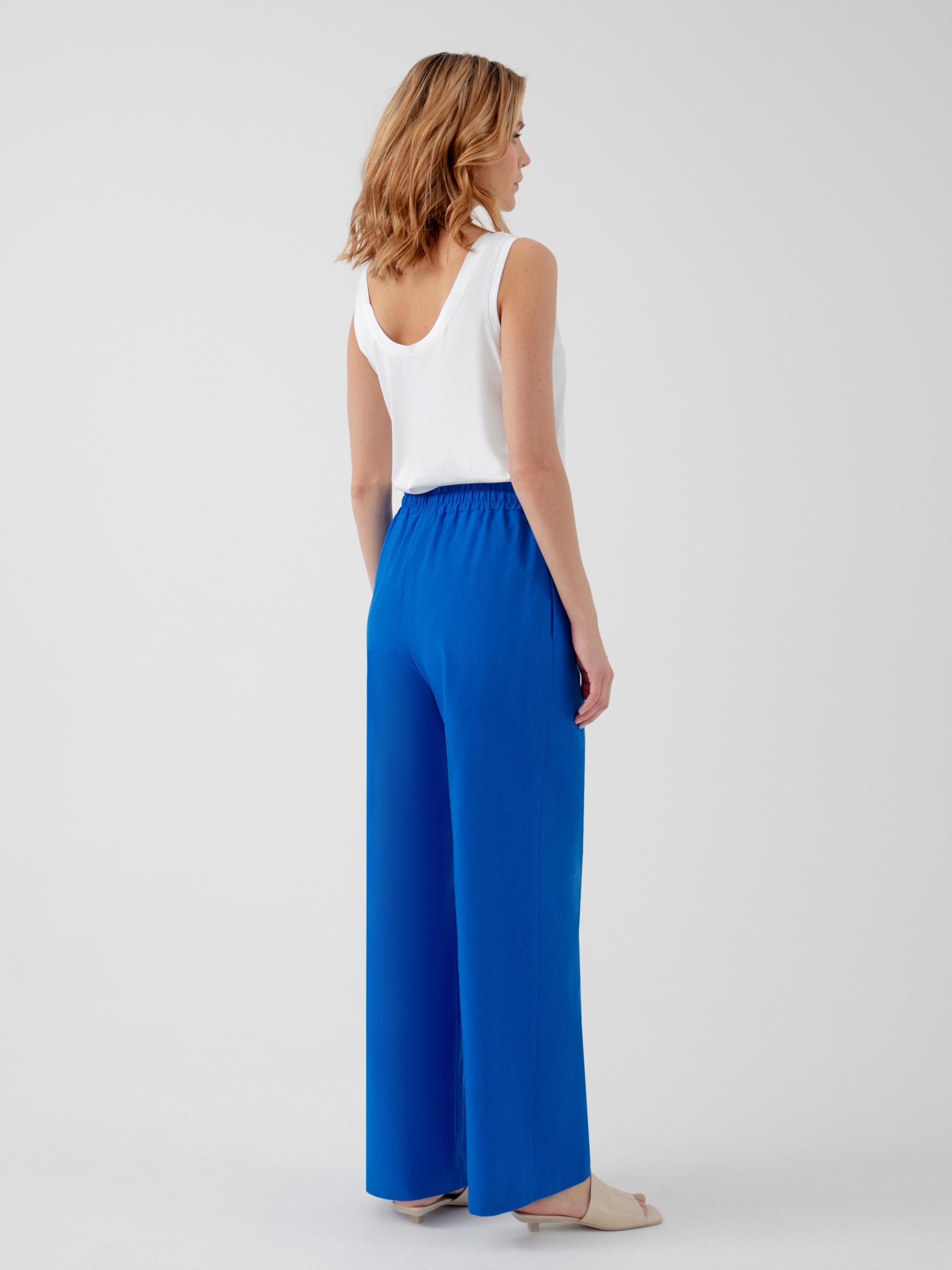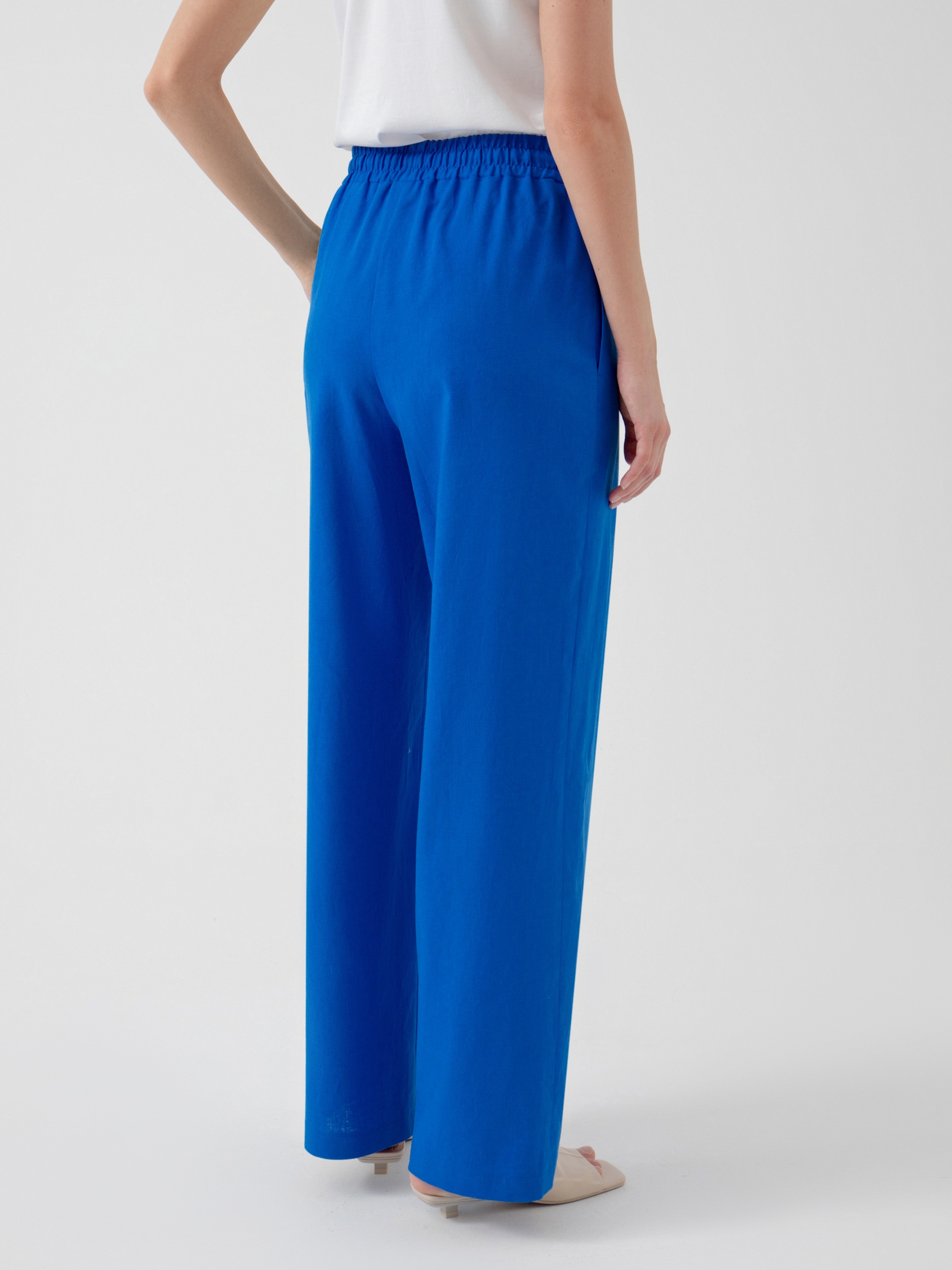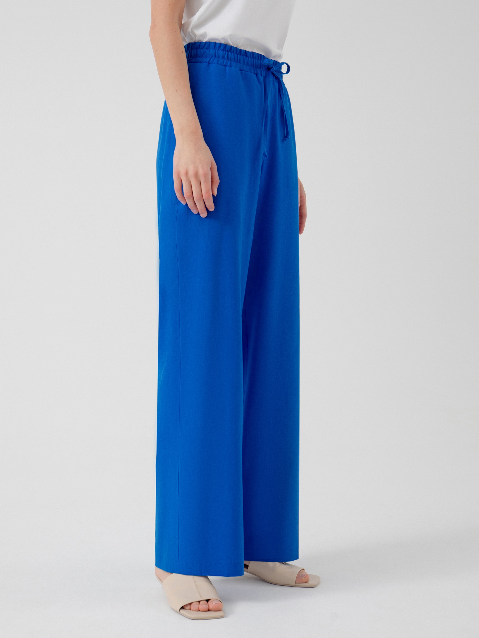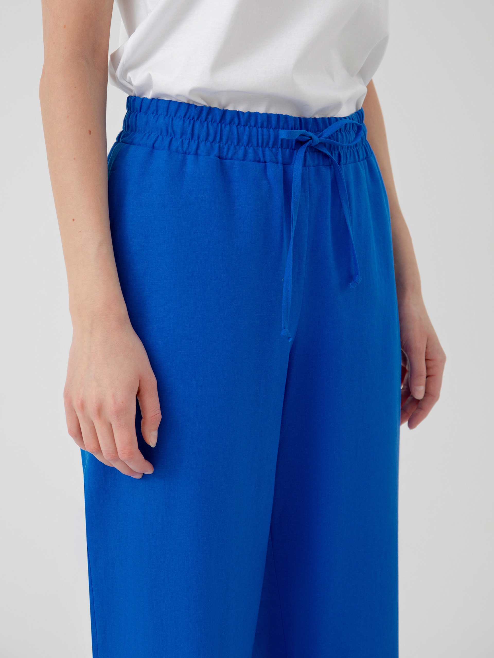 Брюки полной длины, из хлопковой ткани ярко-синего цвета, свободной формы, на поясе. В пояс вставлена резинка и кулиcка для лучшей фиксации.