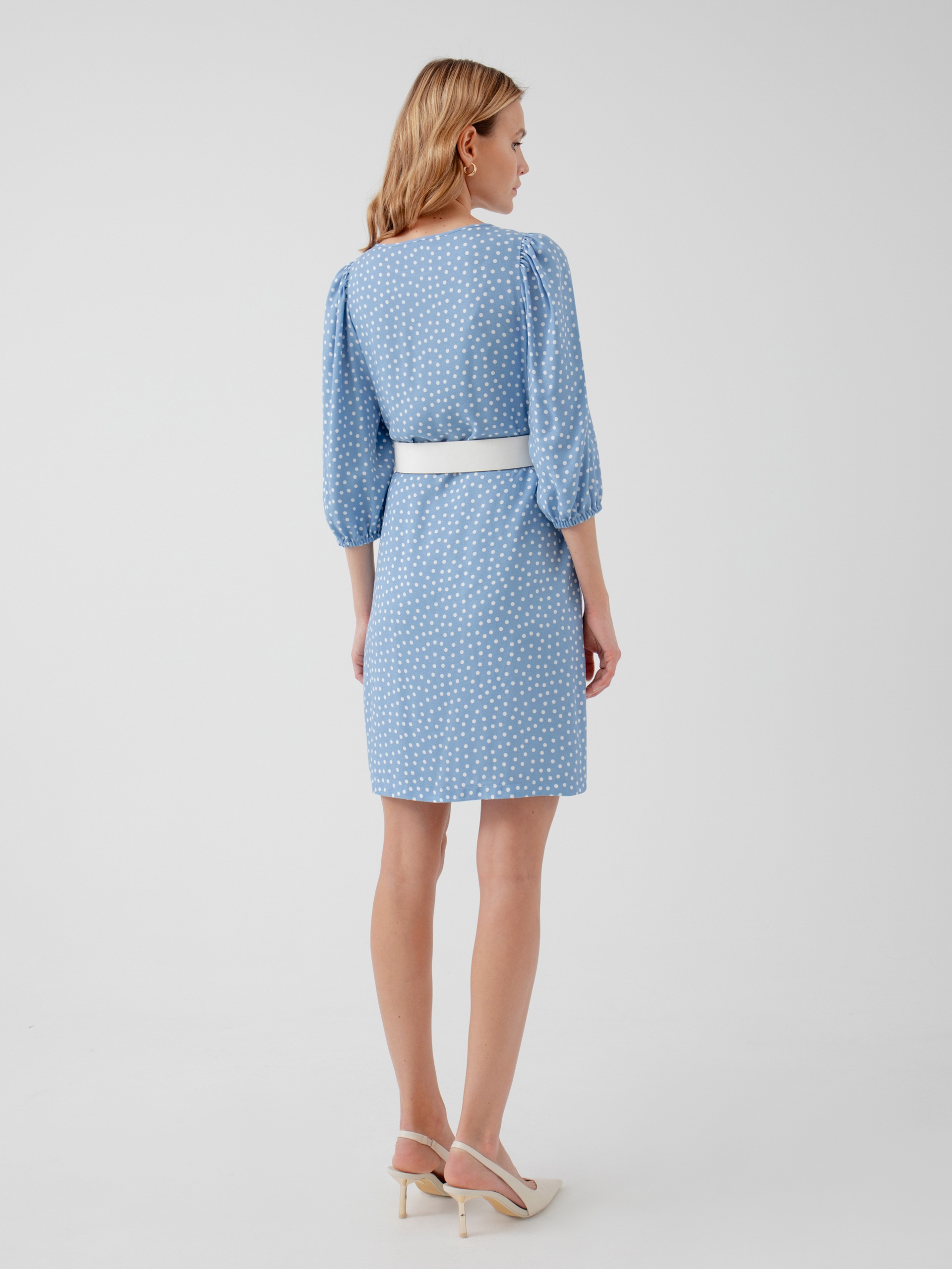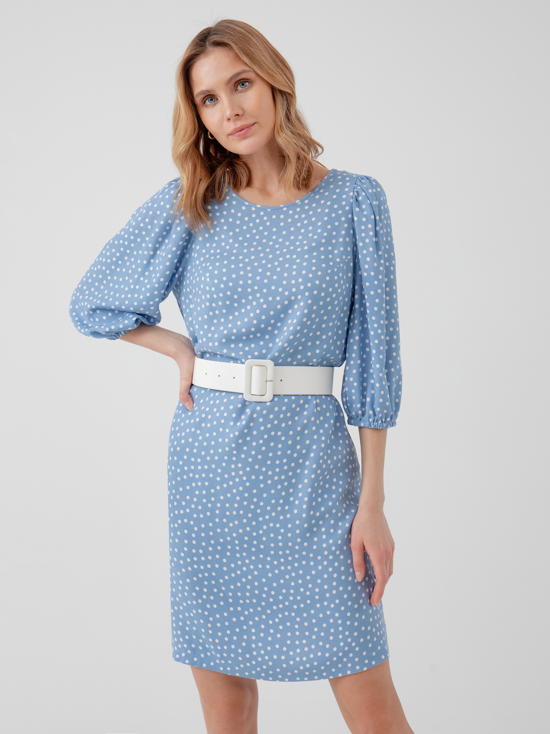 Прямое платье из натуральной вискозы в нежный горошек, с круглой горловиной и рукавом со сборками. В комплект входит белый лаковый пояс. Идеальная модель для прогулок по городу.