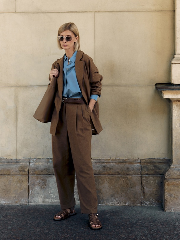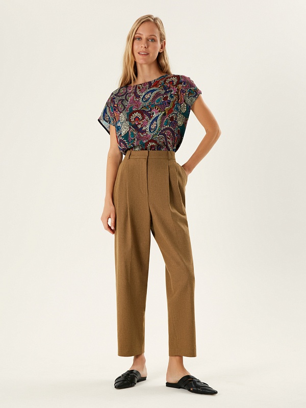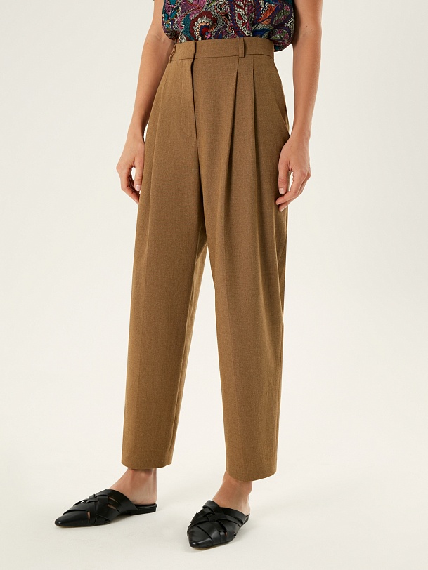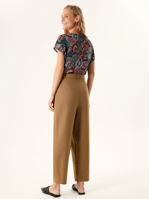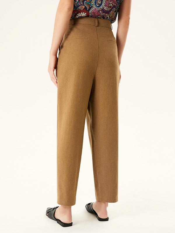 Брюки-бананы из фактурной льняной ткани с рабочими карманами и складками по переду. Брюки на притачном поясе.