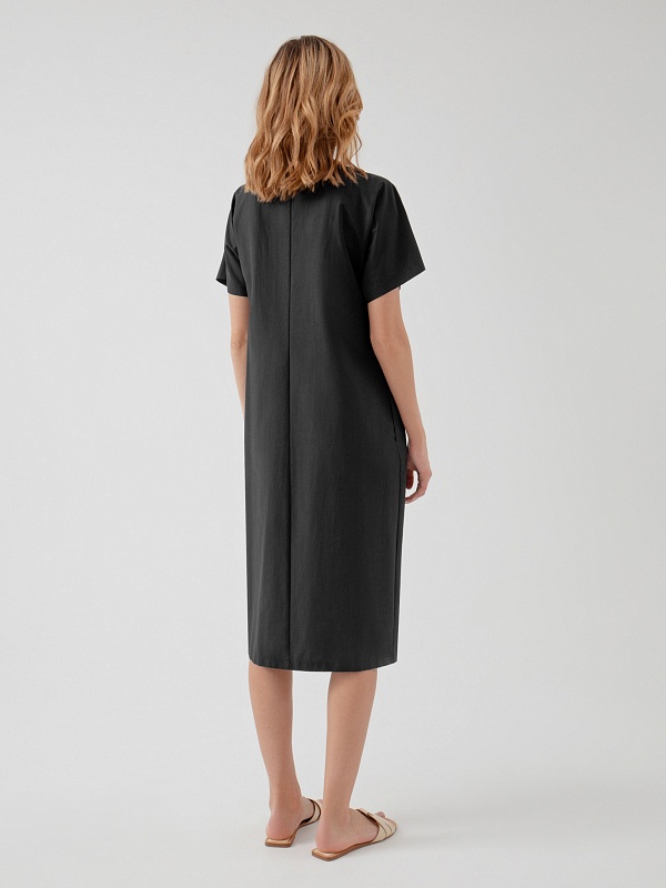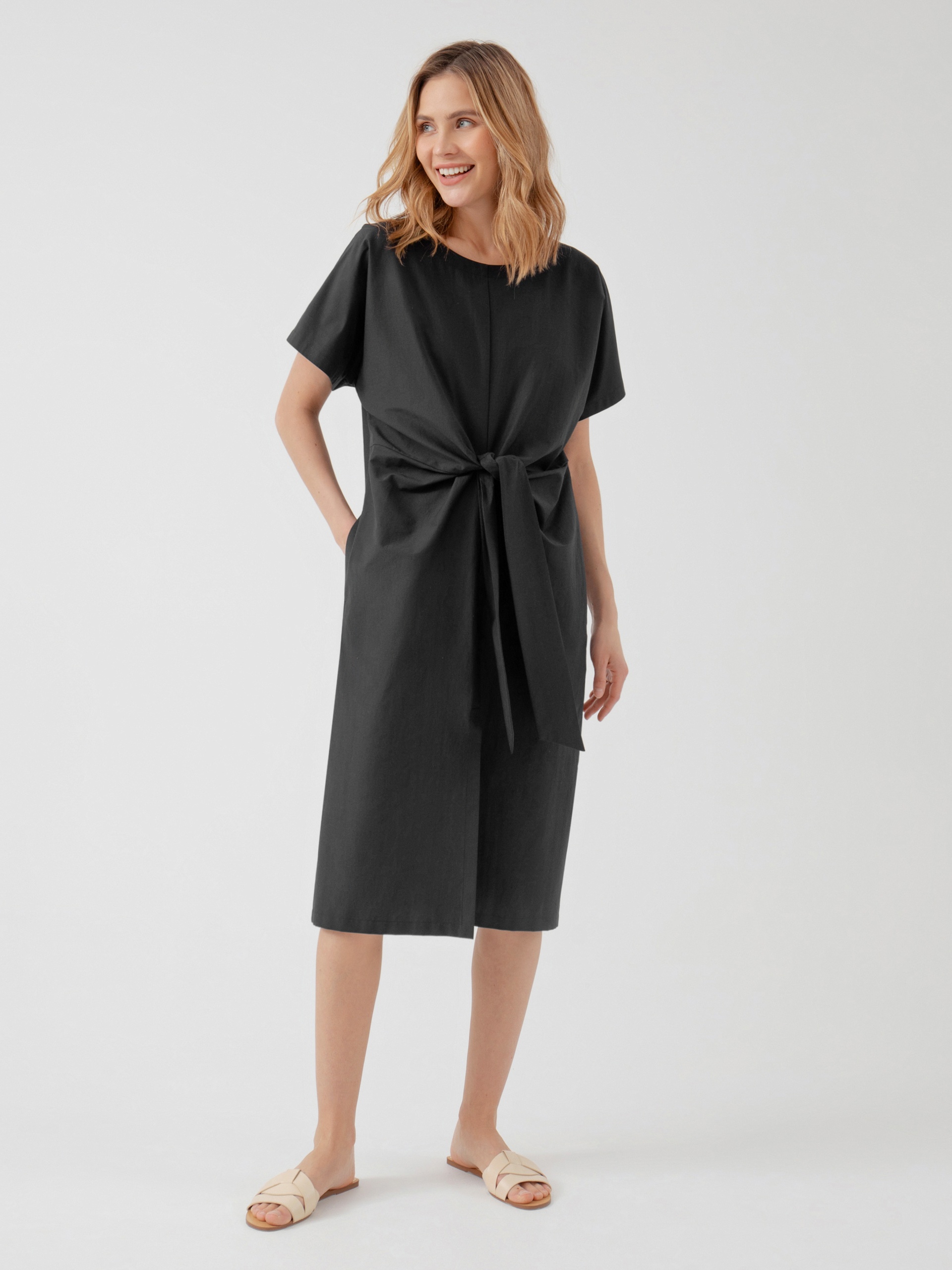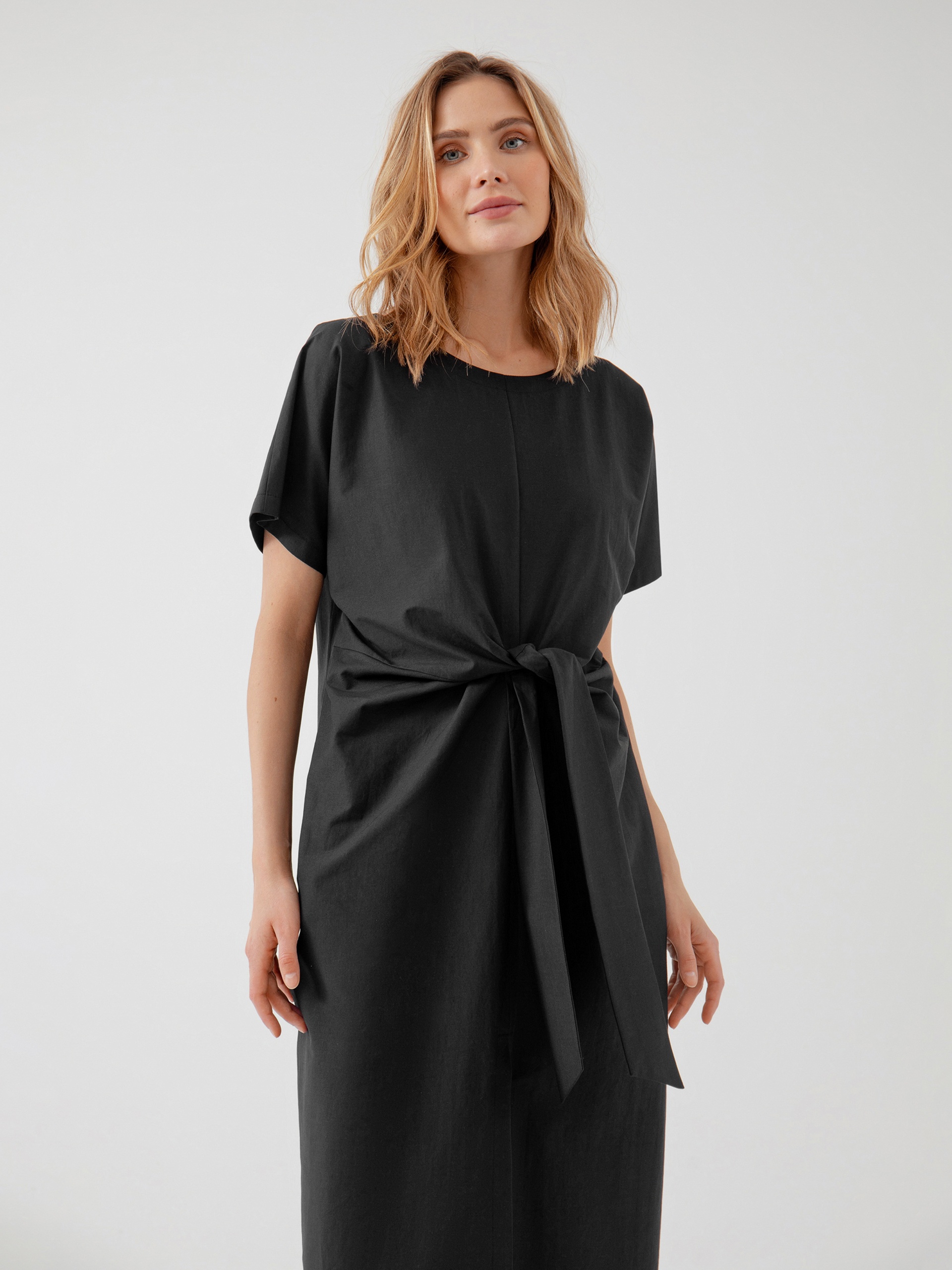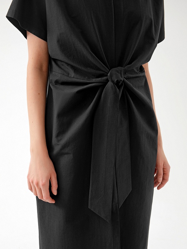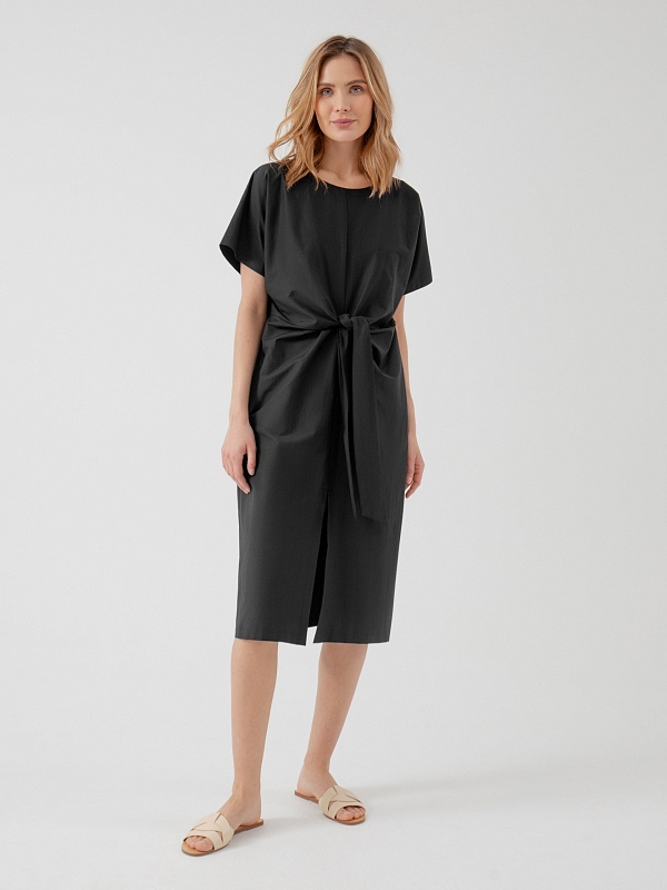 Летнее платье силуэта кокон с узлом на талии и рукавом кимоно выполнено из хлопка в черном цвете. Свободное платье отлично подойдет для работы в офисе.