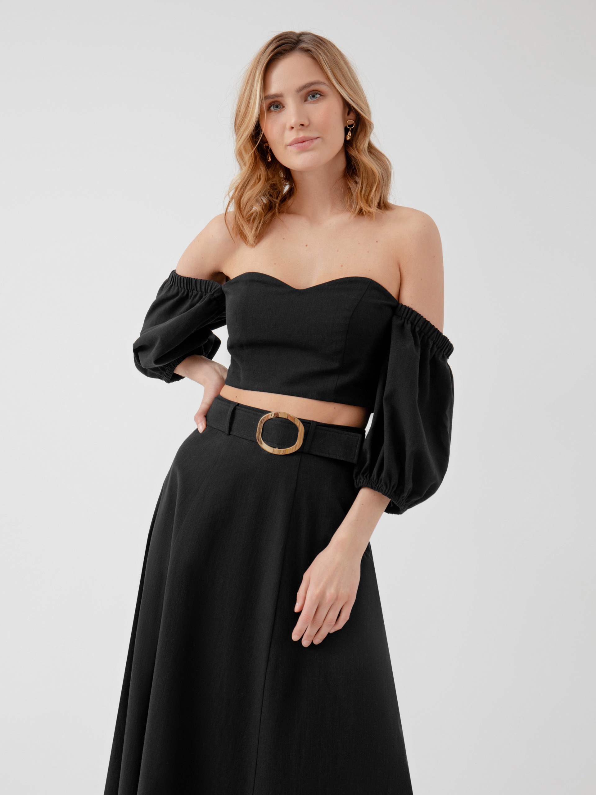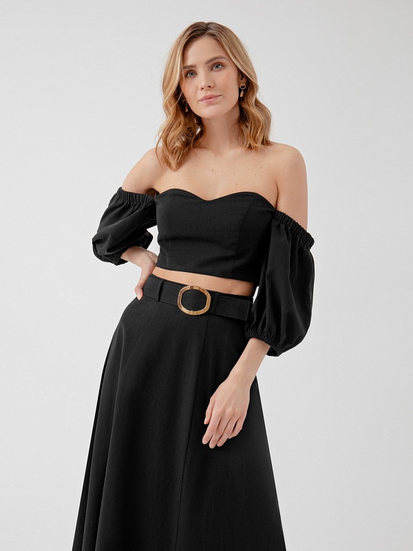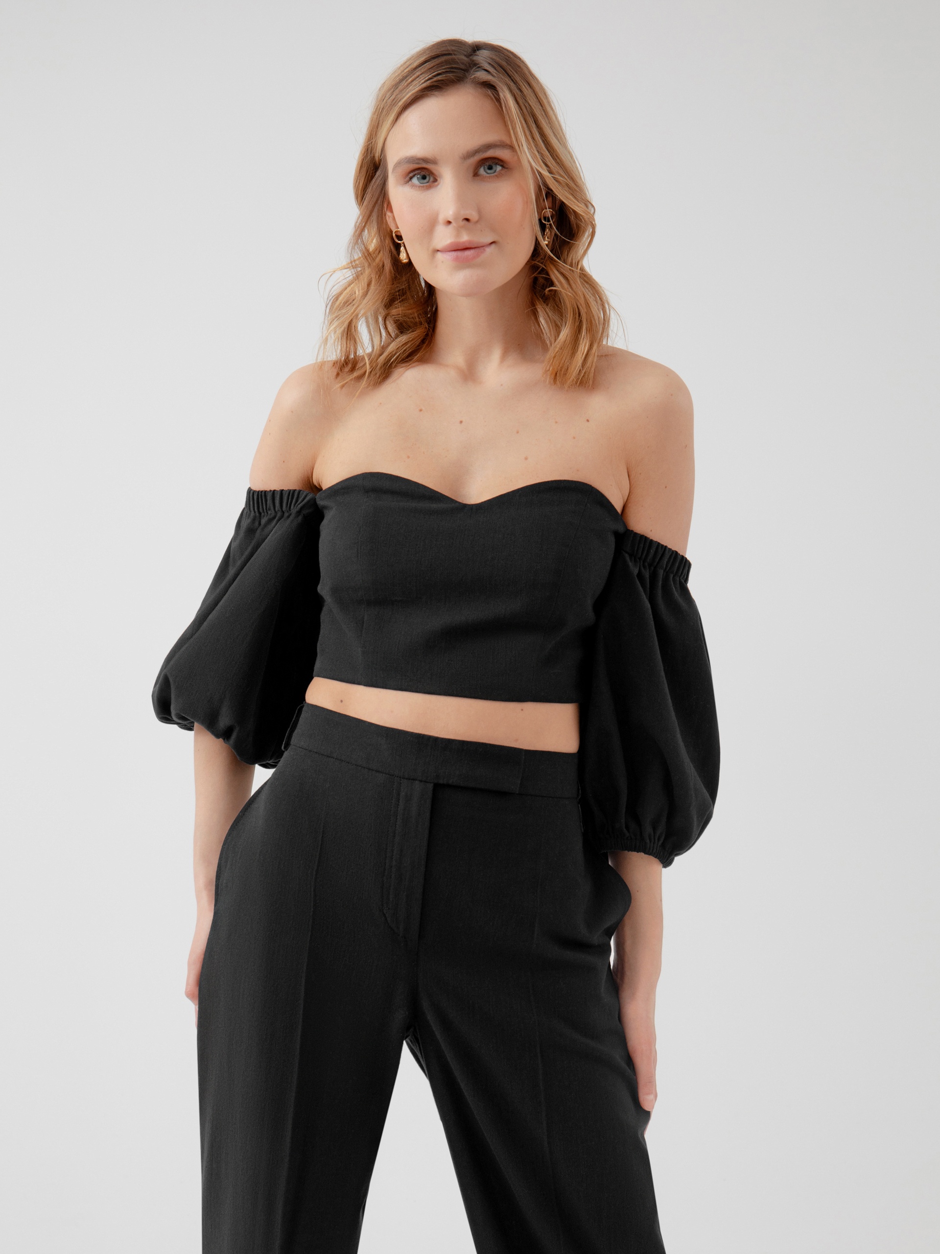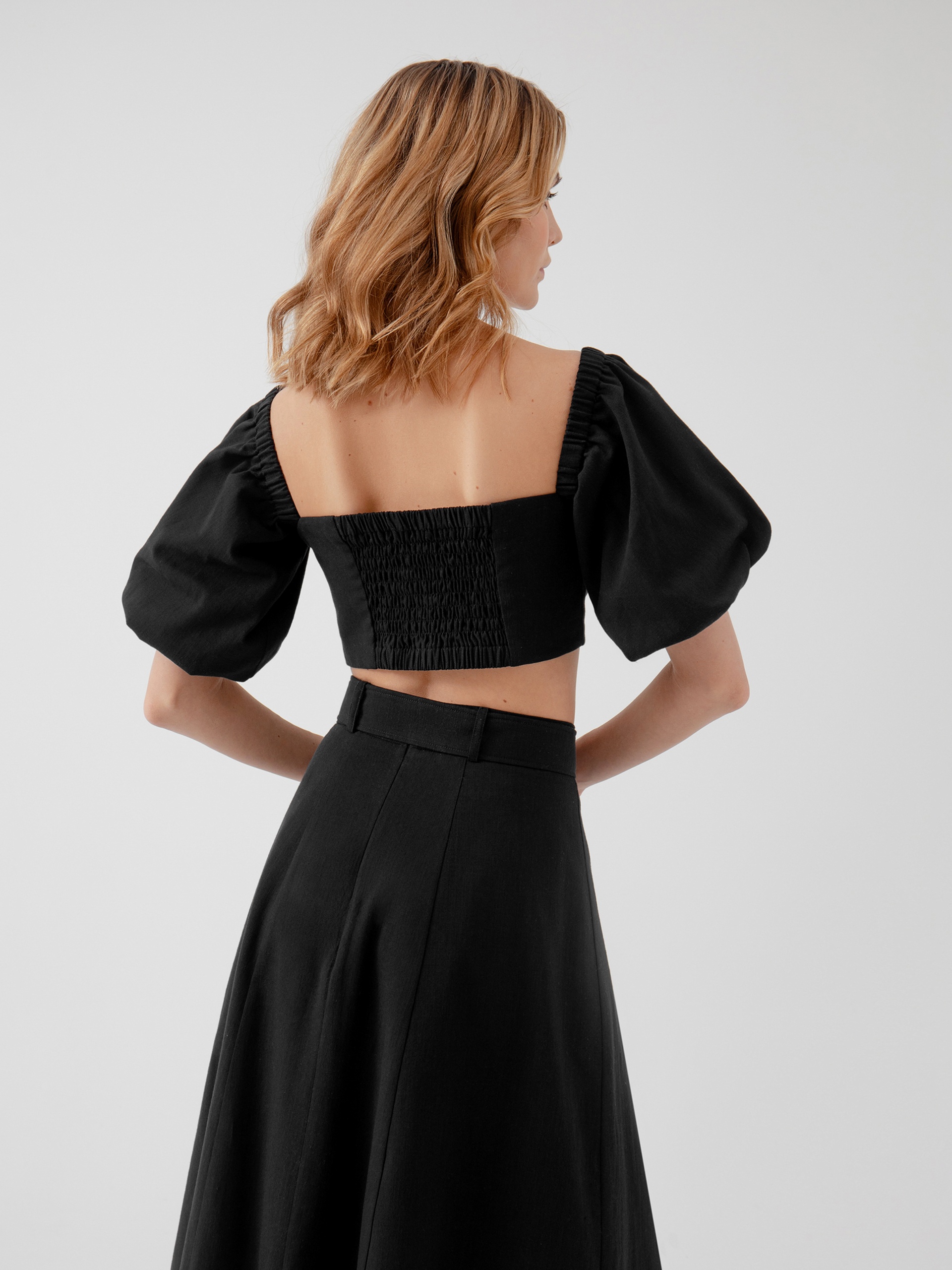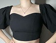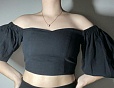 Топ из хлопковой ткани с открытой линией декольте и рукавами буфами. На спинке для лучшей посадки добавлена резинка-жилка. Застечка в боковом шве на потайную молнию