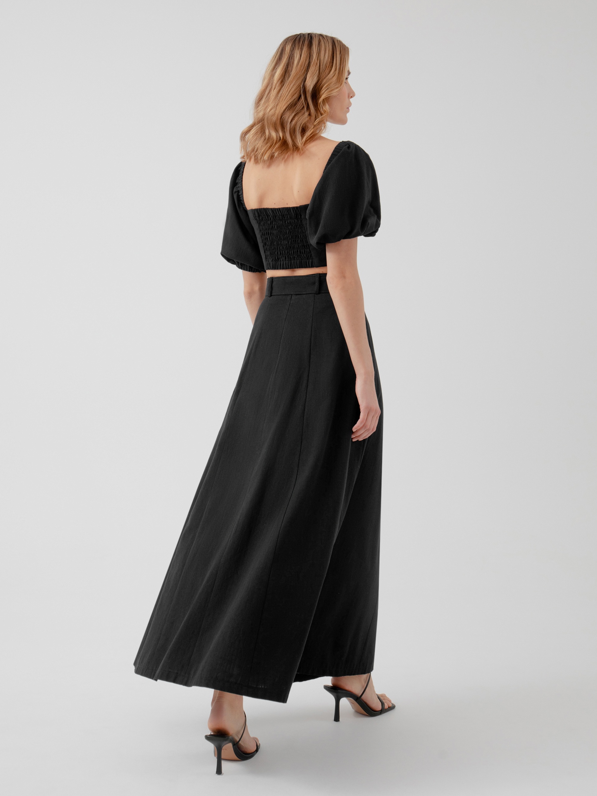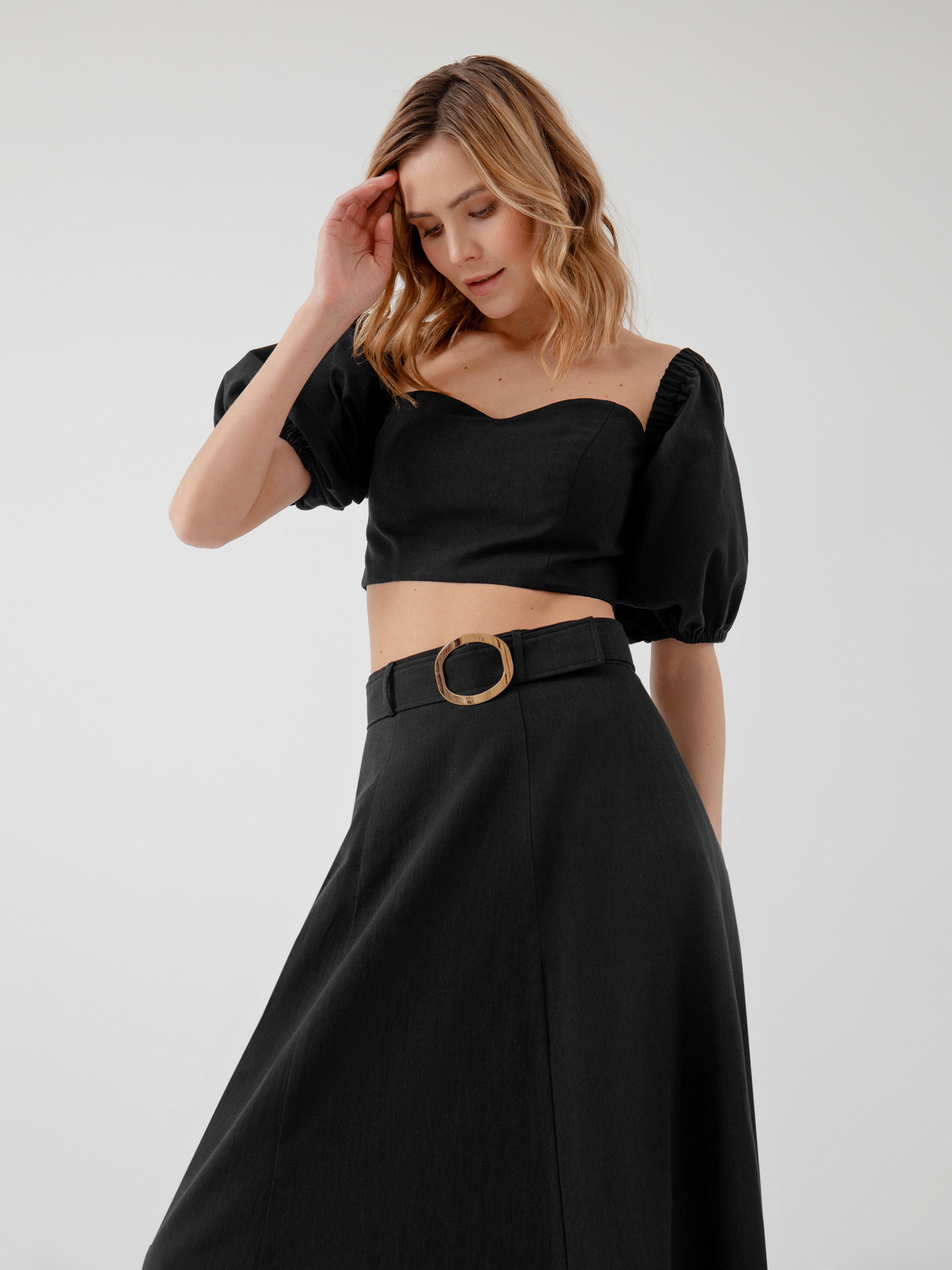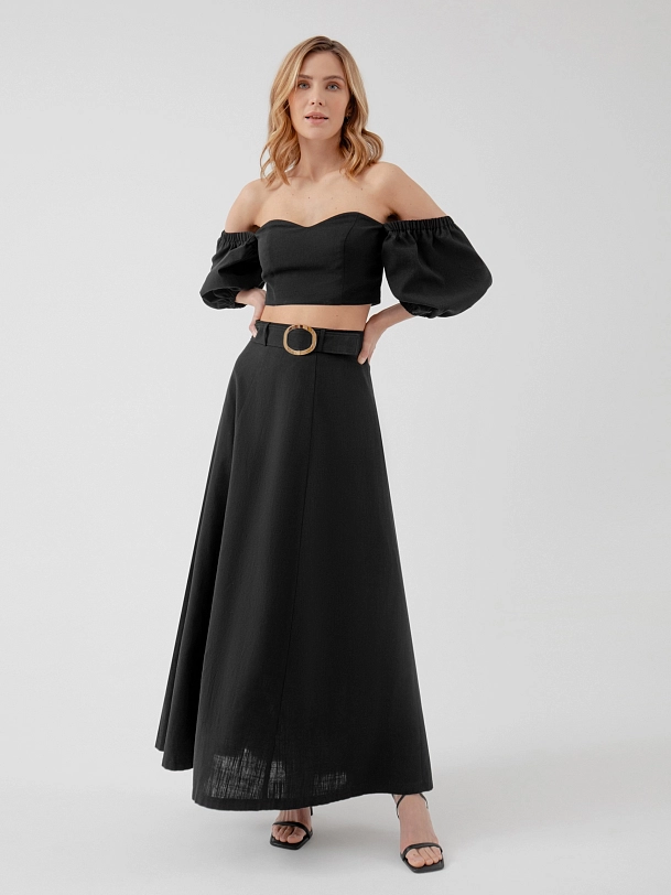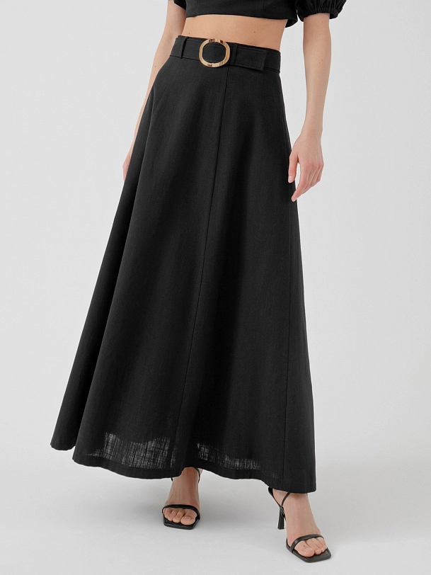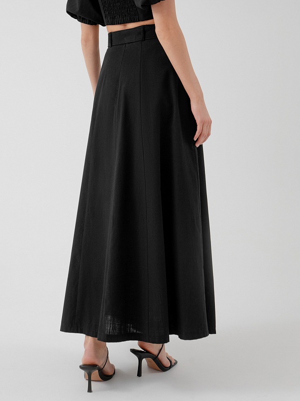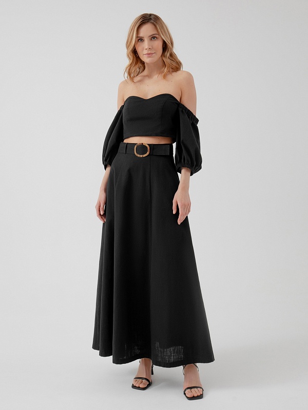 Лаконичный крой - трапеция, из хлопковой ткани на подкладке, притачном поясе и отдельным поясом с пряжкой. Идеальный вариант для лета в городе, юбку дополнит топ из той же ткани.