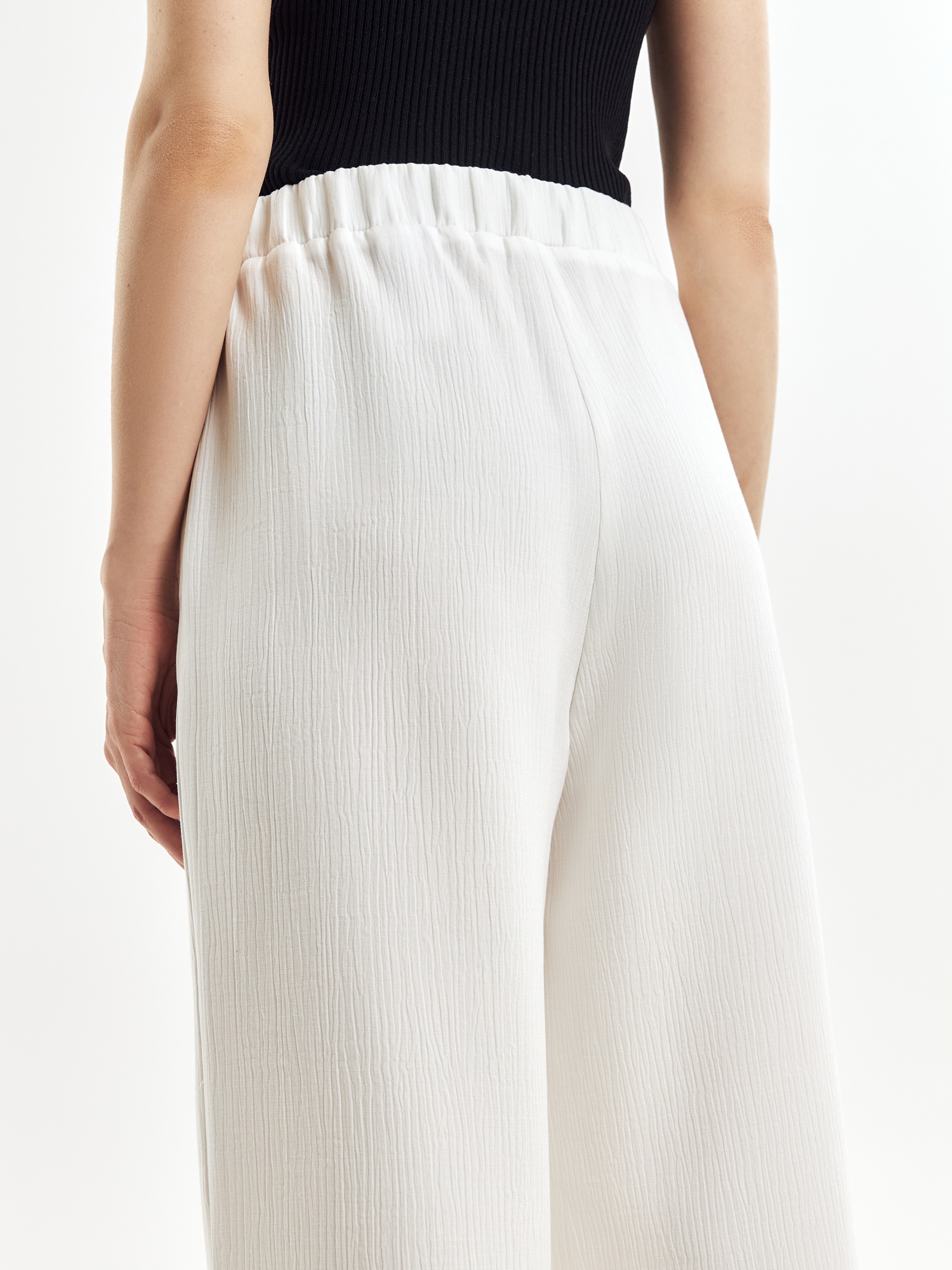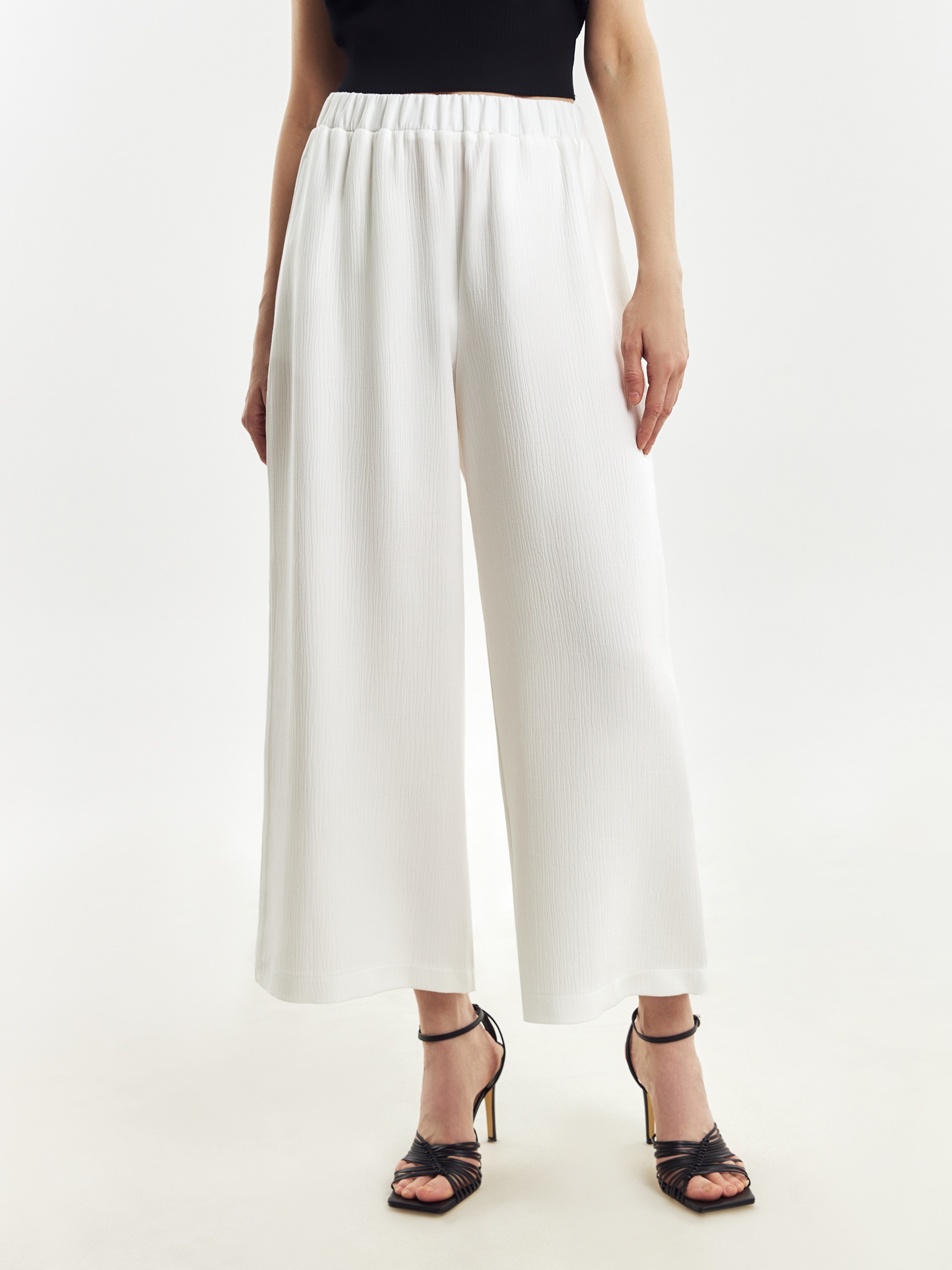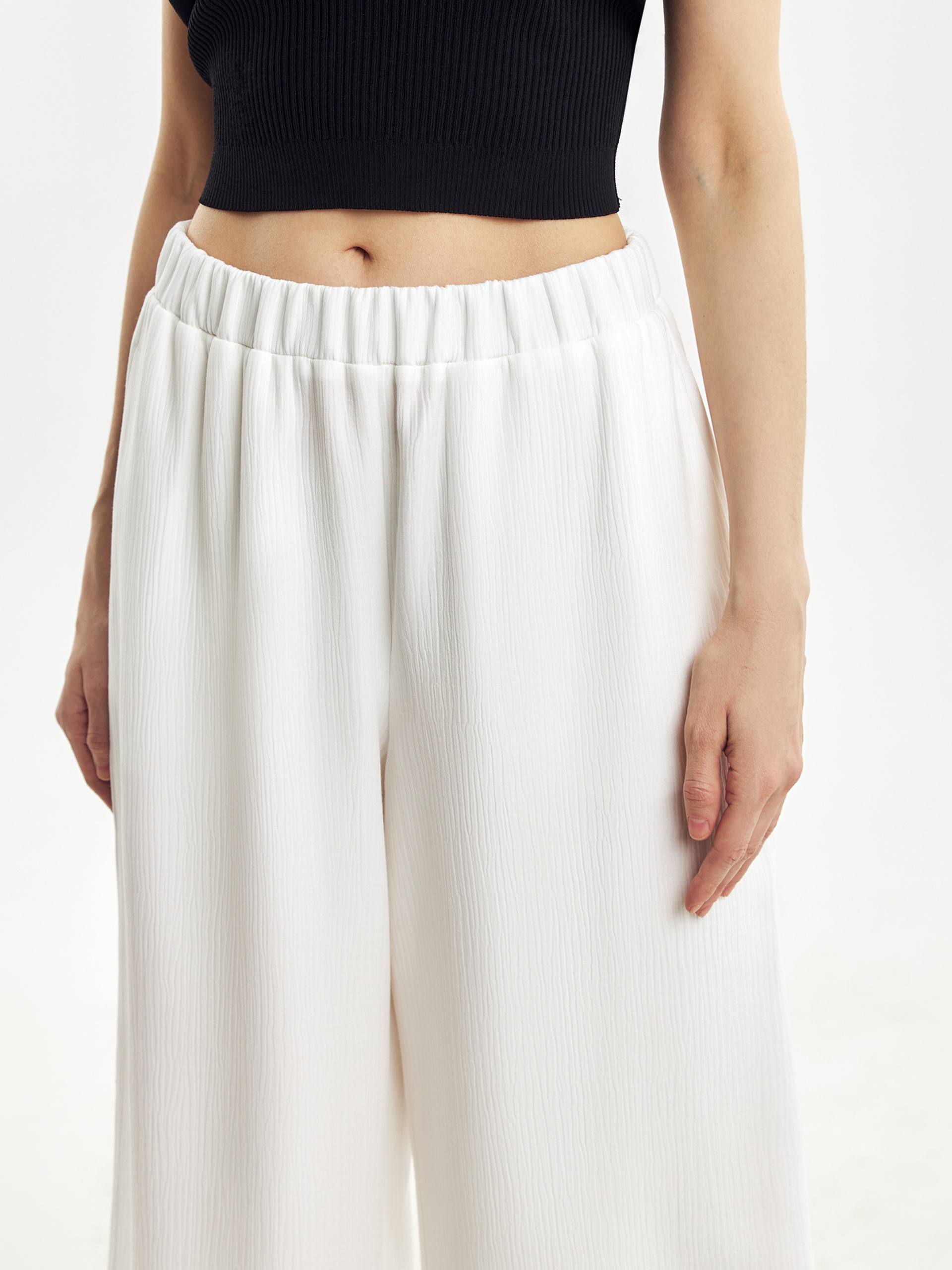 Брюки из фактурной вискозной ткани, свободного расклешенного к низу силуэта на поясе с резинкой. Длина 7/8.