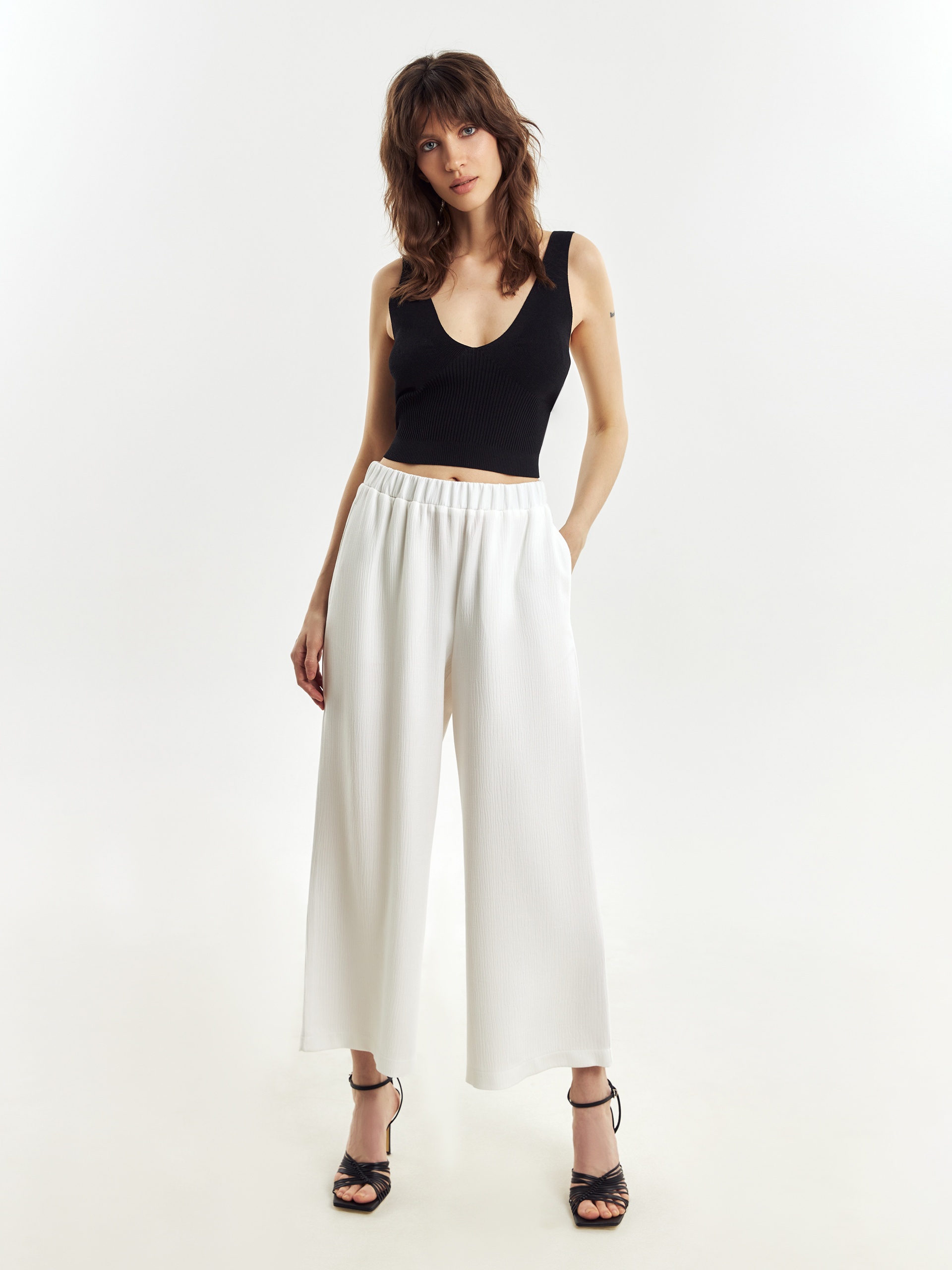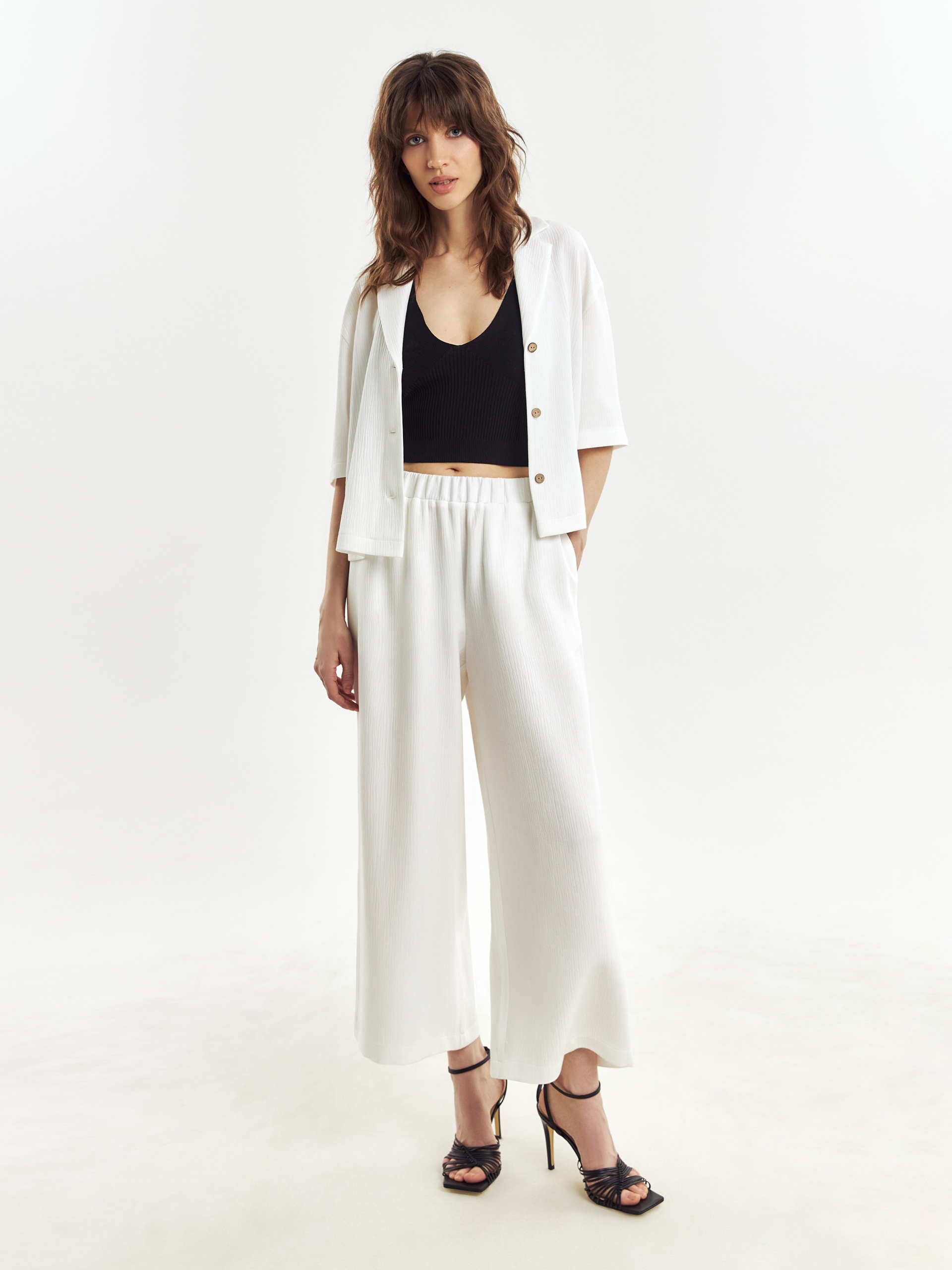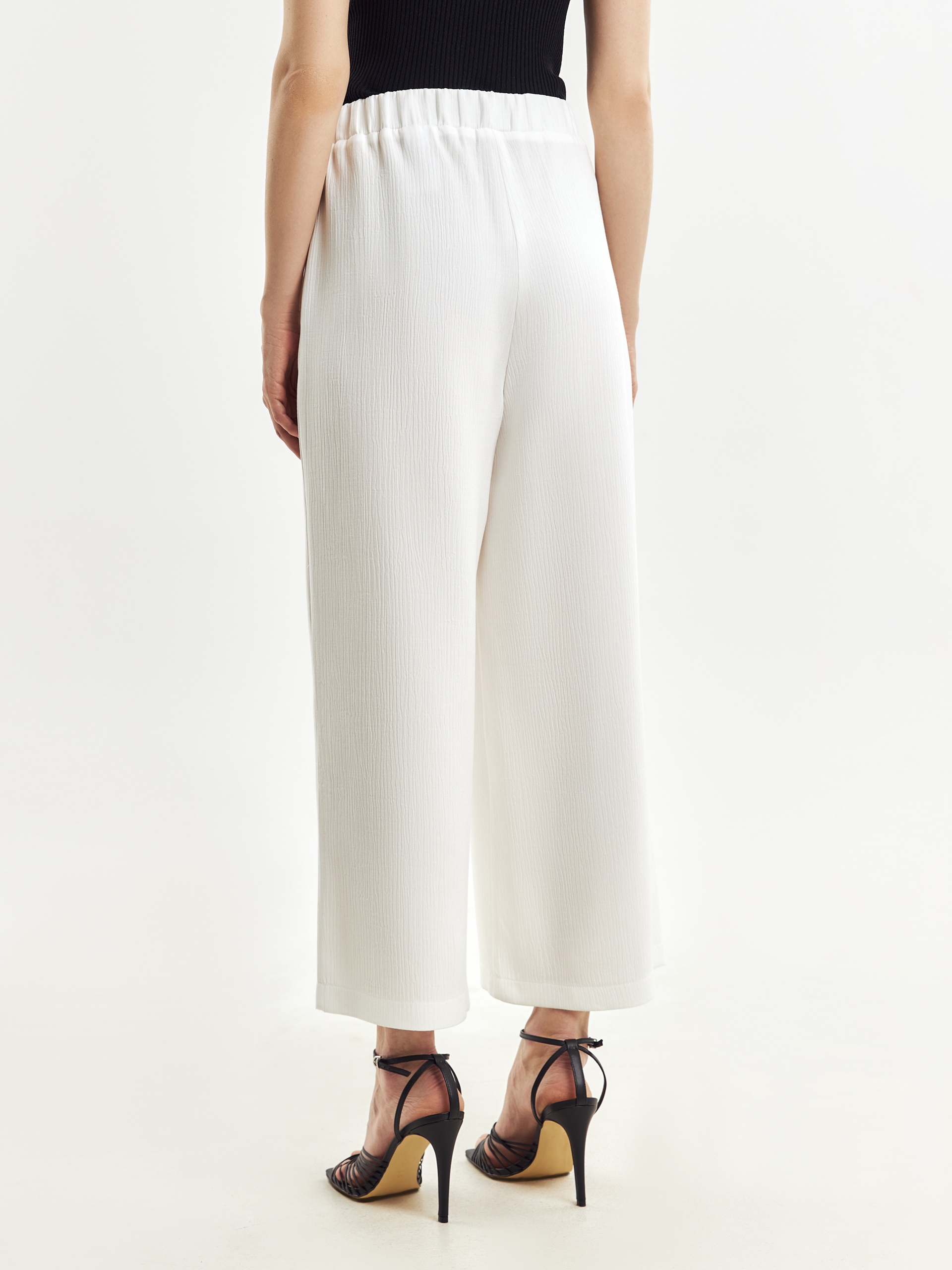 Брюки из фактурной вискозной ткани, свободного расклешенного к низу силуэта на поясе с резинкой. Длина 7/8.