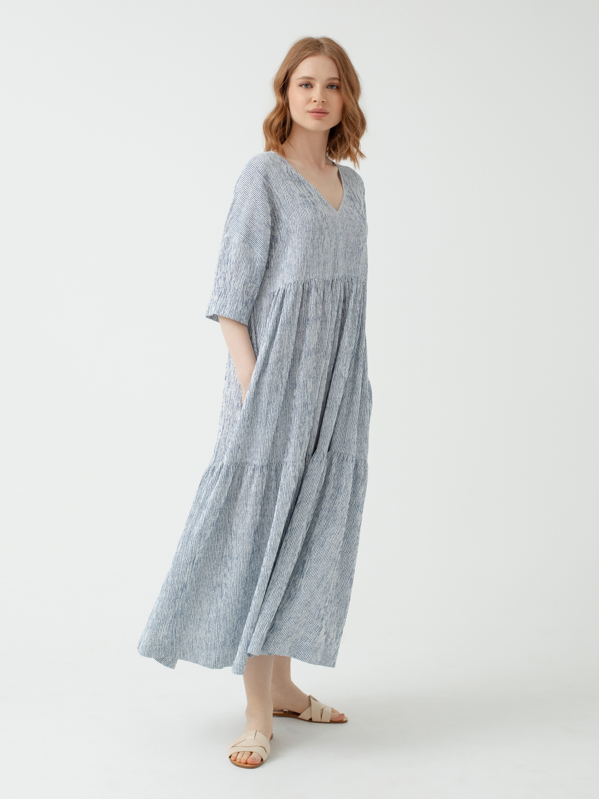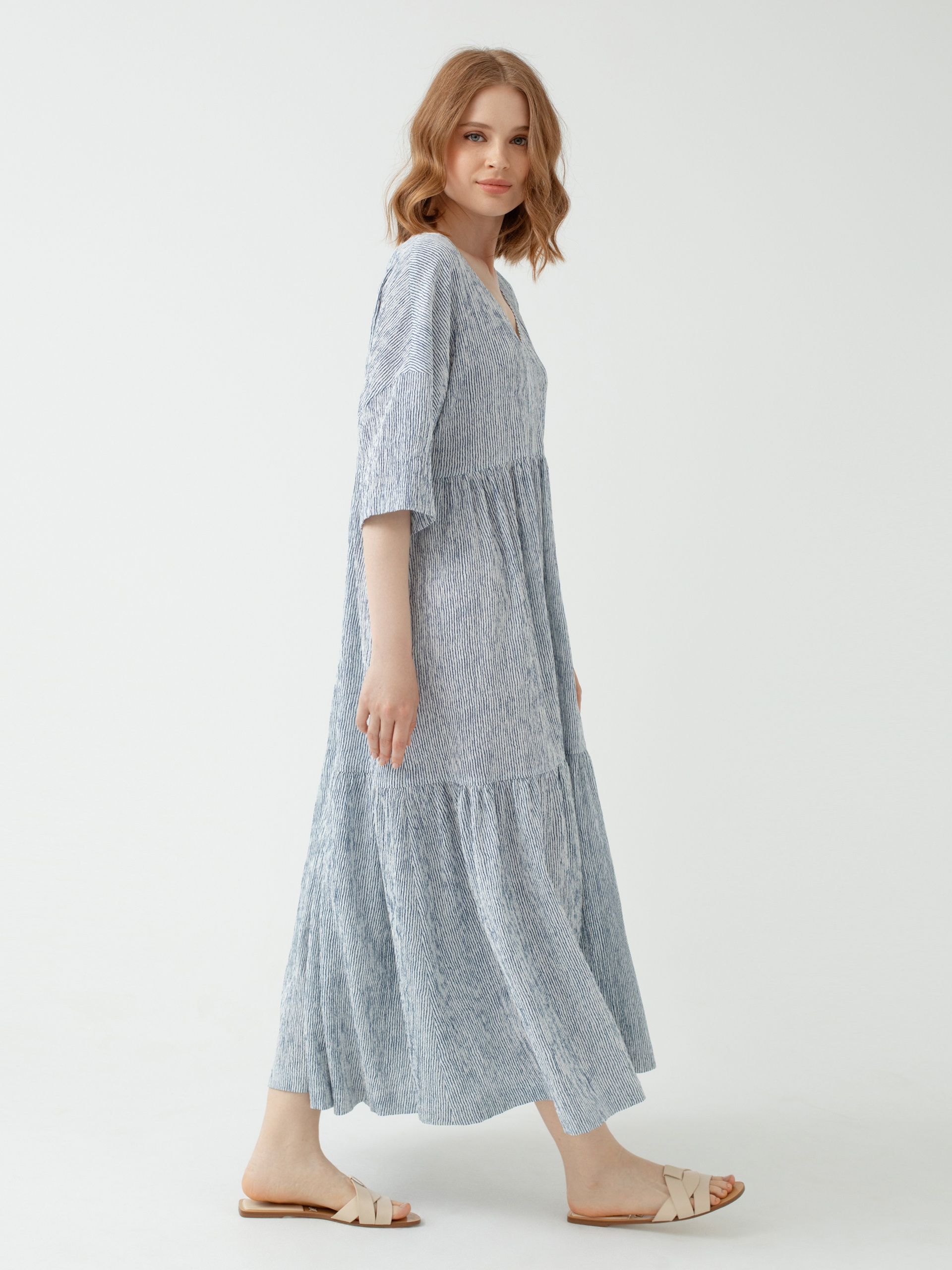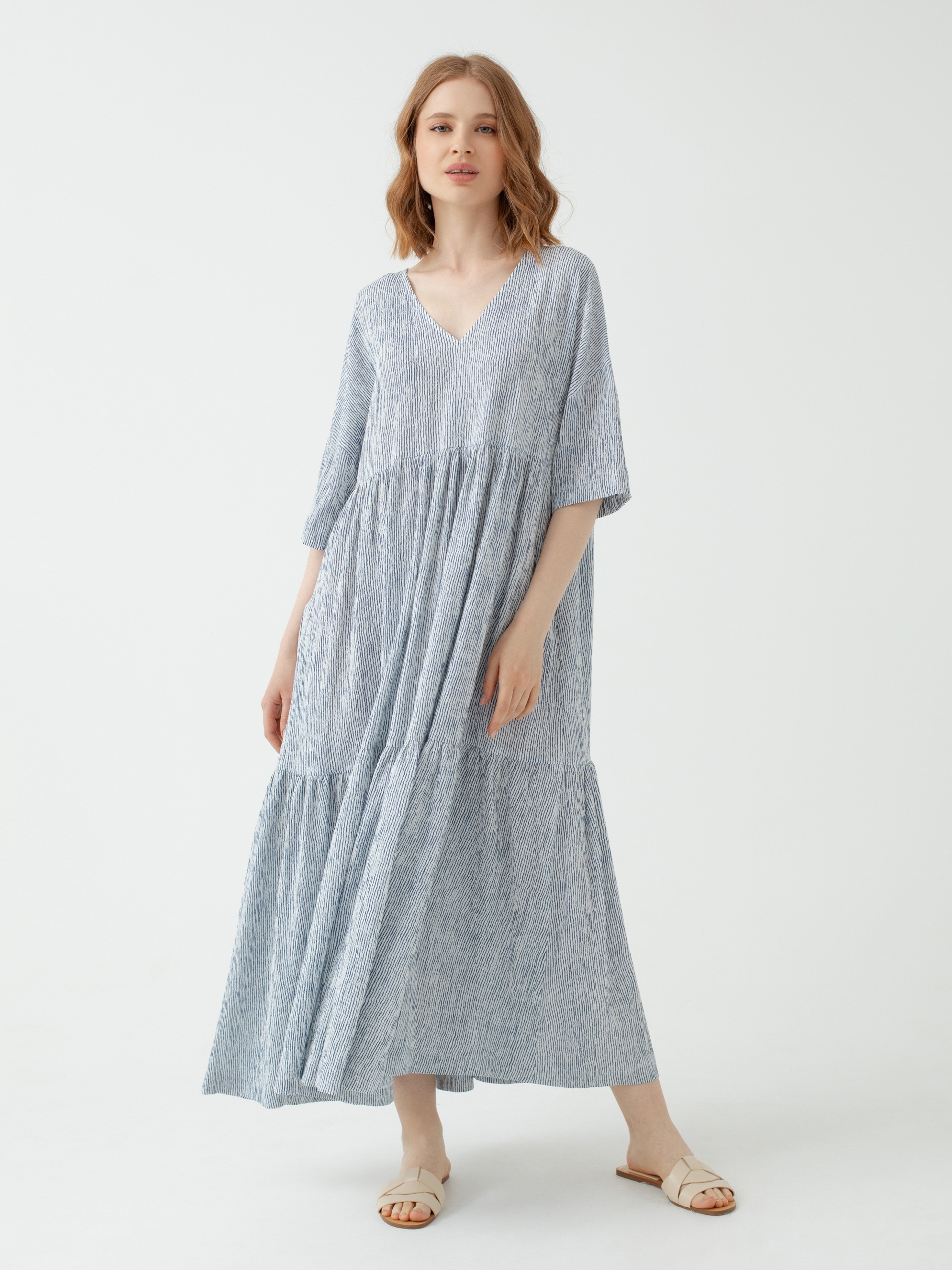 Платье миди из фактурной вискозной ткани с V-образным вырезом и воланами. Рукав втачной прикрывает локоть. Идеальный вариант для летней прогулки по городу или на море.