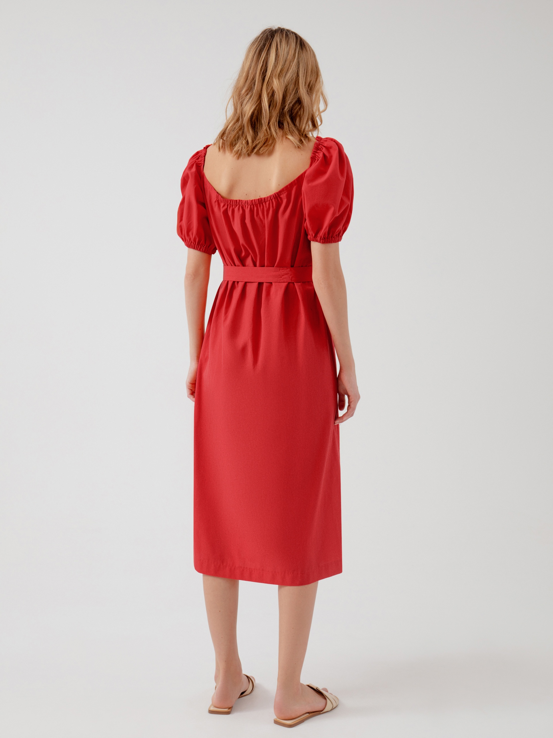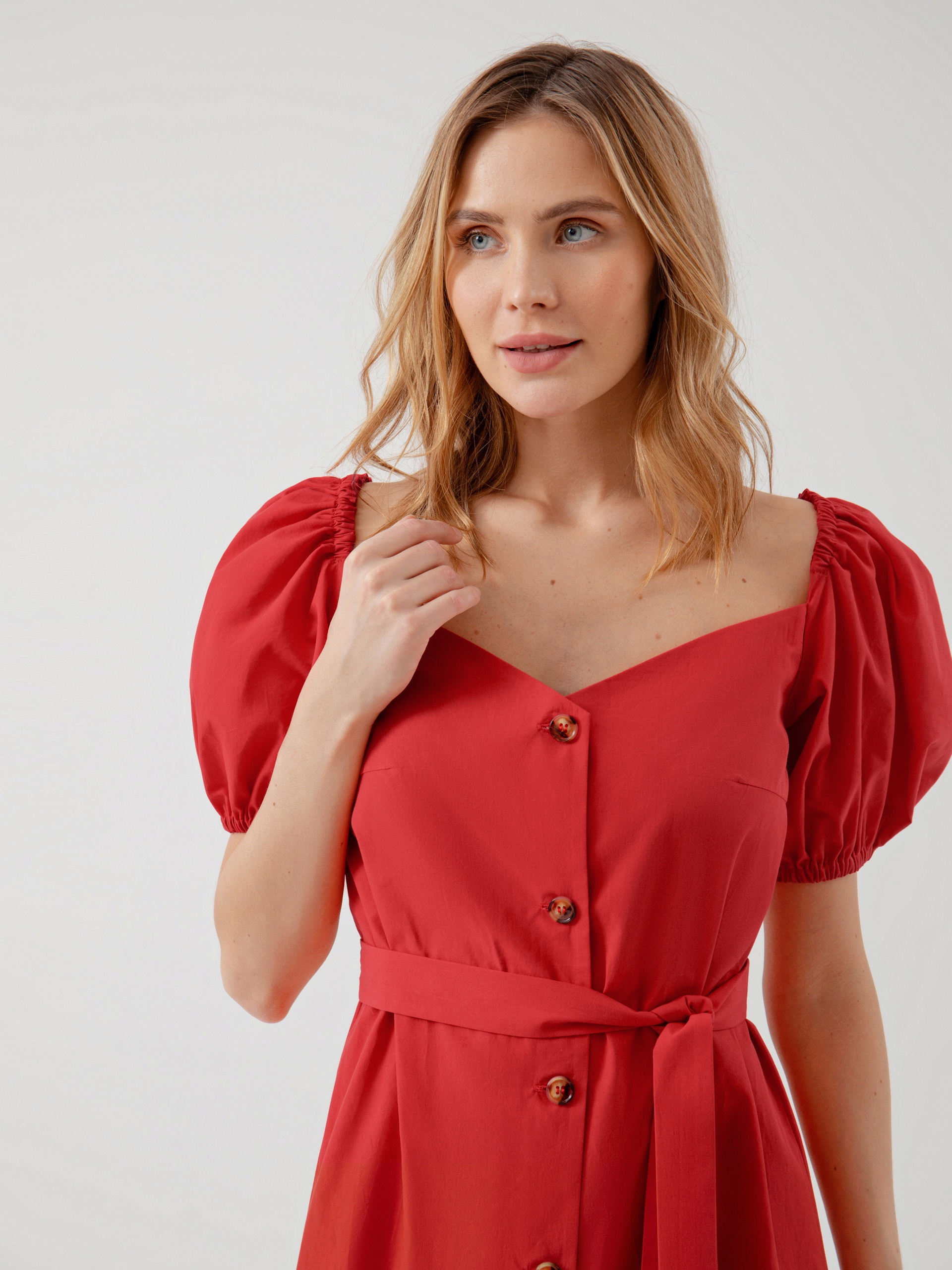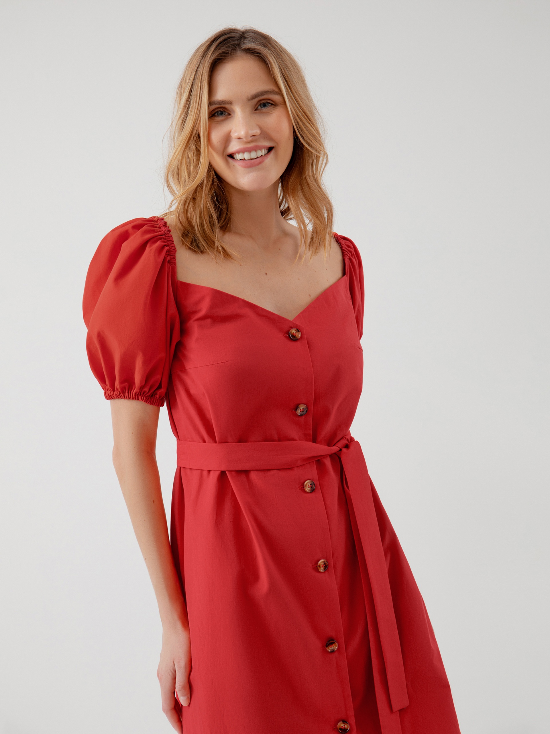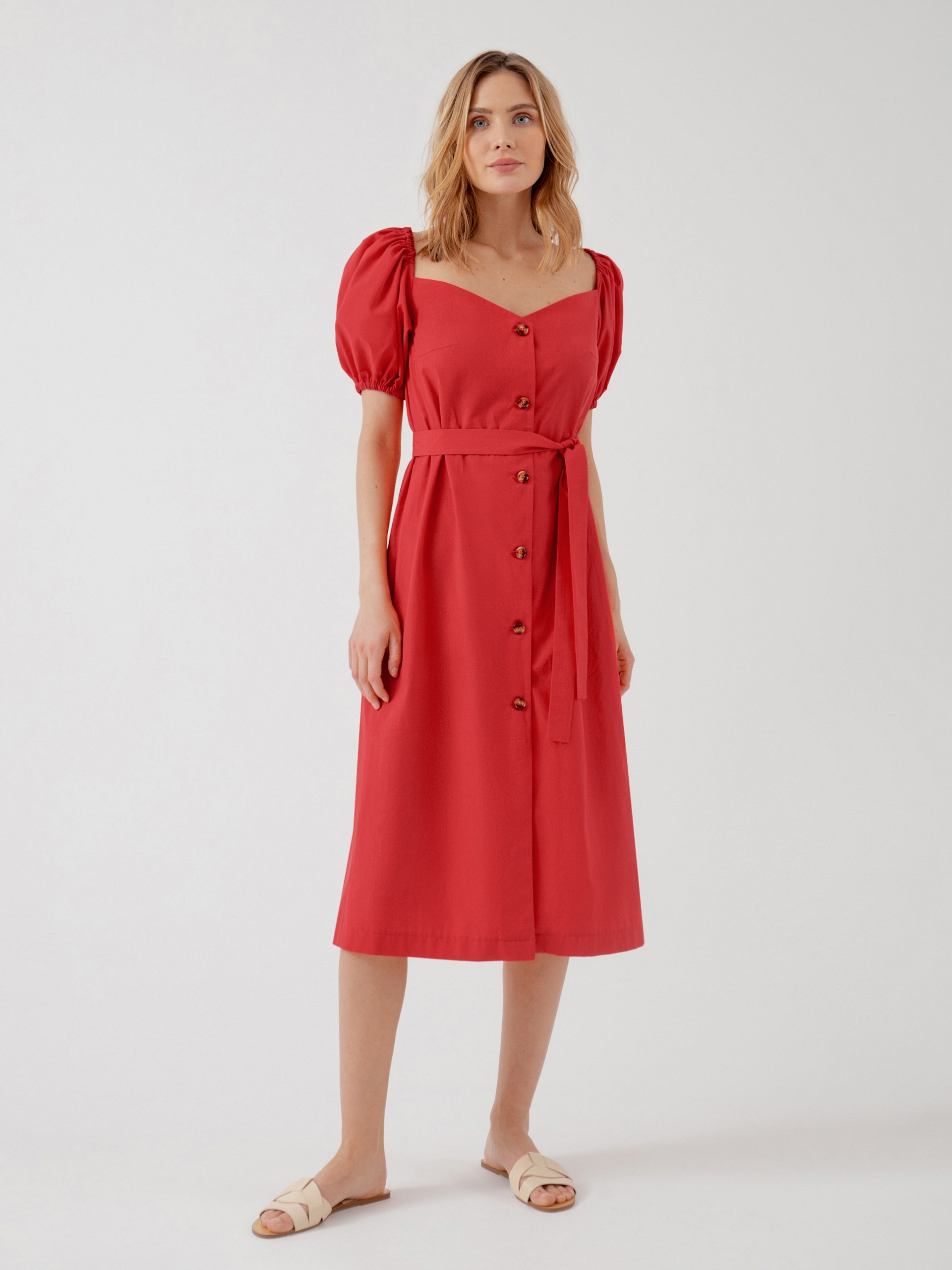 Прямое платье под пояс из яркого хлопка с объемными рукавами буфами. Платье полностью распашное на пуговицах, глубокий V-образный вырез подчеркнет зону декольте. Глубокий вырез на спинке оформлен резинкой.