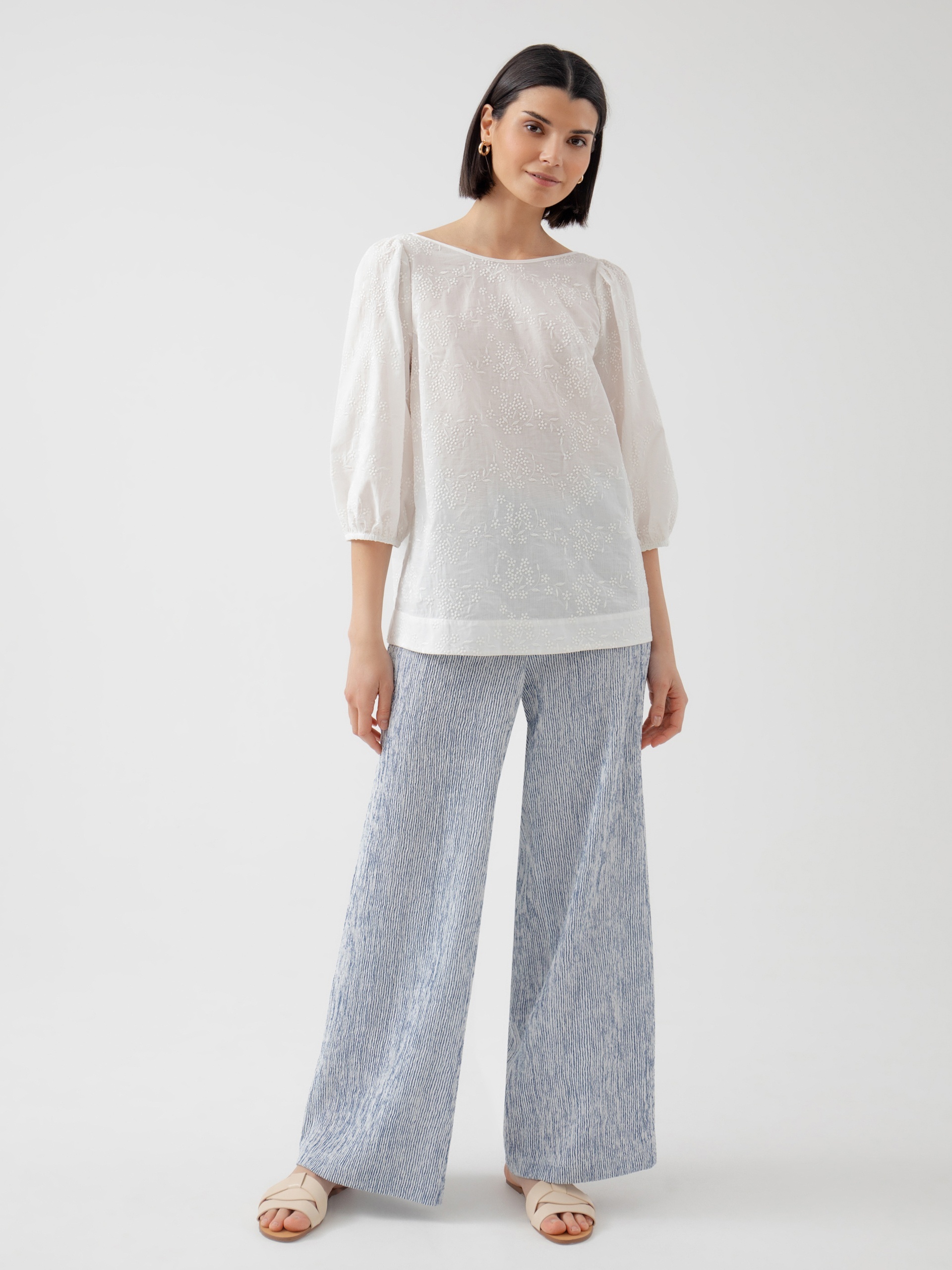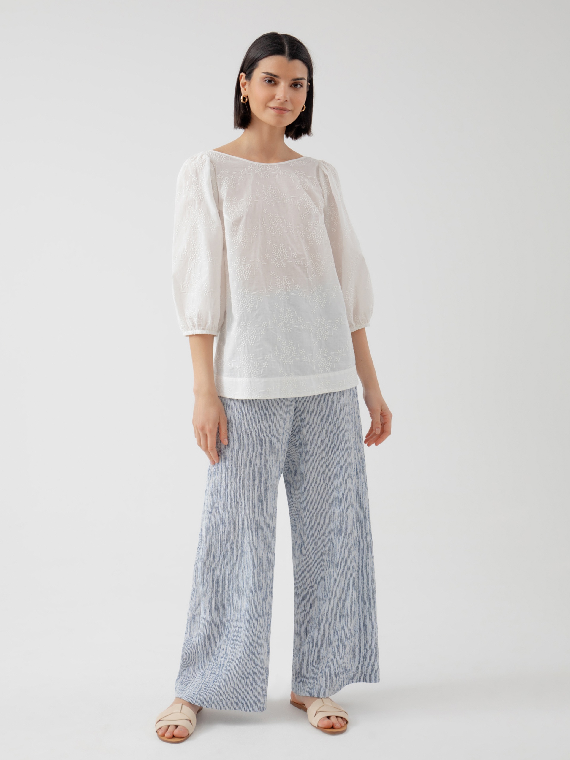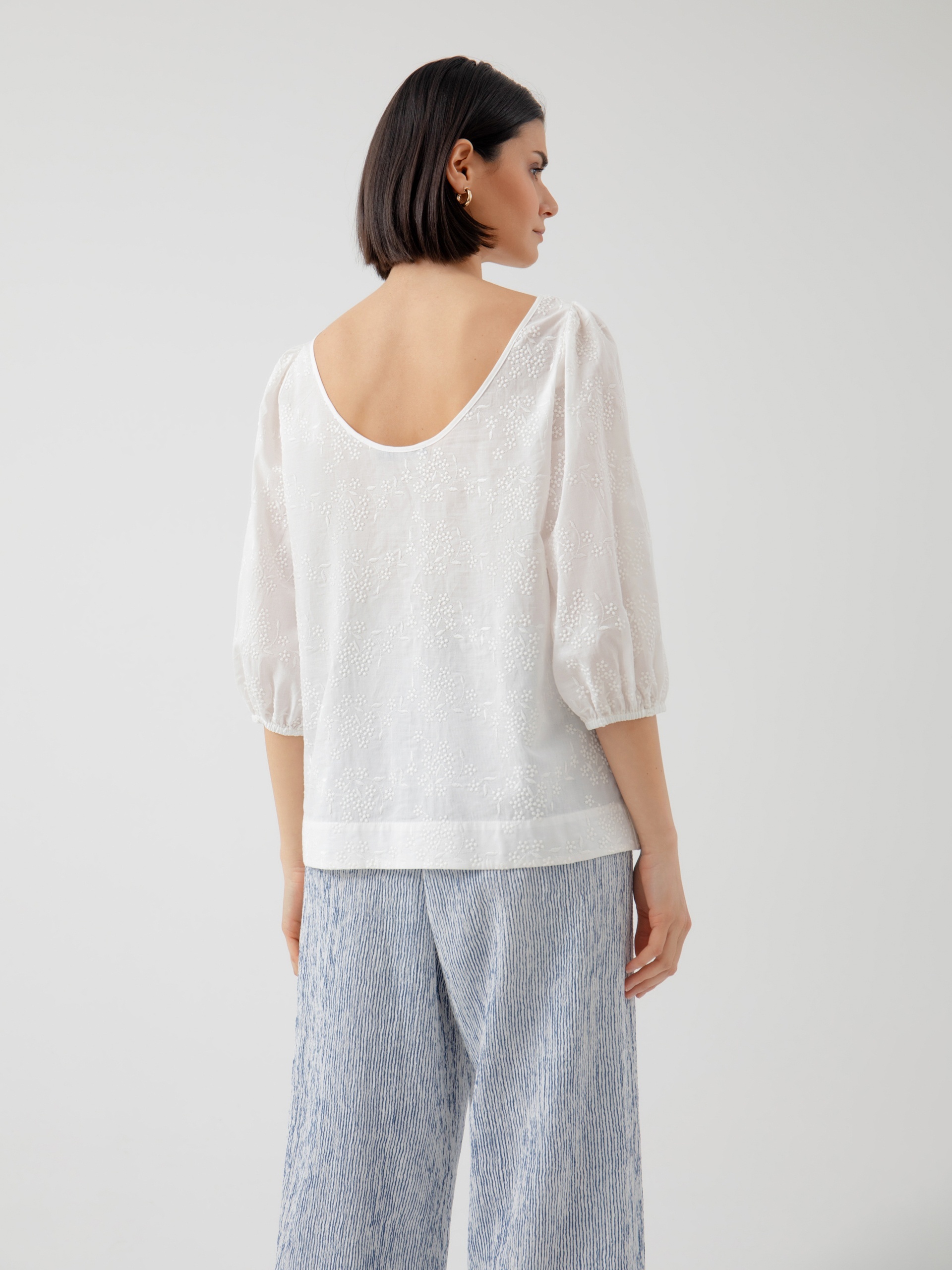 Блуза прямого силуэта, выполнена из воздушной хлопчатобумажной ткани с растительной вышивкой. Рукава буфы на резинке. Спереди горловина блузы выполнена в форме лодочки, а сзади углублённый вырез на спинке. Романтичная легкая блуза из хлопка - идеальный вариант для лета.
