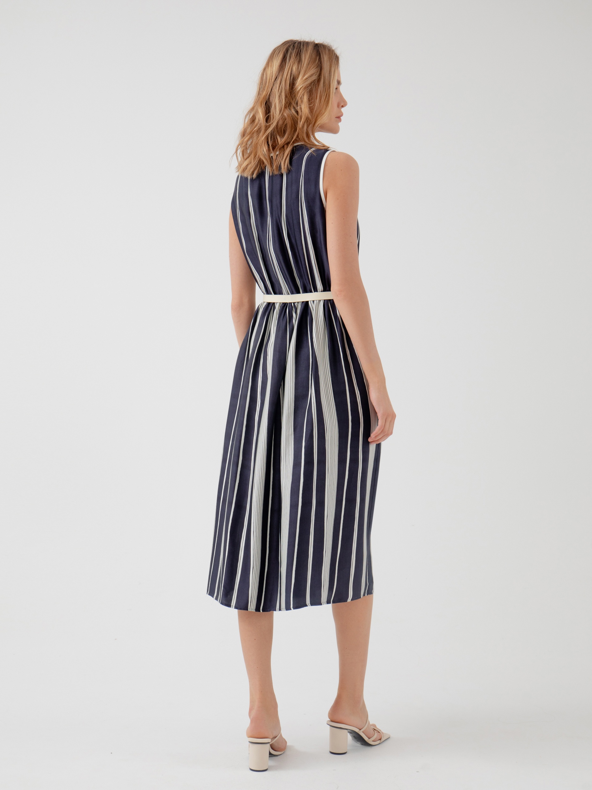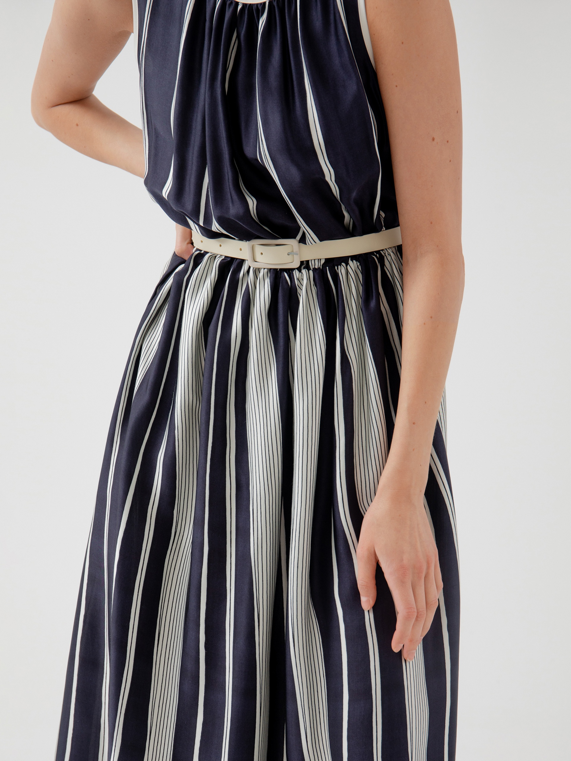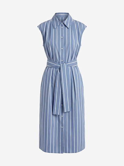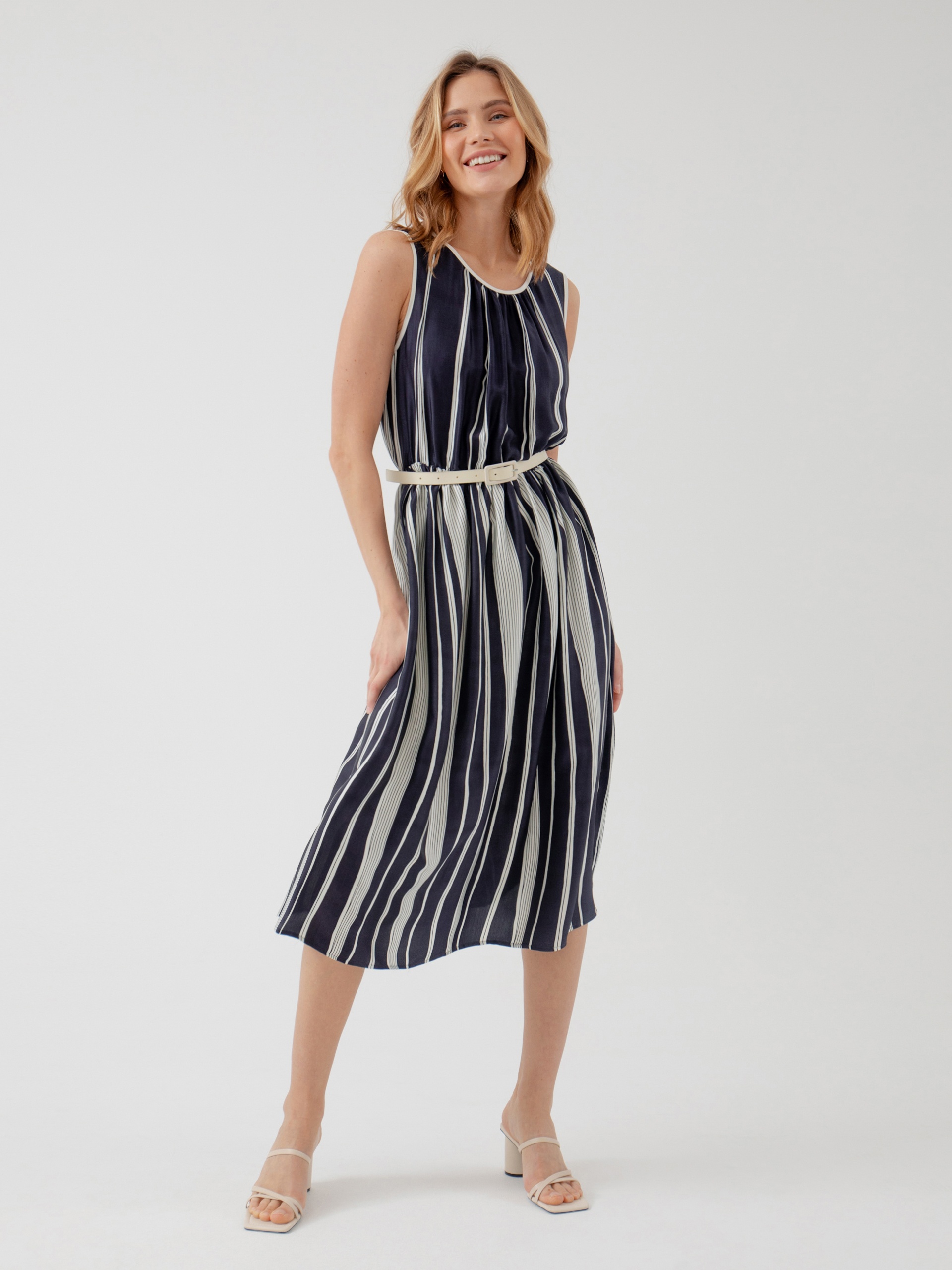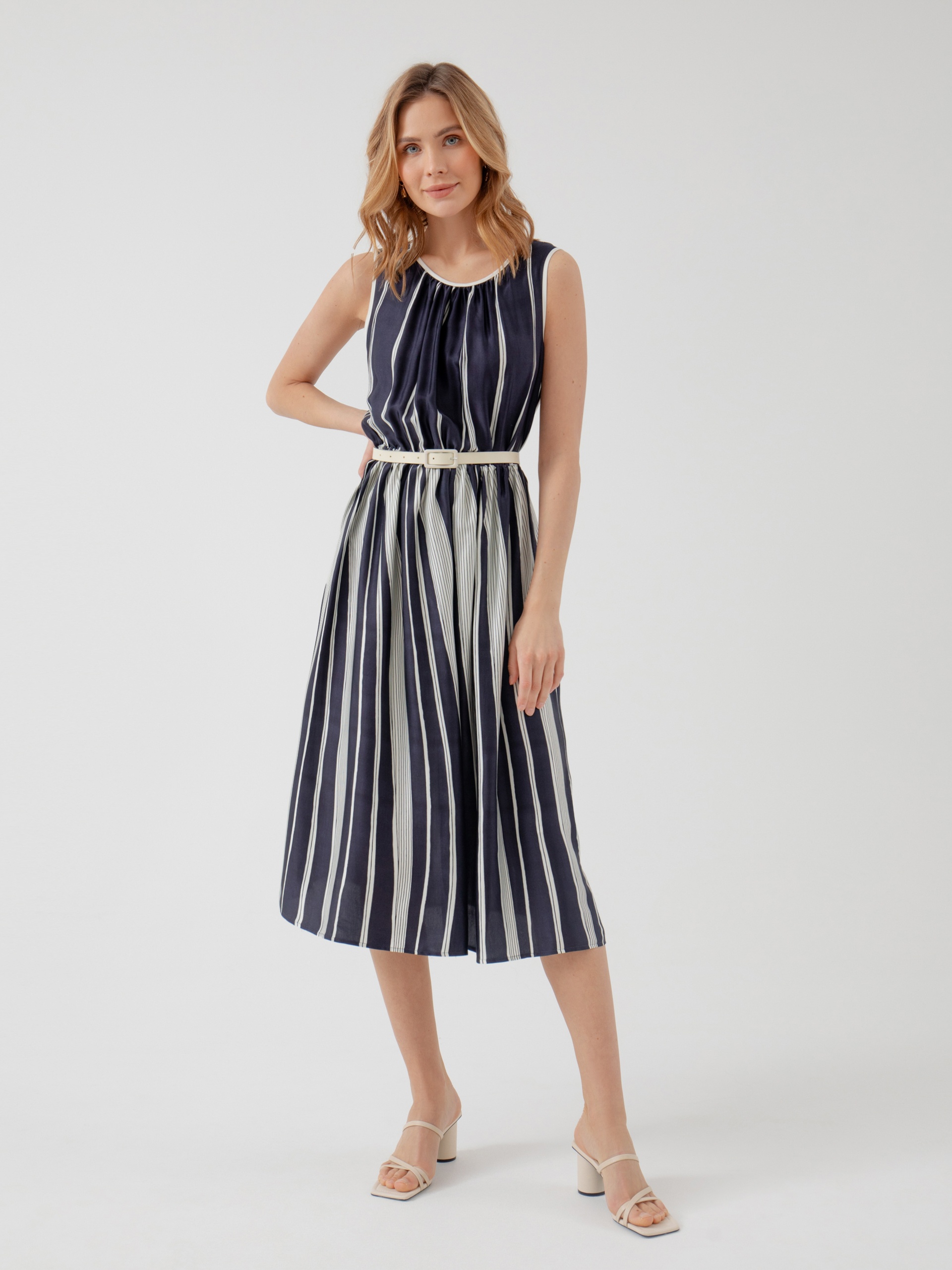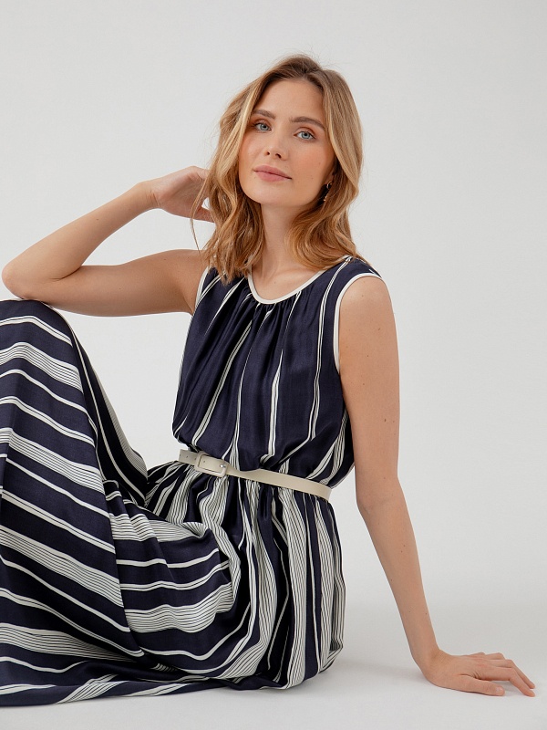 Прямое платье из тонкой вискозной ткани с вертикальным принтом. Горловина оформлена вырезом лодочкой.