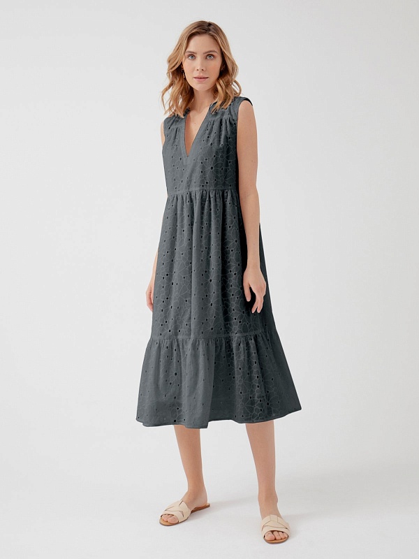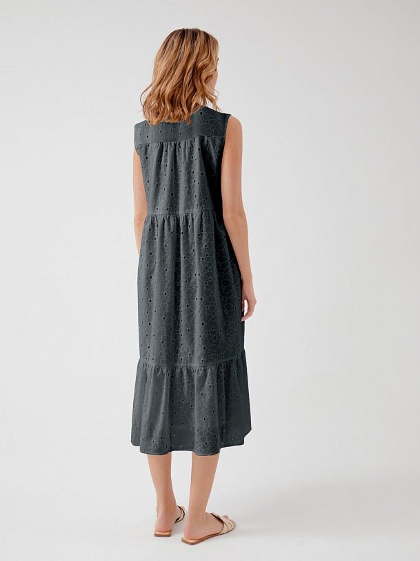 Длинное кружевное платье-кроше без рукавов. Силуэт трапеция, свободная посадка, круглый ворот со стойкой, завышенная линия талии, расклешенный кружевной подол с воланом.