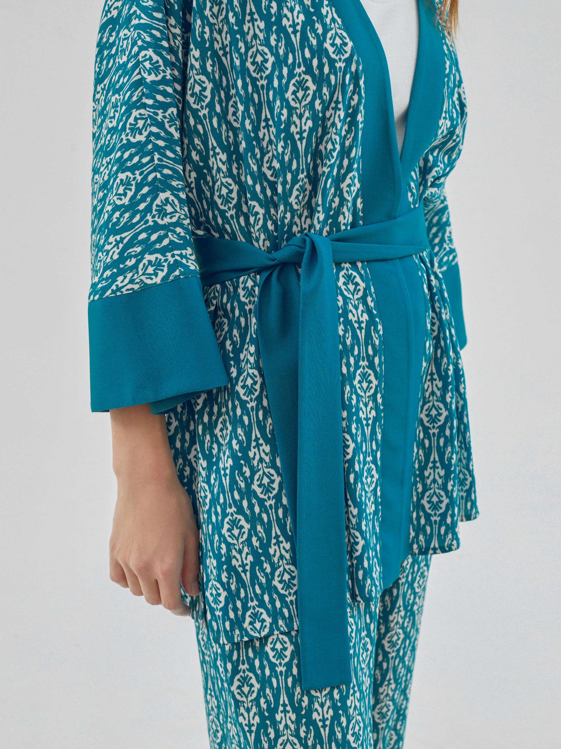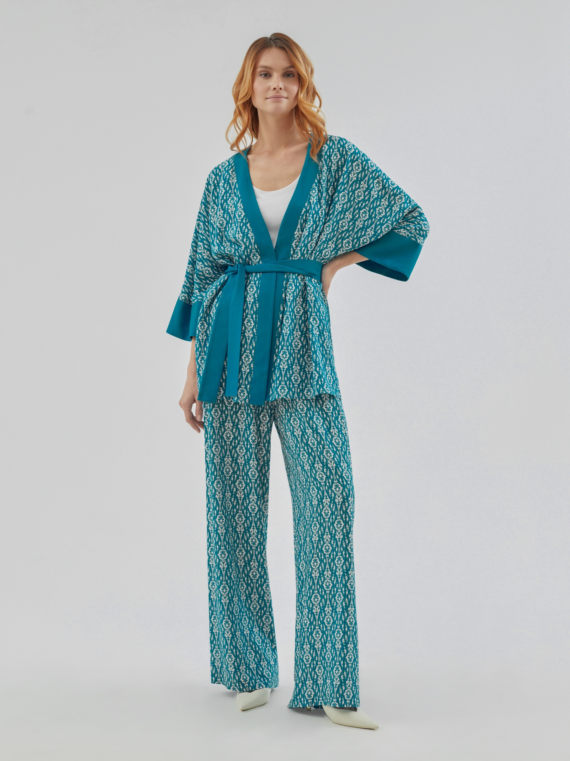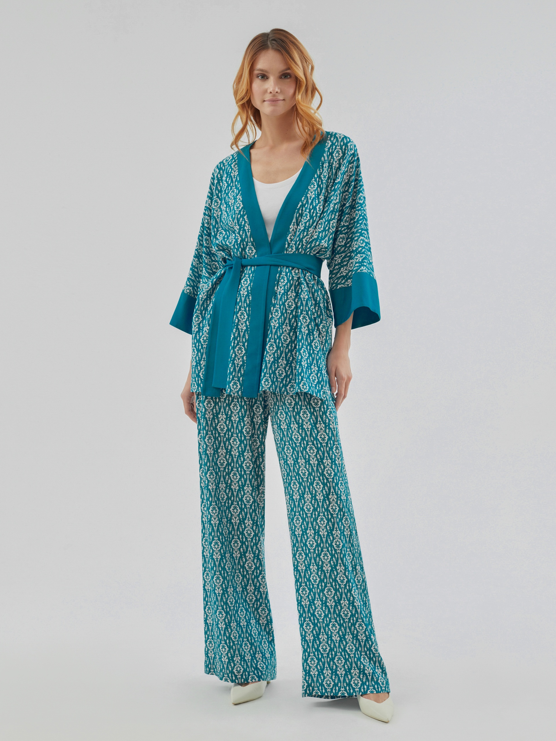 Жакет кимоно в пижамном стиле из вискозной ткани с принтом "икаты". Жакет с широкими манжетами, планкой и поясом. Составит идеальный комплект с юбкой или брюками из одной ткани.