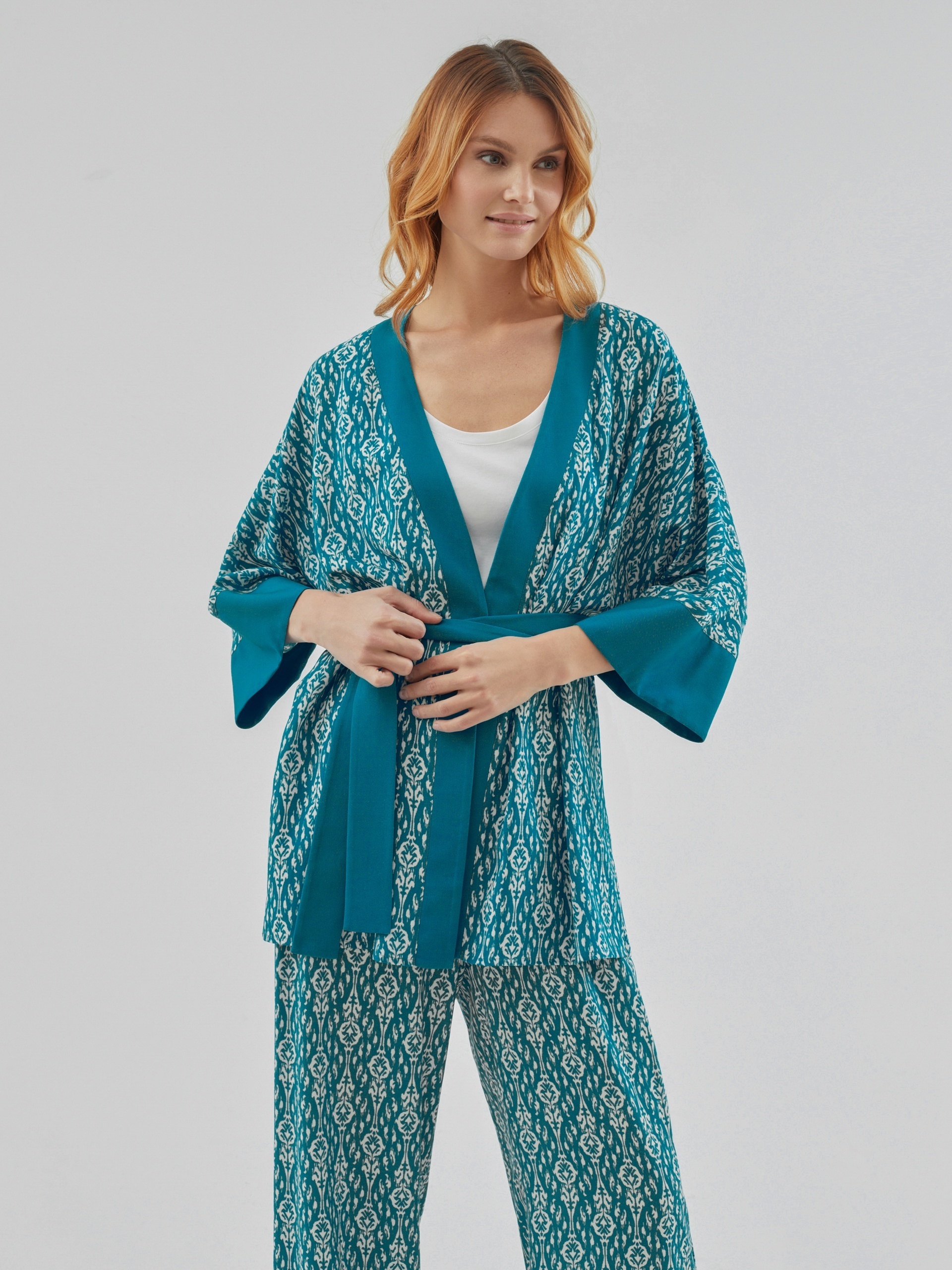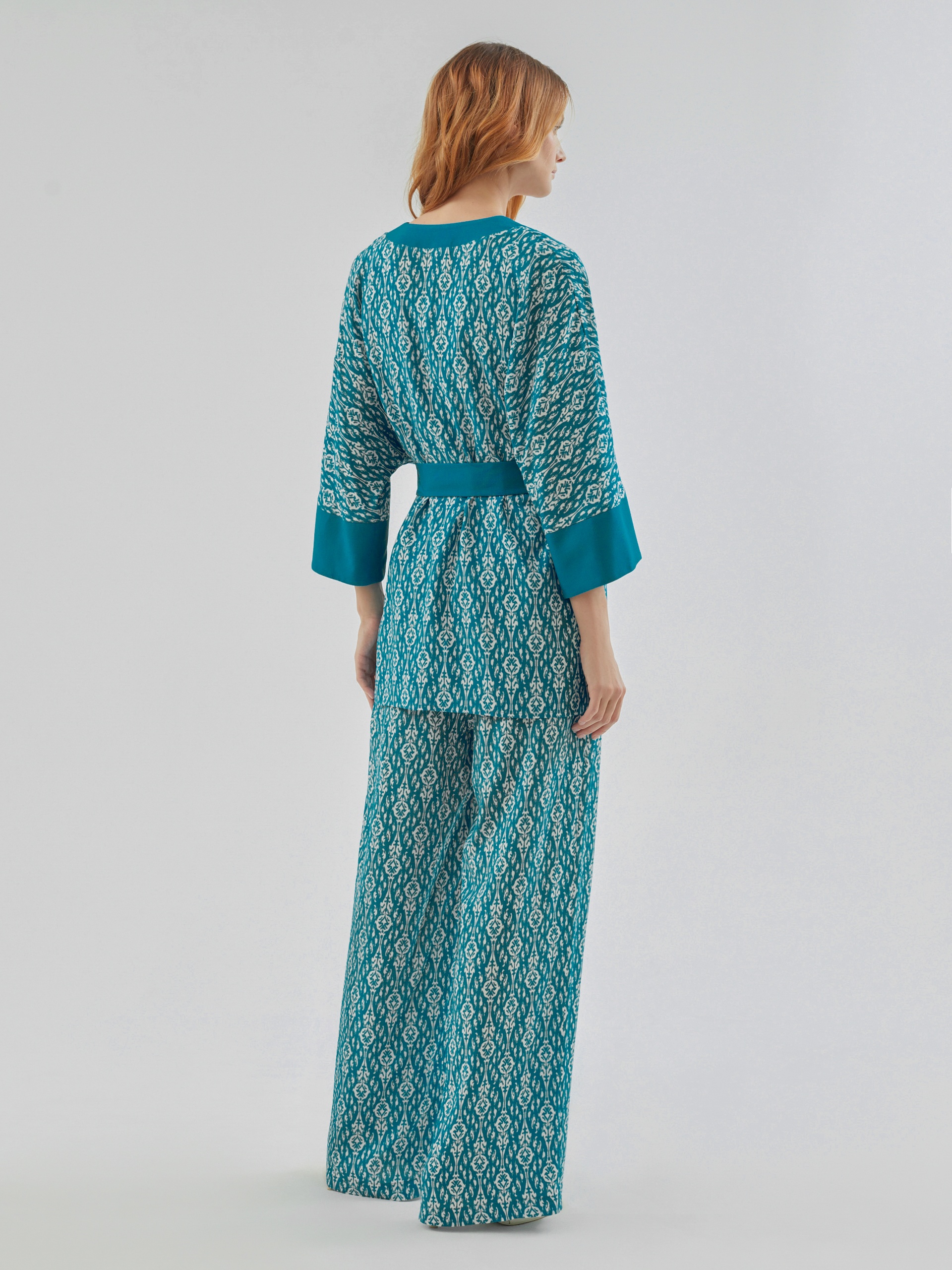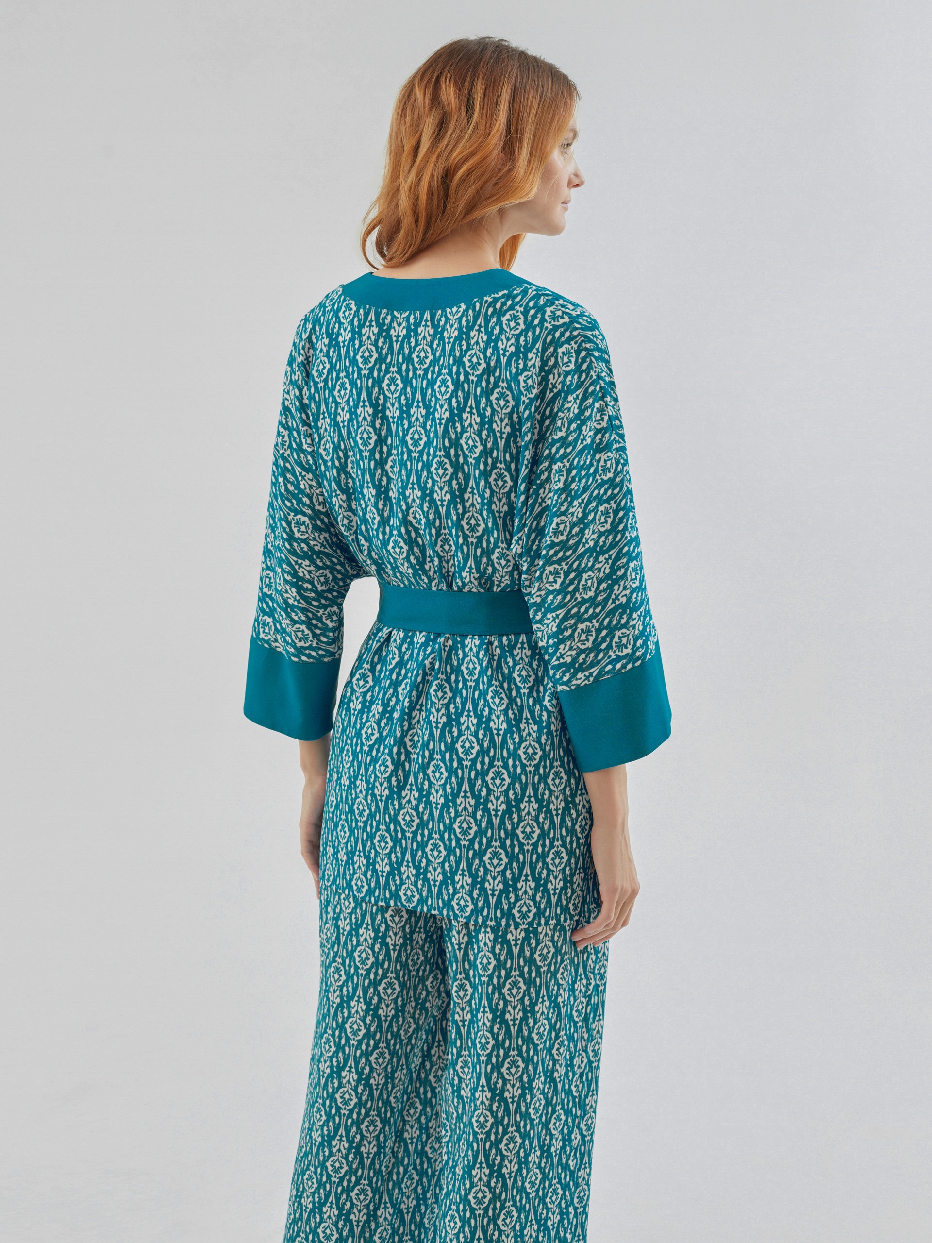 Жакет кимоно в пижамном стиле из вискозной ткани с принтом "икаты". Жакет с широкими манжетами, планкой и поясом. Составит идеальный комплект с юбкой или брюками из одной ткани.