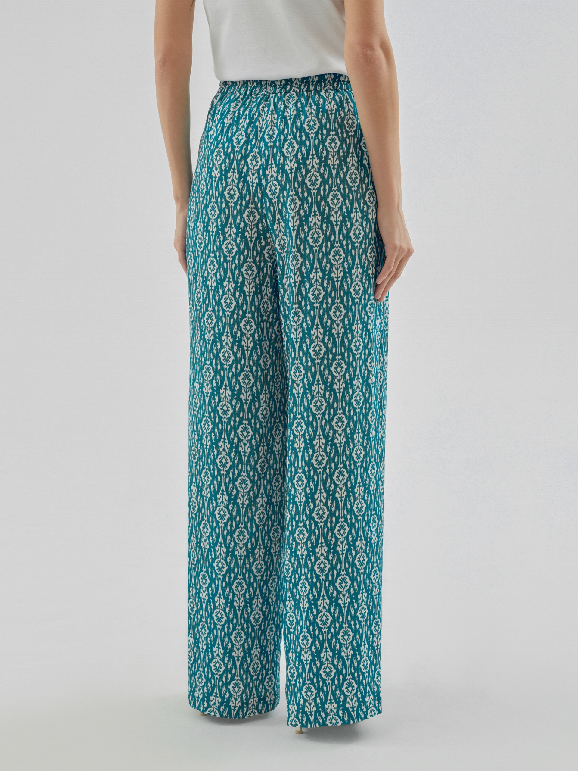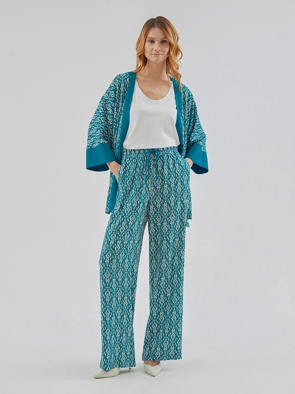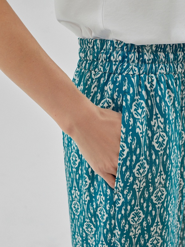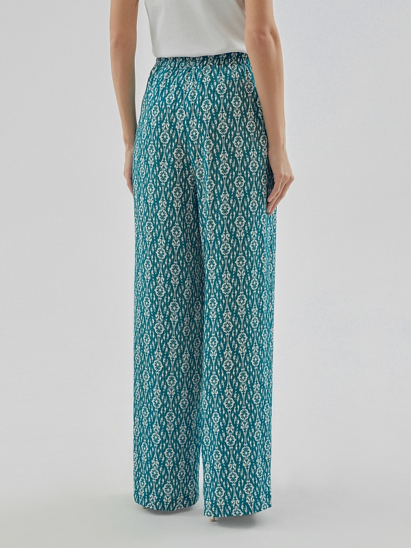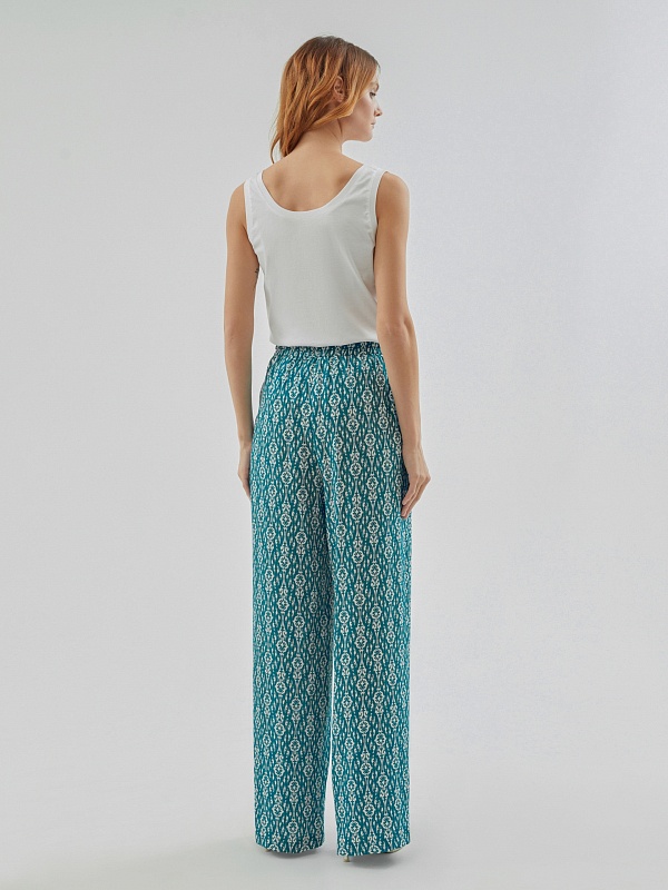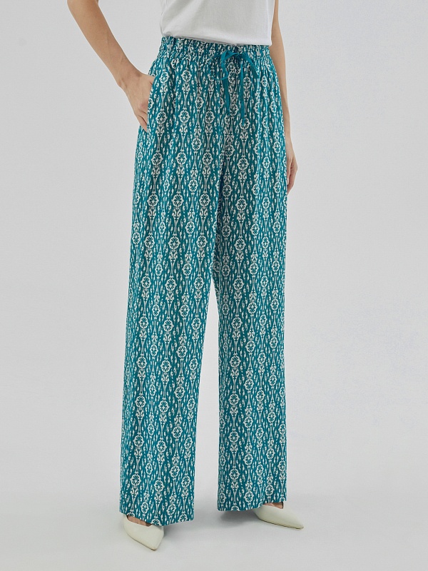 Брюки полной длины, из вискозной ткани с принтом "икаты", свободной формы, на поясе. В пояс вставлена резинка и кулиcка для лучшей фиксации.