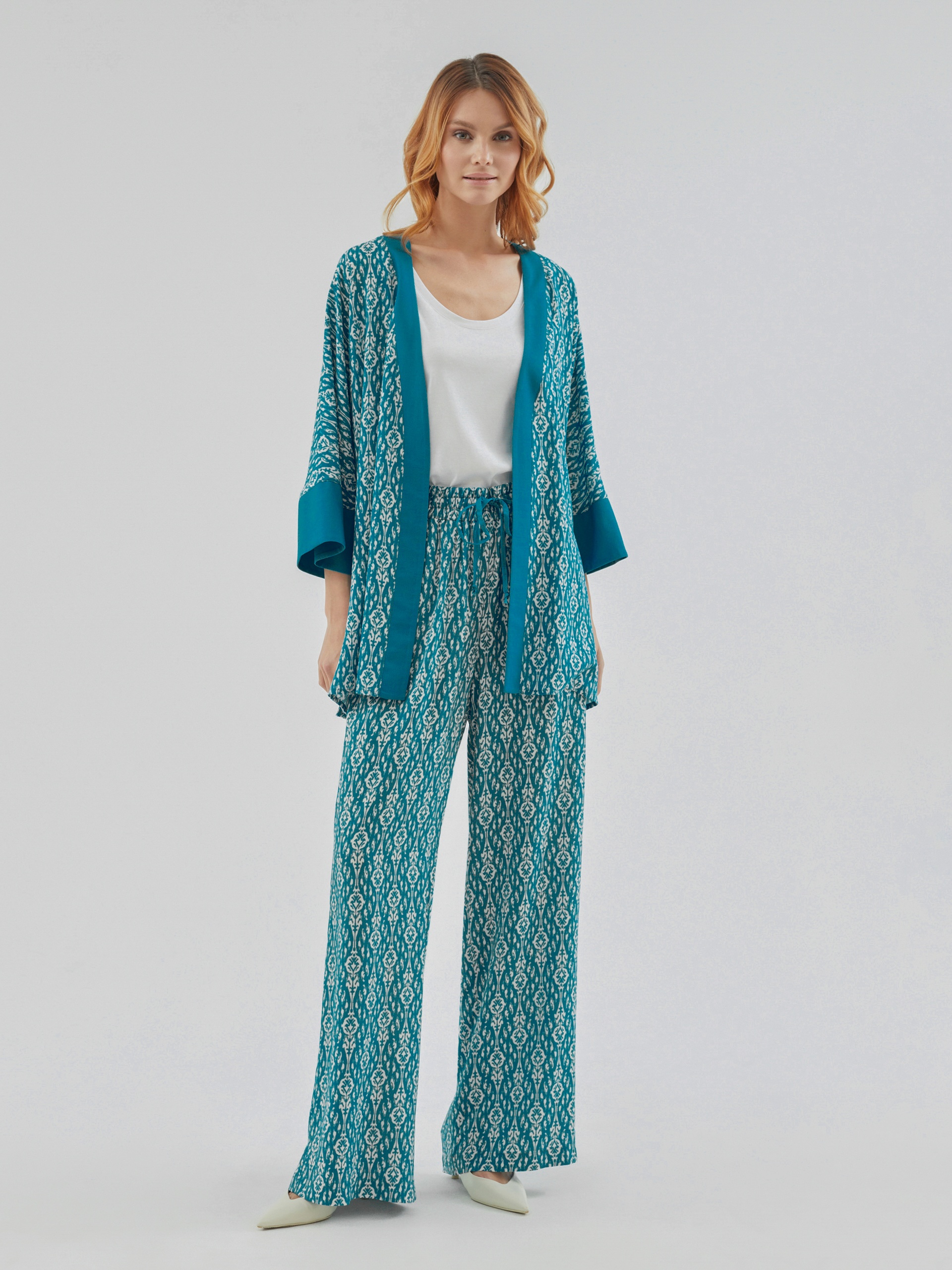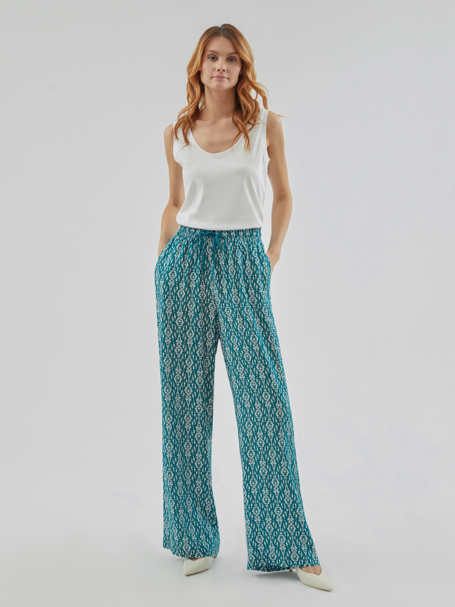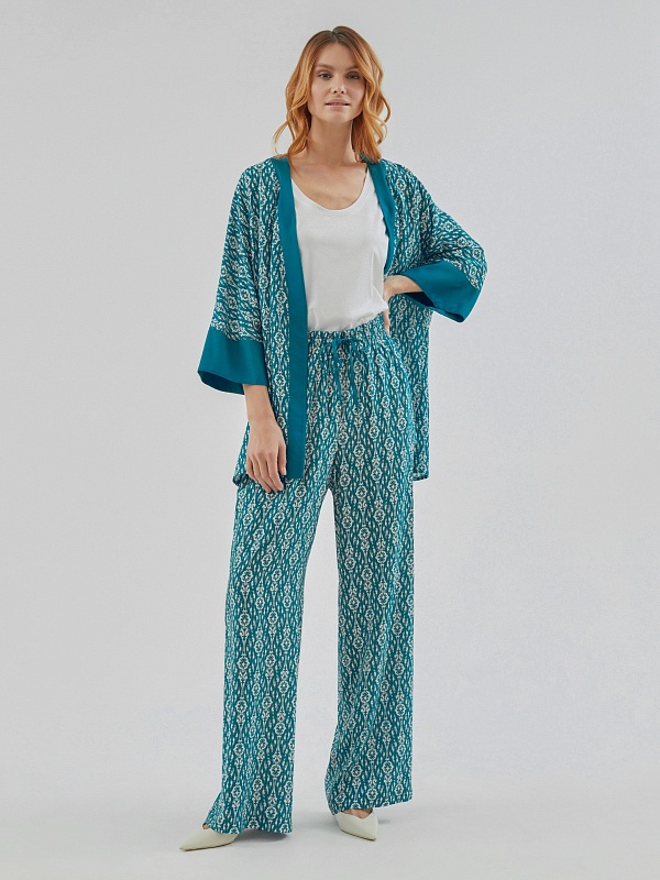 Брюки полной длины, из вискозной ткани с принтом "икаты", свободной формы, на поясе. В пояс вставлена резинка и кулиcка для лучшей фиксации.
