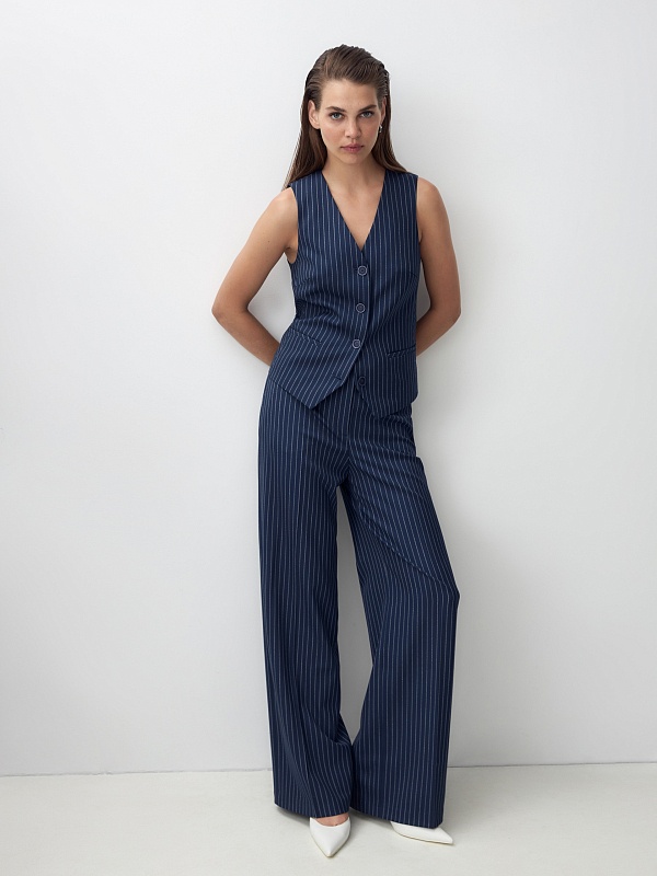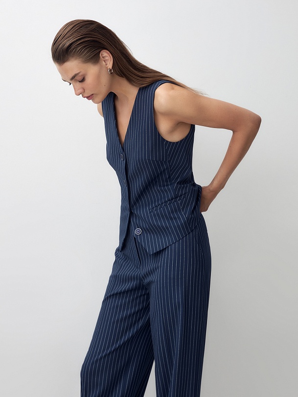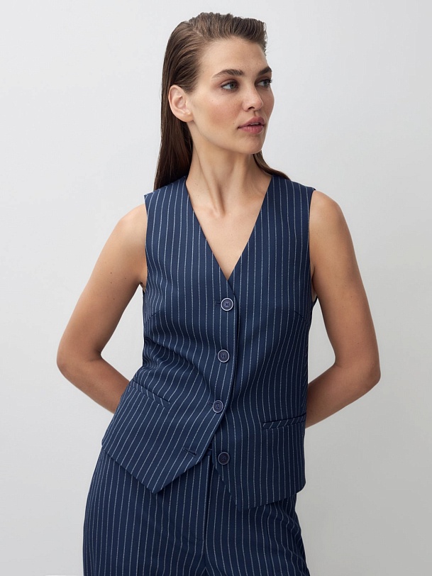 Прямой чуть приталенный жилет из костюмной ткани с добавлением вискозы в темно-синем цвете с тонкой вертикальной полосой белого цвета. Жилет с V-образным вырезом на пуговицах и декоративным элементом на спинке. В жилете имеются прорезные карманы с листочками. Идеально впишется в офисный образ с жакетом и брюками из этой же ткани. Стиль smart casual.