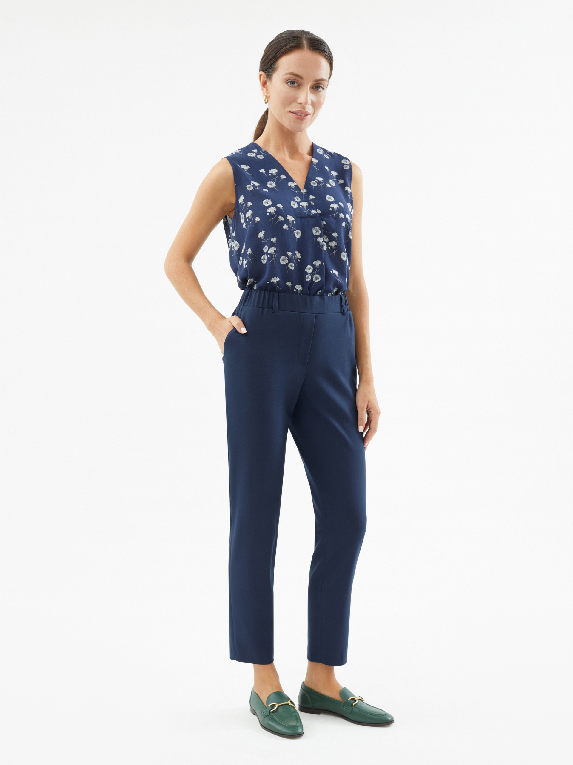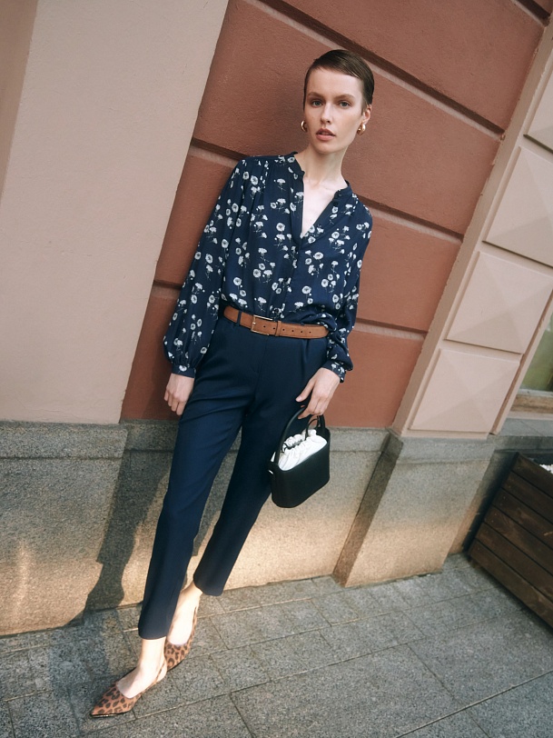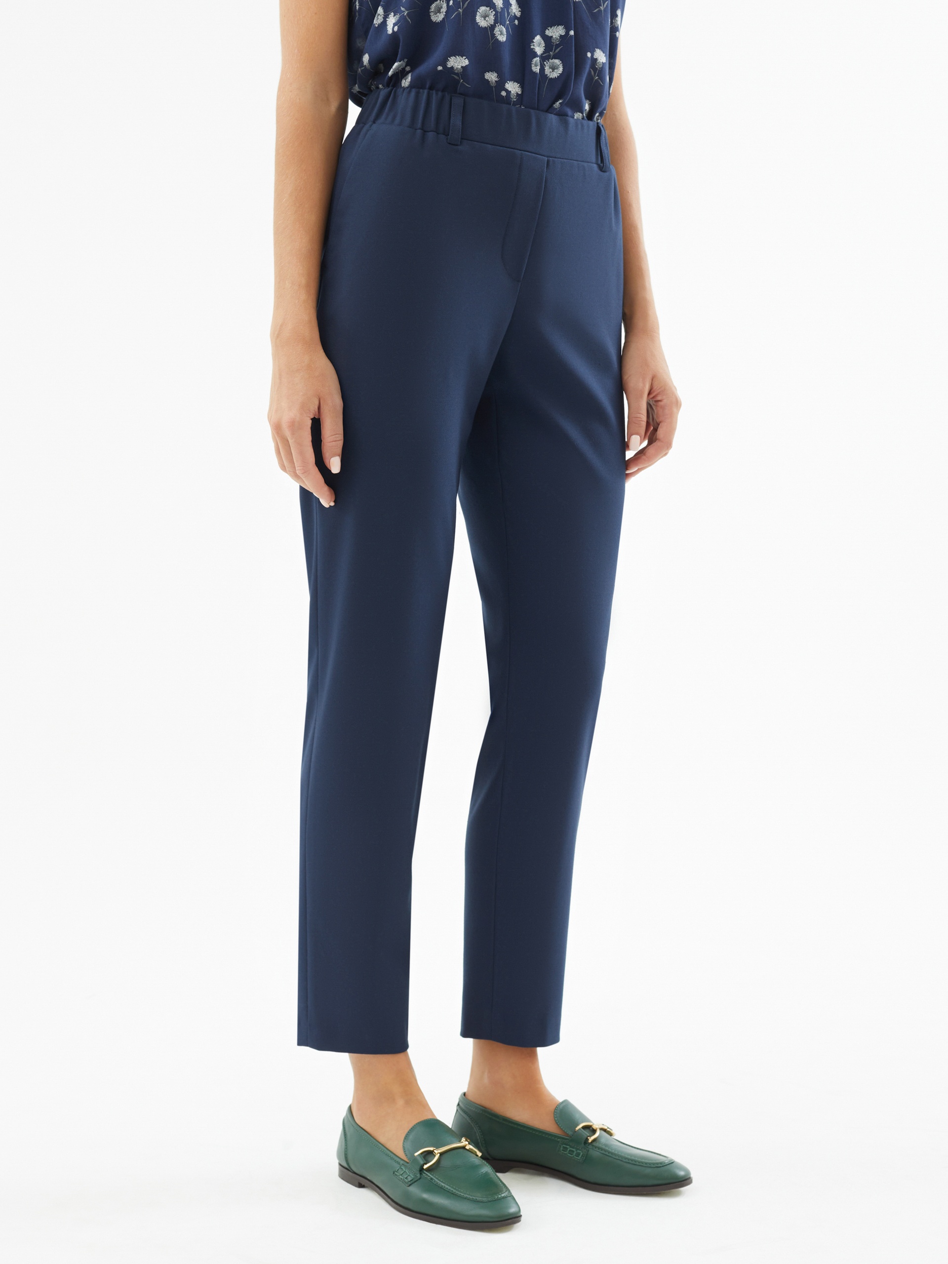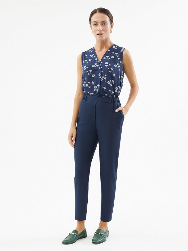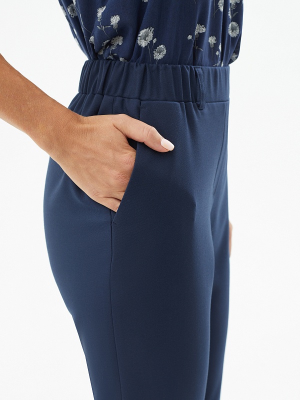 Брюки из костюмной ткани в темно-синем цвете. Зауженный к низу силуэт на притачном поясе со шлевками и резинкой по спинке для лучшей посадки. Брюки с карманами по бокам и двумя прорезными карманами сзади. Модель идеально подойдет для создания ярких образов с жакетом в полоску из одной ткани.