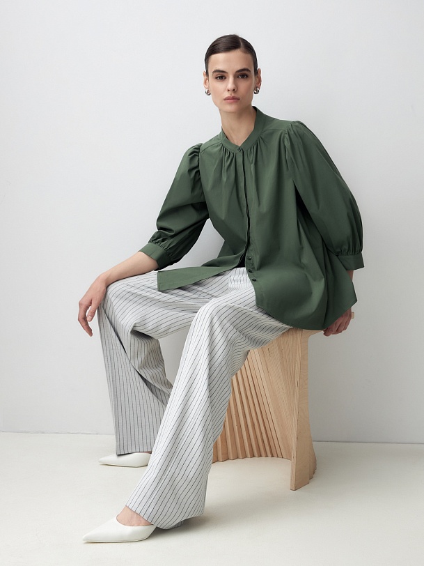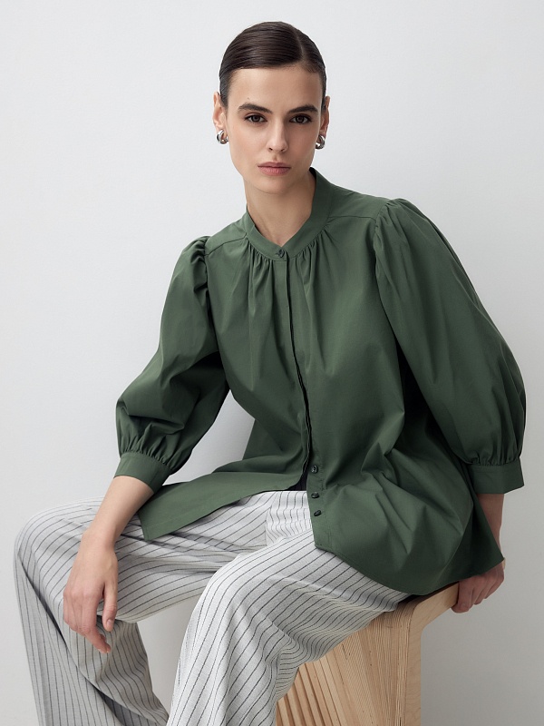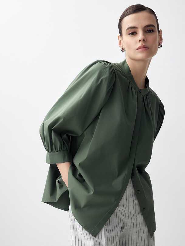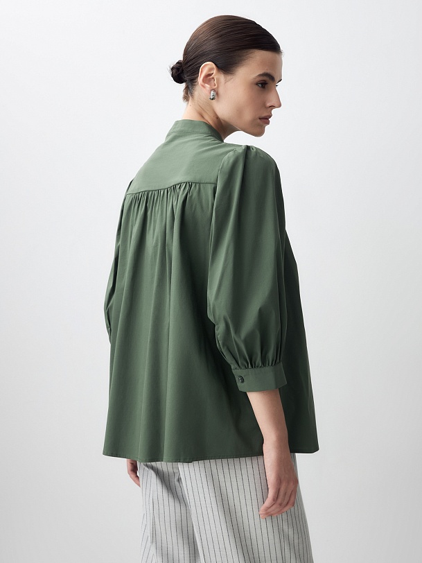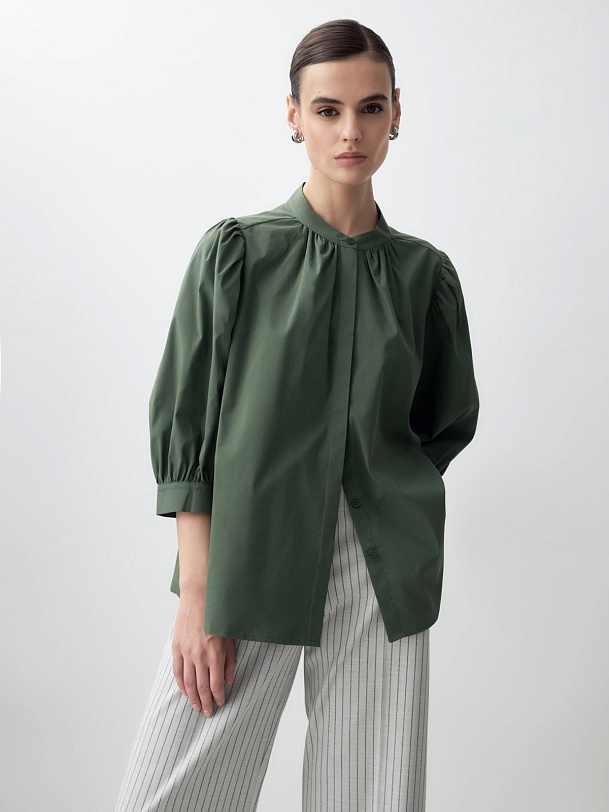 Романтичная блуза из хлопковой ткани красивого травяного оттенка. Блуза прямого силуэта с втачным рукавом 3/4 со сборками на манжете. Блуза с воротником-стойкой и супатной застежкой. Боковые швы переведены на перед. По горловине переда под стойкой идет сборка, так же под кокеткой на спинке.