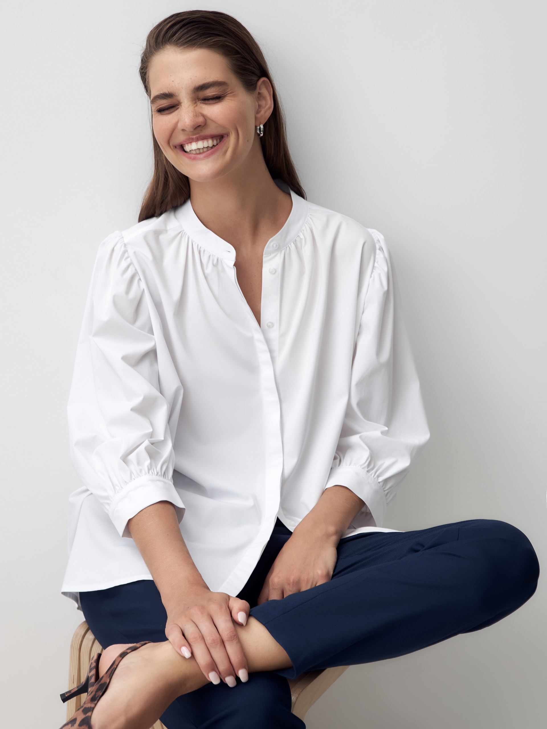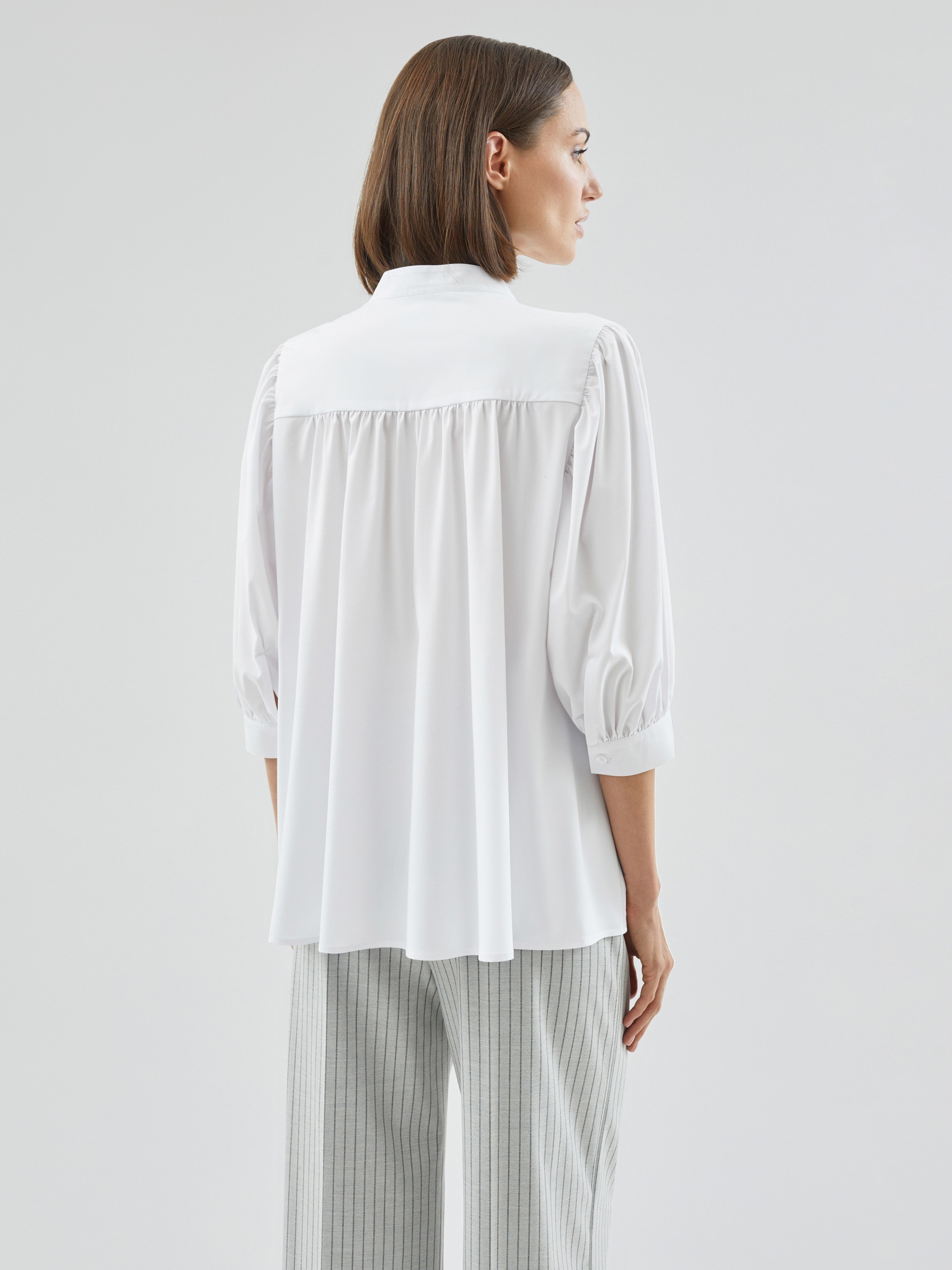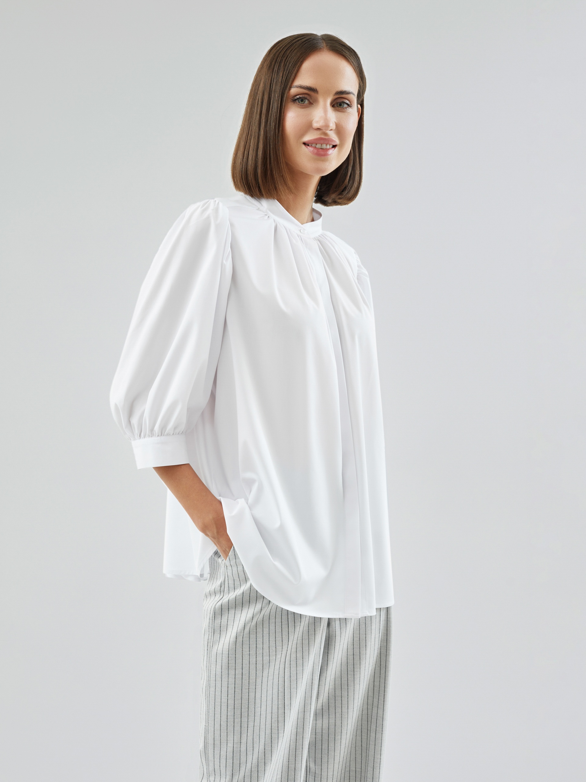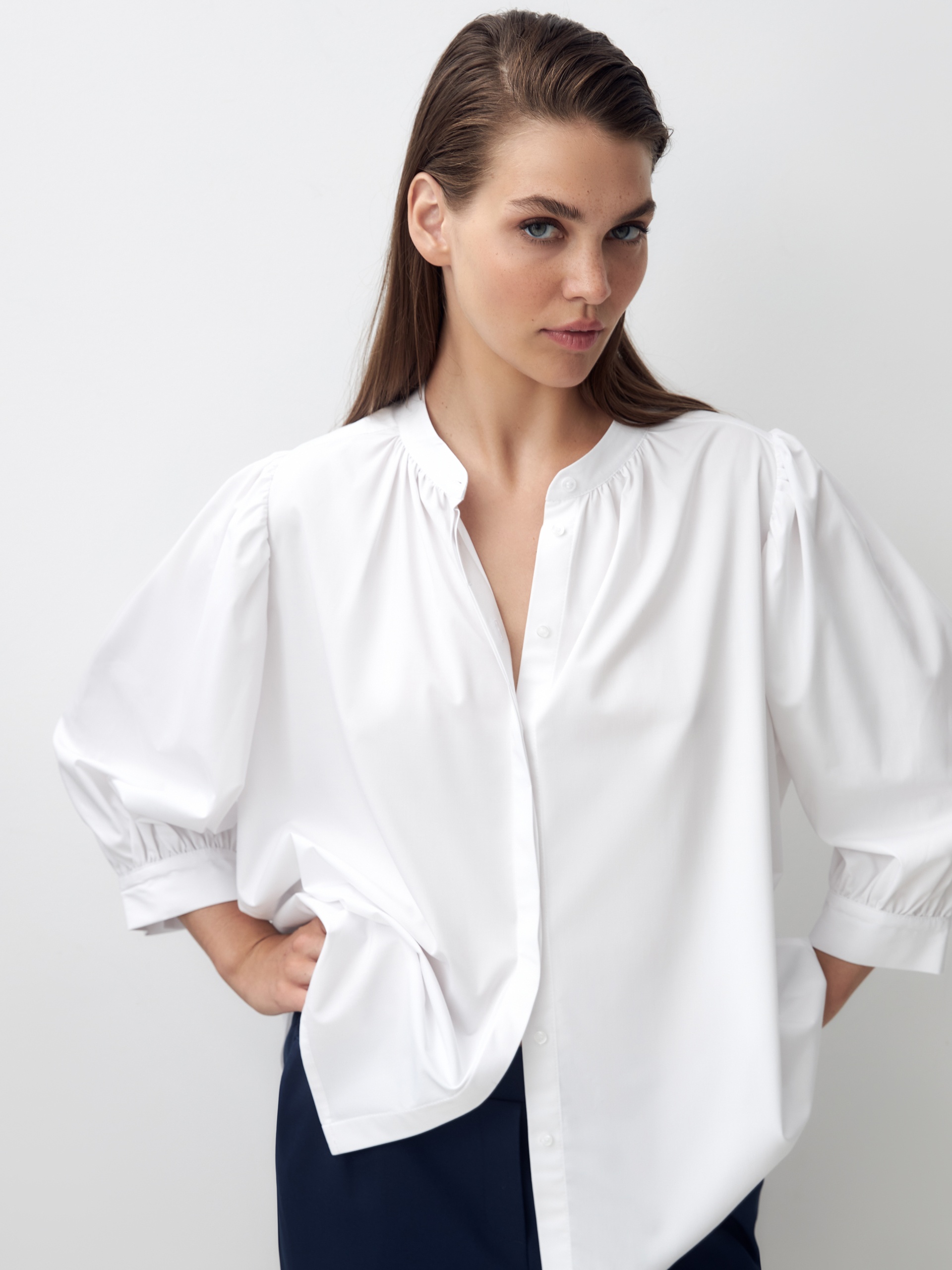 Романтичная блуза из хлопковой ткани белого цвета. Блуза прямого силуэта с втачным рукавом 3/4 со сборками на манжете. Блуза с воротником-стойкой и супатной застежкой. Боковые швы переведены на перед. По горловине переда под стойкой идет сборка, так же под кокеткой на спинке.