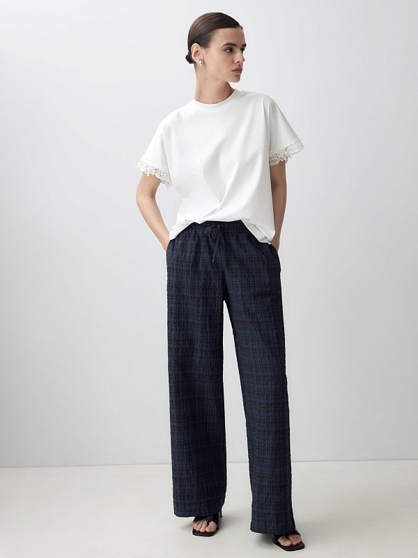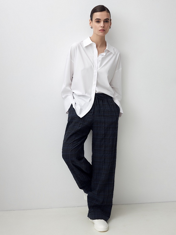 Брюки прямые полной длины из фактурной плательной ткани в клетку, свободной формы, на поясе. В пояс вставлена резинка и кулиcка для лучшей фиксации.