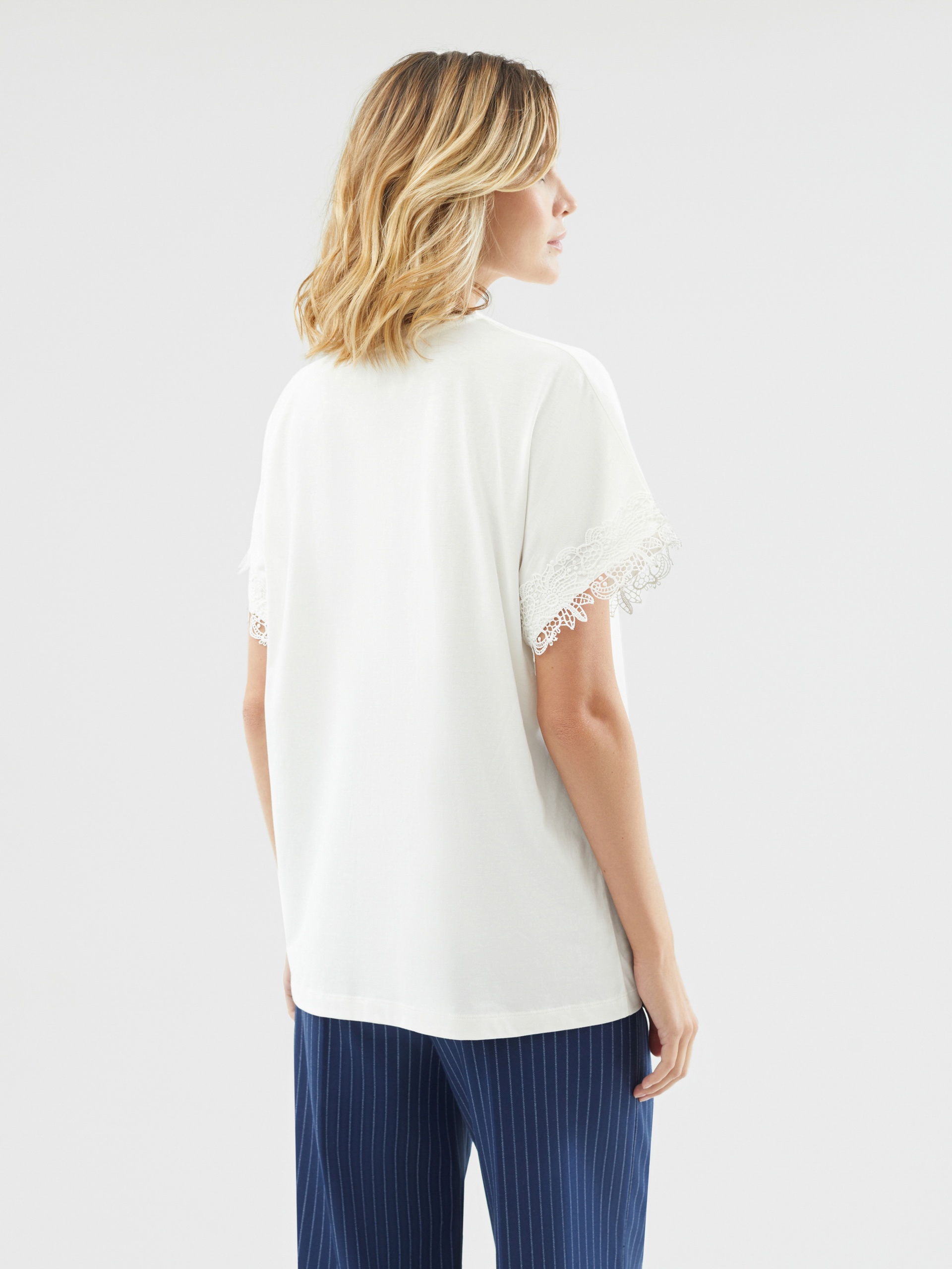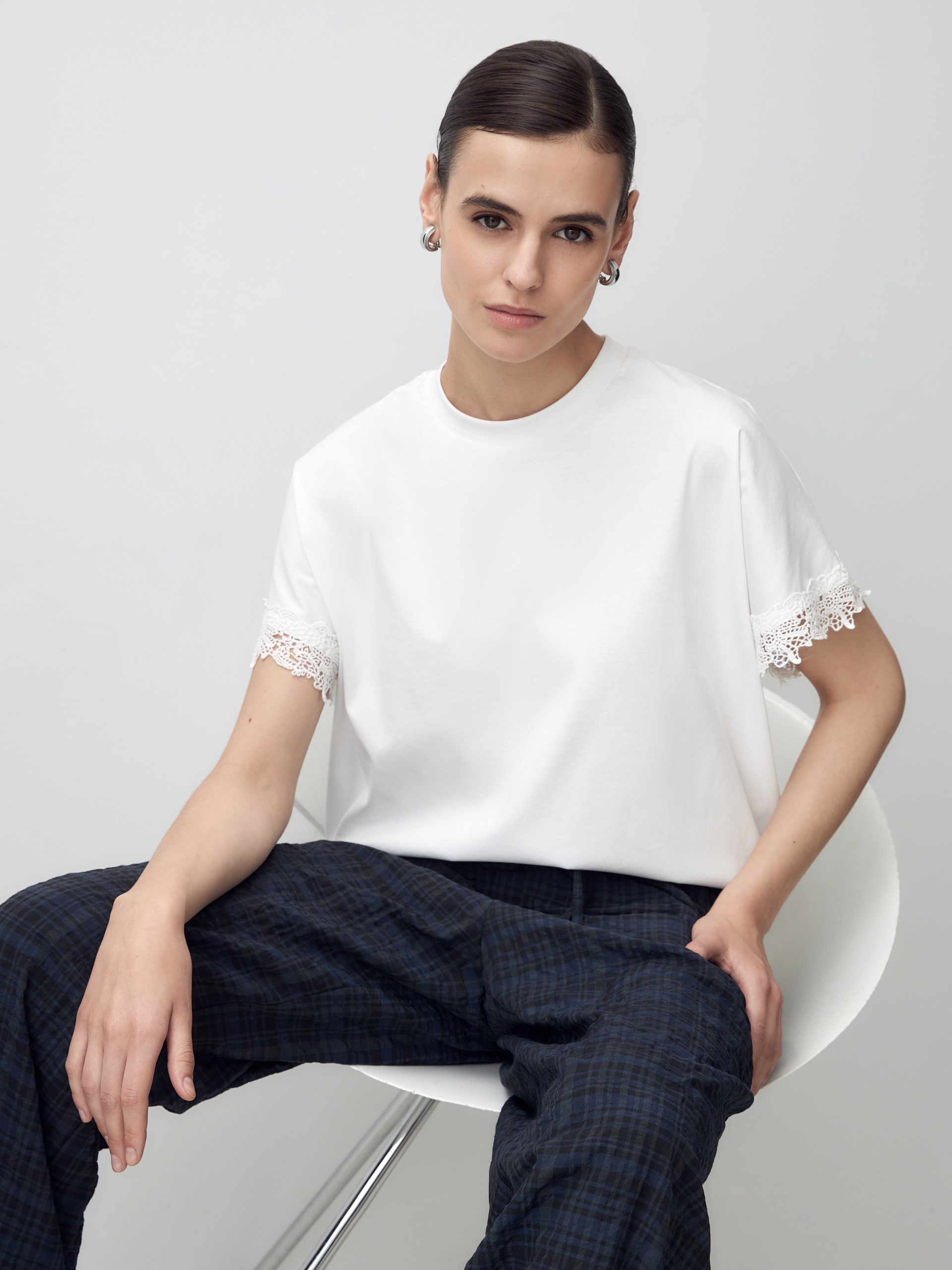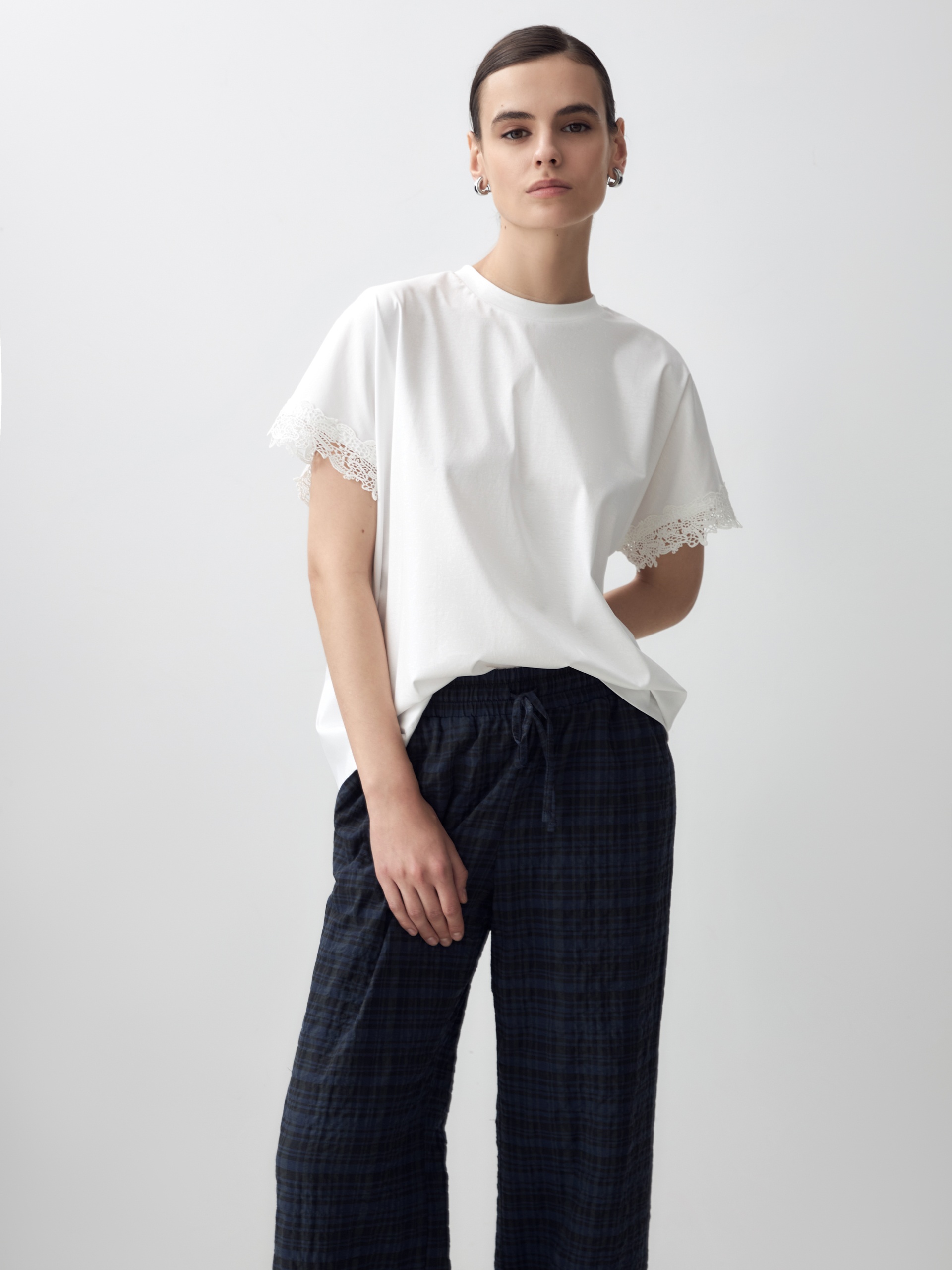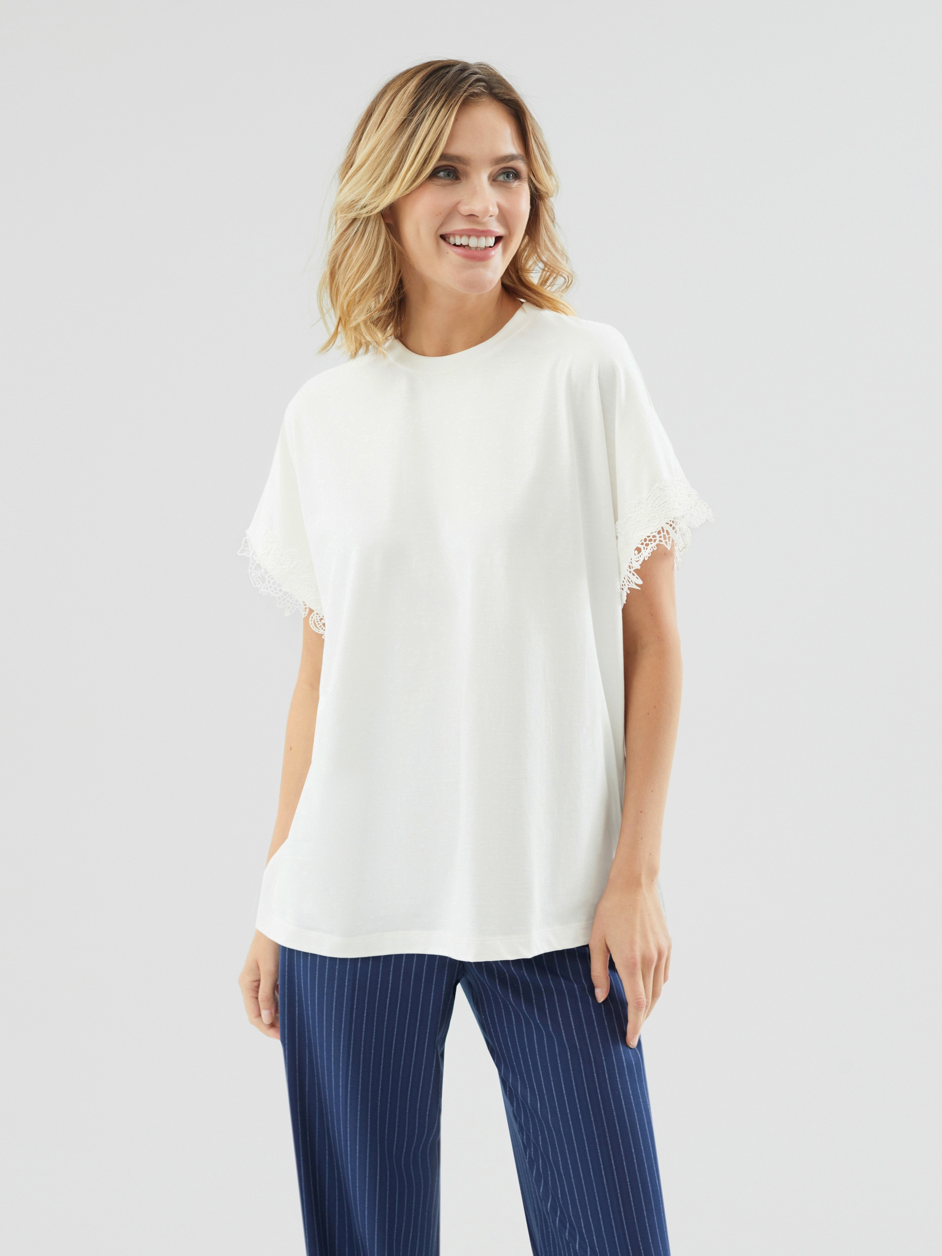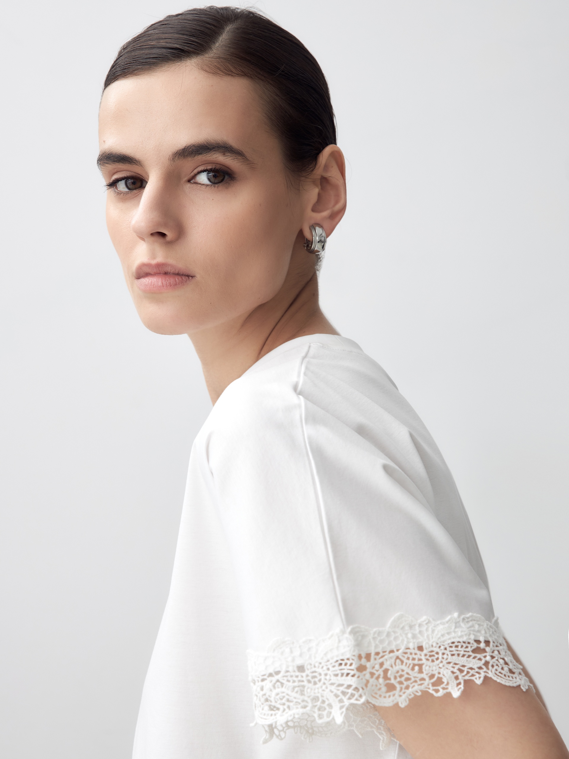 Футболка свободного кроя из мерсеризированного хлопка с эффектной кружевной отделкой по рукаву в цвет ткани. Благодаря мерсеризации данная футболка имеет: