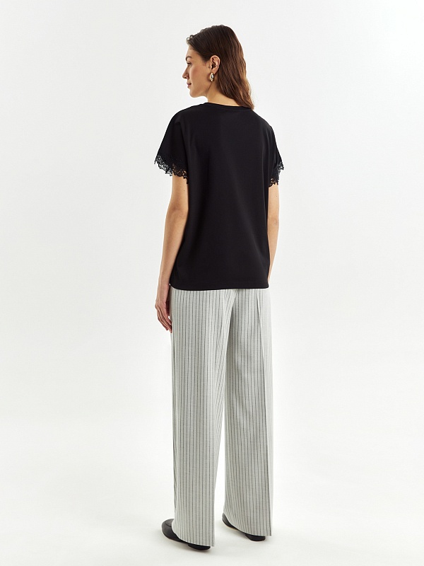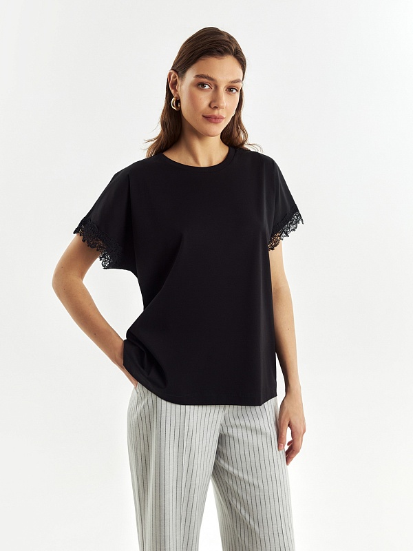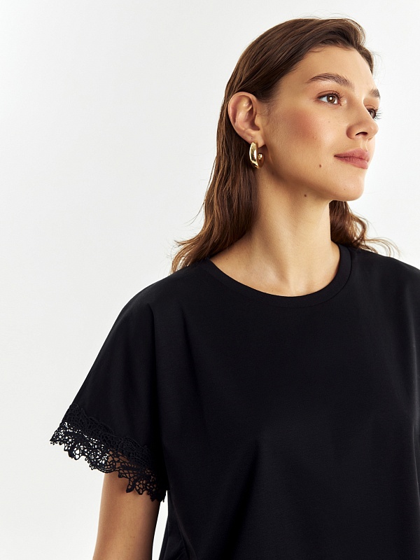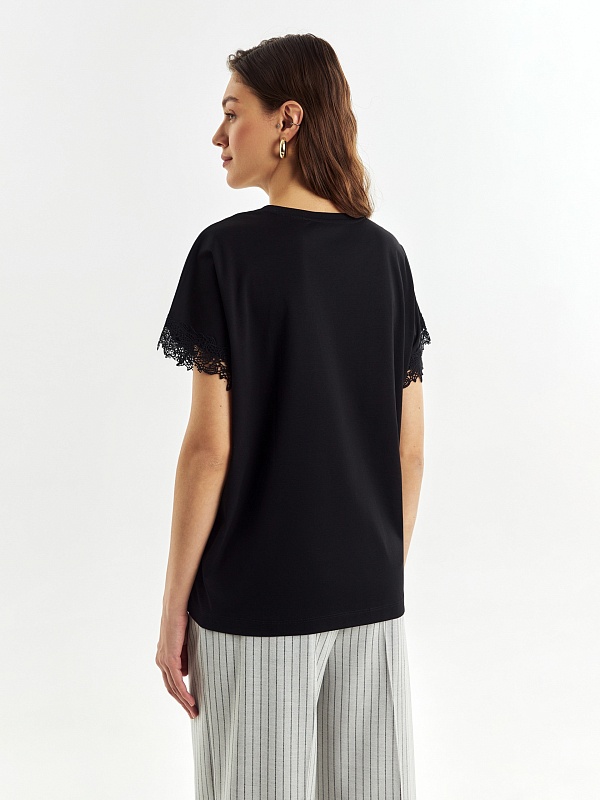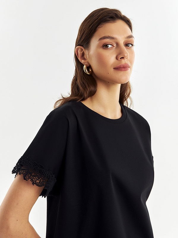 Футболка свободного кроя из мерсеризированного хлопка с эффектной кружевной отделкой по рукаву в цвет ткани. Благодаря мерсеризации данная футболка имеет: