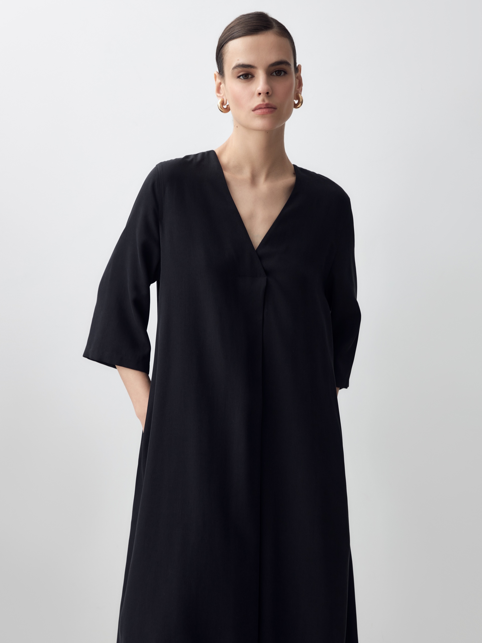 Прямое платье миди с V-образным вырезом и складкой по переду. Платье выполнено из ткани черного цвета. Прямые рукава.