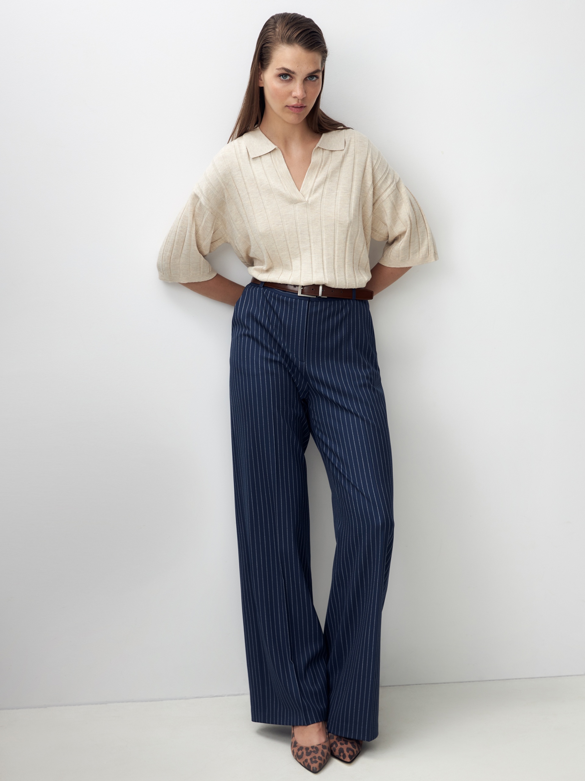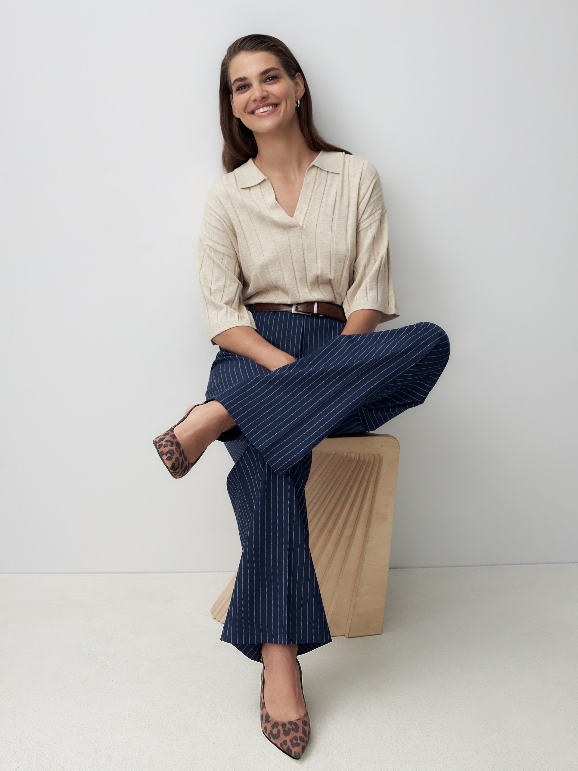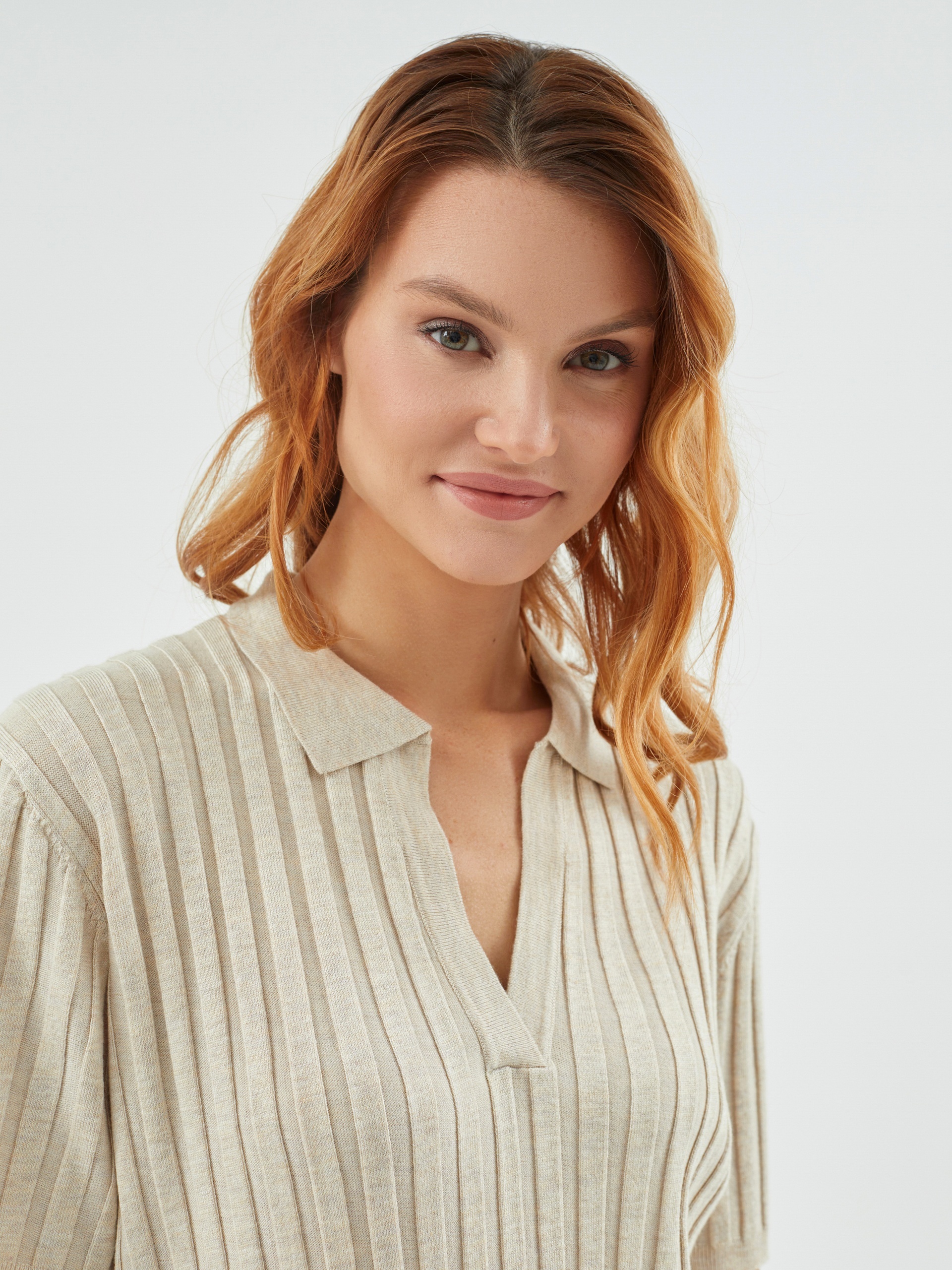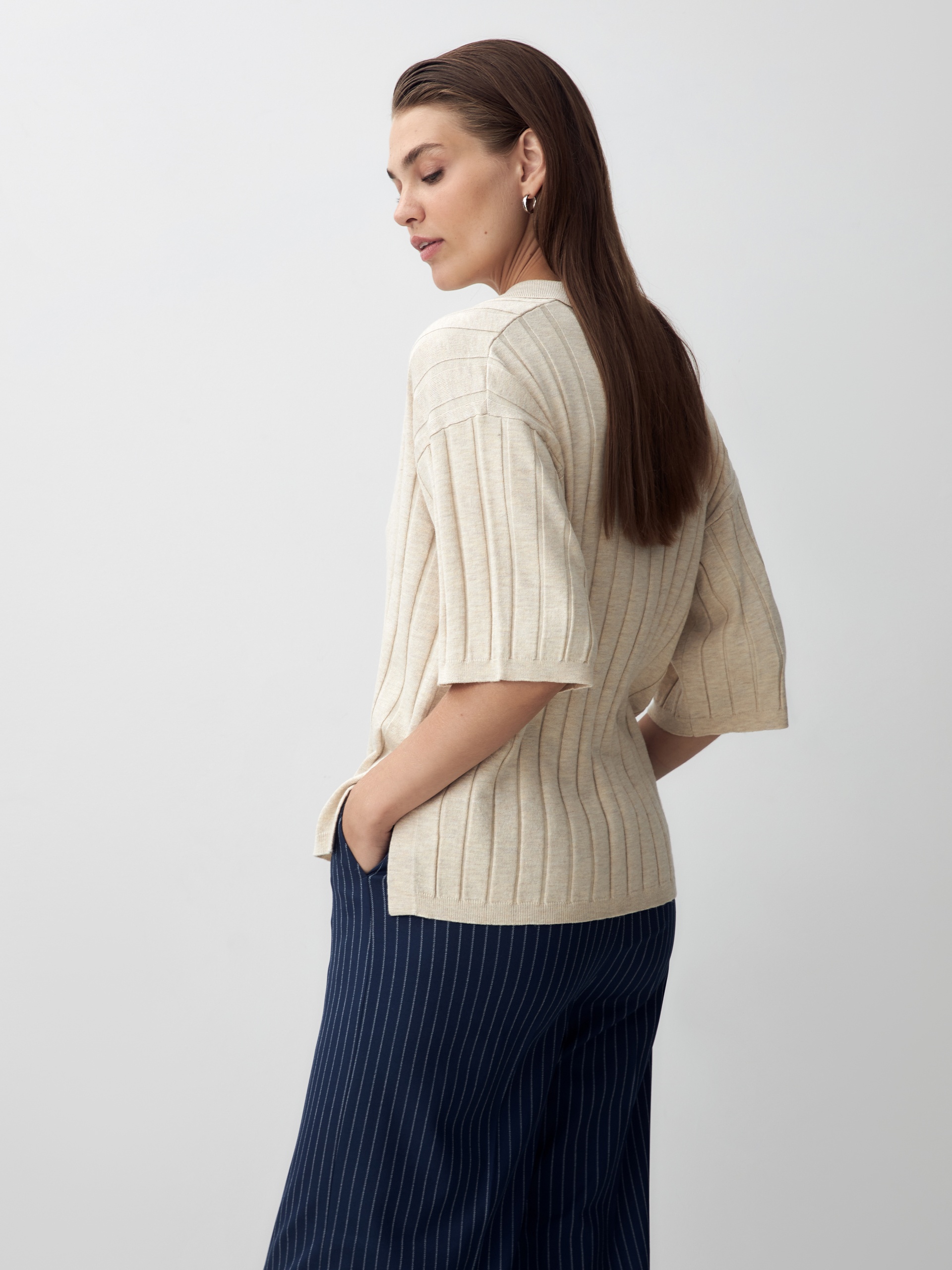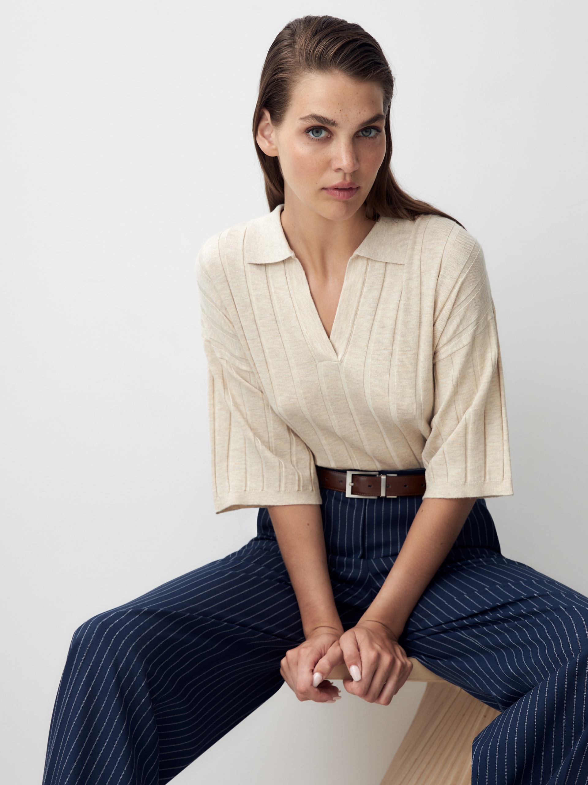 Вязаный джемпер с воротником и застежкой-поло в широкий рубчик станет достойным аналогом поло из пике благодаря преобладающей вискозе в составе пряжи, которая придаст ощущение легкой прохлады и шелковистости к коже.
