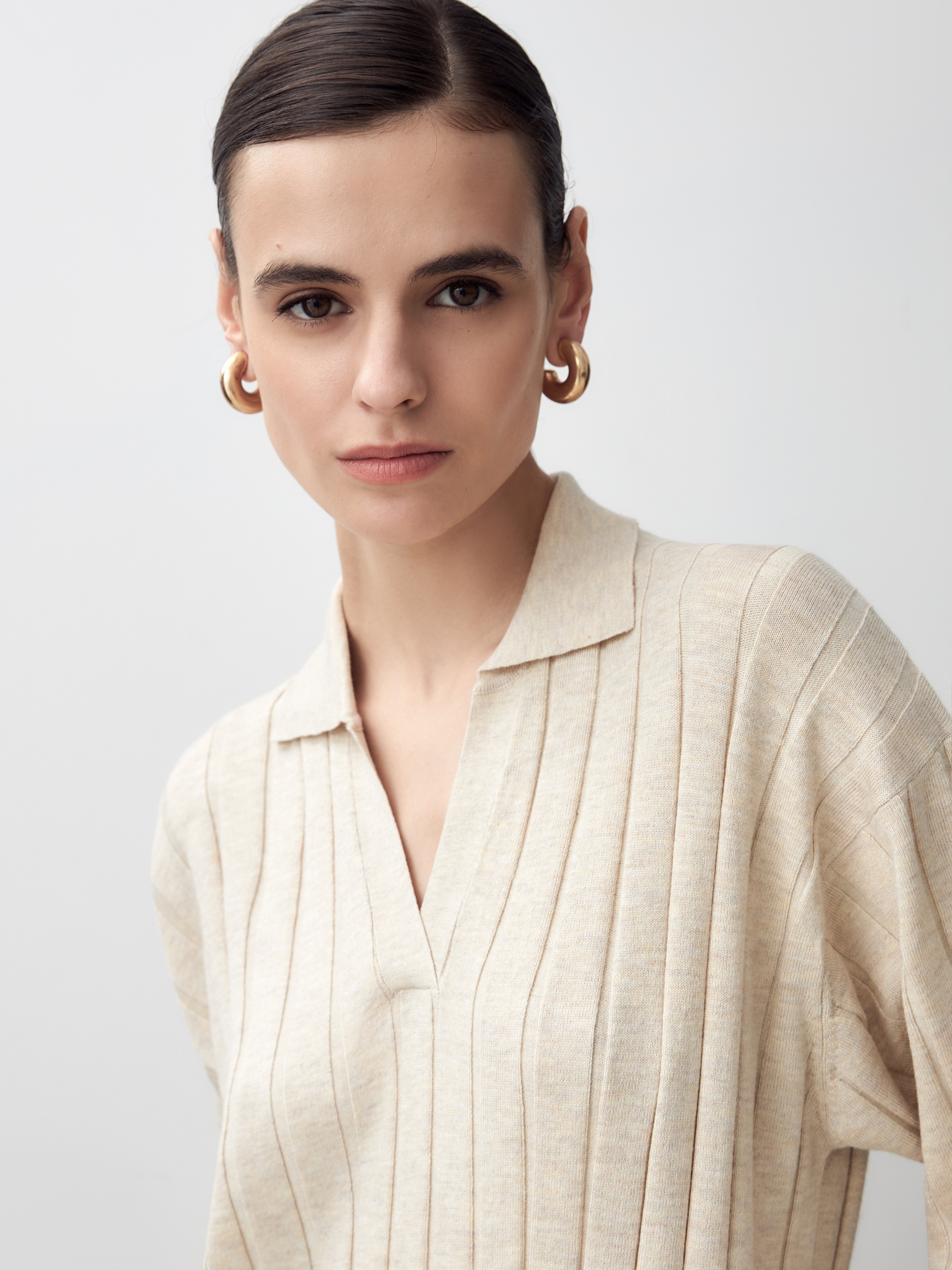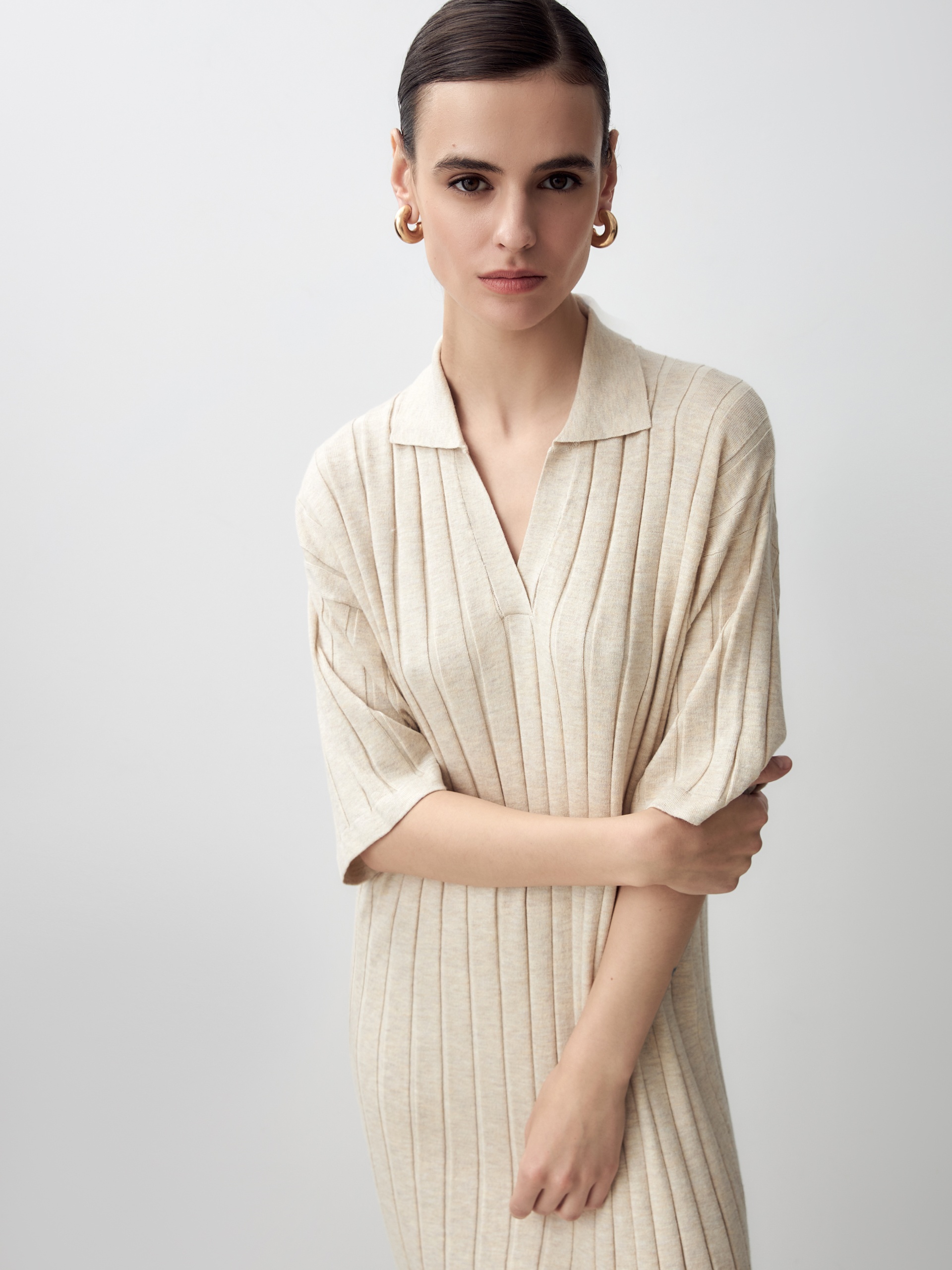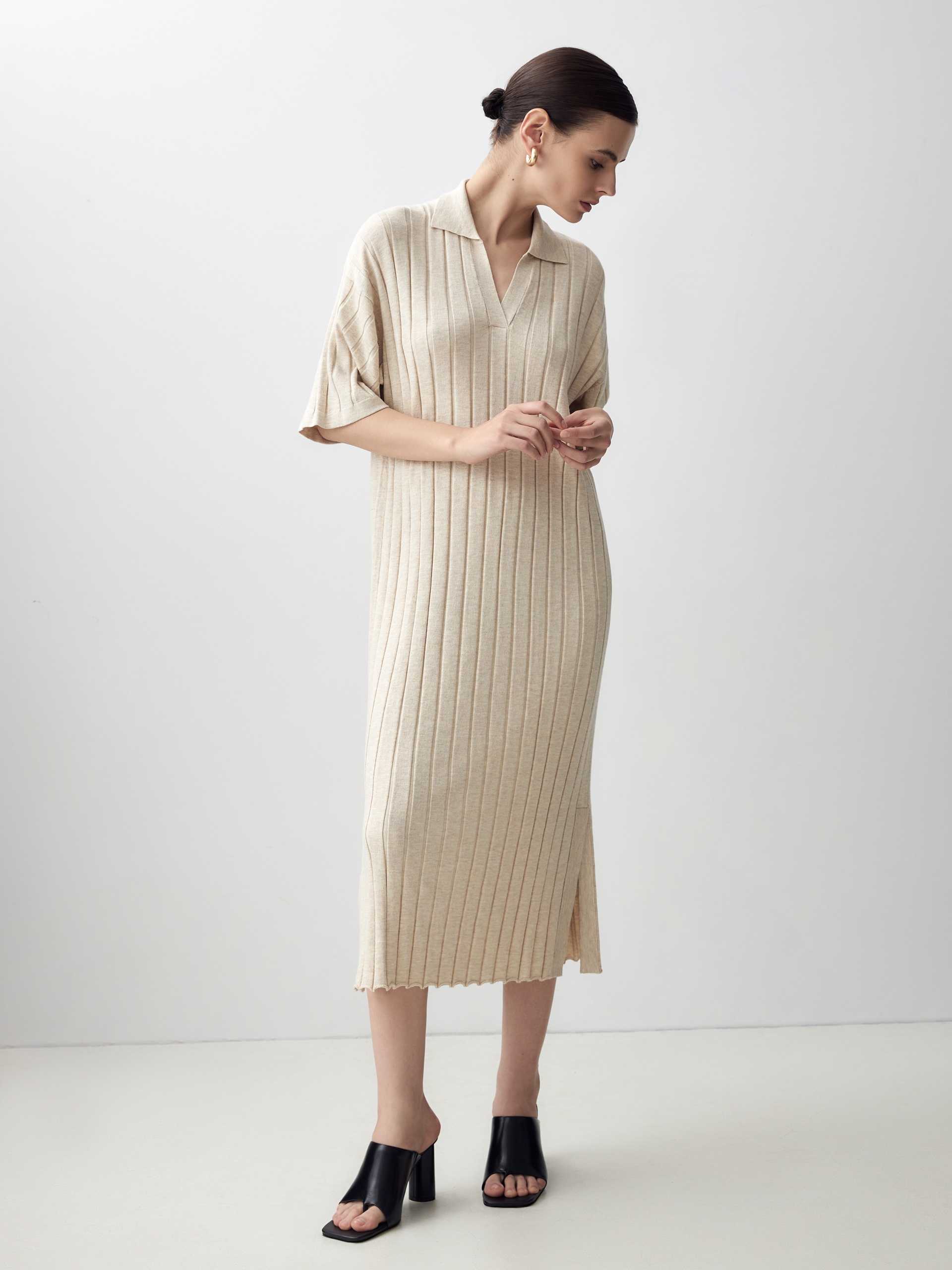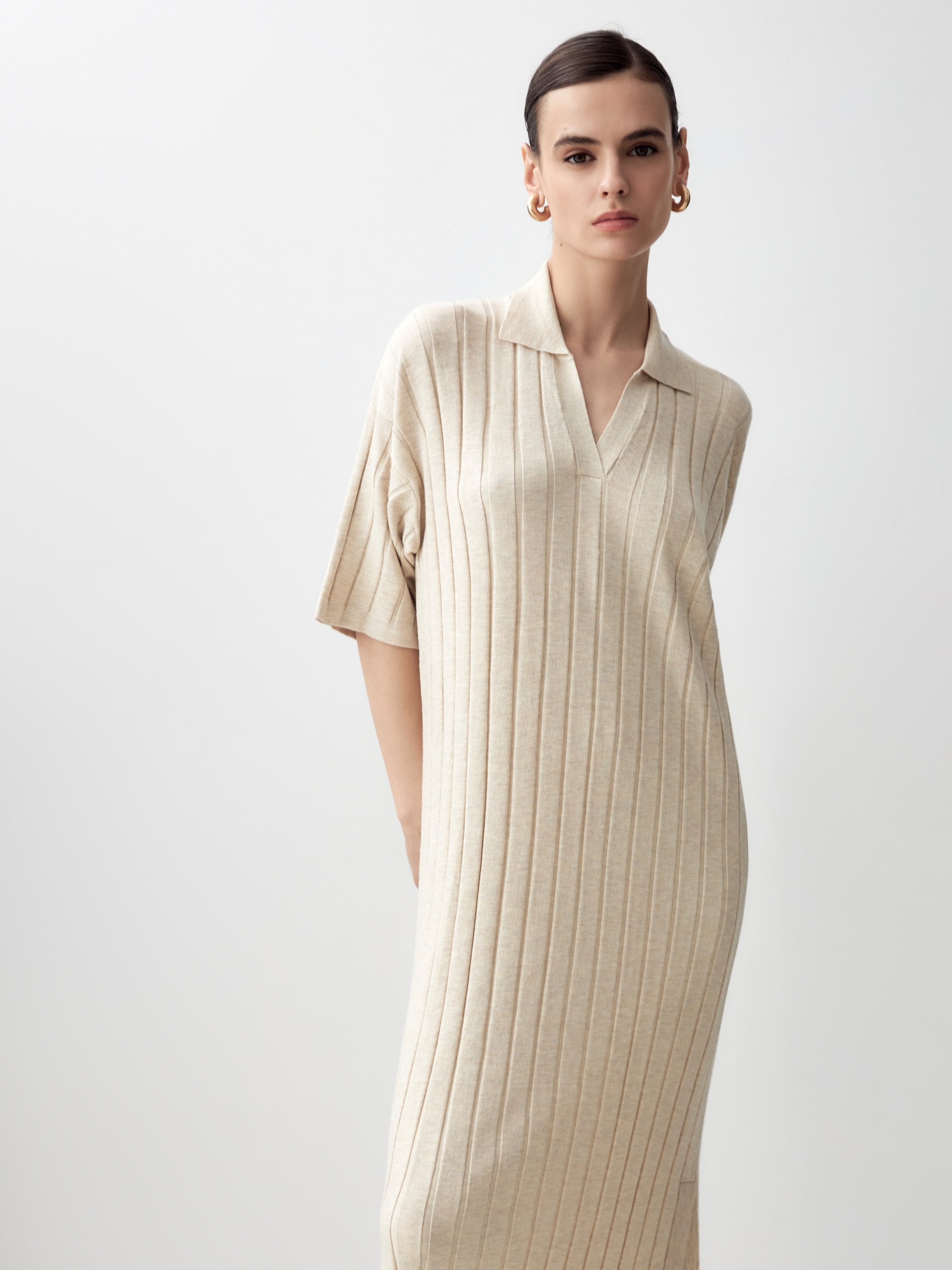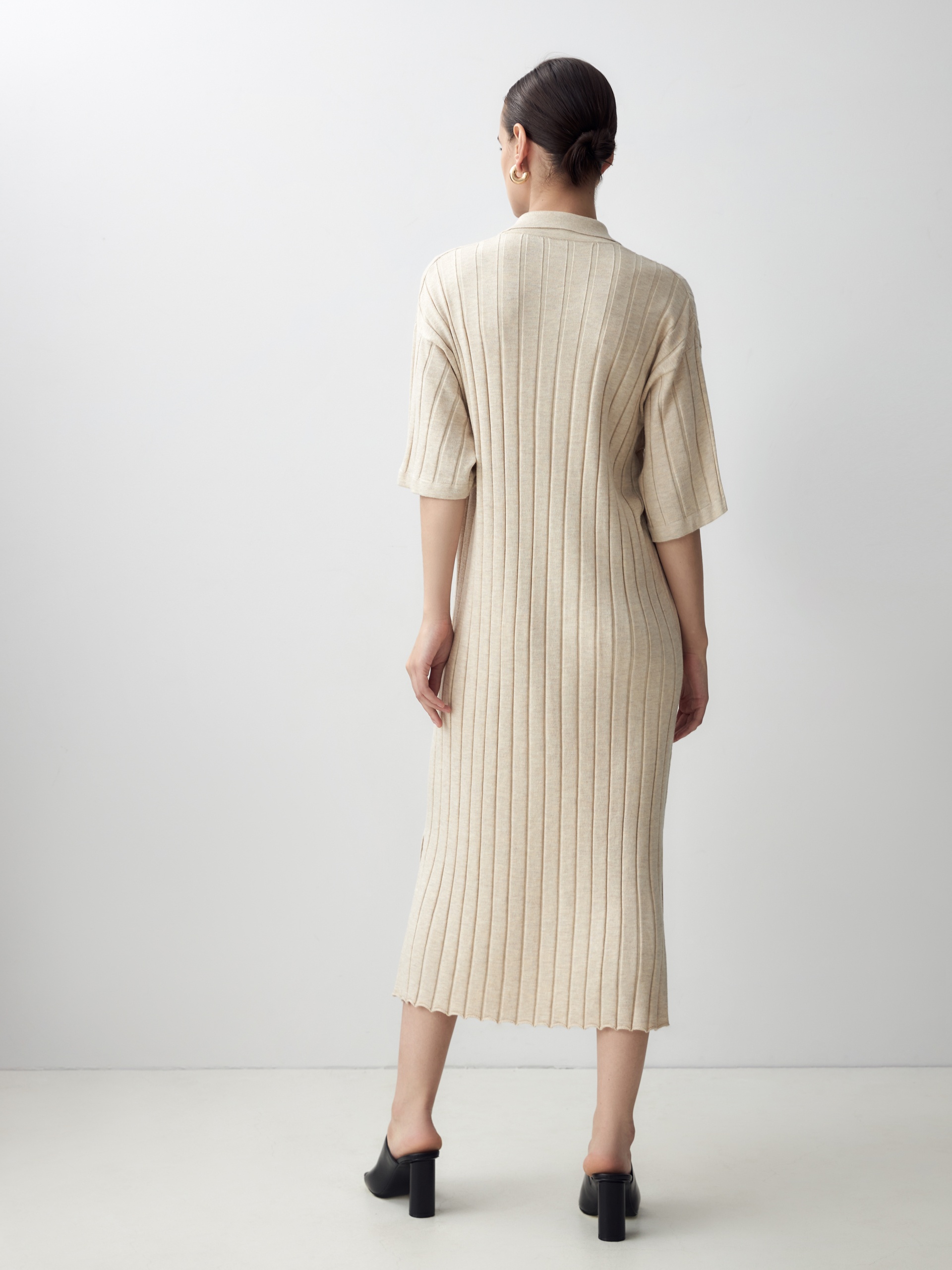 Вязаное платье с воротником и застежкой-поло в широкий рубчик станет достойным аналогом платью-поло из пике благодаря преобладающей вискозе в составе пряжи, которая придаст ощущение легкой прохлады и шелковистости к коже.