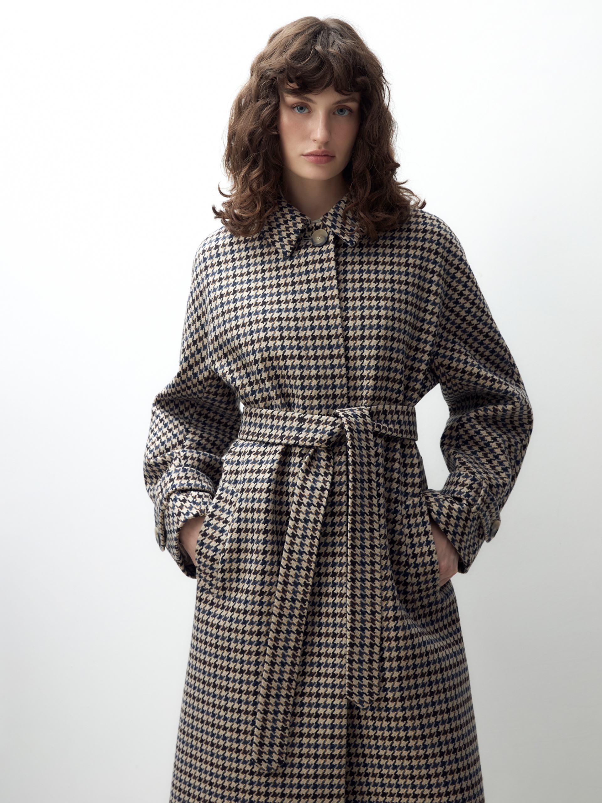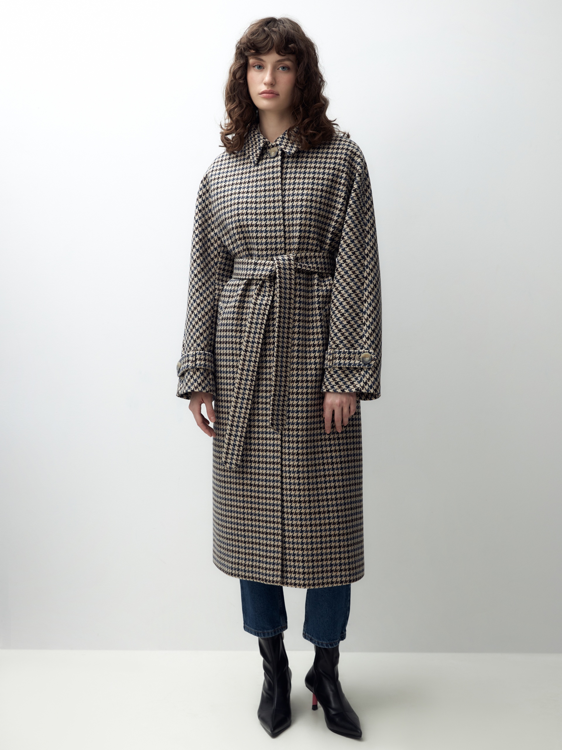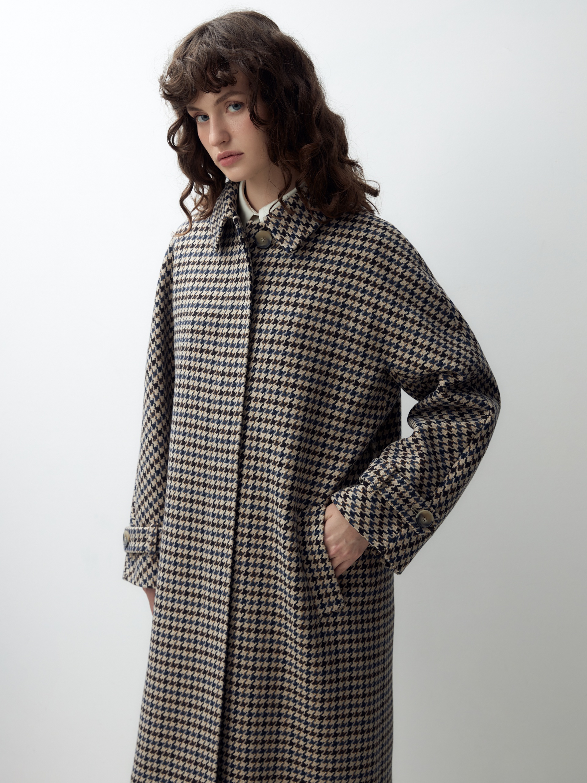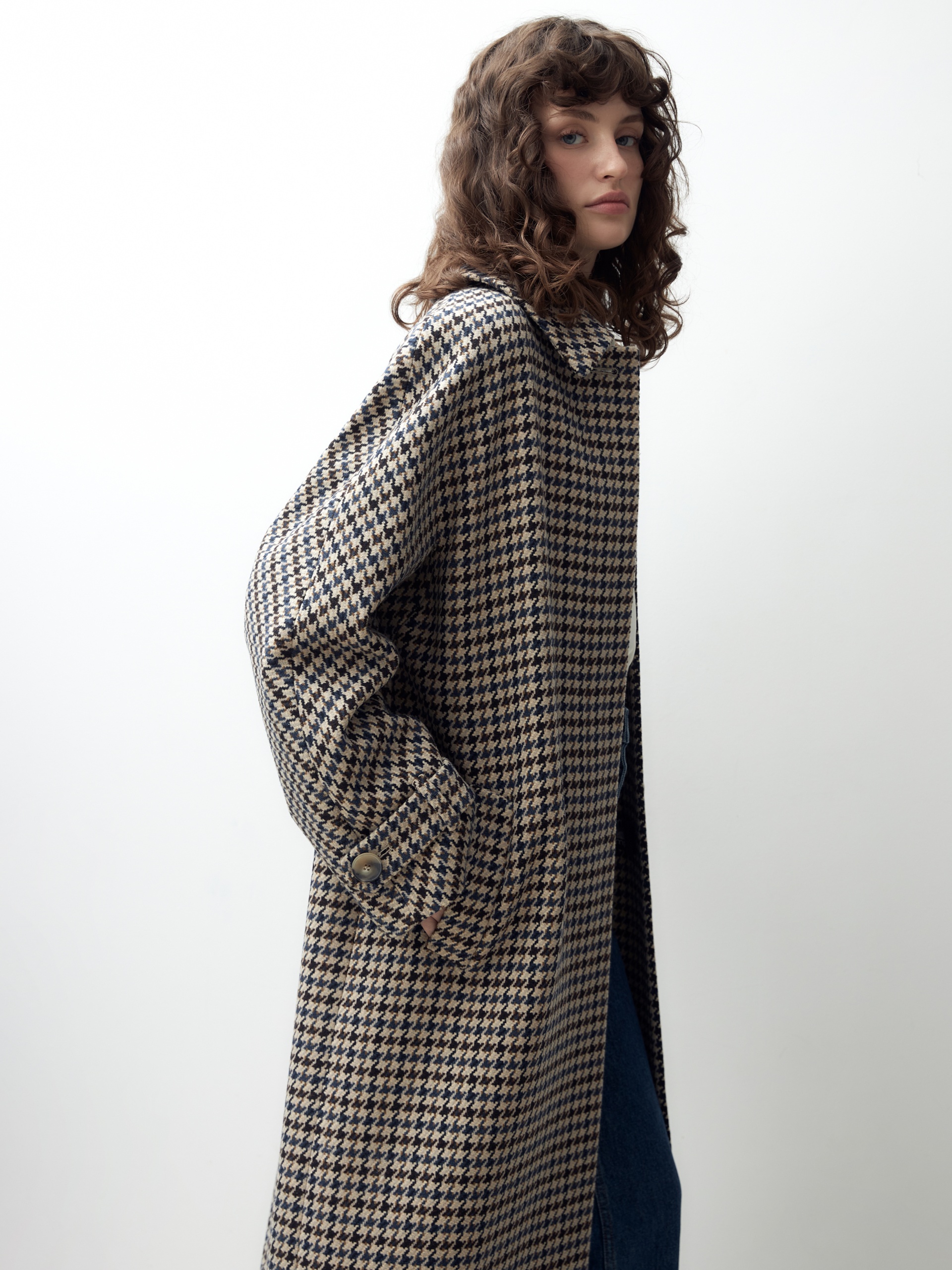 Пальто прямого силуэта из шерстяной пальтовой ткани в уникальном бежево-чернильном крупном пье-де-пуле. Пальто имеет стильный стояче-отложной воротник и лаконичную супатную застежку с одной крупной пуговицей. Рукав кимоно не стесняет движений, позволяет надевать под пальто даже объемные вещи. Длина пальто до середины икры, для комфорта шага в среднем шве спинки сделана высокая шлица. Пальто декорировано широкой отделочной строчкой, имеет глубокие и вместительные карманы-листочки и декоративную складку на спинке. Образ дополняет съемный пояс из основной ткани. Выполнено с использованием запатентованных технологий: высокотехнологичная мембрана RaftPro надежно защищает от ветра, холода и перепада температур. Произведено в Санкт-Петербурге.