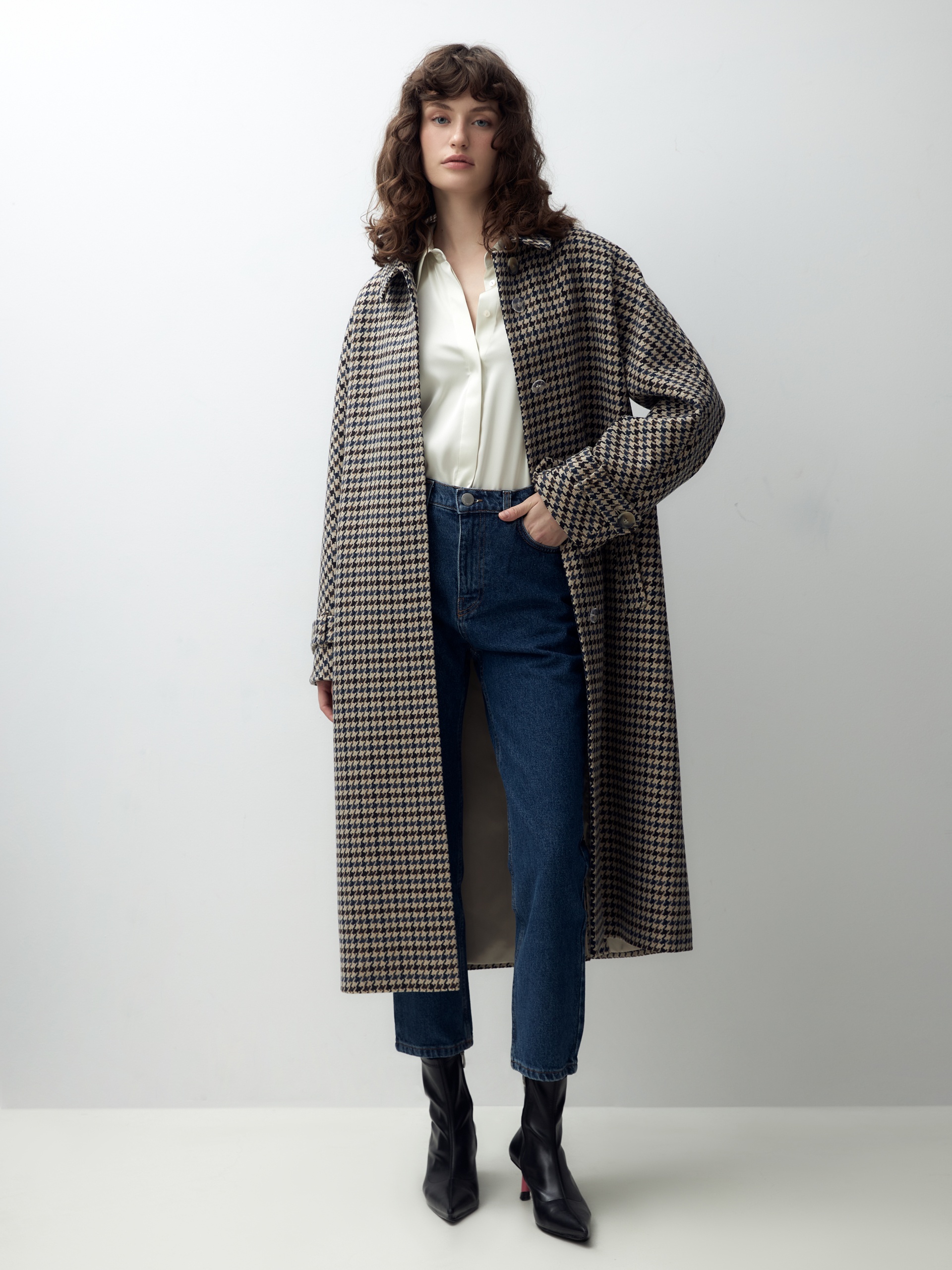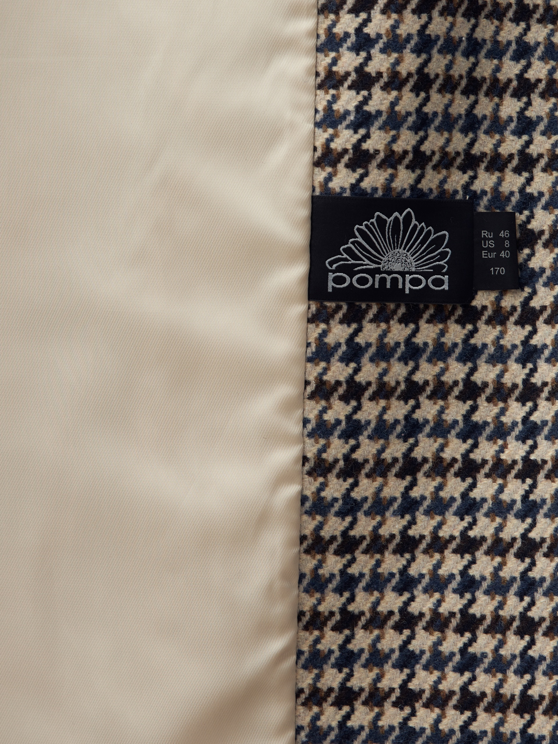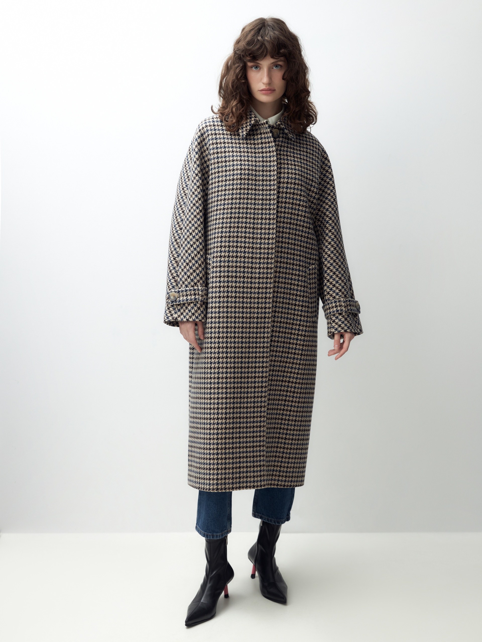 Пальто прямого силуэта из шерстяной пальтовой ткани в уникальном бежево-чернильном крупном пье-де-пуле. Пальто имеет стильный стояче-отложной воротник и лаконичную супатную застежку с одной крупной пуговицей. Рукав кимоно не стесняет движений, позволяет надевать под пальто даже объемные вещи. Длина пальто до середины икры, для комфорта шага в среднем шве спинки сделана высокая шлица. Пальто декорировано широкой отделочной строчкой, имеет глубокие и вместительные карманы-листочки и декоративную складку на спинке. Образ дополняет съемный пояс из основной ткани. Выполнено с использованием запатентованных технологий: высокотехнологичная мембрана RaftPro надежно защищает от ветра, холода и перепада температур. Произведено в Санкт-Петербурге.