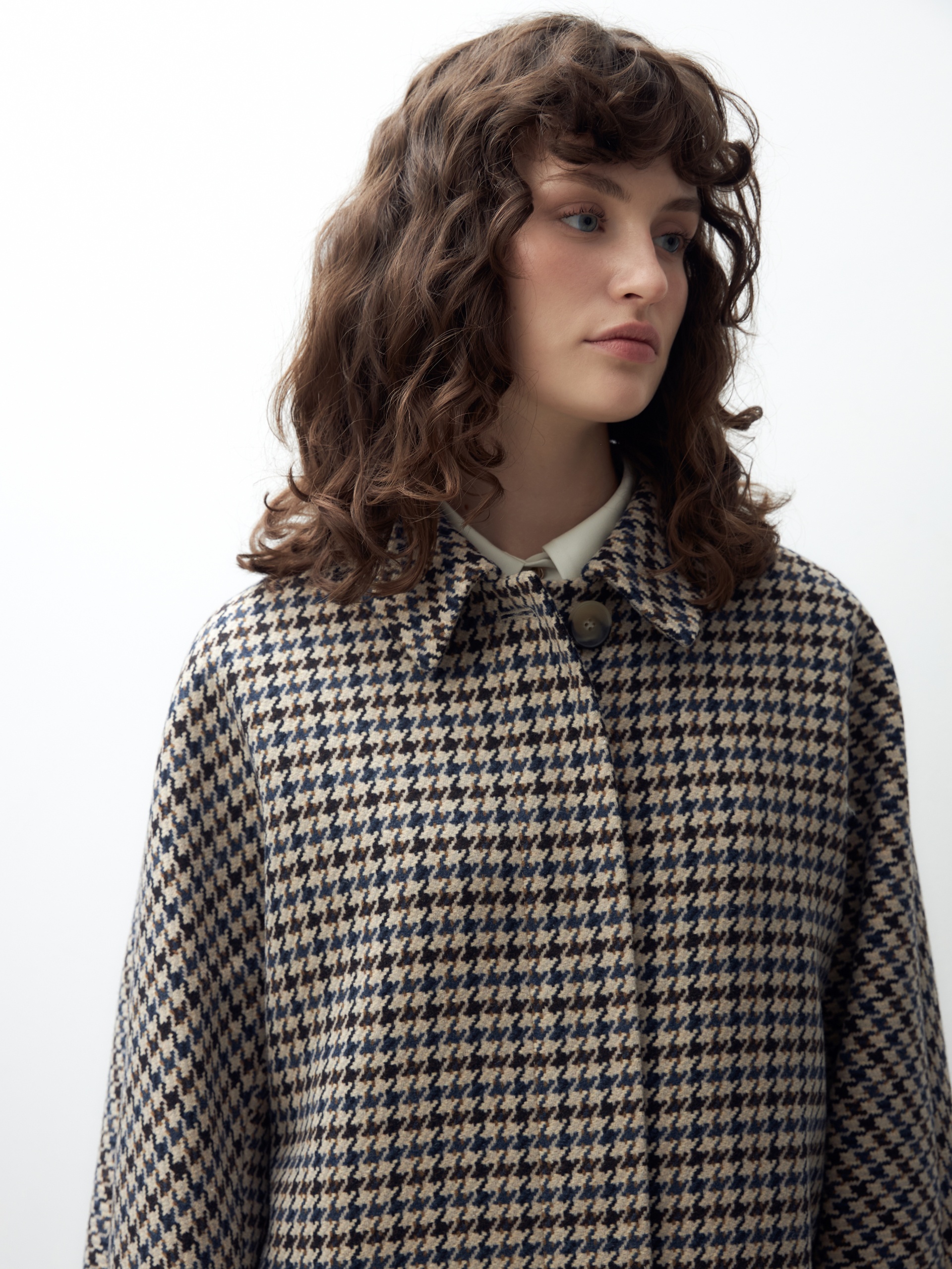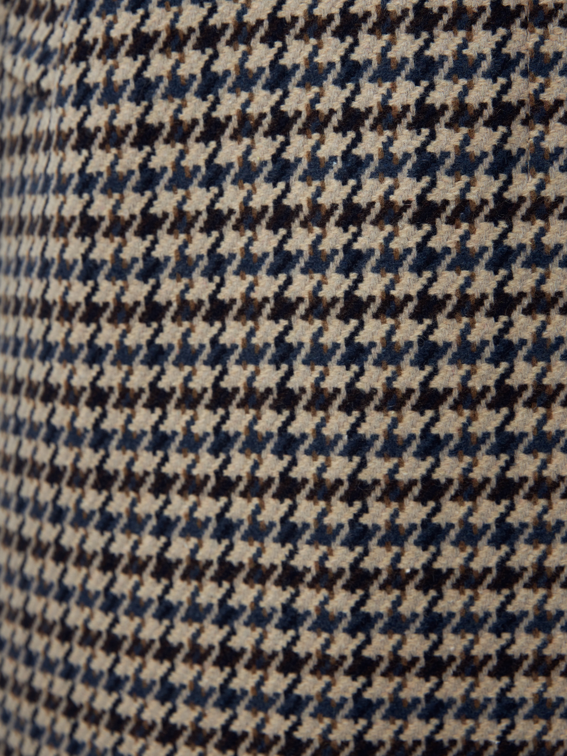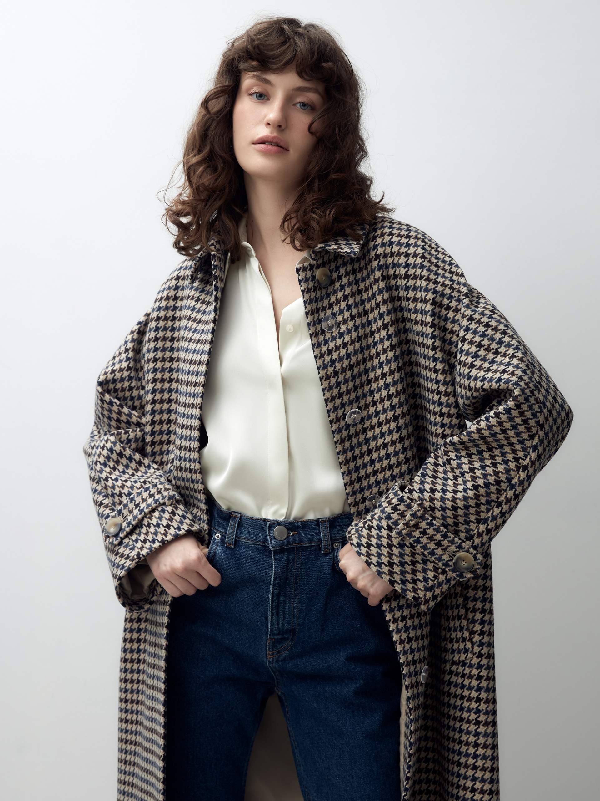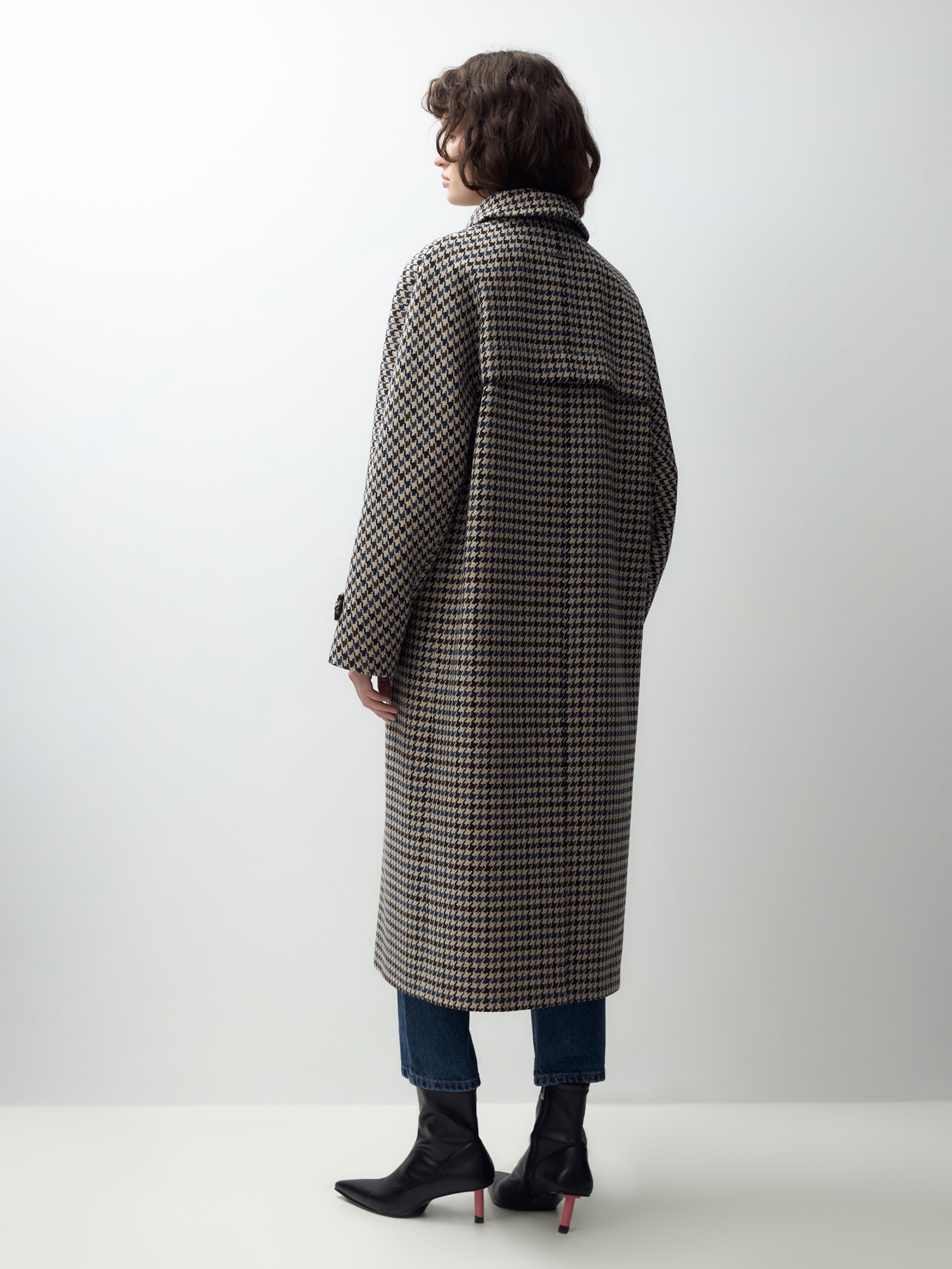 Пальто прямого силуэта из шерстяной пальтовой ткани в уникальном бежево-чернильном крупном пье-де-пуле. Пальто имеет стильный стояче-отложной воротник и лаконичную супатную застежку с одной крупной пуговицей. Рукав кимоно не стесняет движений, позволяет надевать под пальто даже объемные вещи. Длина пальто до середины икры, для комфорта шага в среднем шве спинки сделана высокая шлица. Пальто декорировано широкой отделочной строчкой, имеет глубокие и вместительные карманы-листочки и декоративную складку на спинке. Образ дополняет съемный пояс из основной ткани. Выполнено с использованием запатентованных технологий: высокотехнологичная мембрана RaftPro надежно защищает от ветра, холода и перепада температур. Произведено в Санкт-Петербурге.