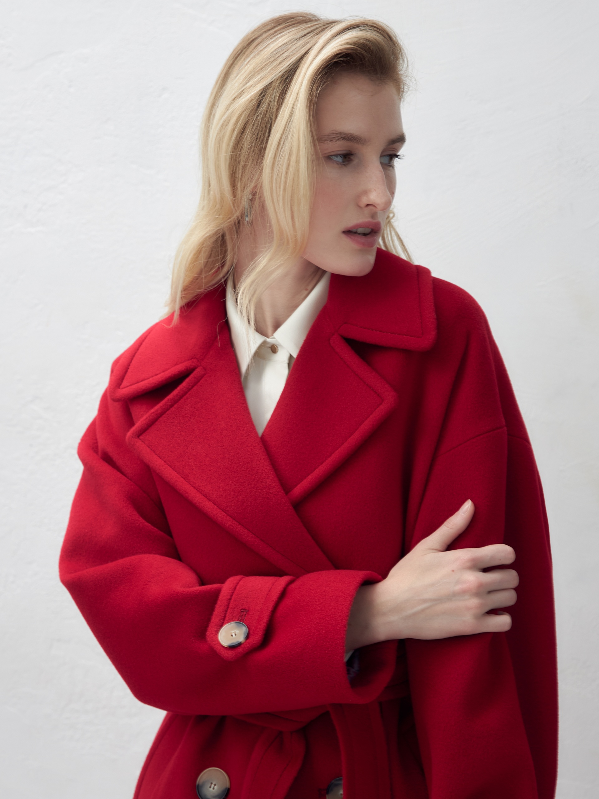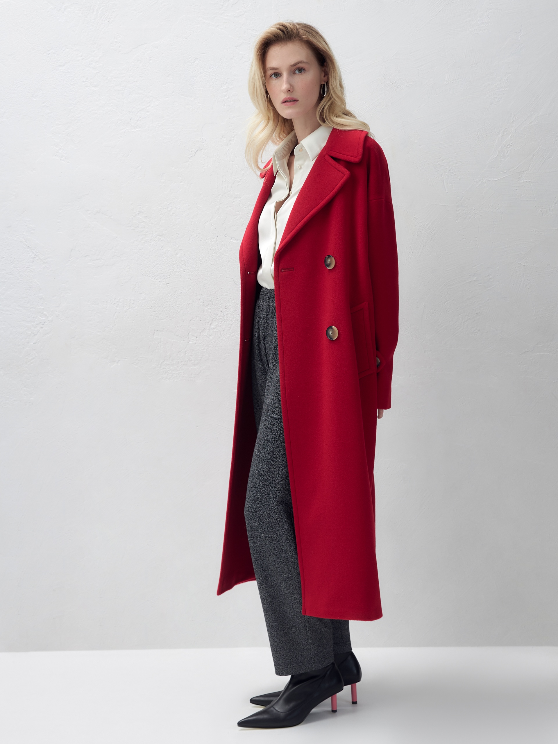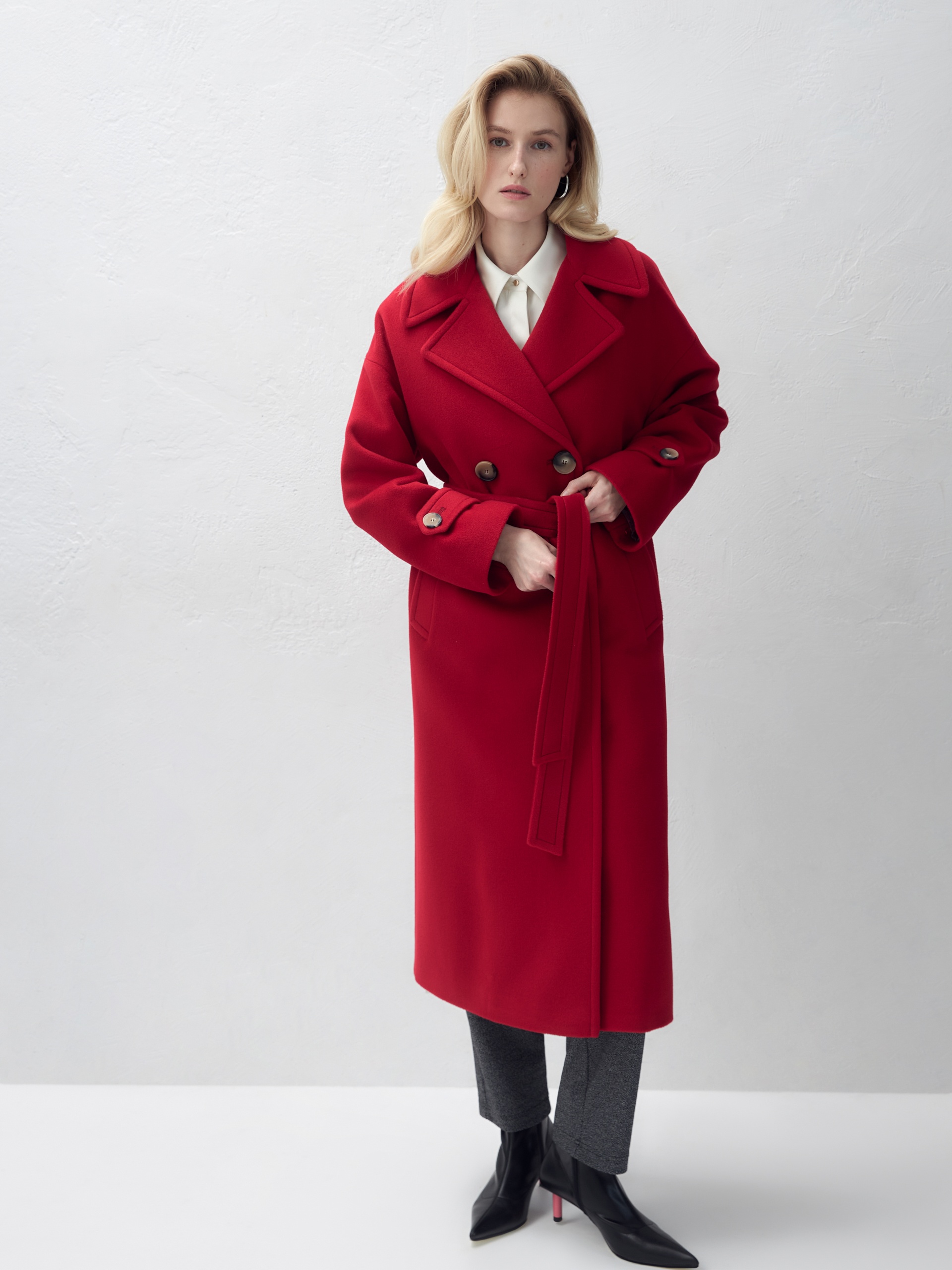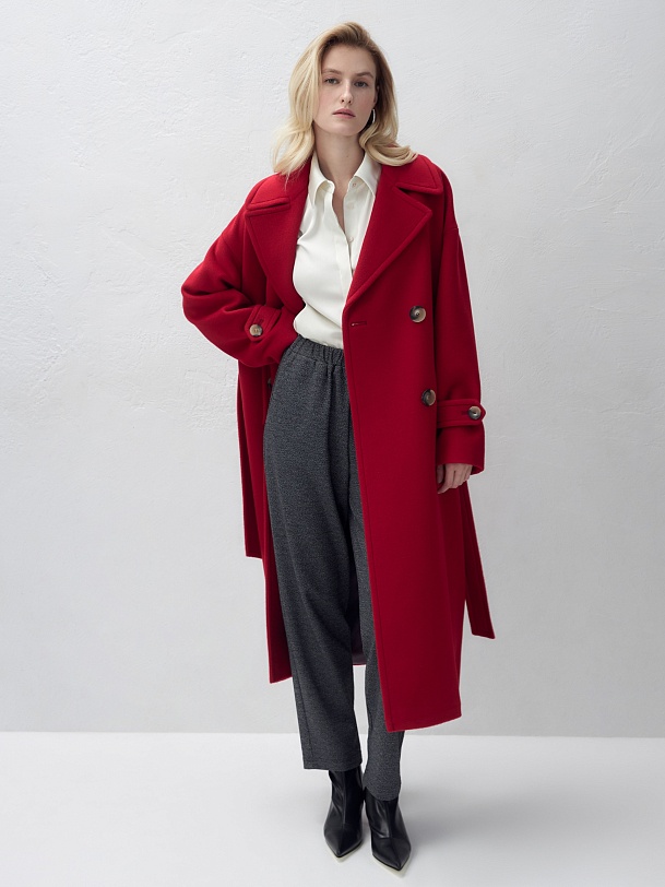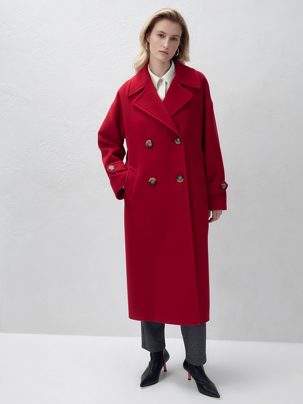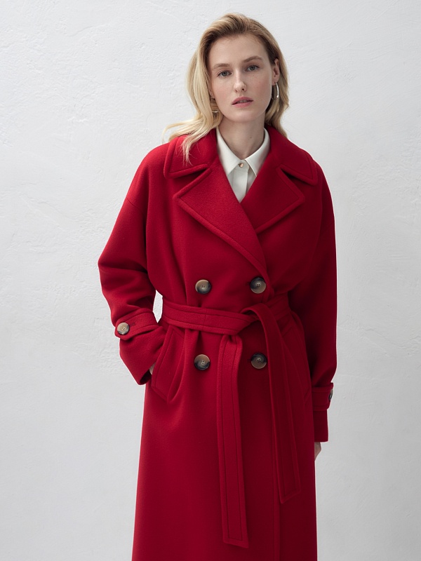 Двубортное пальто прямого силуэта - это всем полюбившаяся классика пальто, представленная в новом современном виденье. Пальто комфортной длины ниже колена, что расширяет возможности для формирования образов. Рукав рубашечный, со спущенной линией плеча, по низу рукава расположены декоративные паты с крупными пуговицами. Горловину пальто обрамляет классический английский воротник. Пальто имеет два глубоких кармана с листочками, декорировано крупными отделочными строчками. Застегивается на два ряда стильных крупных пуговиц. Дополняет образ съемный пояс, благодаря которому можно подчеркнуть талию и создать более женственный силуэт. Пальто изготовлено из премиальной пальтовой длинноворсовой ткани с высоким содержанием шерсти в ярком красном цвете. Для надежной защиты от непогоды пальто выполнено с использованием высокотехнологичной мембраны RaftPro. Произведено в Санкт-Петербурге.