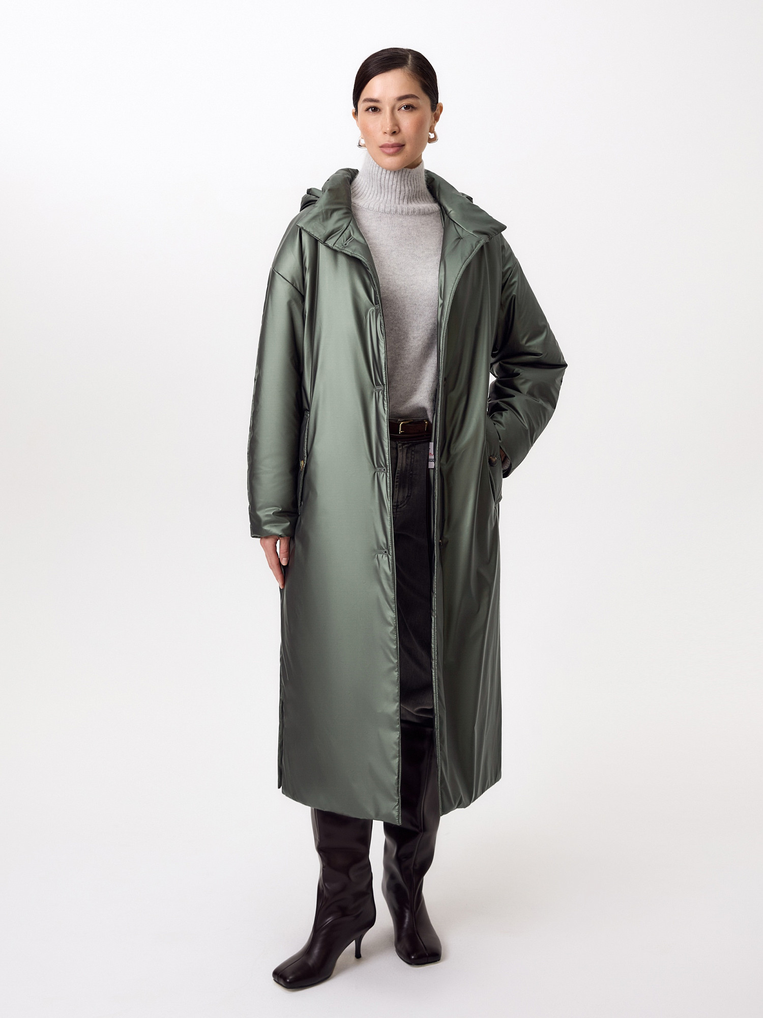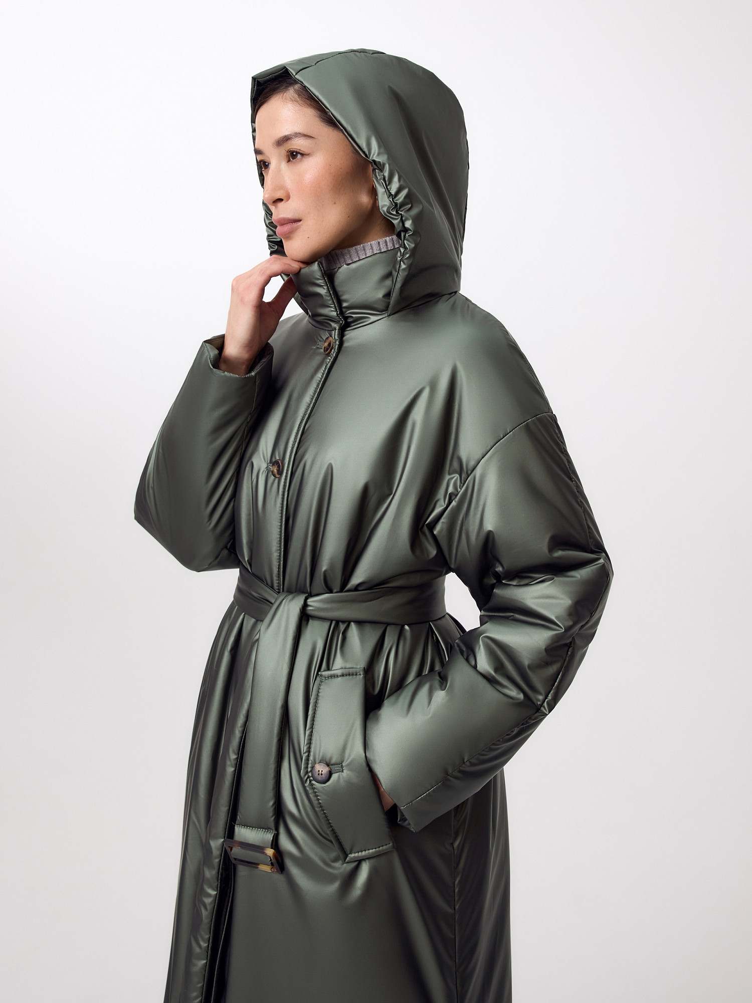 Пальто прямого силуэта из плащевой ткани цвета хаки с водонепроницаемым покрытием с эффектом сатинового блеска. Пальто имеет свободный рубашечный рукав и высокий воротник-стойку с тёплым капюшоном, который создает надёжную защиту от неблагоприятных погодных условий. По бокам пальто располагаются два глубоких кармана с клапанами на пуговицах. Застегивается пальто на ряд некрупных роговых пуговиц, которые идеально выдерживают образ и обращают внимание к деталям. Длина пальто до середины икры, для удобства шага в боковых швах выполнены разрезы с застежкой на пату и пуговицу. Образ дополняет широкий длинный пояс из основной ткани, отделанный черным репсом, на роговой пряжке. А для наилучшей защиты от непогоды пальто выполнено с использованием высокотехнологичной мембраны RaftPro и современного легкого утеплителя. Произведено в Санкт-Петербурге.