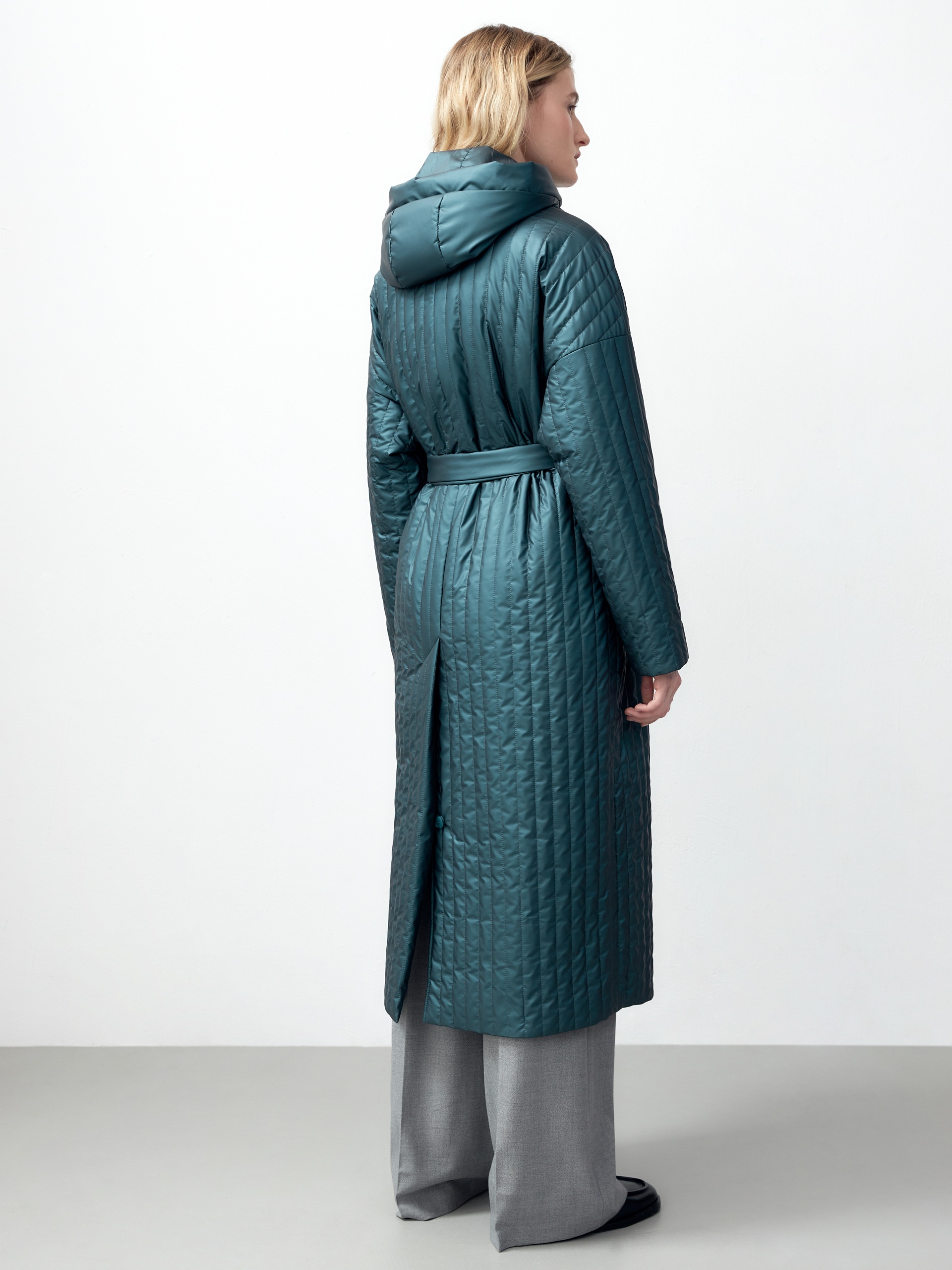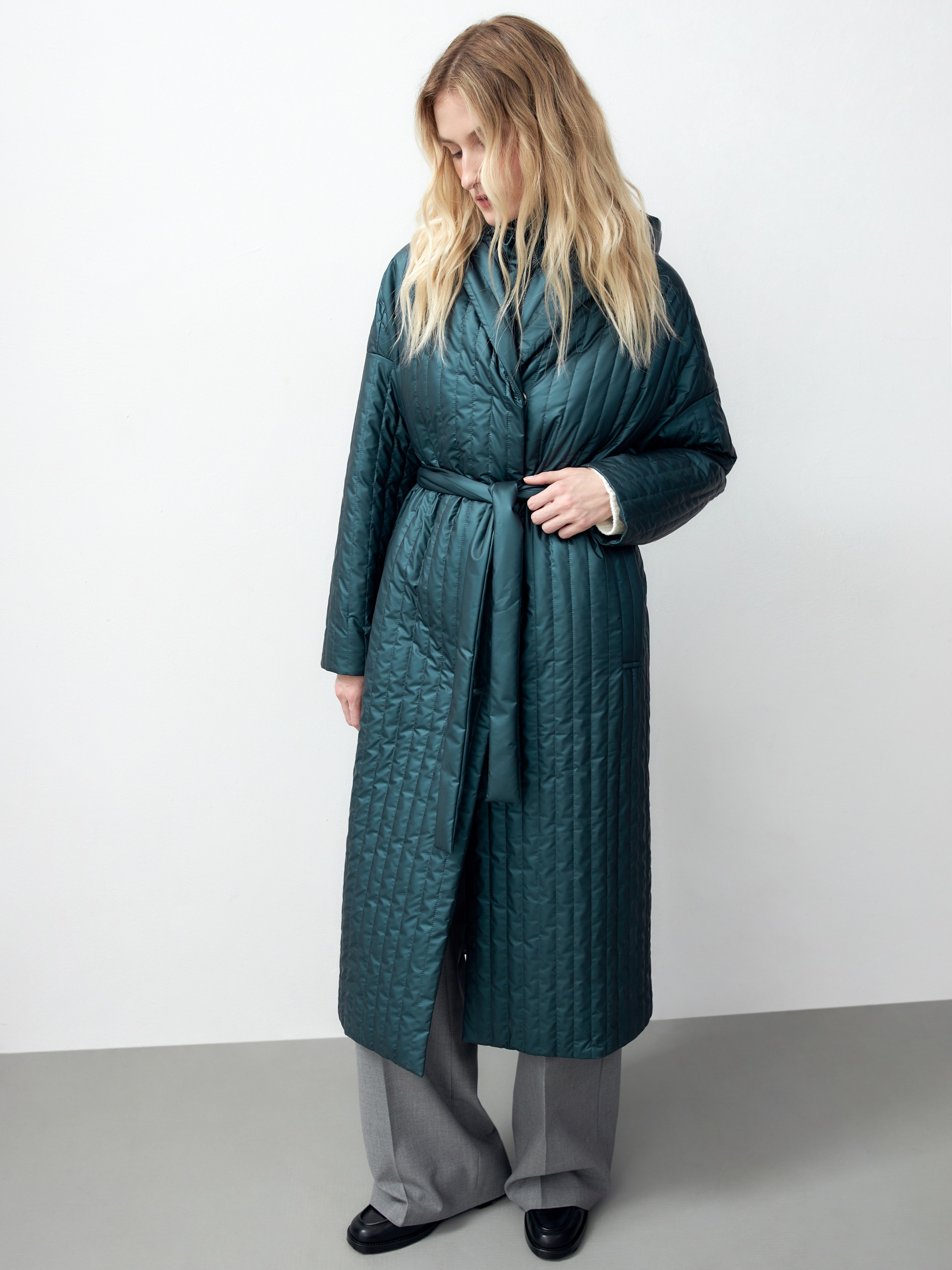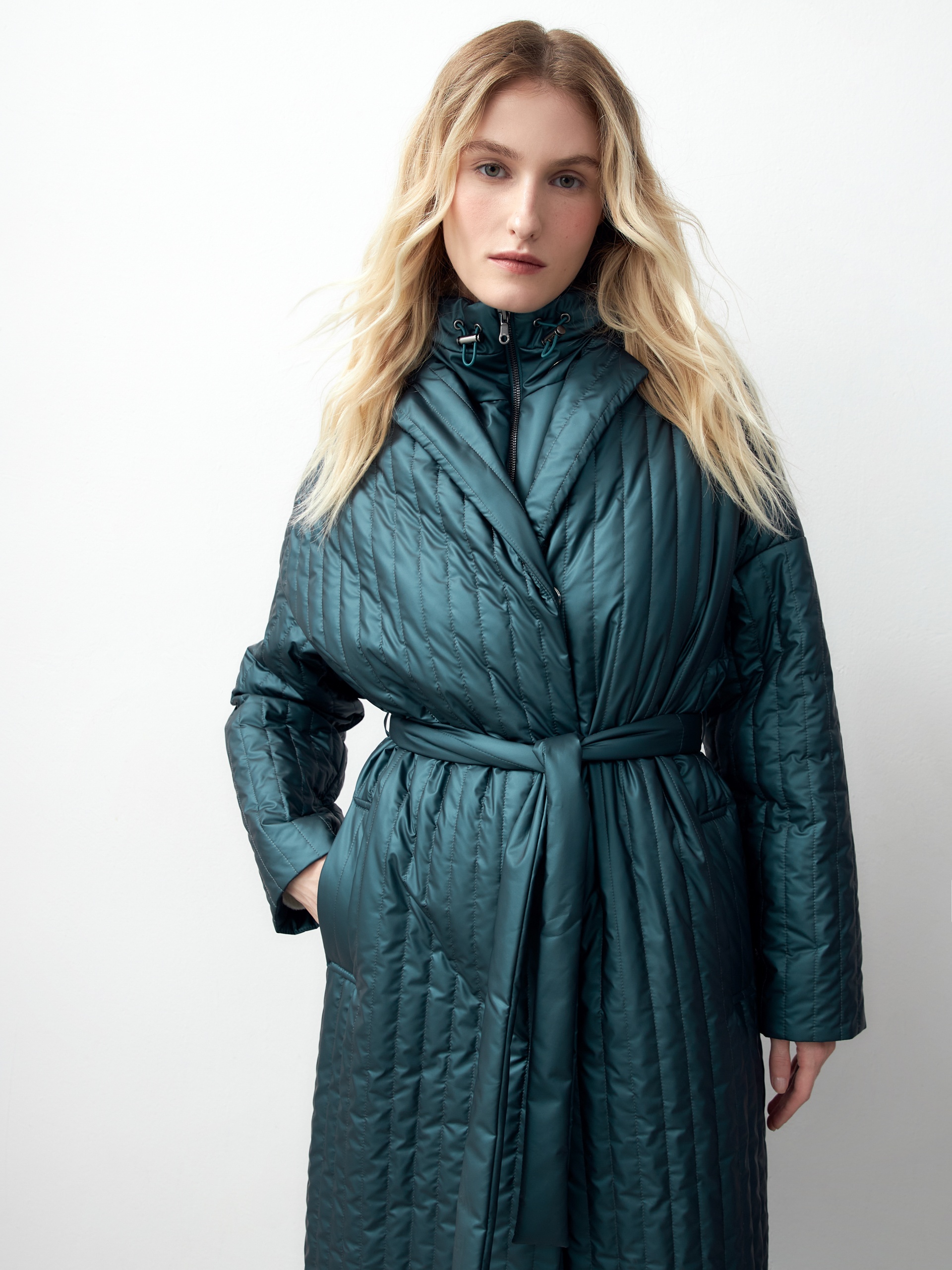 Однобортное пальто прямого силуэта из плащевой стеганой ткани с водонепроницаемым покрытием с эффектом сатинового блеска. Пальто имеет классический английский воротник, два глубоких кармана с листочками, узкий пояс из основной ткани. Пальто выполнено без использования лишних деталей и будет актуальной вещью в Вашем гардеробе еще несколько лет. Роскошный изумрудный цвет, качество ткани и идеальная посадка привлекут внимание многих. Дополнительным функциональным и модным аксессуаром служит съемный капюшон из основной ткани. А для наилучшей защиты от непогоды пальто выполнено с использованием высокотехнологичной мембраны RaftPro и современного легкого утеплителя. Произведено в Санкт-Петербурге.