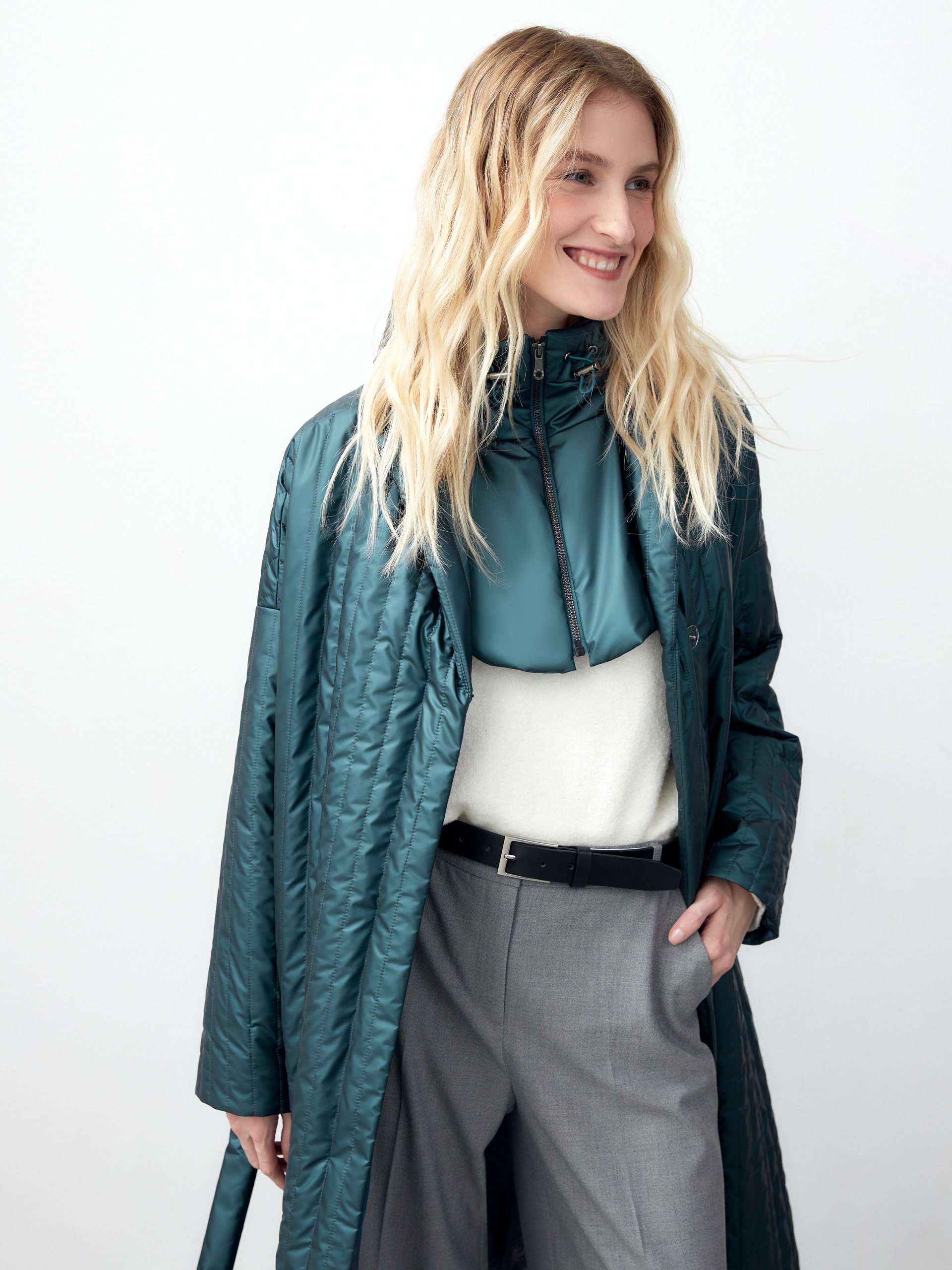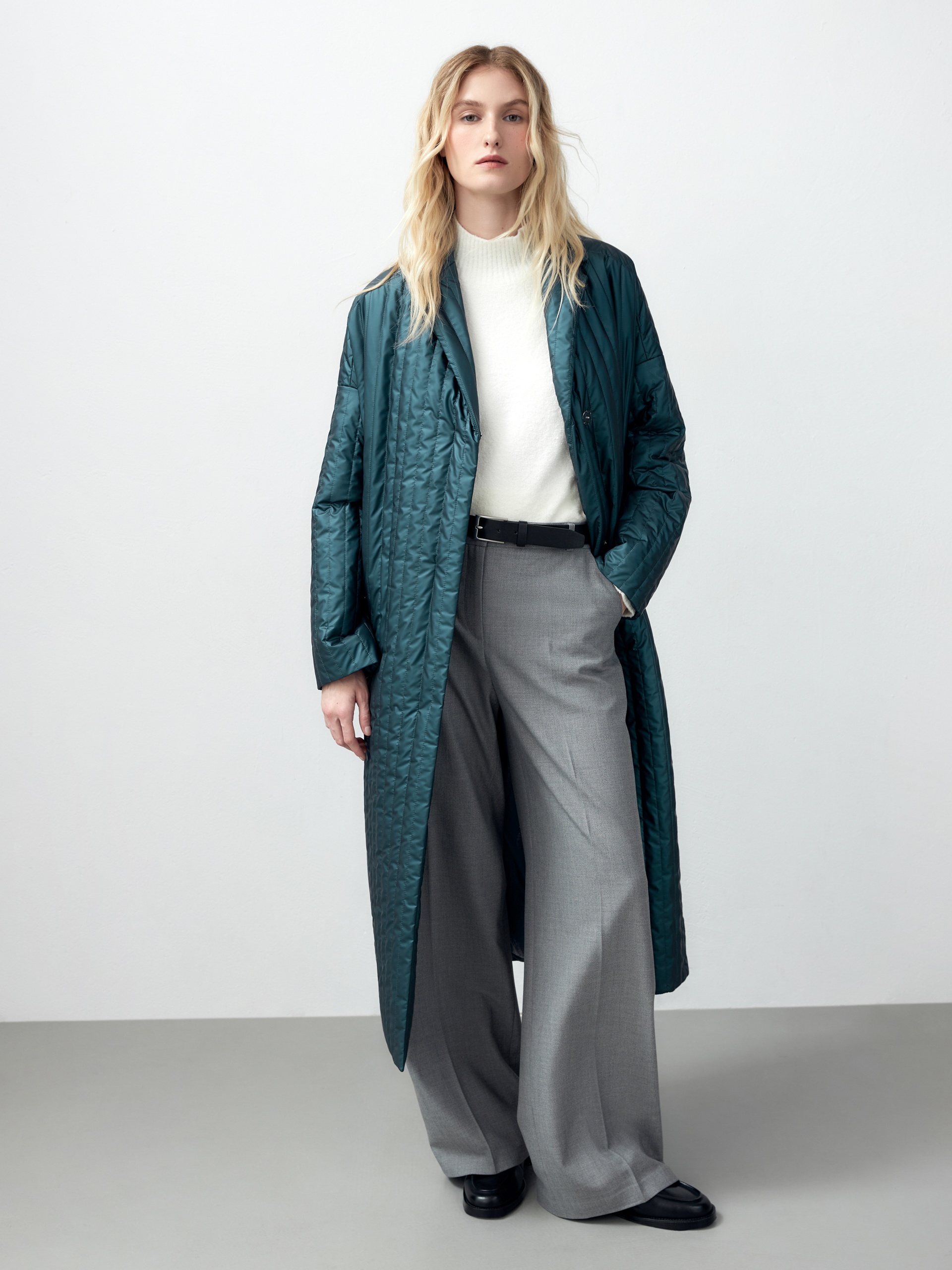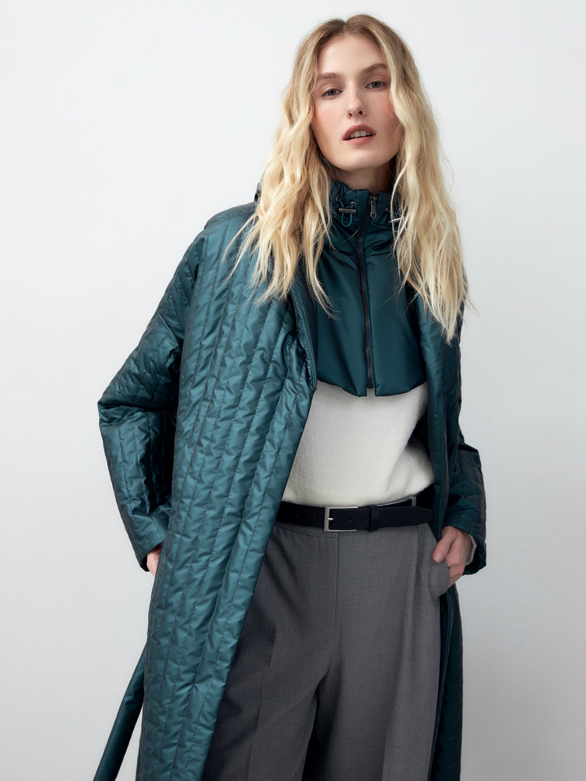 Однобортное пальто прямого силуэта из плащевой стеганой ткани с водонепроницаемым покрытием с эффектом сатинового блеска. Пальто имеет классический английский воротник, два глубоких кармана с листочками, узкий пояс из основной ткани. Пальто выполнено без использования лишних деталей и будет актуальной вещью в Вашем гардеробе еще несколько лет. Роскошный изумрудный цвет, качество ткани и идеальная посадка привлекут внимание многих. Дополнительным функциональным и модным аксессуаром служит съемный капюшон из основной ткани. А для наилучшей защиты от непогоды пальто выполнено с использованием высокотехнологичной мембраны RaftPro и современного легкого утеплителя. Произведено в Санкт-Петербурге.