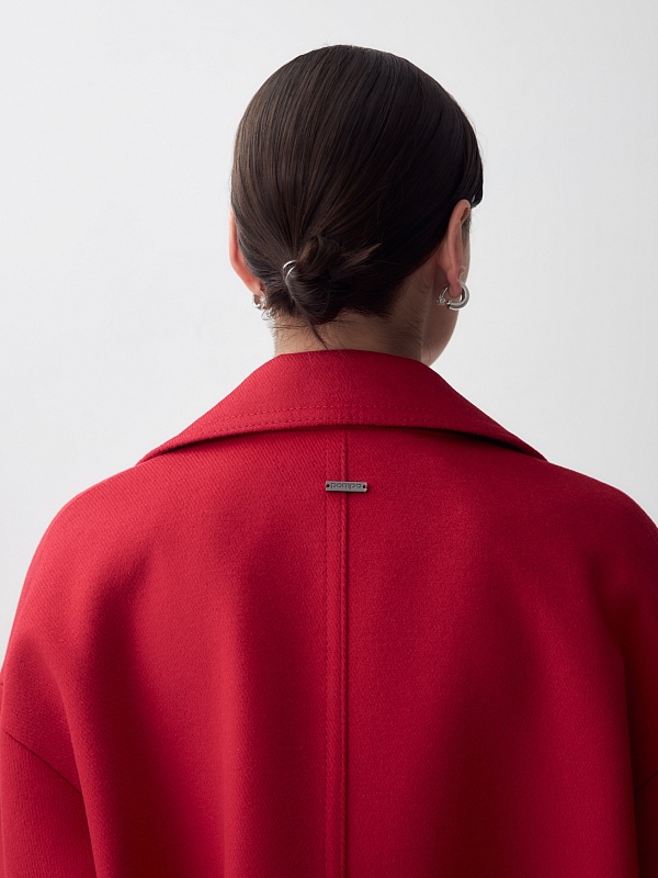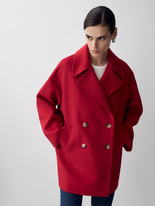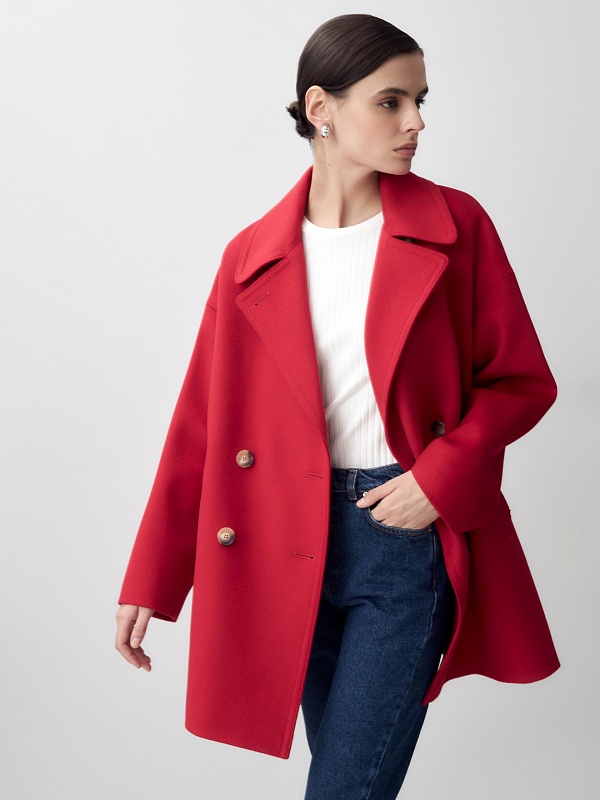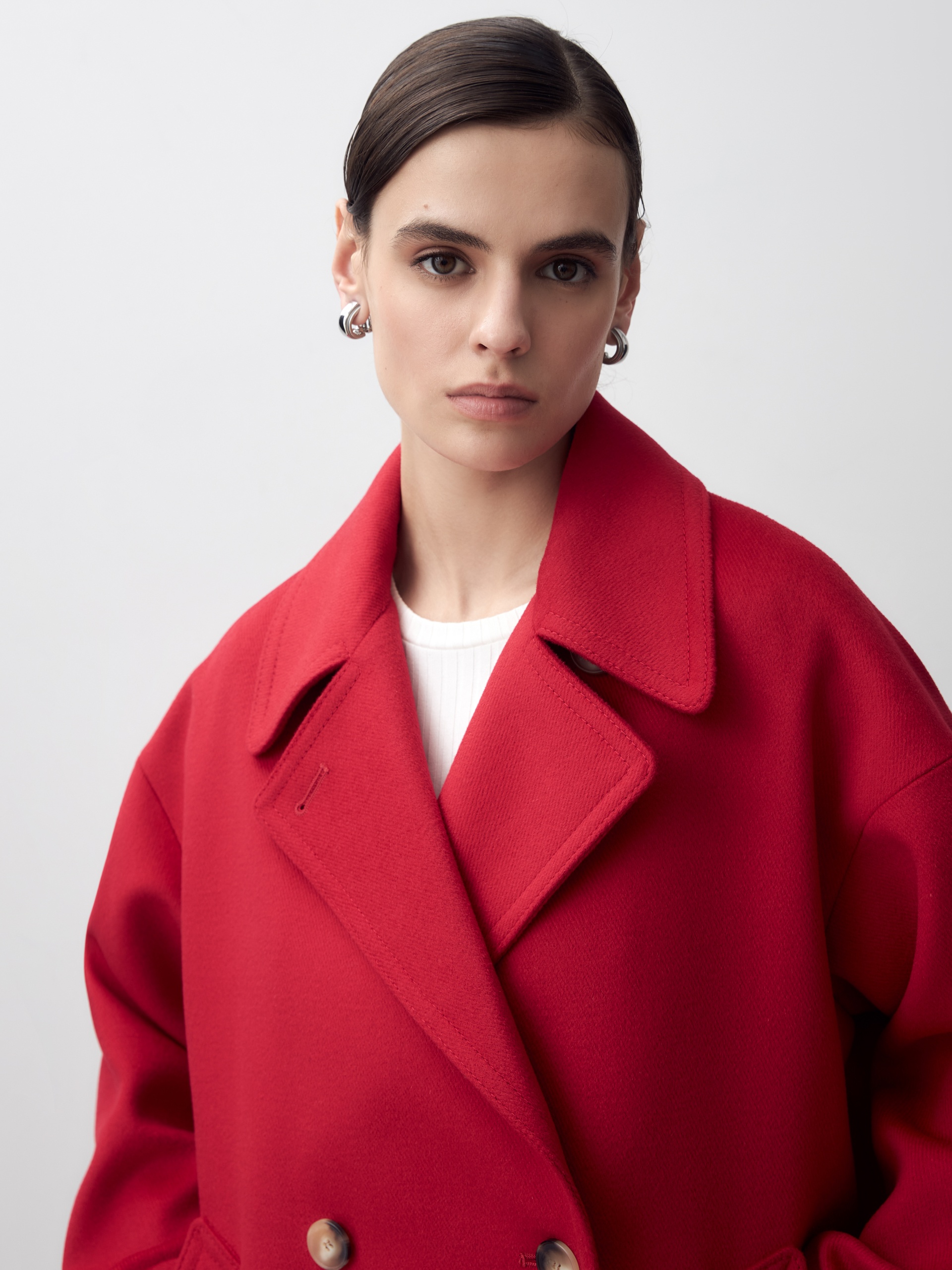 Двубортное полупальто из премиальной пальтовой ткани с эффектом диагональ в роскошном красном цвете. Это полупальто с минимум деталей: комфортный рубашечный рукав, не стесняющий движений, шировкий английский воротник, глубокие карманы с листочками. Пальто декорировано отделочными строчками. Застегивается на два ряда стильных пуговиц, имеет универсальную длину до середины бедра. Для наилучшей защиты от непогоды пальто выполнено с использованием высокотехнологичной мембраны RaftPro. Произведено в Санкт-Петербурге.