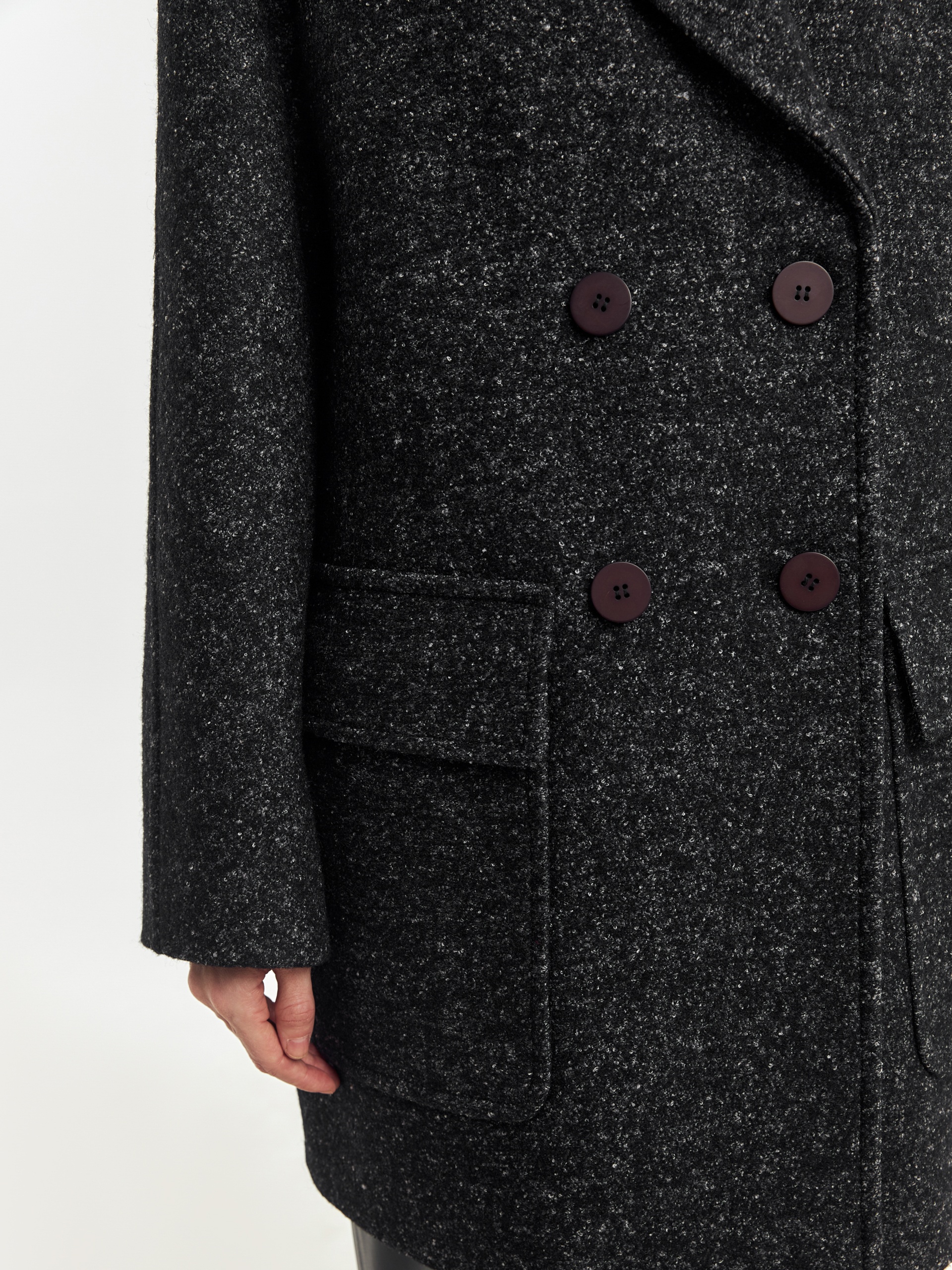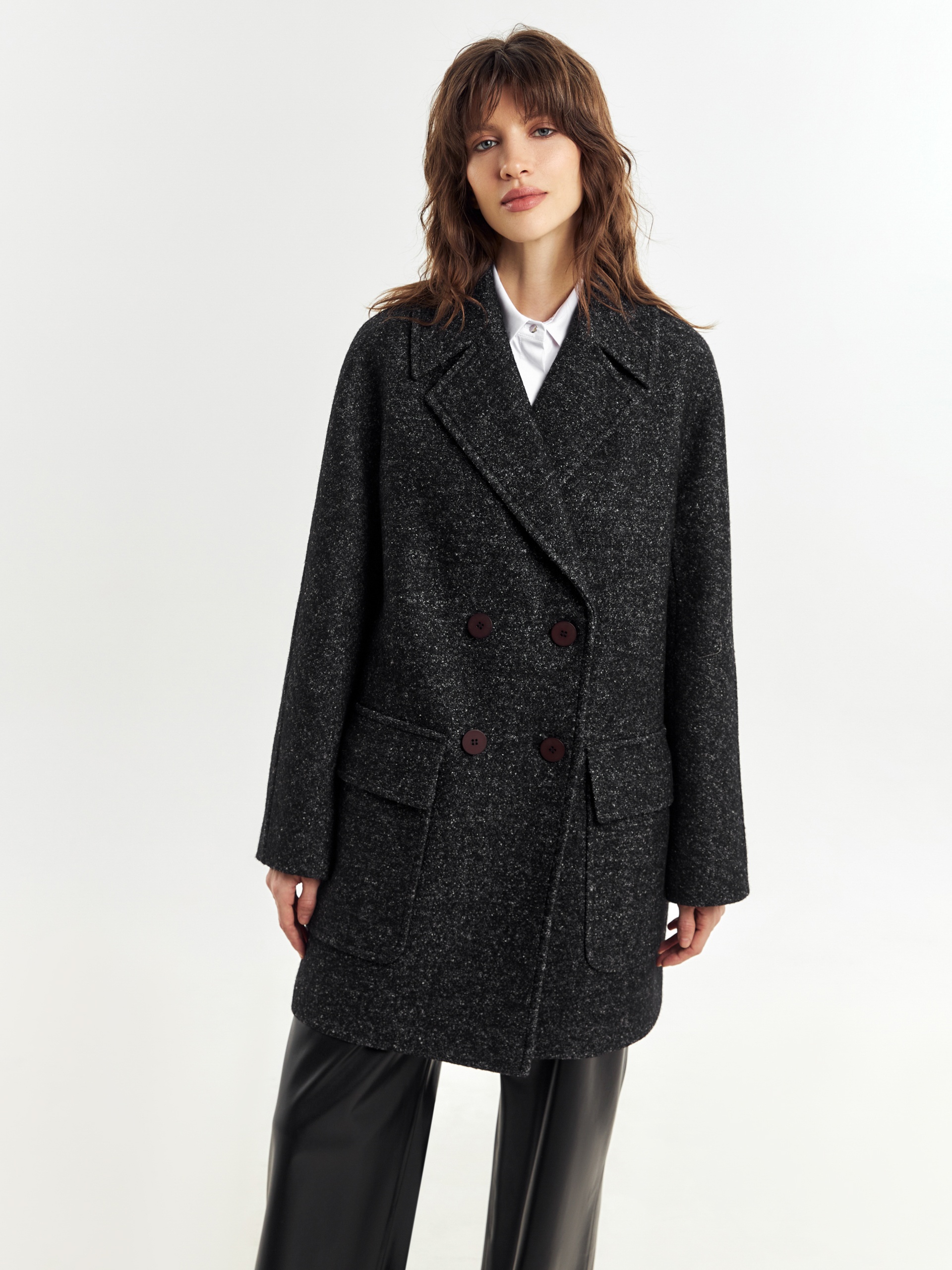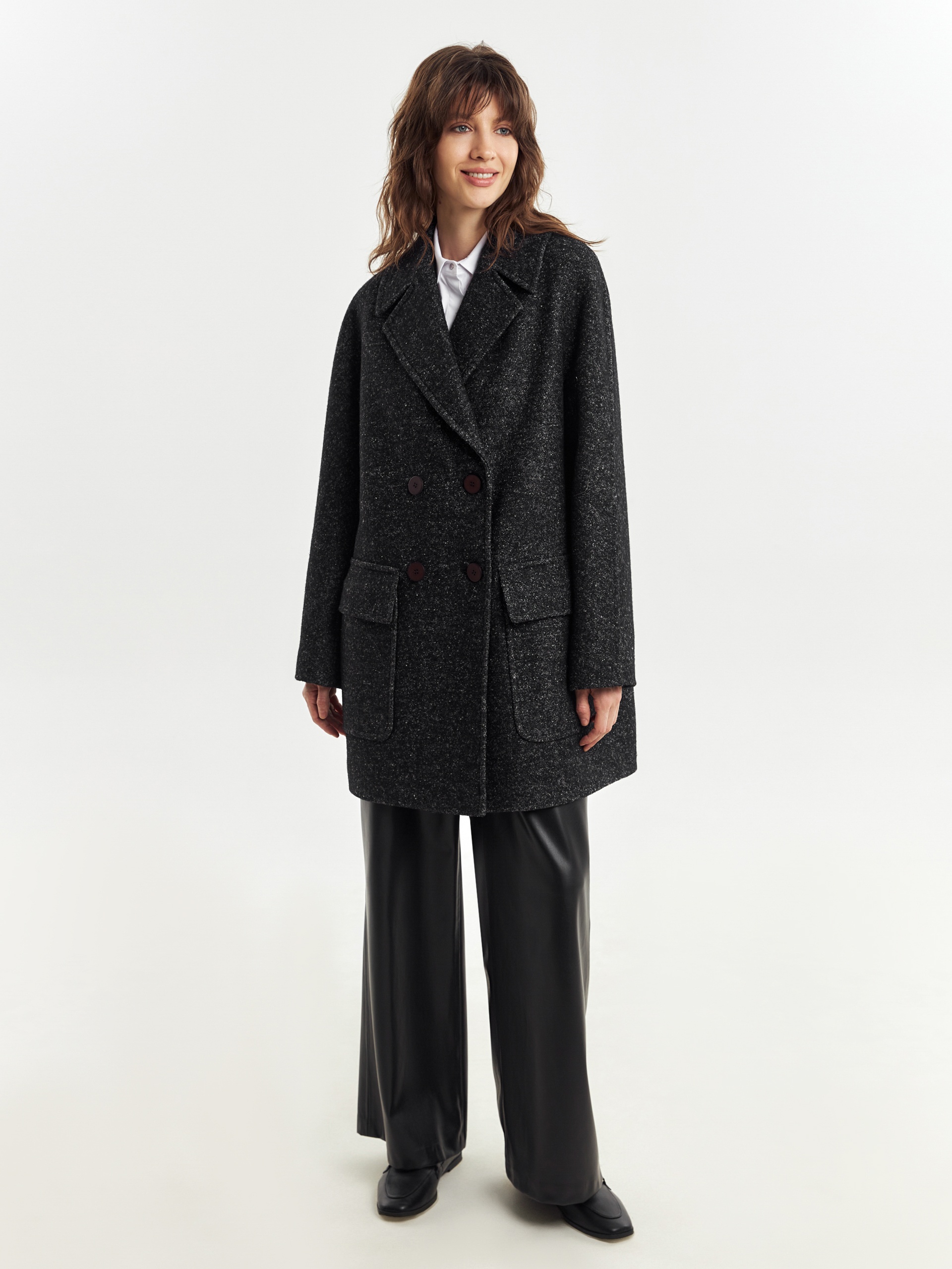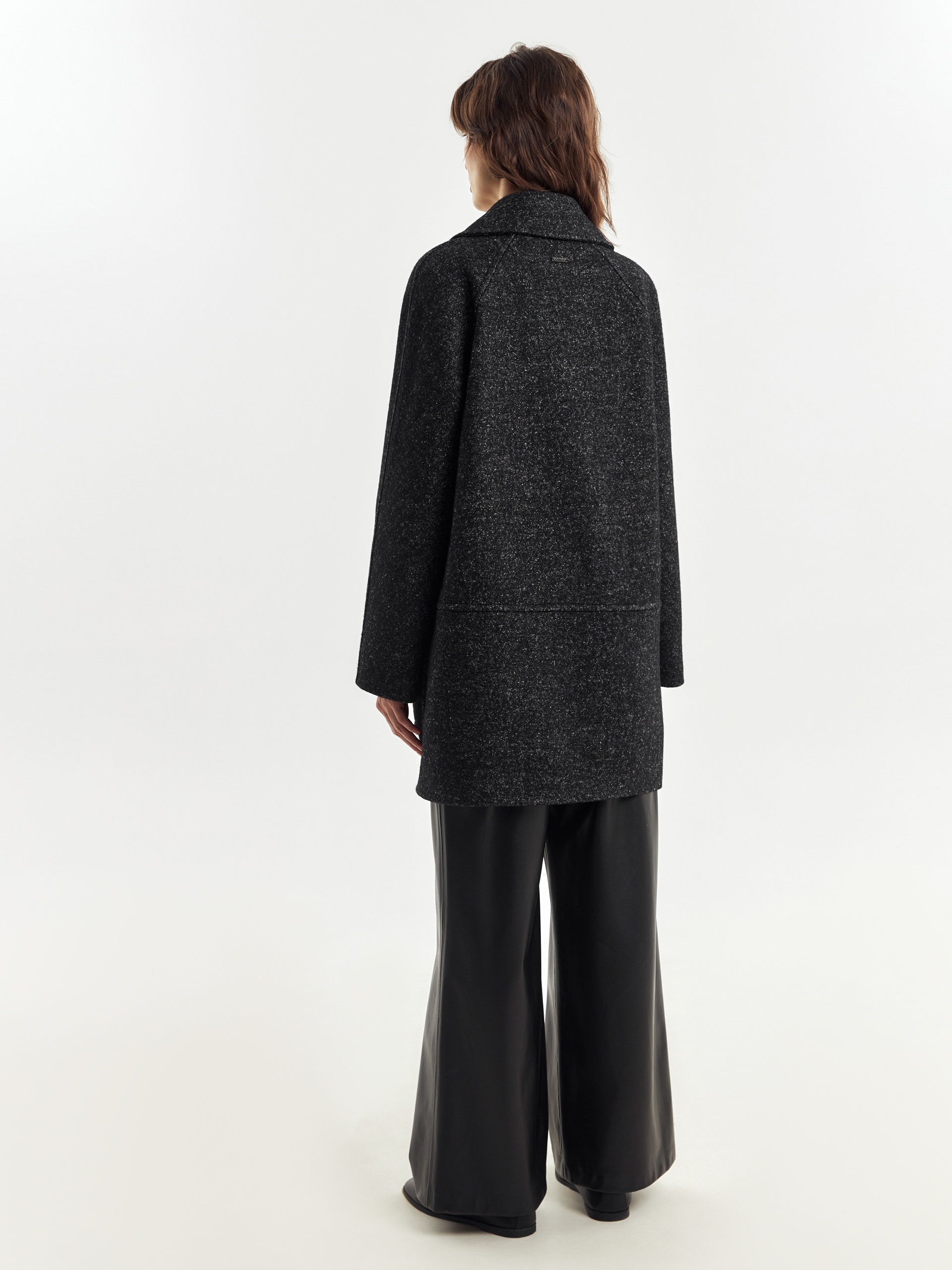 Двубортное укороченное пальто силуэта "кокон" из пальтовой ткань с эффектом "вареная шерсть" в темно-сером меланжевом оттенке. Полупальто универсальной длины выше колена, с широким английским воротником и комфортным рукавом уникальной комбинированной конструкции: цельнокроенный спереди и реглан на спинке. Функциональным декоративным элементом служат большие накладные карманы с клапанами. Остроты пальто добавляют отделочные строчки. Благодаря высокому содержанию шерсти полупальто очень уютное и теплое. А для дополнительной защиты от непогоды изделие выполнено с использованием высокотехнологичной мембраны RaftPro. Произведено в Санкт-Петербурге.