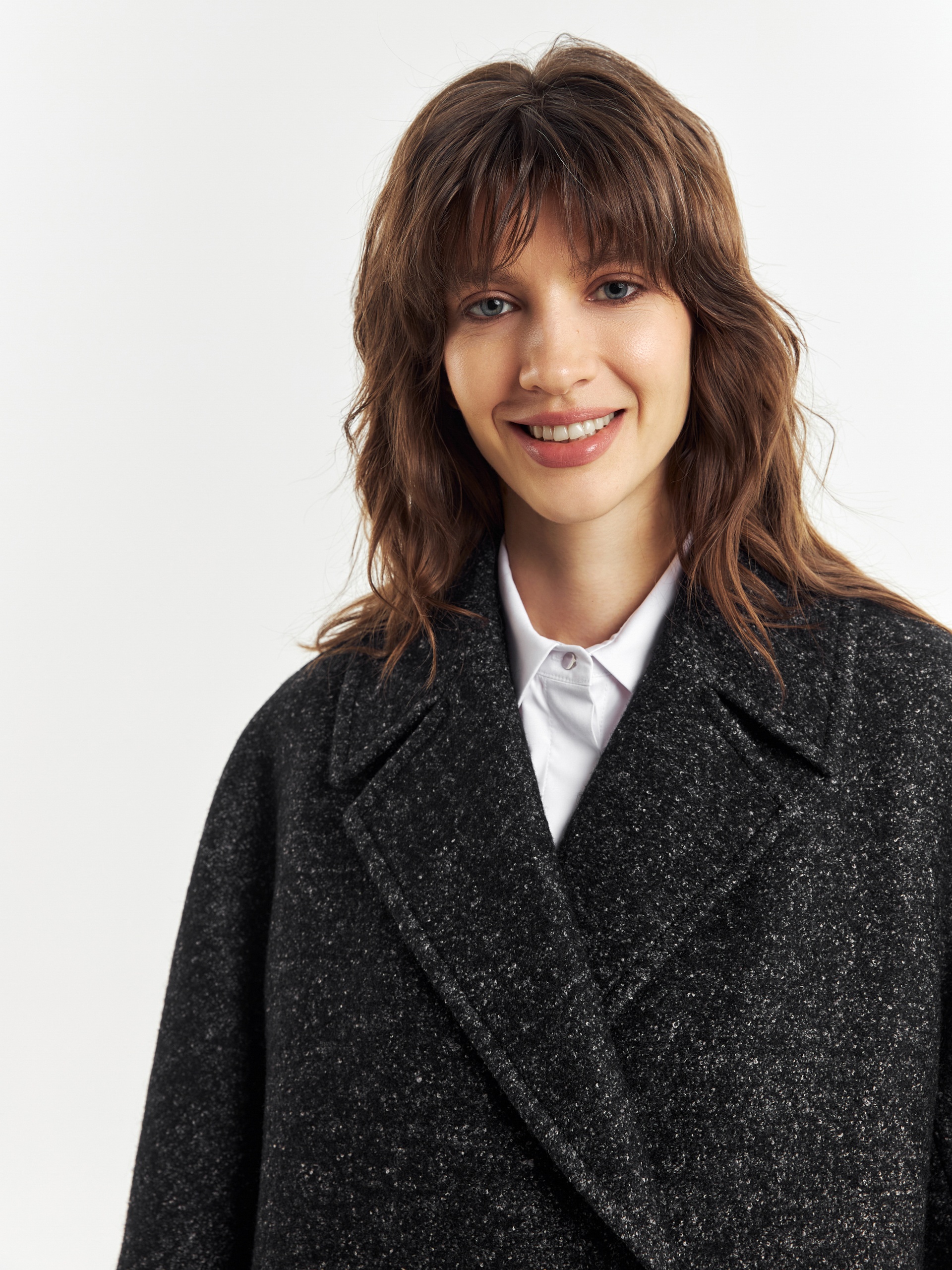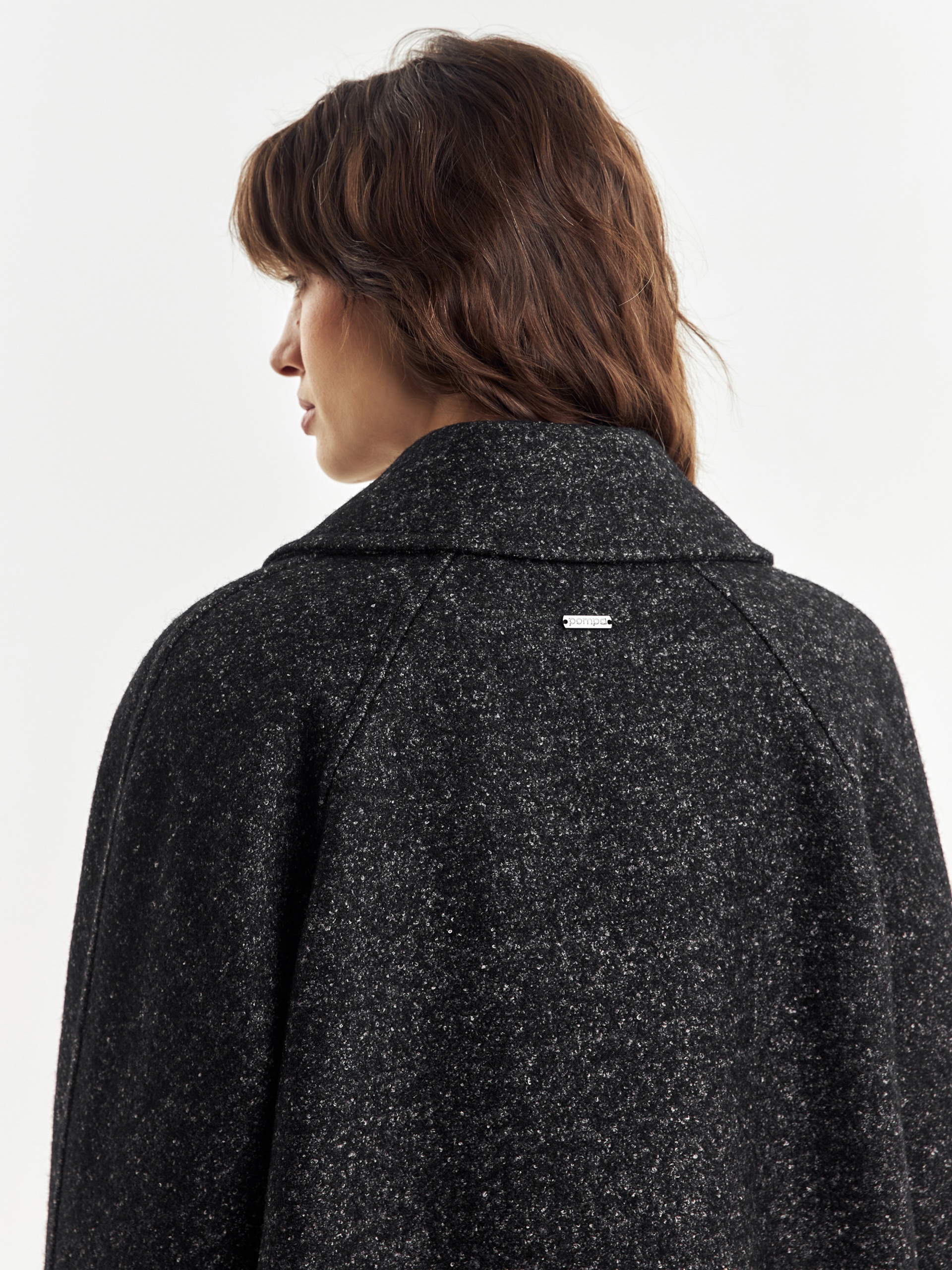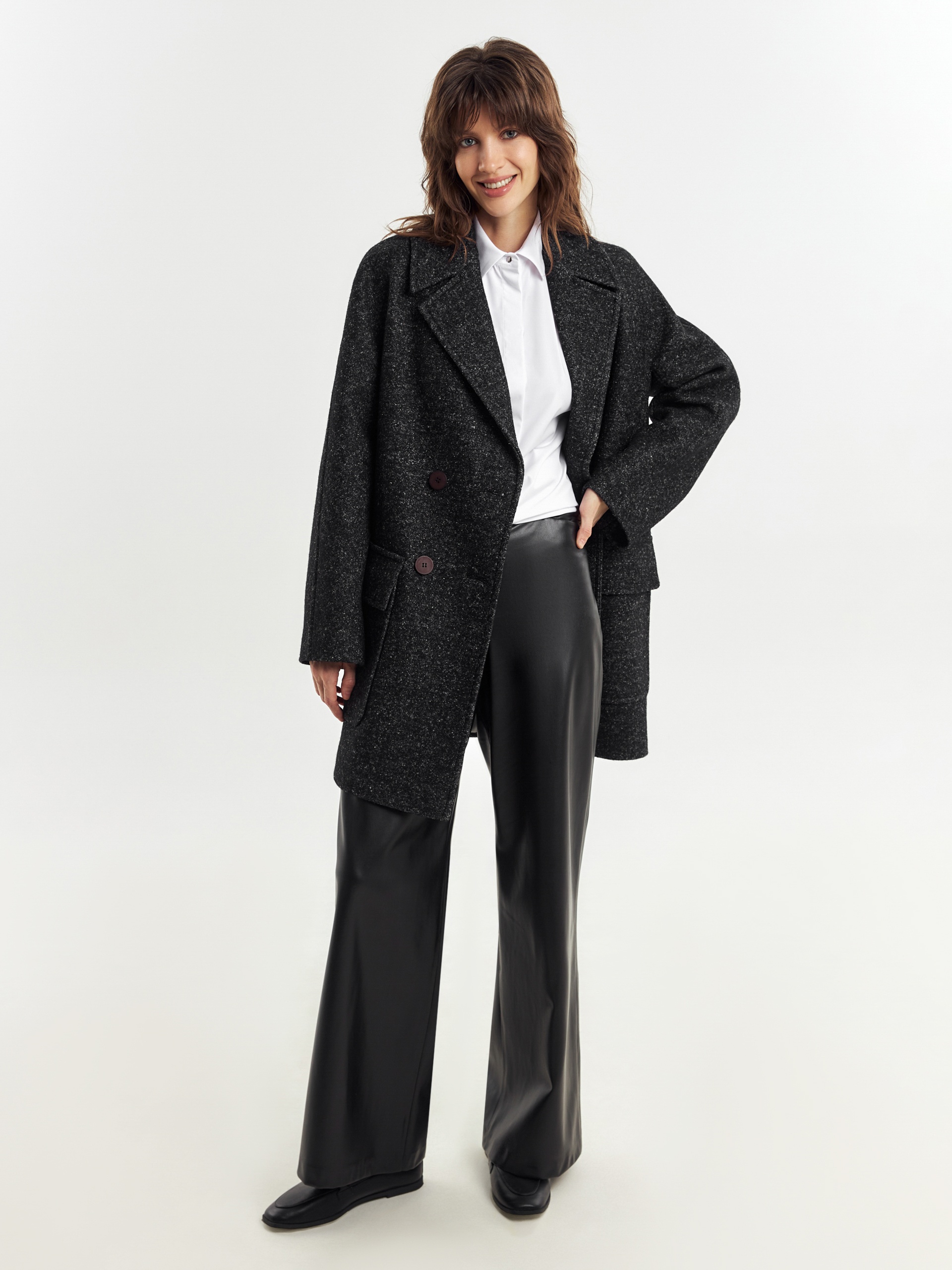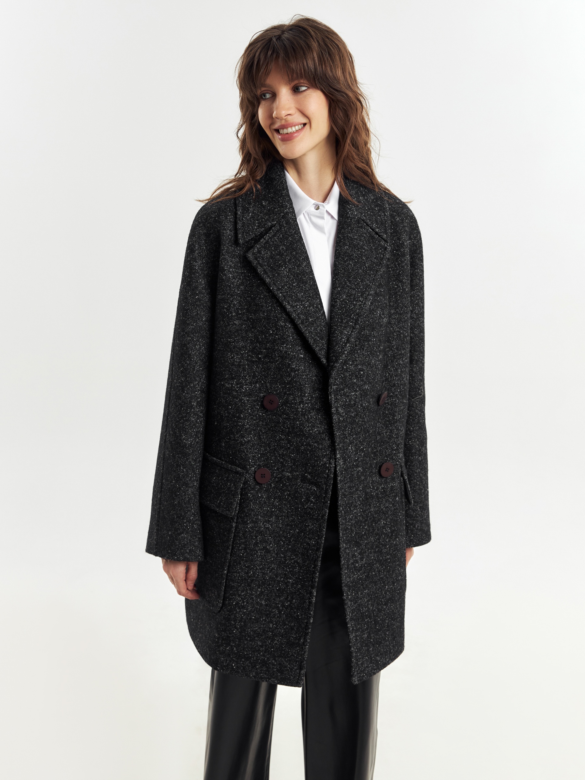 Двубортное укороченное пальто силуэта "кокон" из пальтовой ткань с эффектом "вареная шерсть" в темно-сером меланжевом оттенке. Полупальто универсальной длины выше колена, с широким английским воротником и комфортным рукавом уникальной комбинированной конструкции: цельнокроенный спереди и реглан на спинке. Функциональным декоративным элементом служат большие накладные карманы с клапанами. Остроты пальто добавляют отделочные строчки. Благодаря высокому содержанию шерсти полупальто очень уютное и теплое. А для дополнительной защиты от непогоды изделие выполнено с использованием высокотехнологичной мембраны RaftPro. Произведено в Санкт-Петербурге.